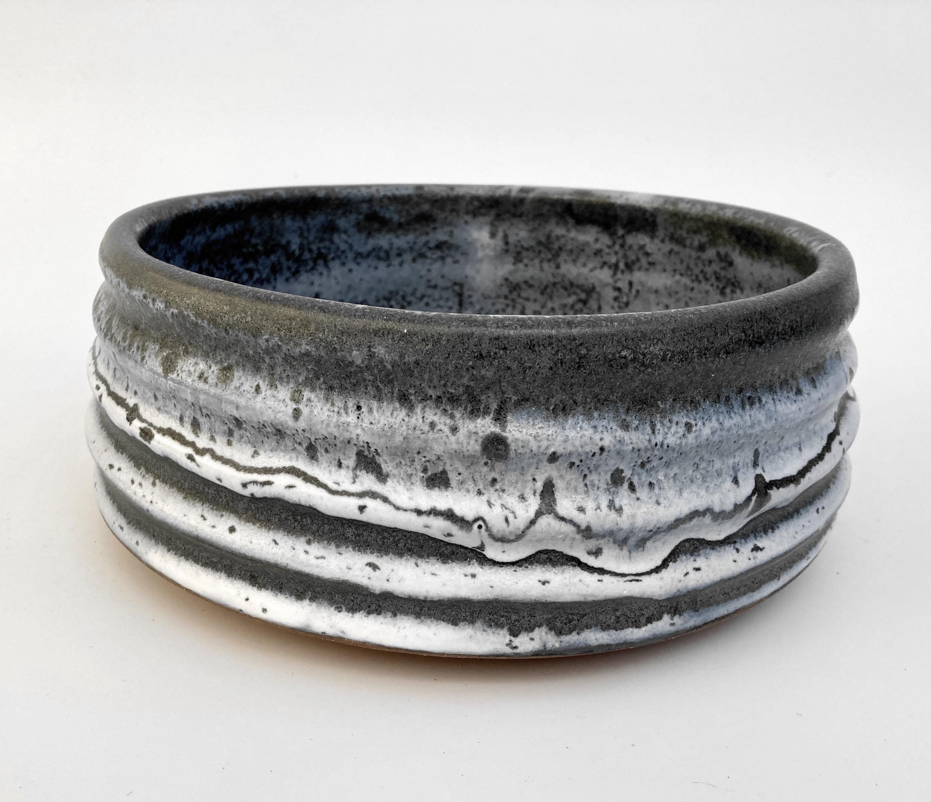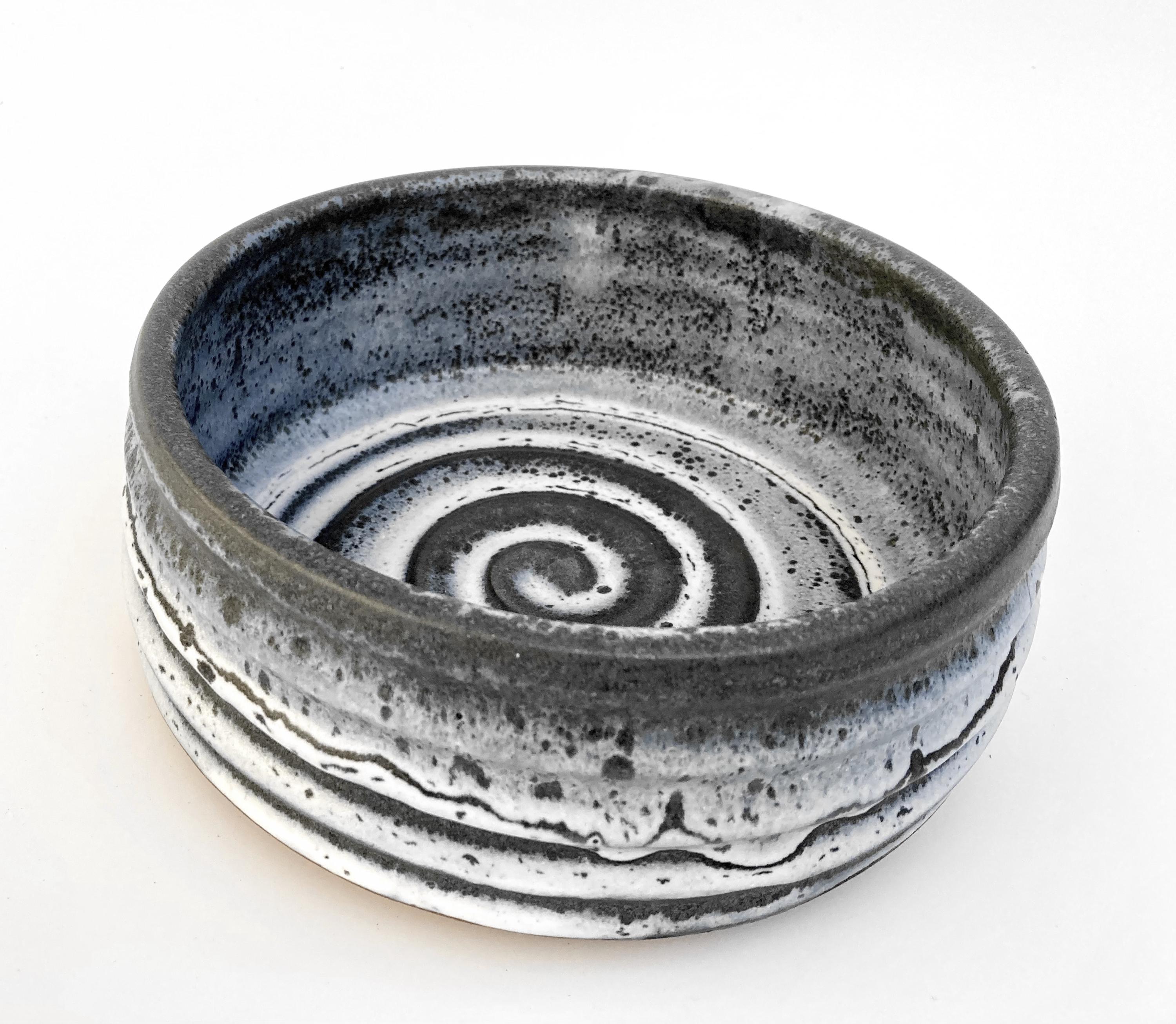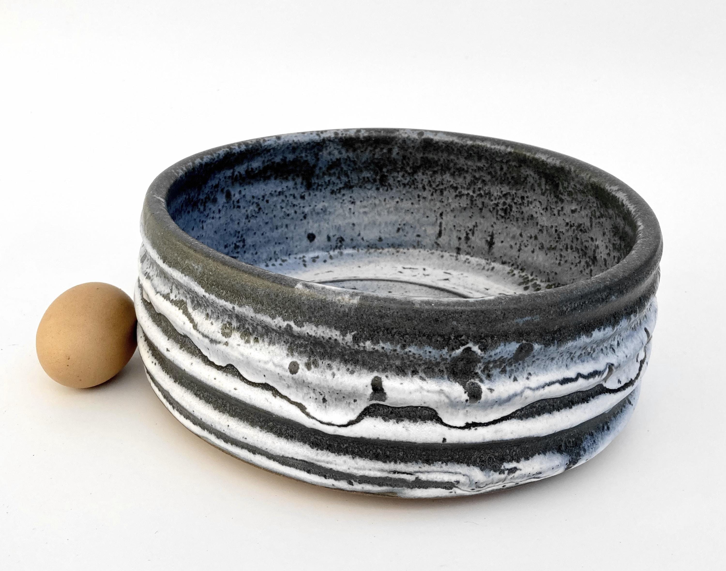 This large, stoneware dog bowl was wheel-thrown and fired to 2300 degrees for strength and durability. It was slow cooled to give the glazes time to run, pool, merge and form interesting patterns. Heavy enough to make it a little harder to push across the floor. Wider at the bottom so it is almost impossible to turn over. Makes a great water bowl. It also make a good baking and serving dish.