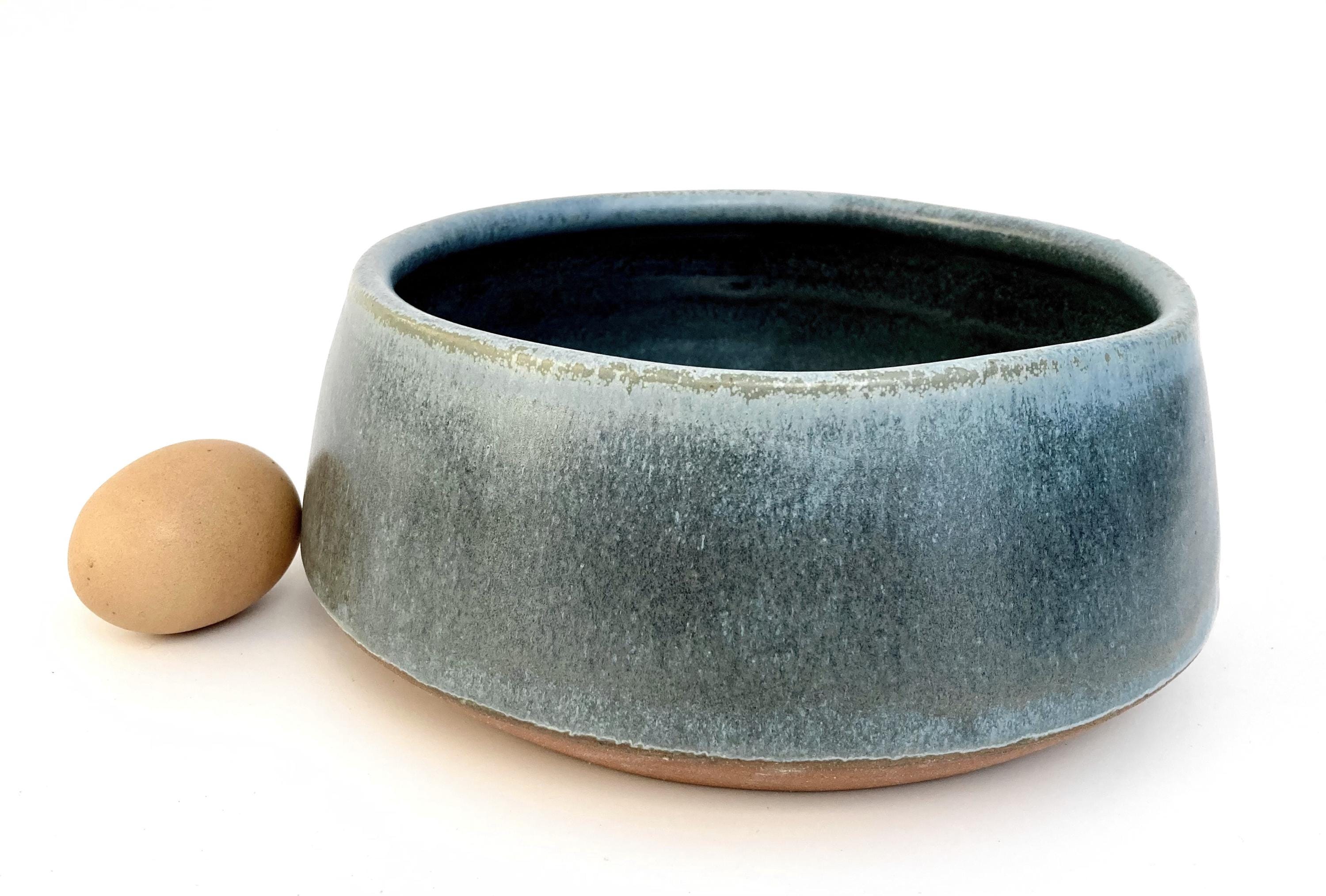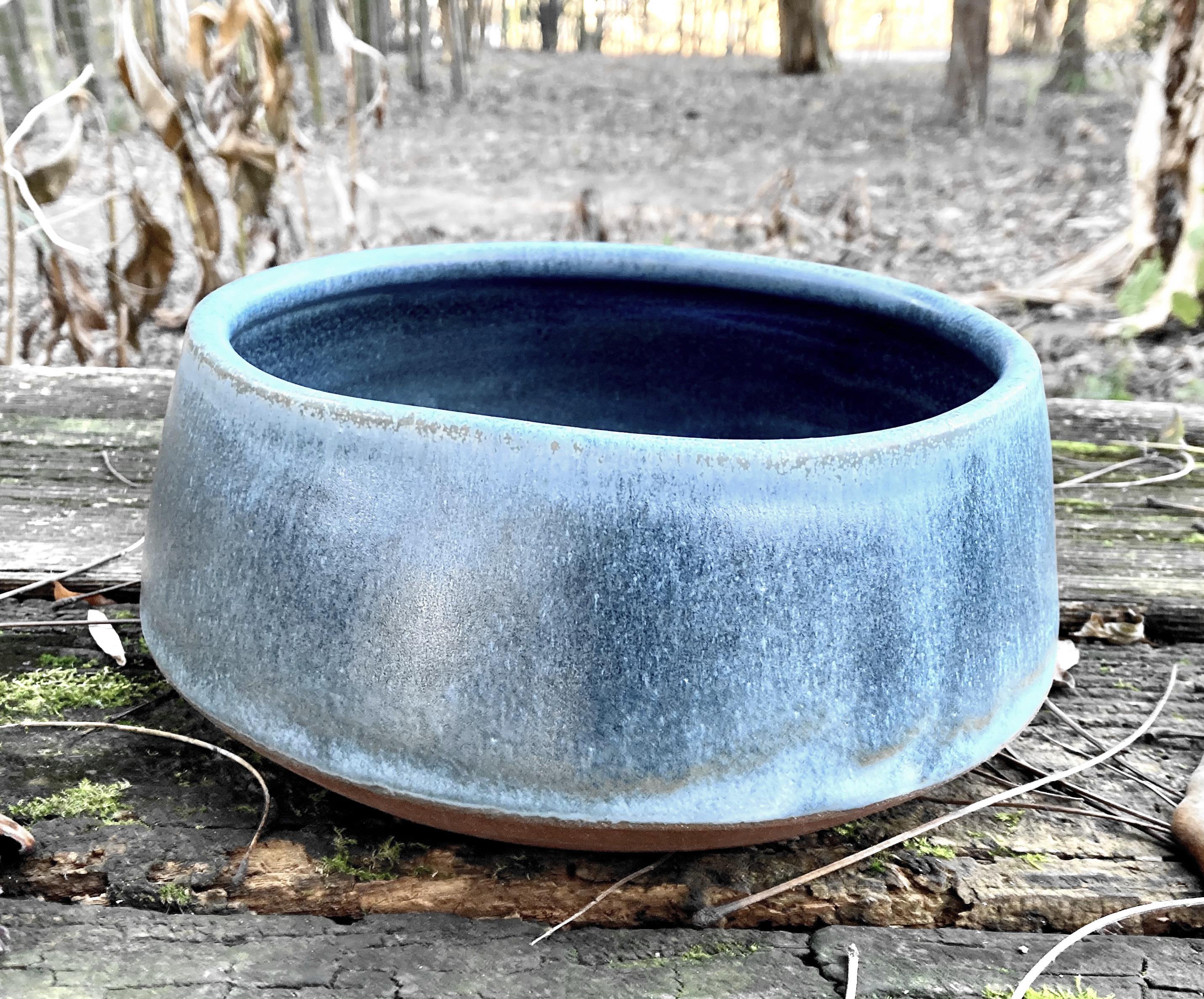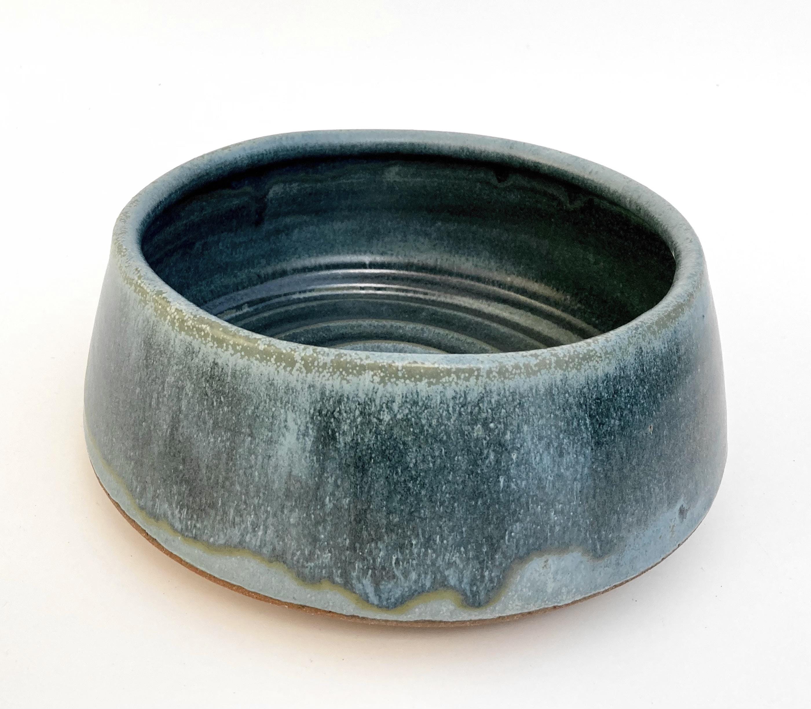 This large, stoneware dog bowl was wheel-thrown and fired to 2300 degrees for strength and durability. It was slow cooled to give the glaze time to develop depth and variation. Heavy enough to make it a little harder to push across the floor. Wider at the bottom so it is almost impossible to turn over. Makes a great water bowl. It also make a good baking and serving dish.