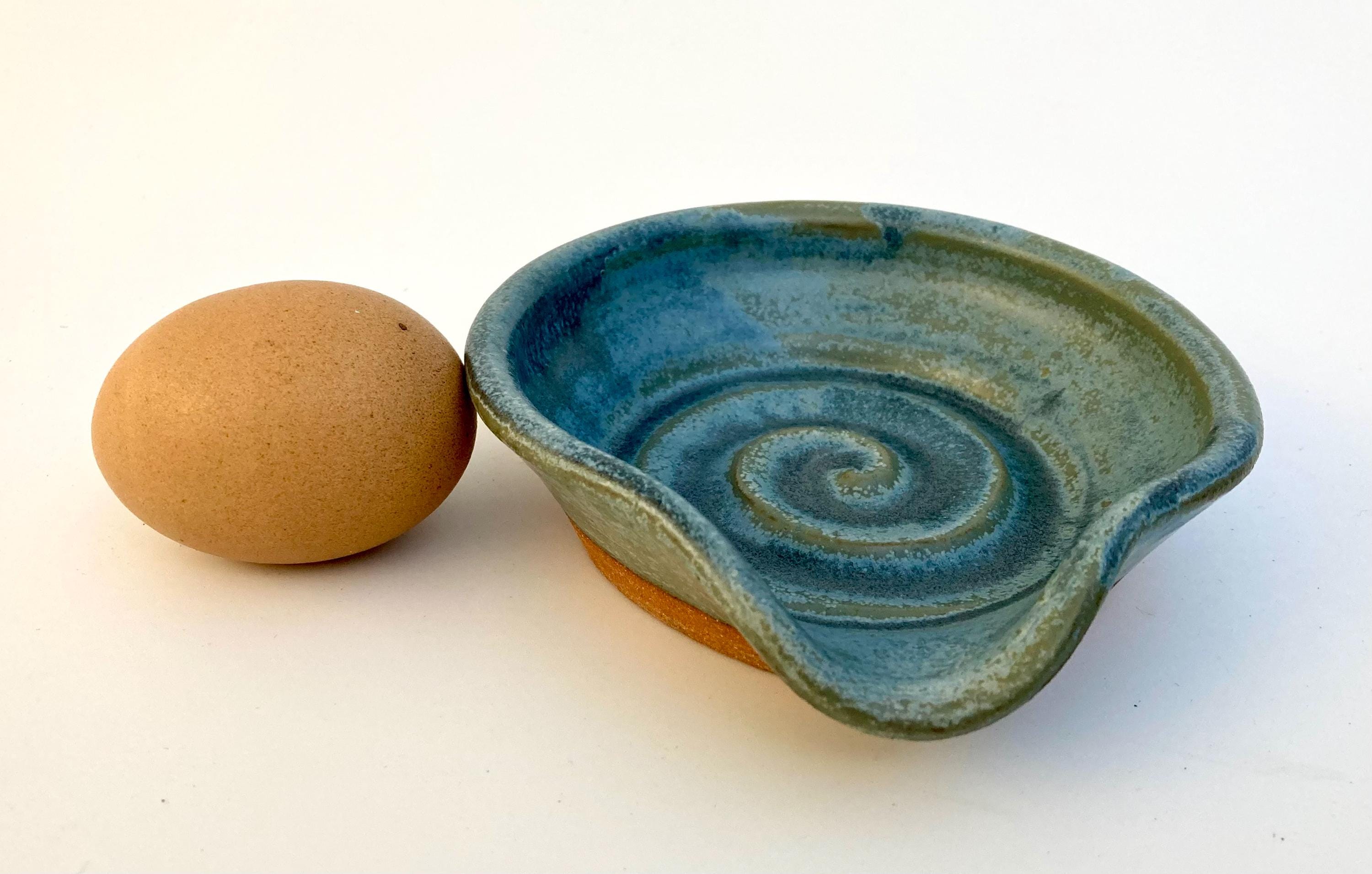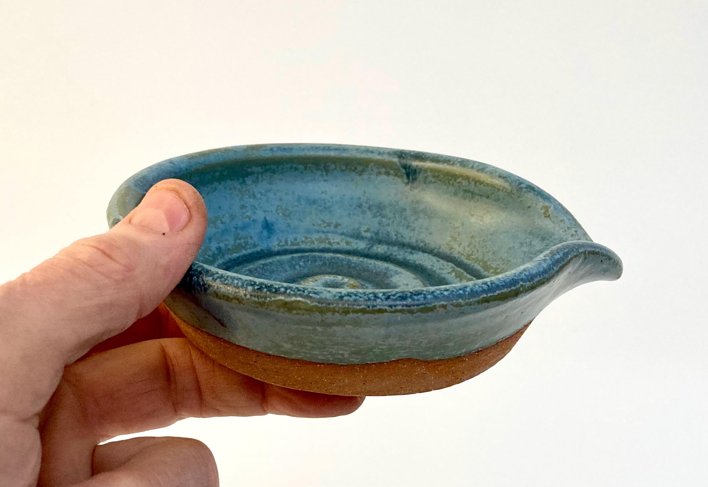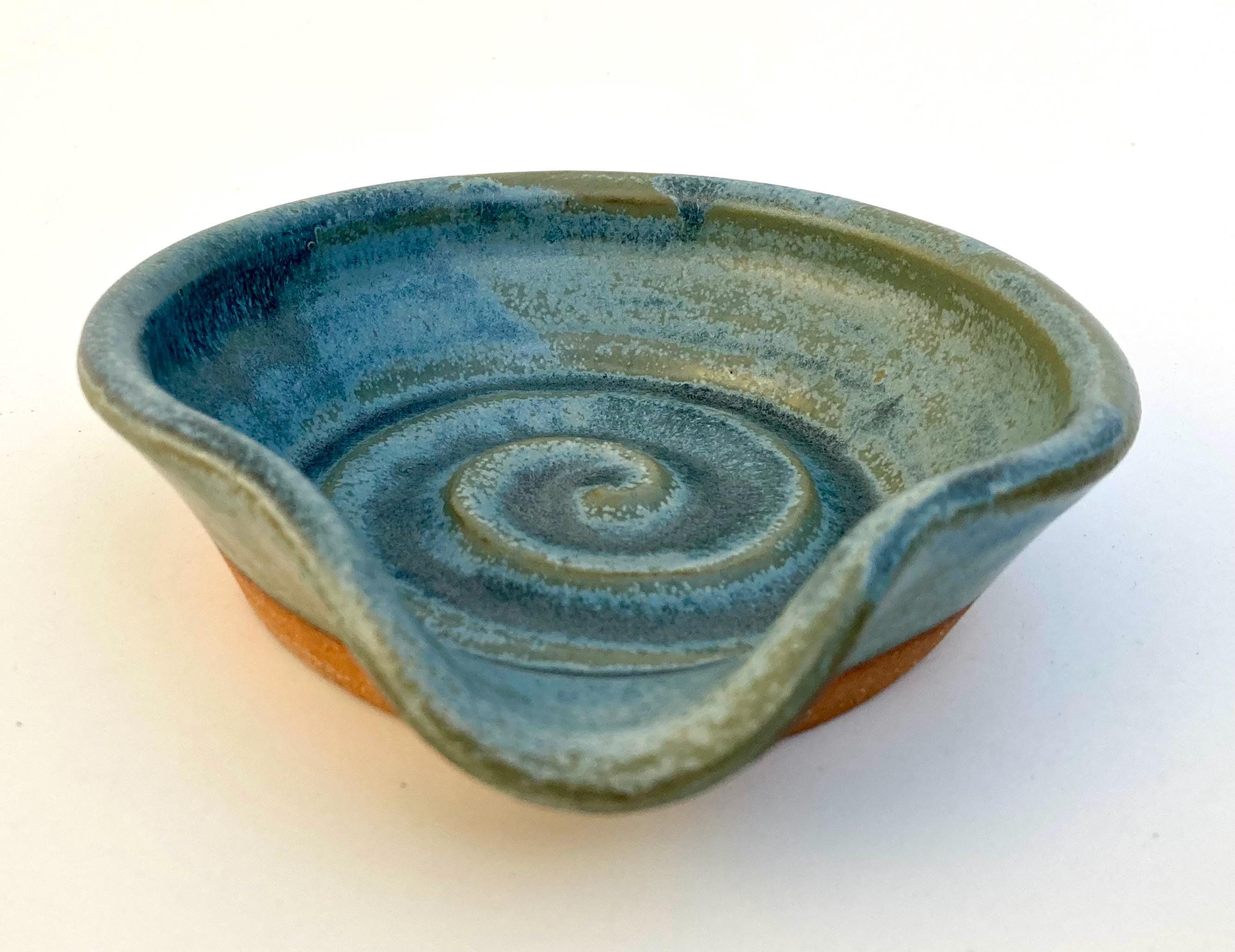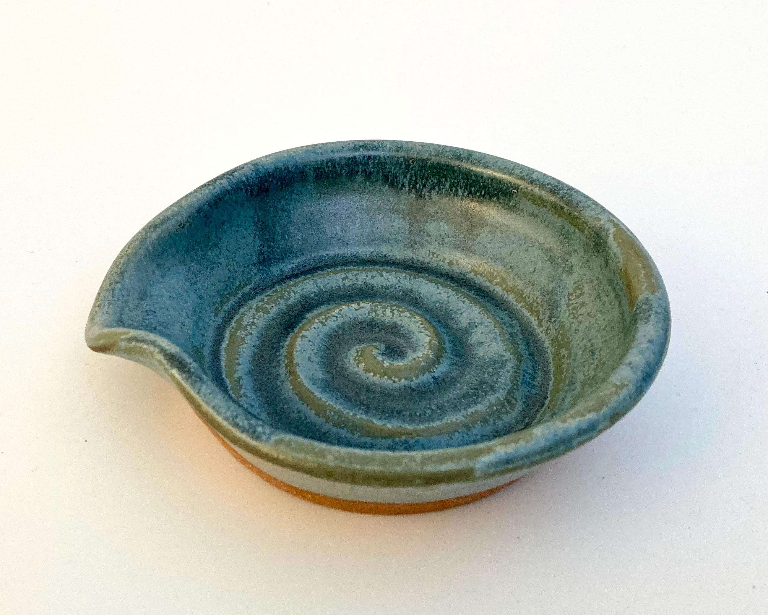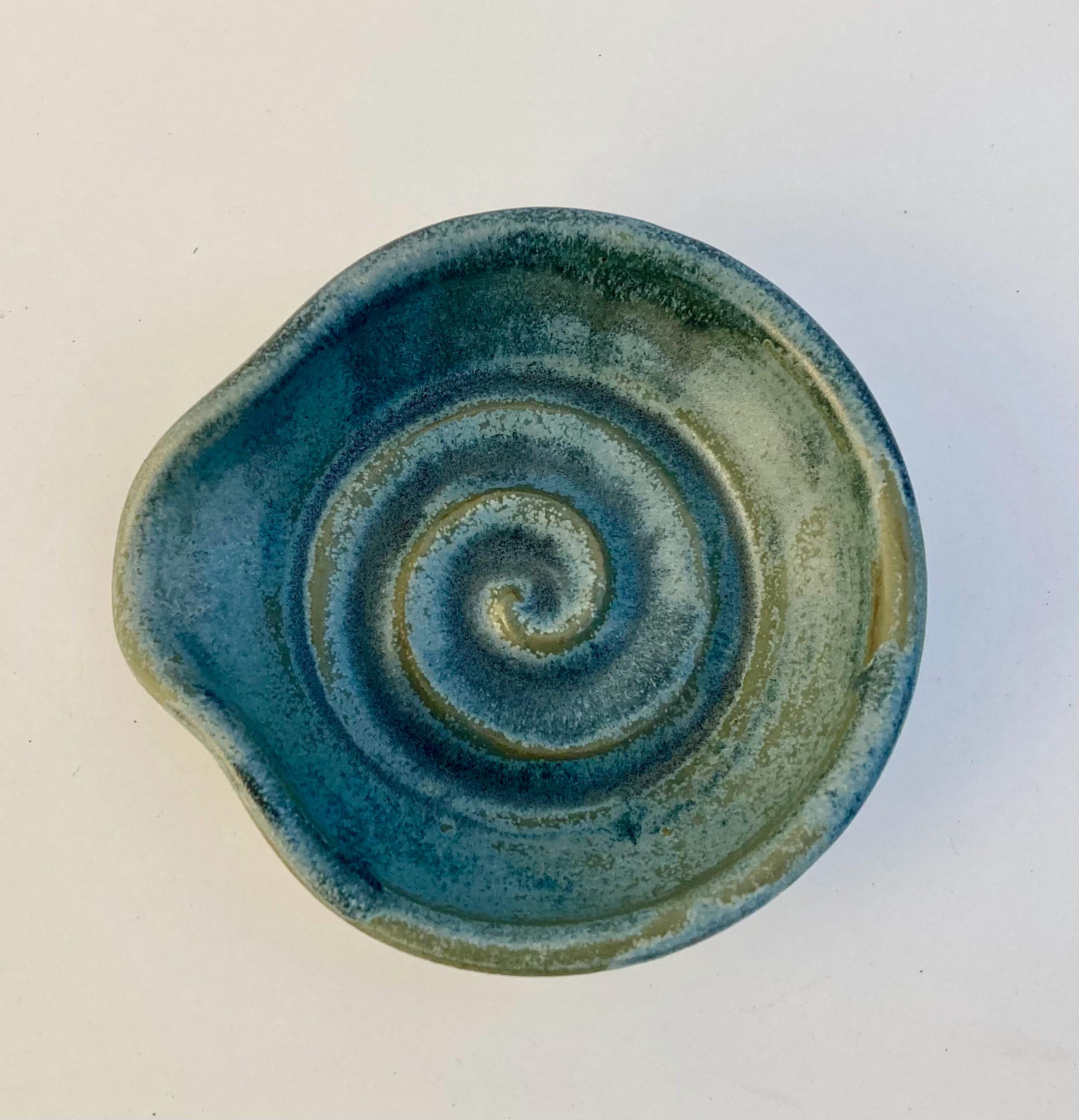 This wheel-thrown, ceramic spoon rest was made of stoneware clay and fired to vitrification for strength and durability. The food-safe glaze is a nice-looking variegated blue. The raised spiral in the center prevents sauce spoons from sticking.