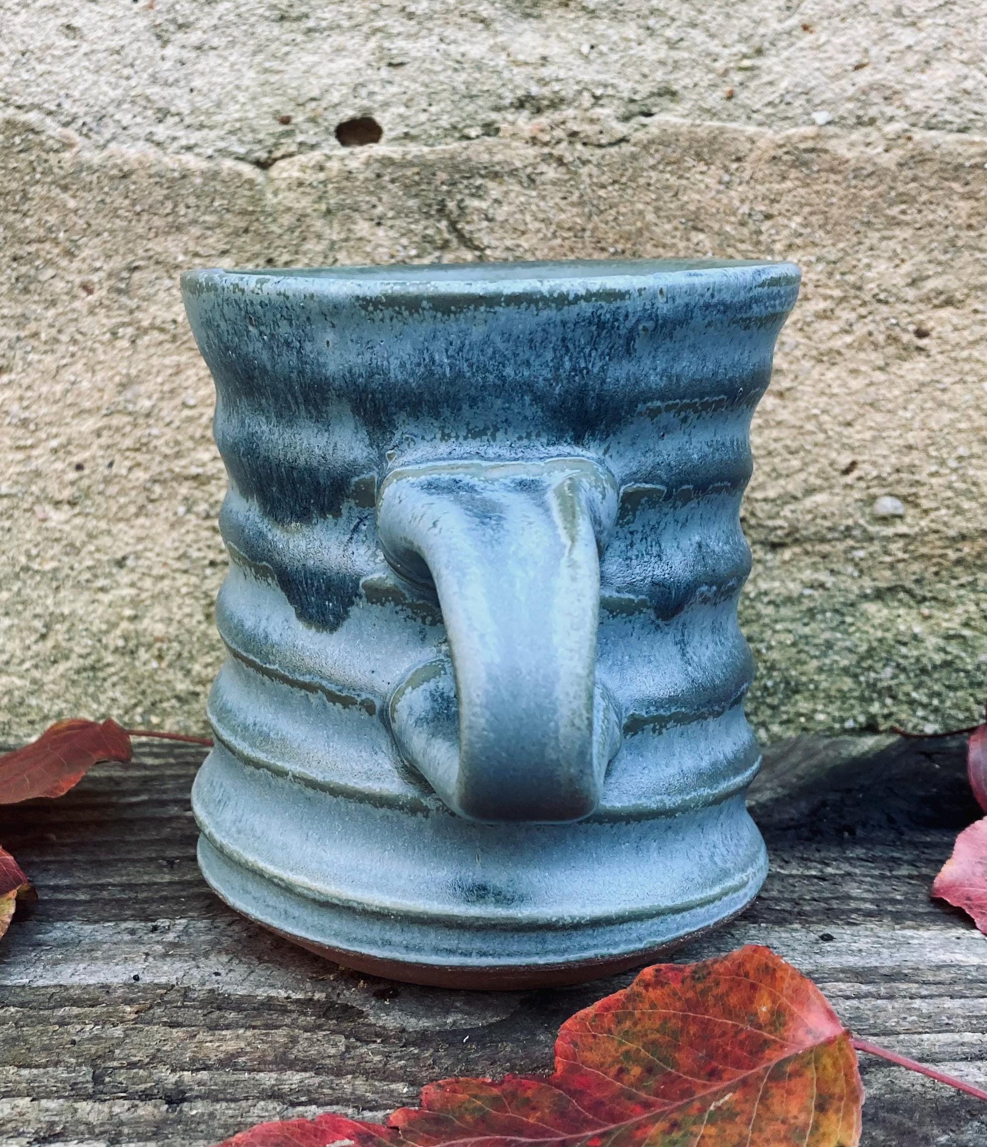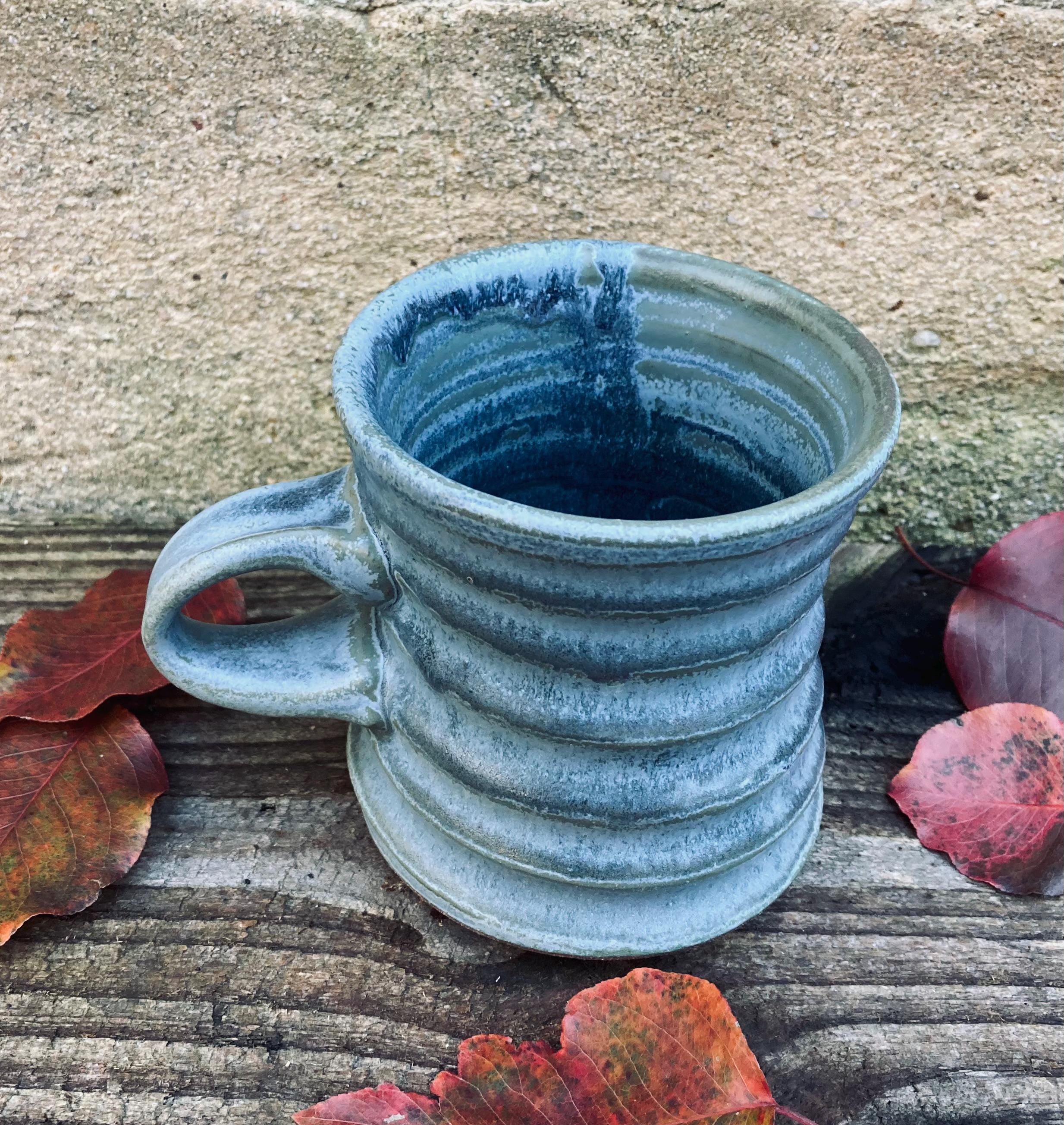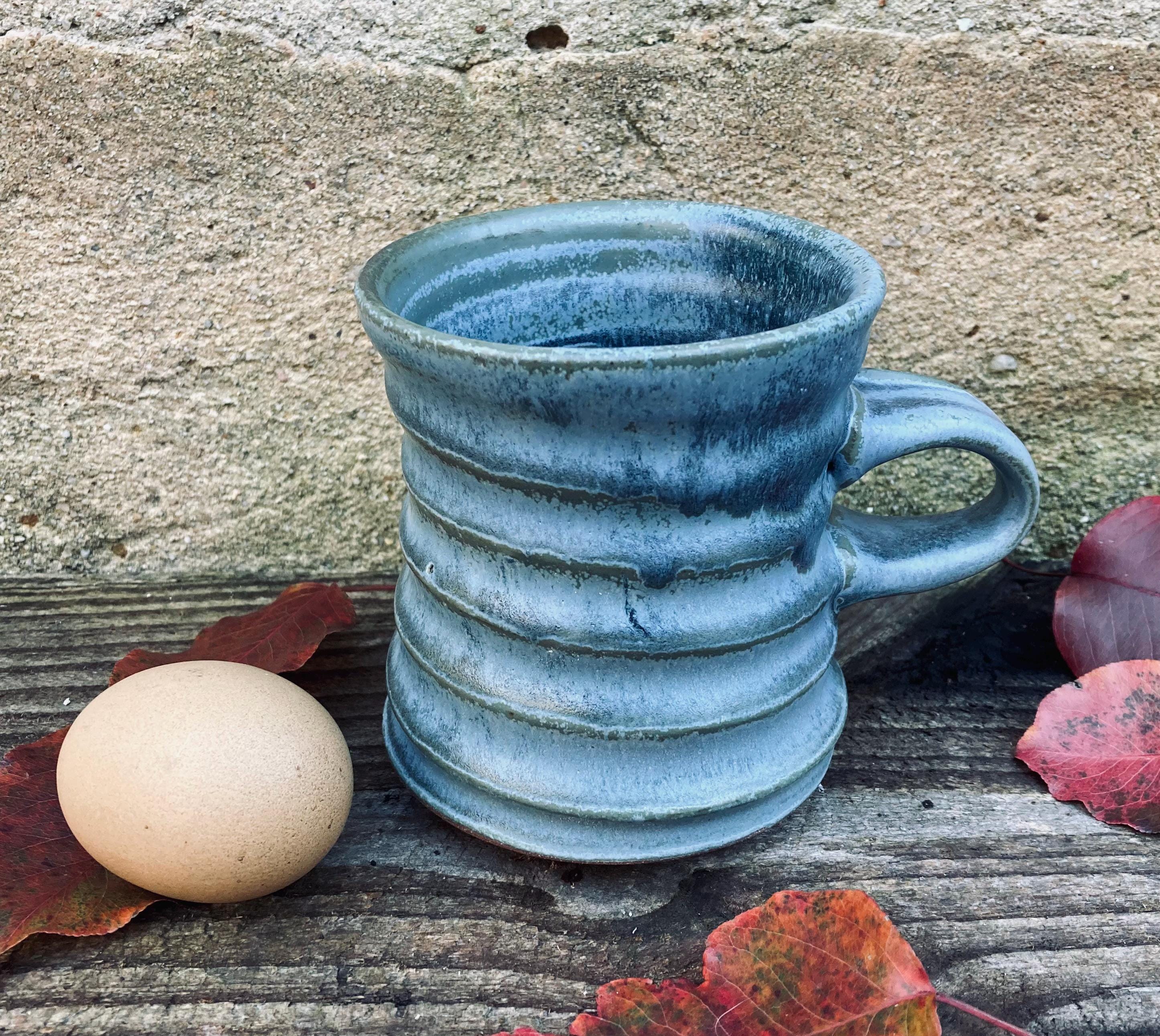 This blue, stoneware coffee mug was wheel-thrown and fired to 2300 degrees for strength and durability. It was slow cooled to give the glaze time to develop depth and variation. It has a very comfortable one-finger handle.