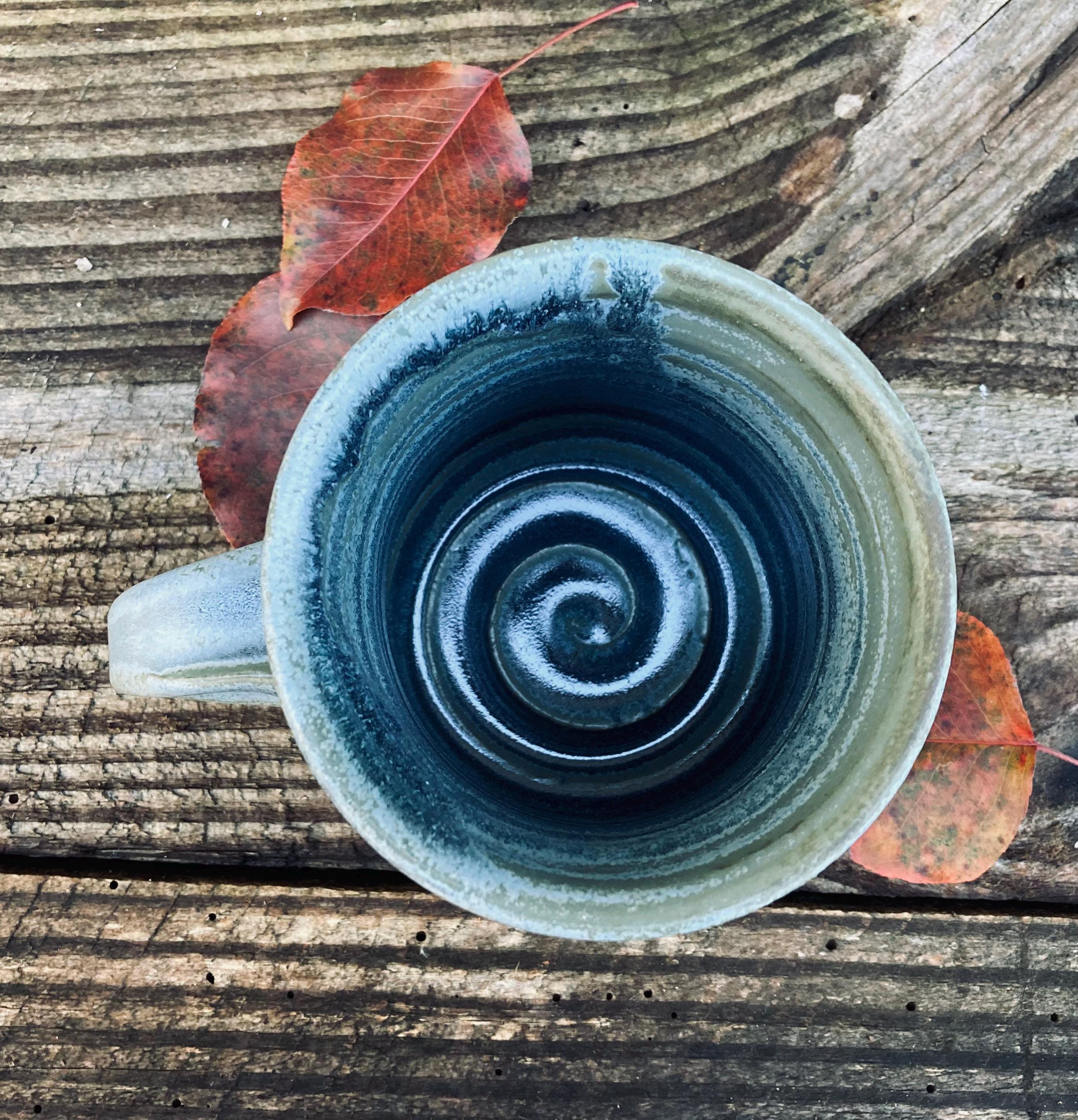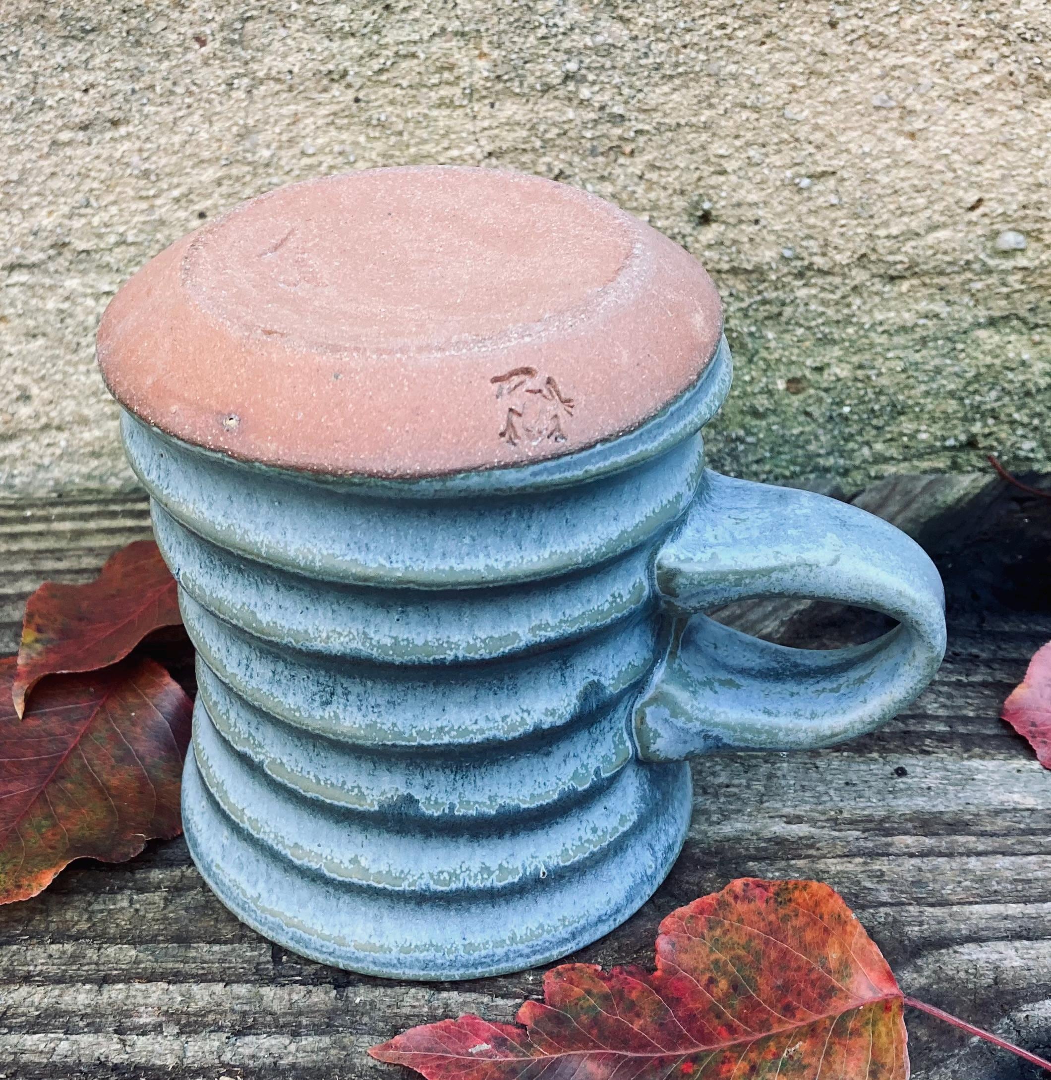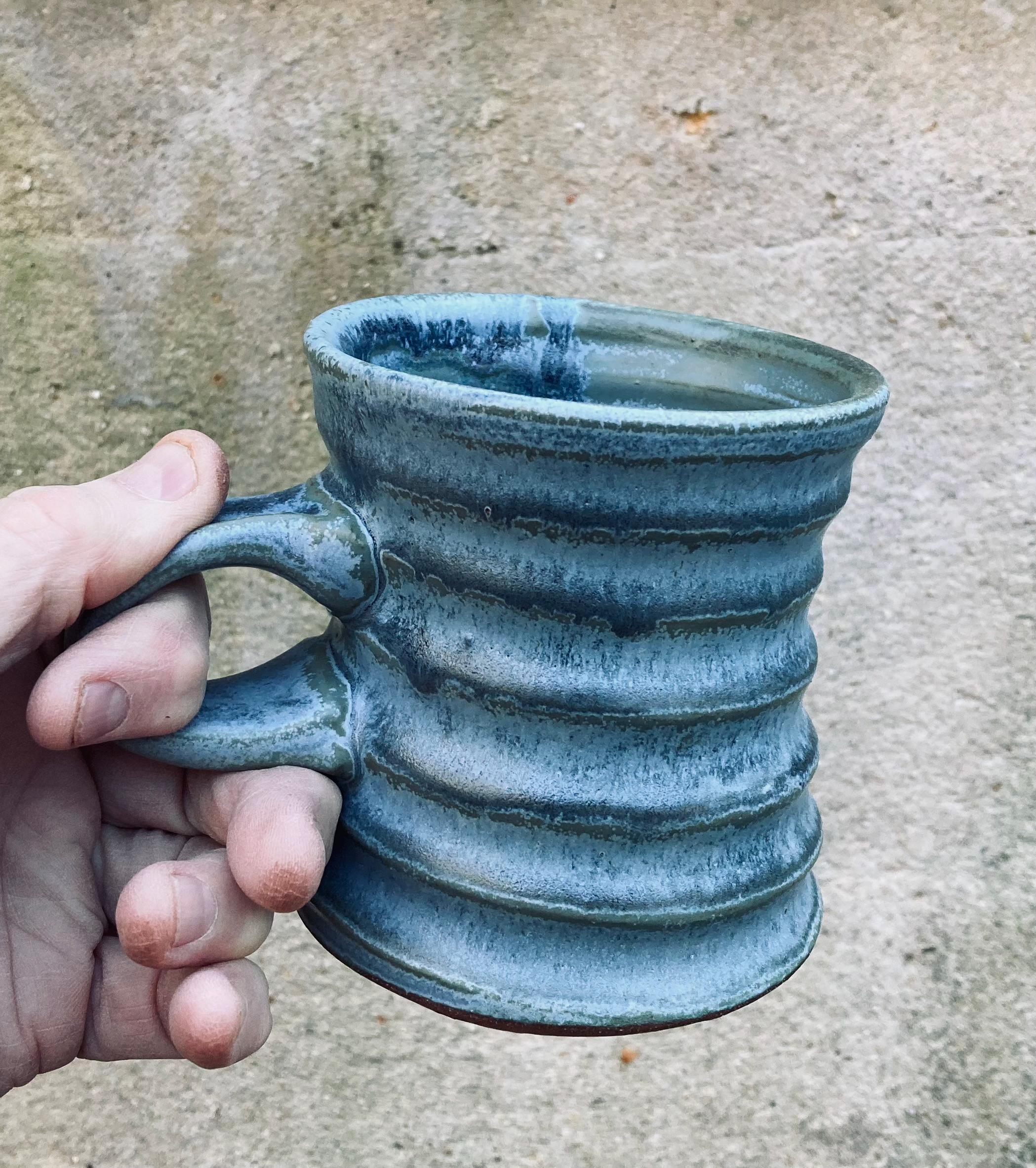 This blue, stoneware coffee mug was wheel-thrown and fired to 2300 degrees for strength and durability. It was slow cooled to give the glaze time to develop depth and variation. It has a very comfortable one-finger handle.