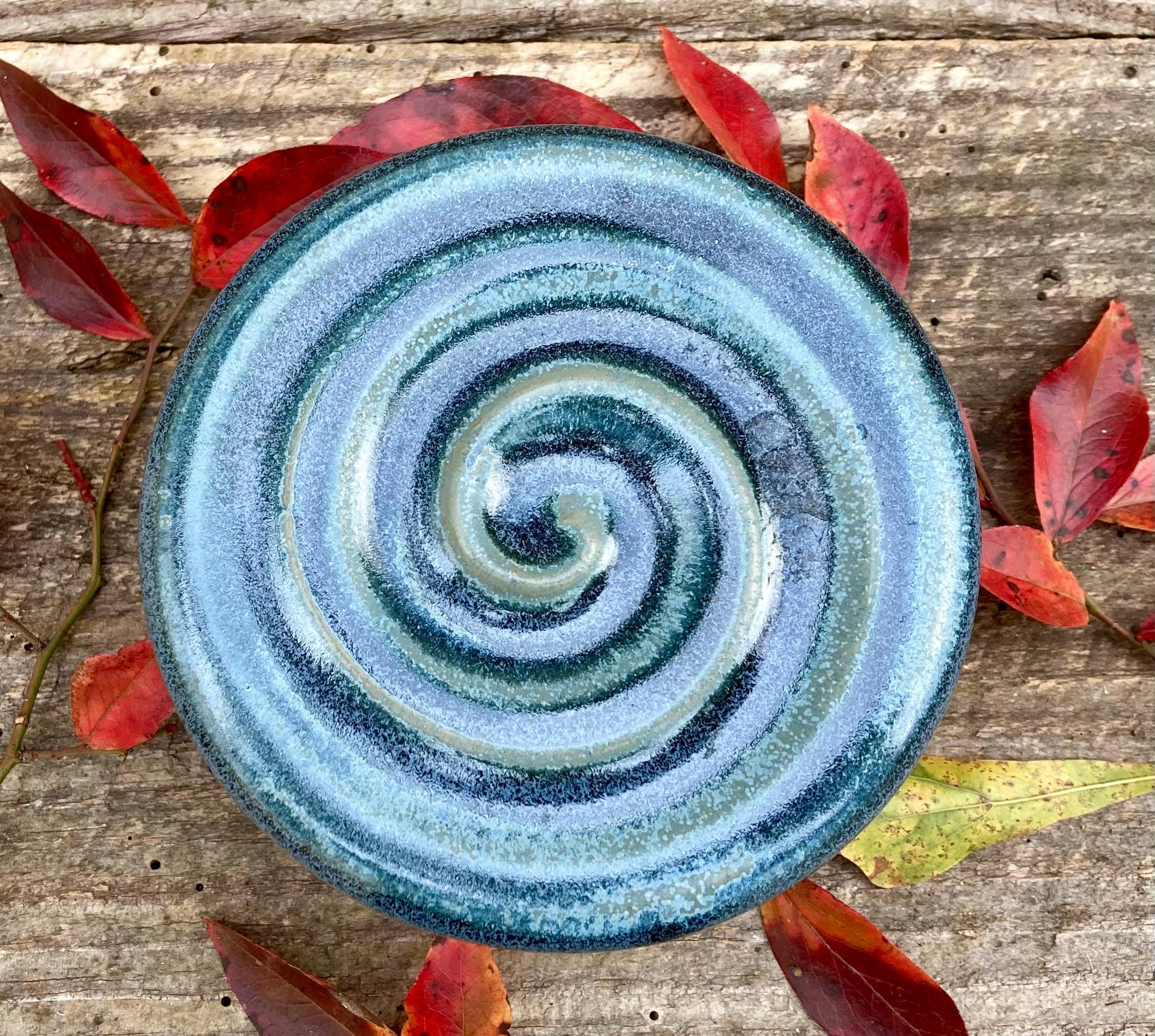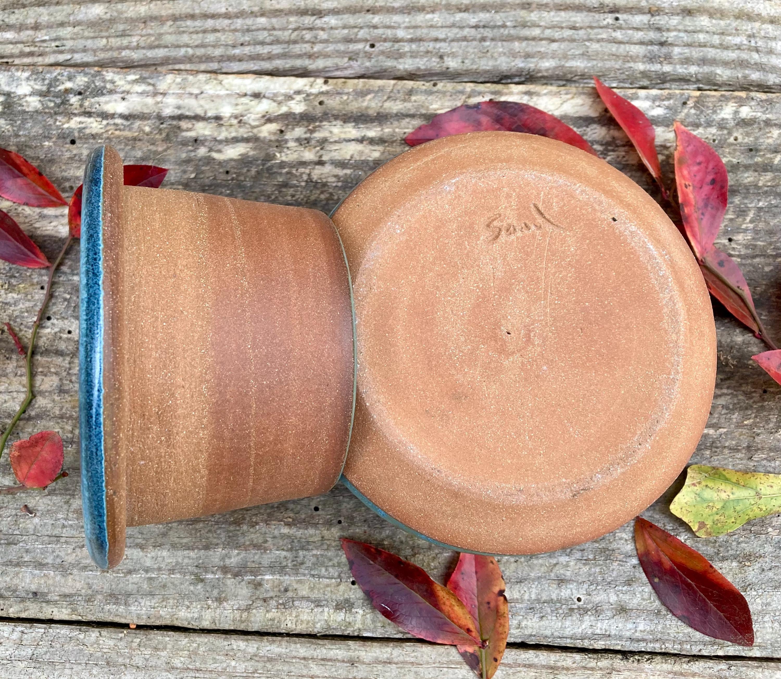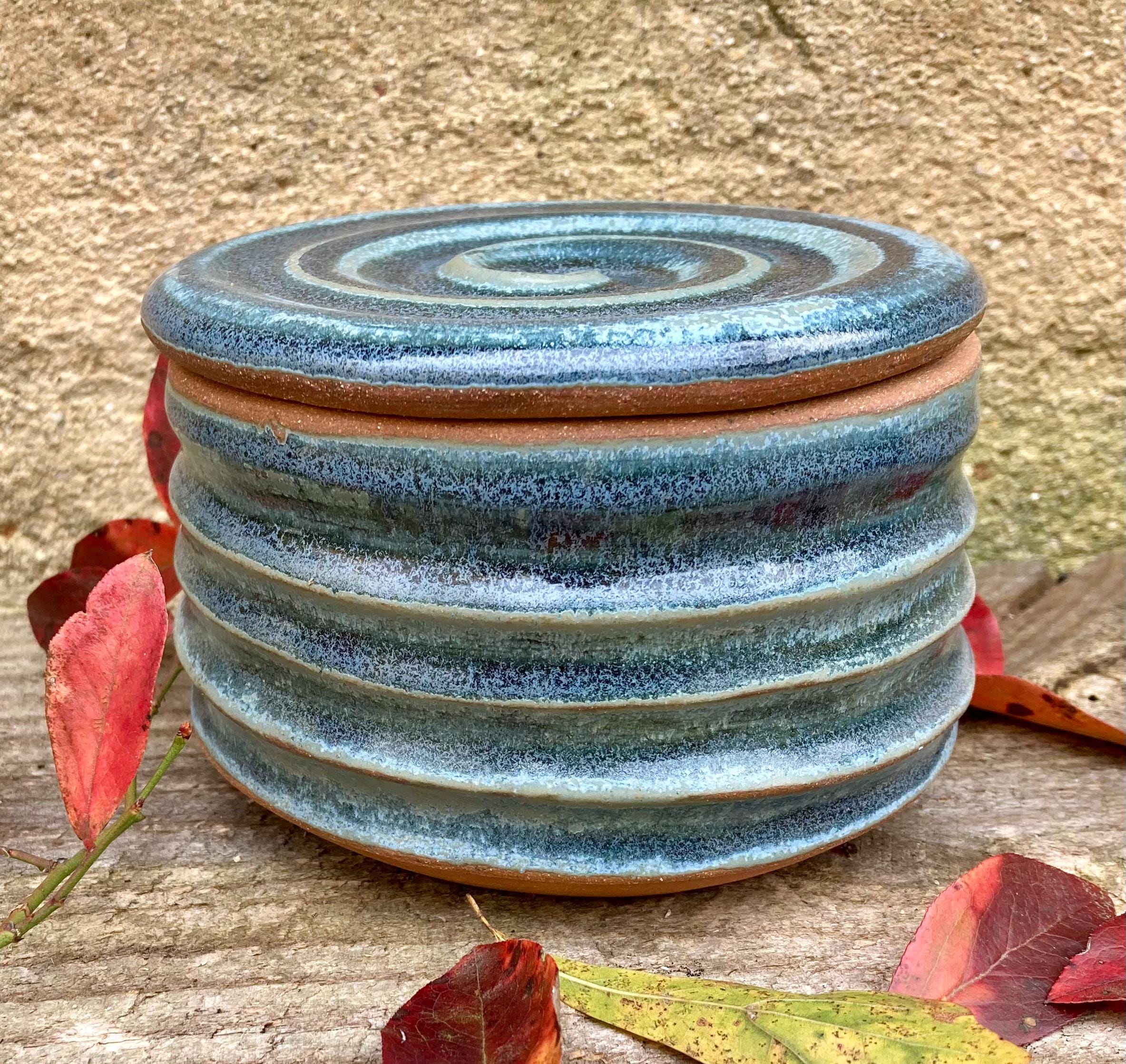 This stoneware butter keeper was wheel-thrown and fired to 2300 degrees for strength and durability. It was slow cooled to give the glazes time to run, pool, merge and form interesting patterns. Note the nice "drips" on the part that holds the butter.