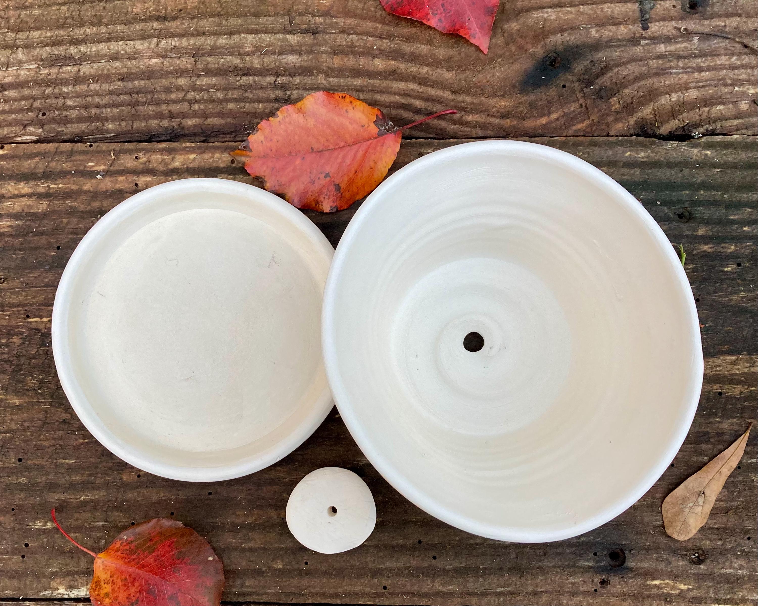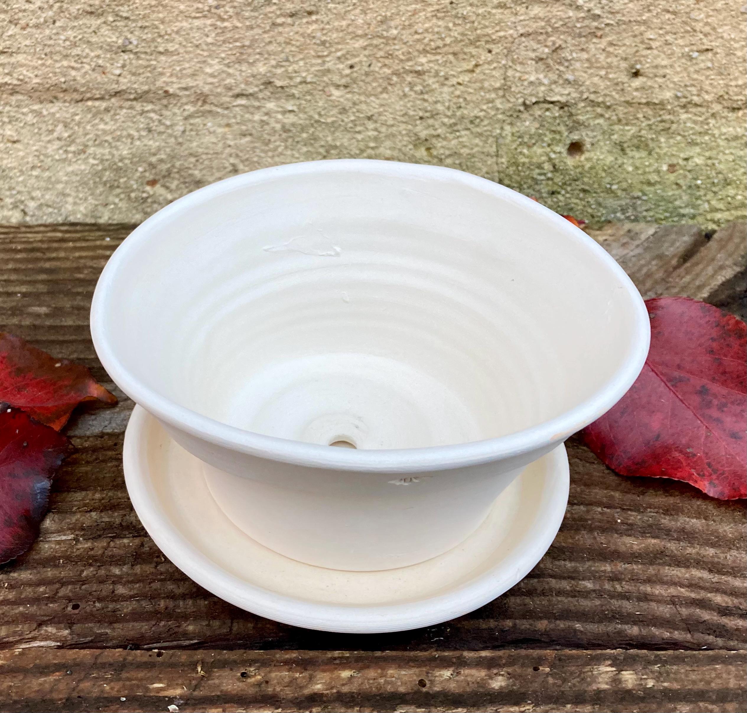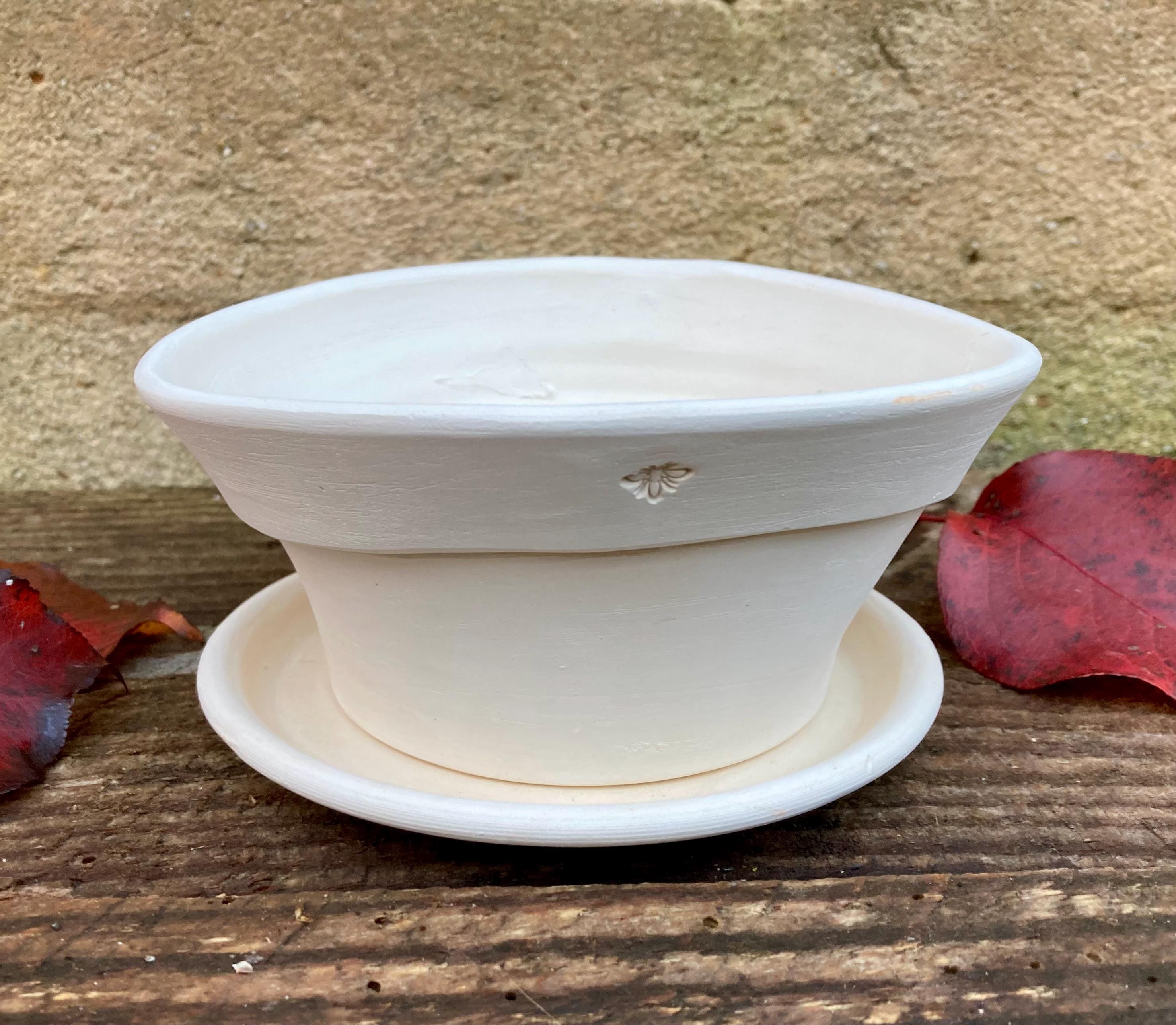 This small planter with saucer is made of white earthenware clay. Like terracotta it is porous. This allows air and water to flow through the pot which prevents root rot and soil disease.