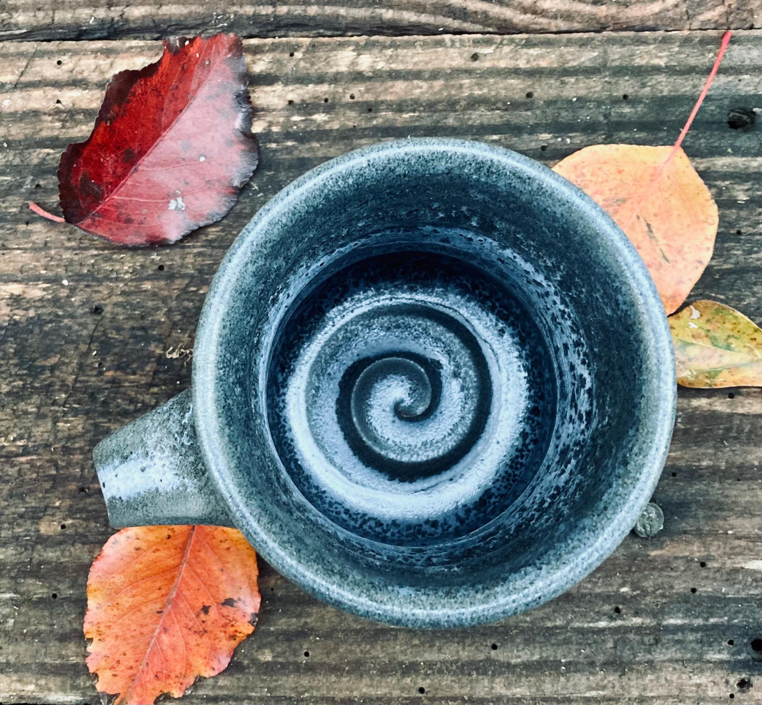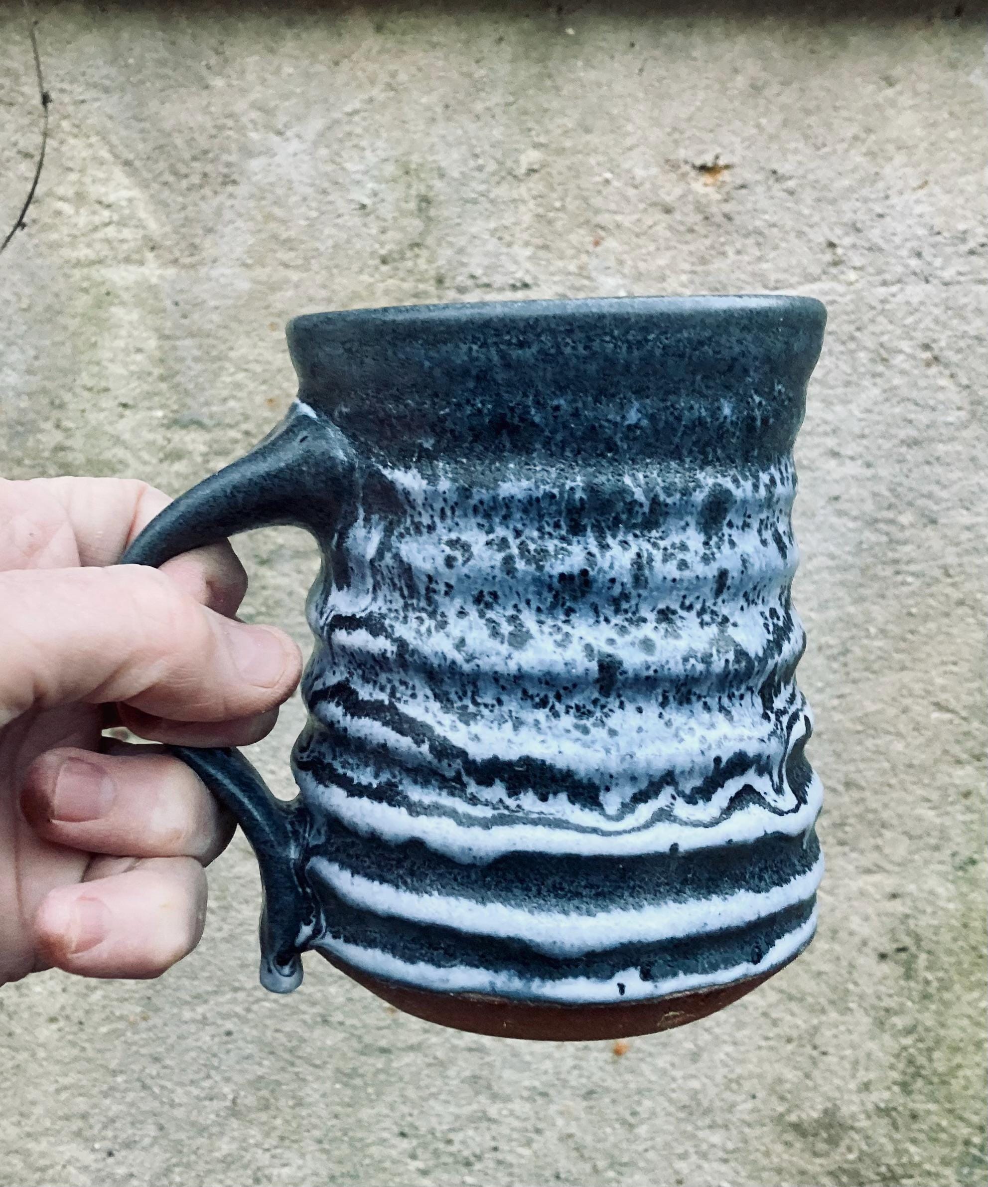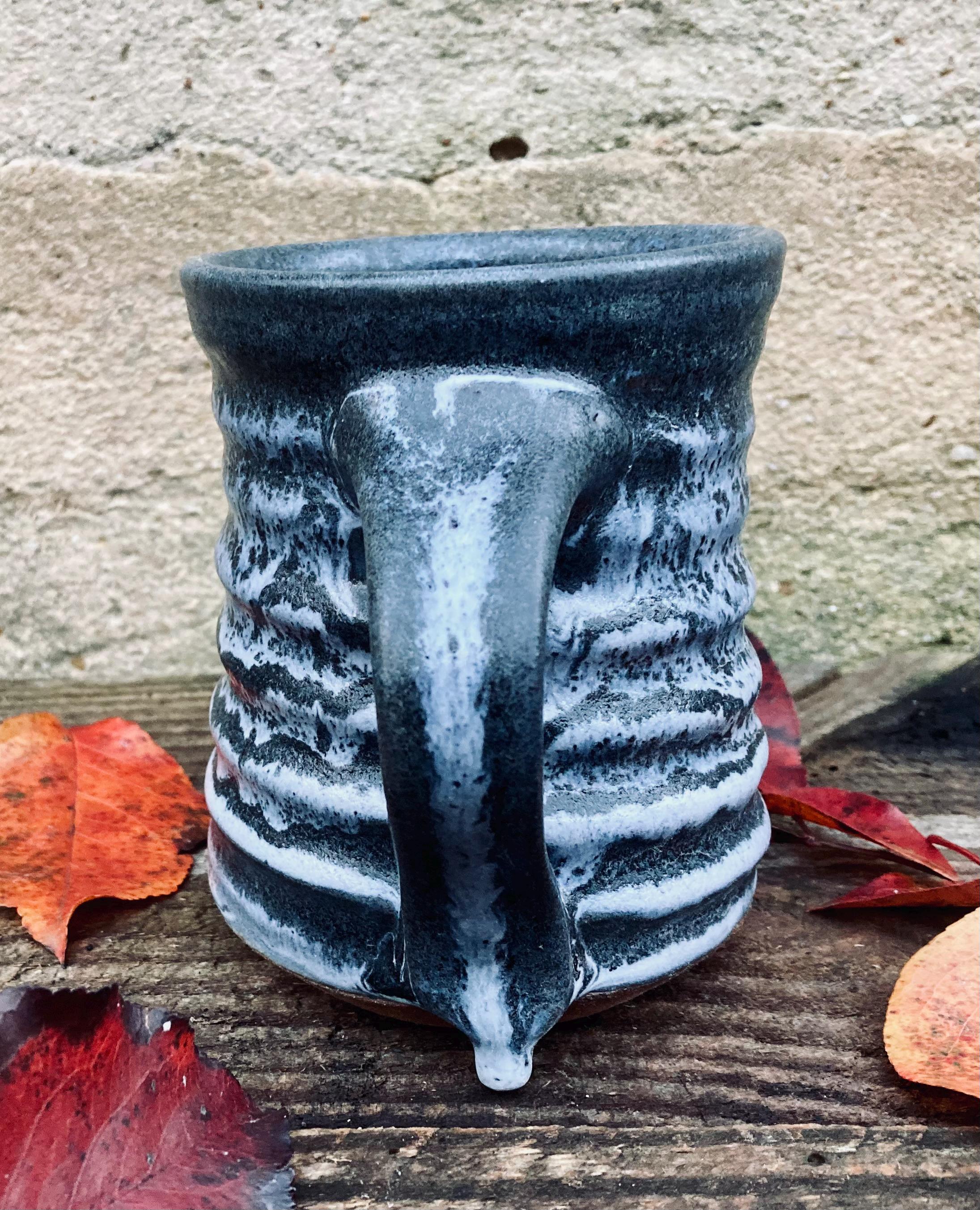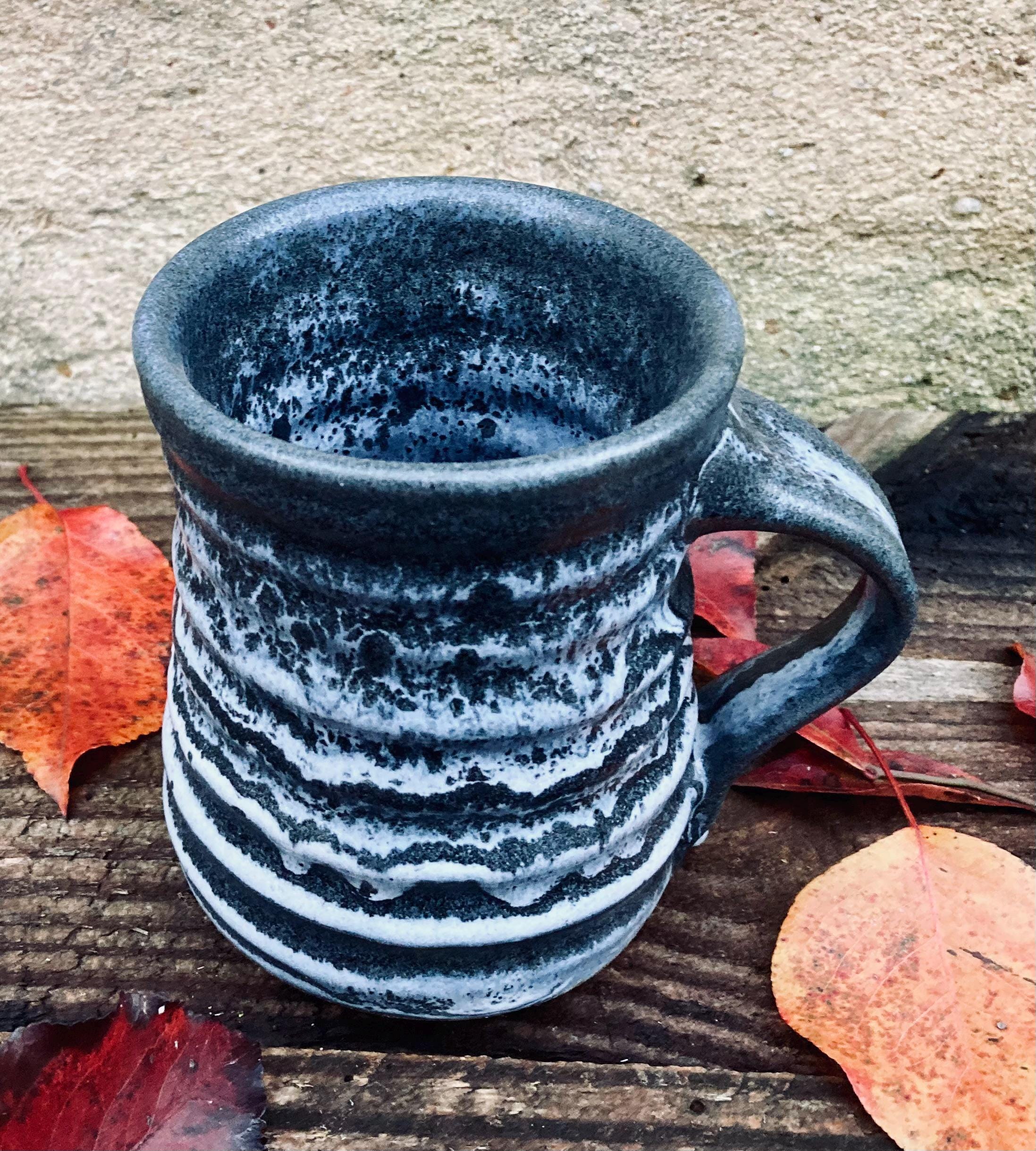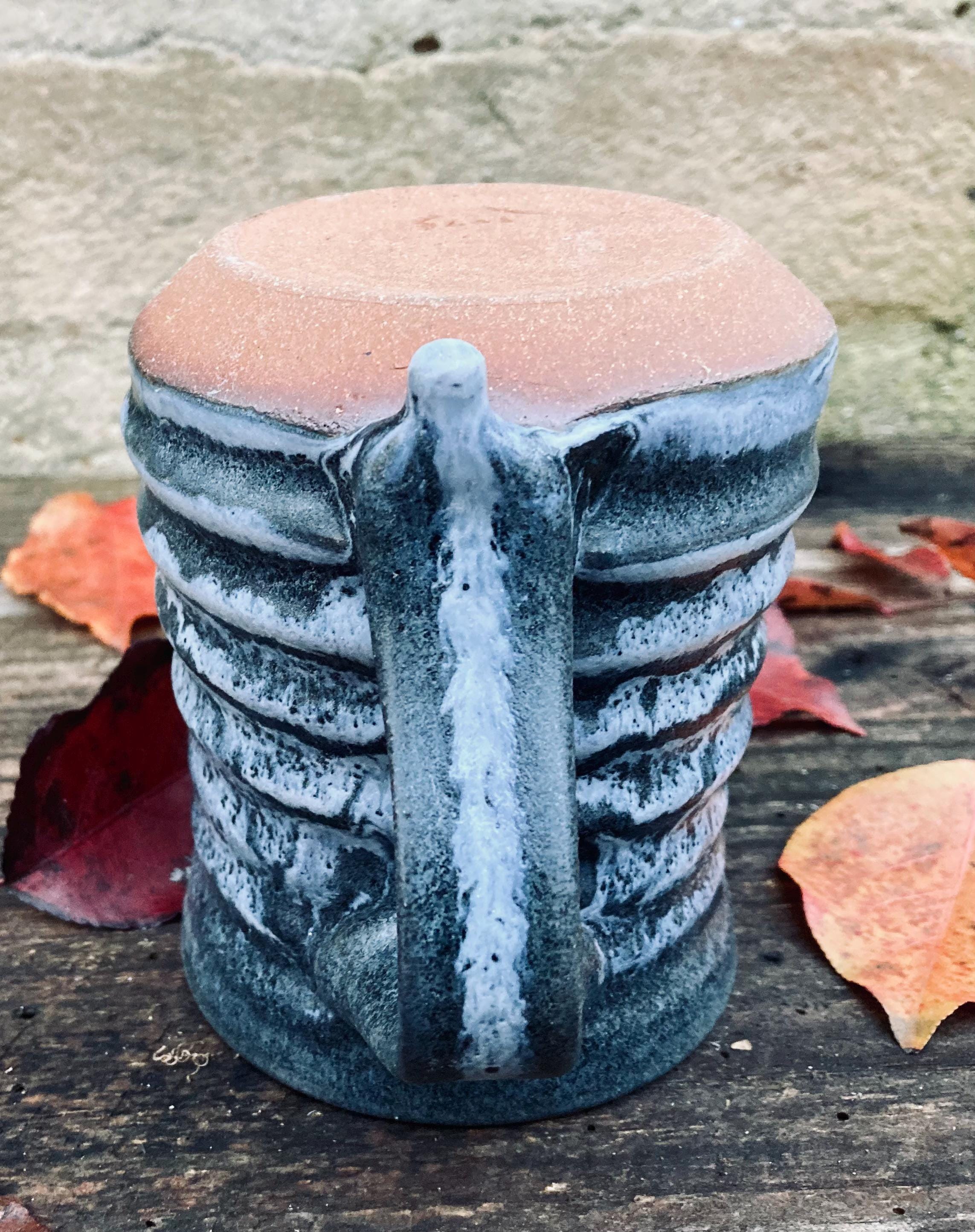 This stoneware coffee mug was wheel-thrown and fired to 2300 degrees for strength and durability. It was slow cooled to give the glaze time to develop run, merge and form interesting patterns. It has a very comfortable two-finger handle. It has a nice drip at the end of the handle that makes it look like the glaze is still running off.