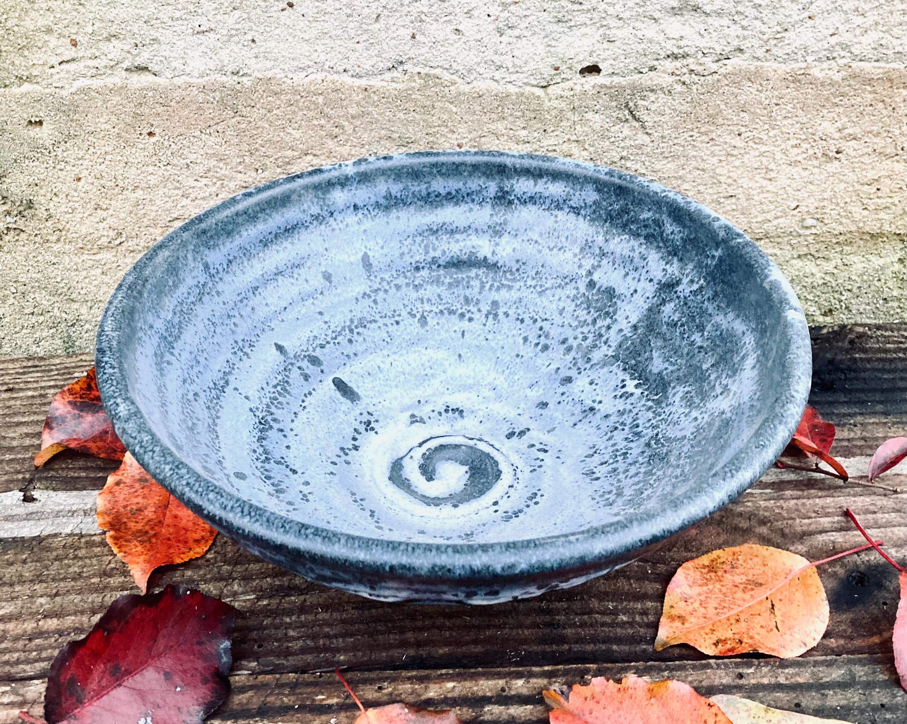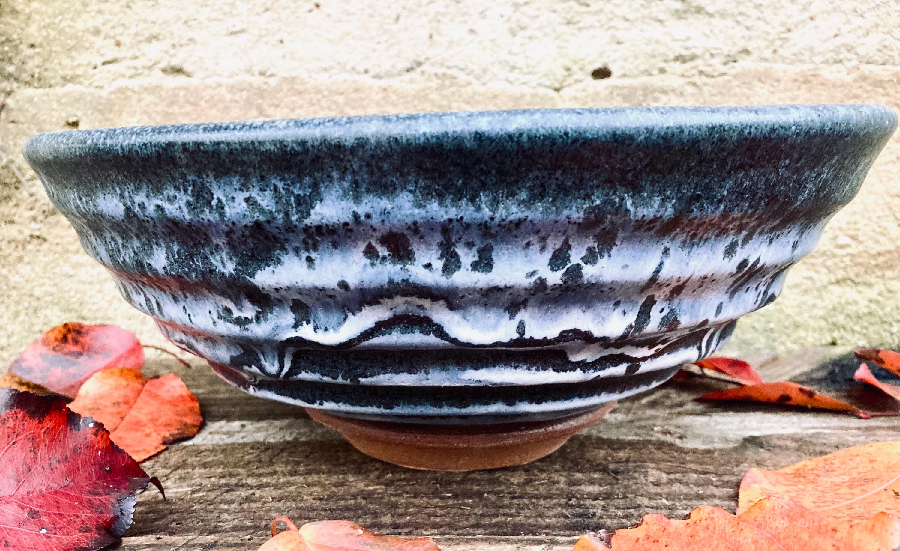 This stoneware bowl was thrown on the wheel and fired to vitrification for strength and durability. It was slow cooled to give the glazes time to run, pool, and develop interesting patterns.