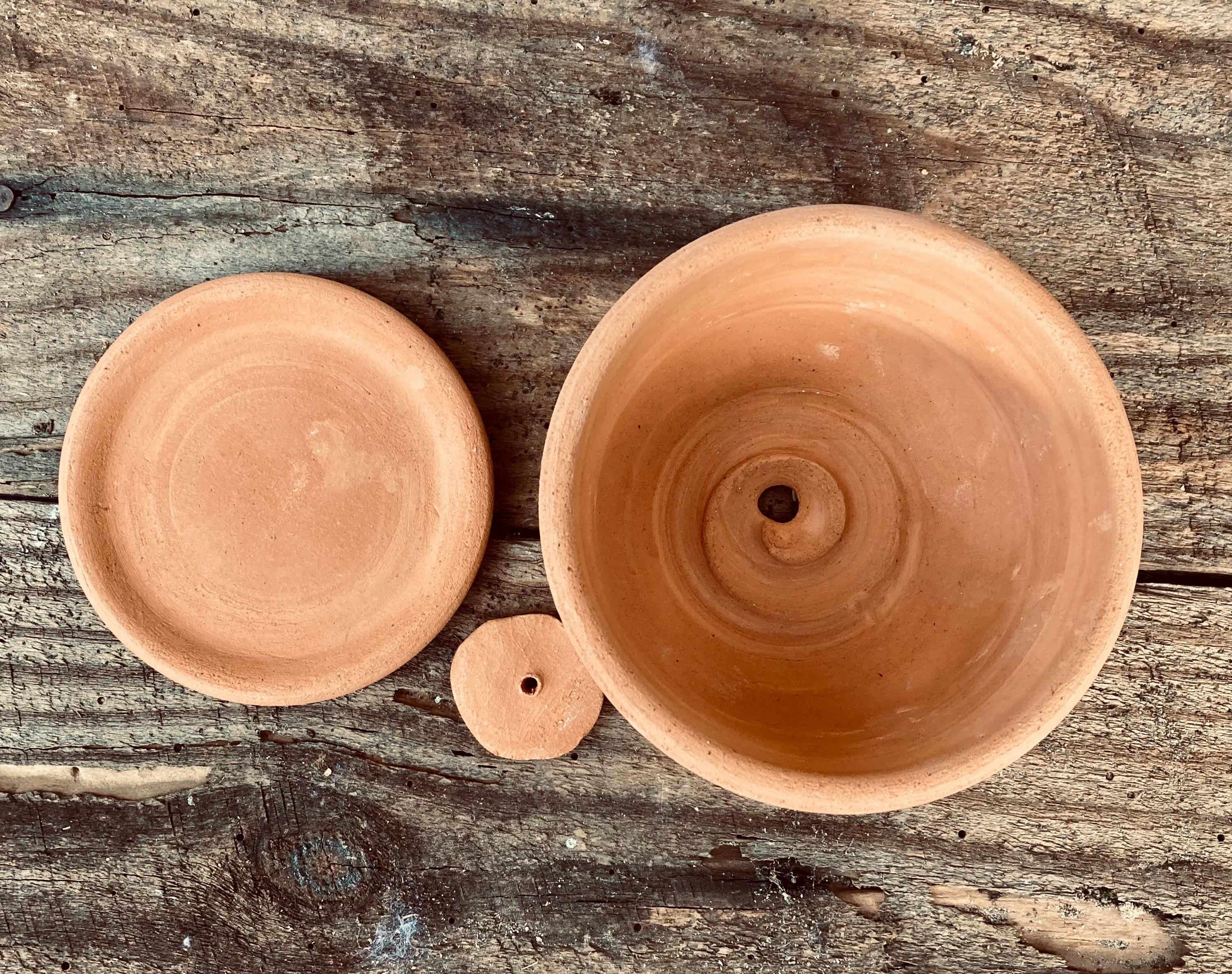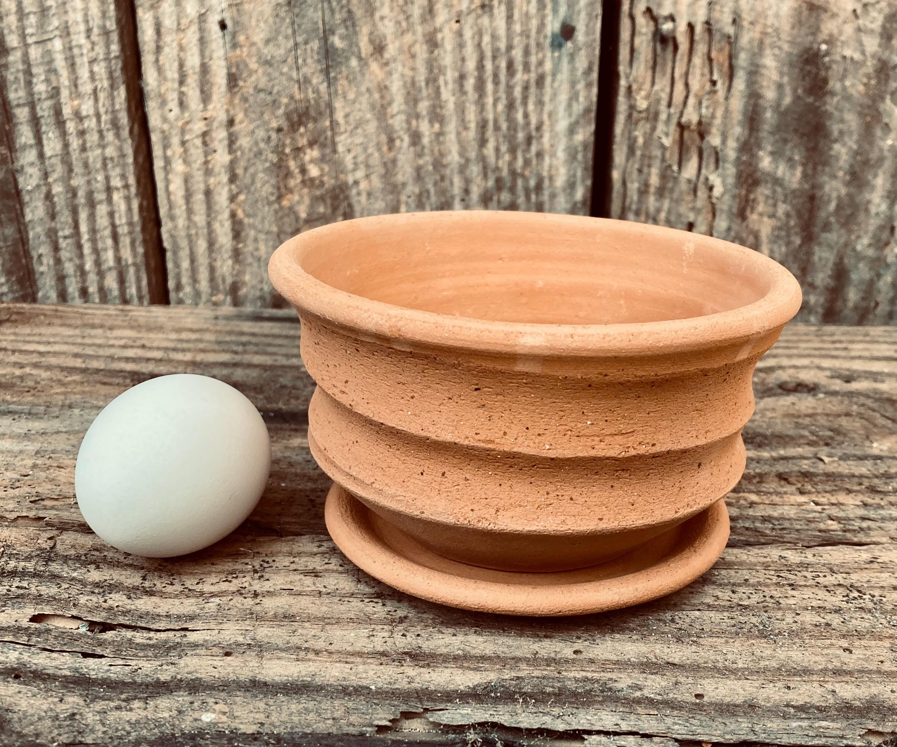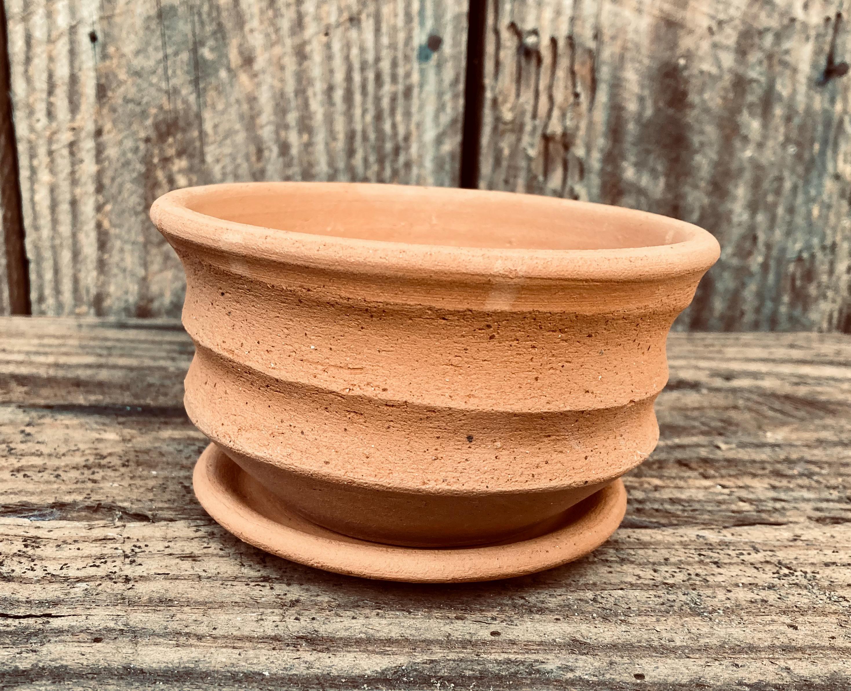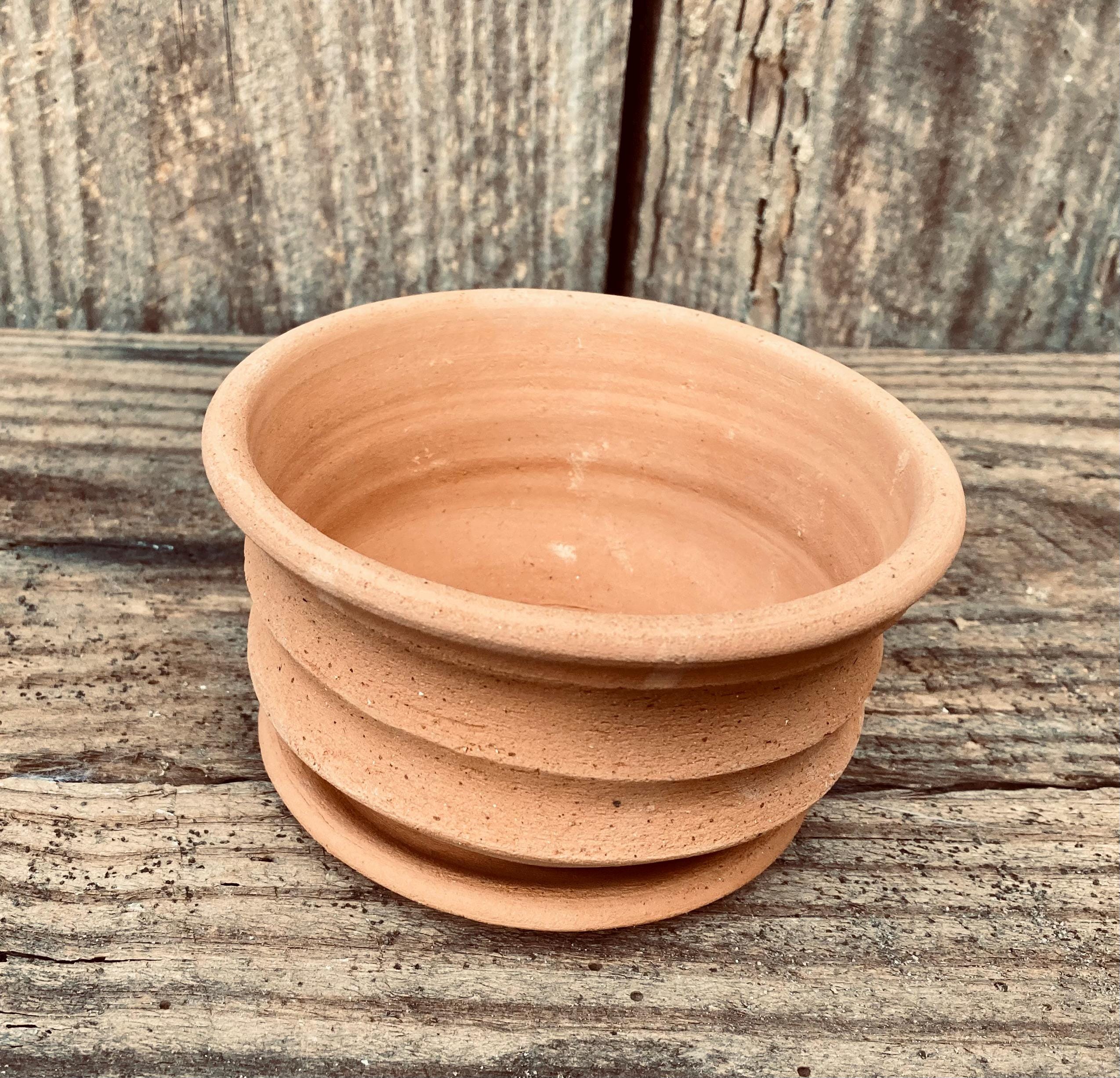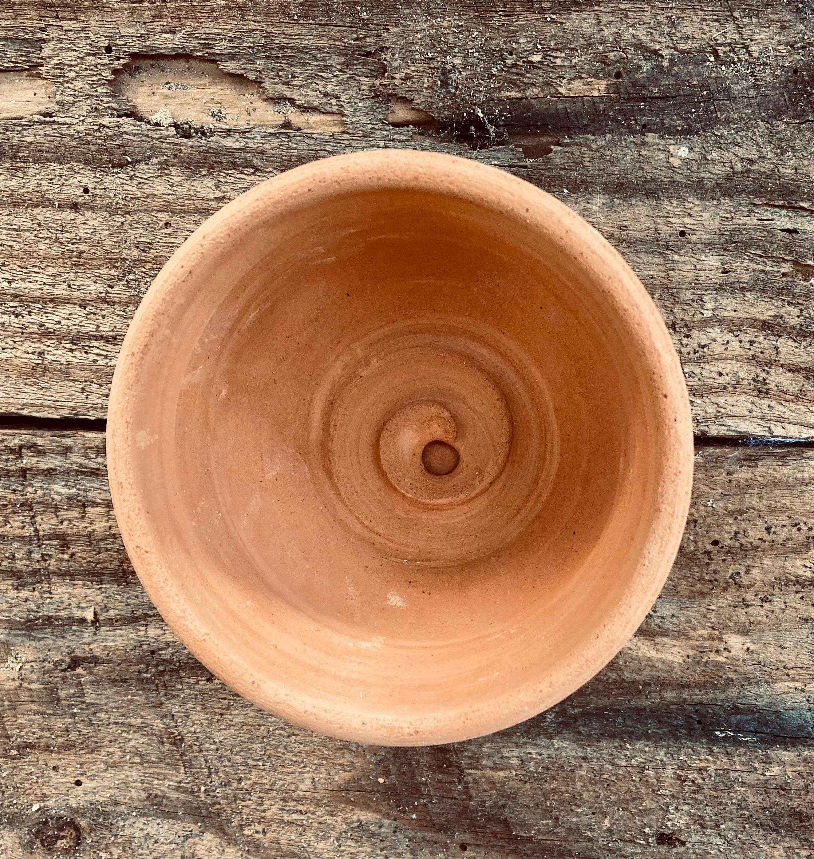This small, terracotta planter was made of wheel-thrown, locally dug clay that when fired to the right temperature comes out a nice terracotta color and is porous. This allows air and water to flow through the pot which prevents root rot and soil disease.