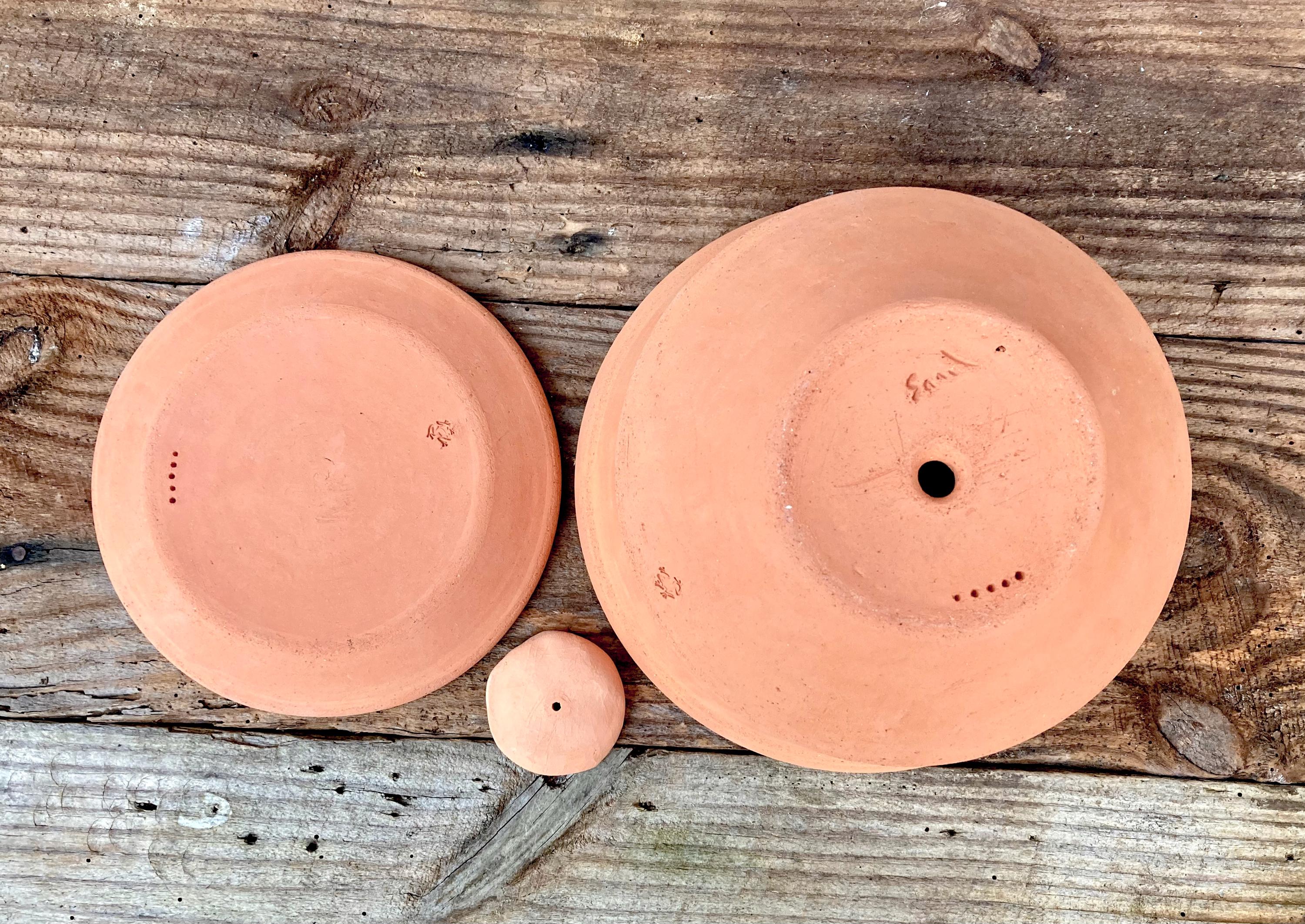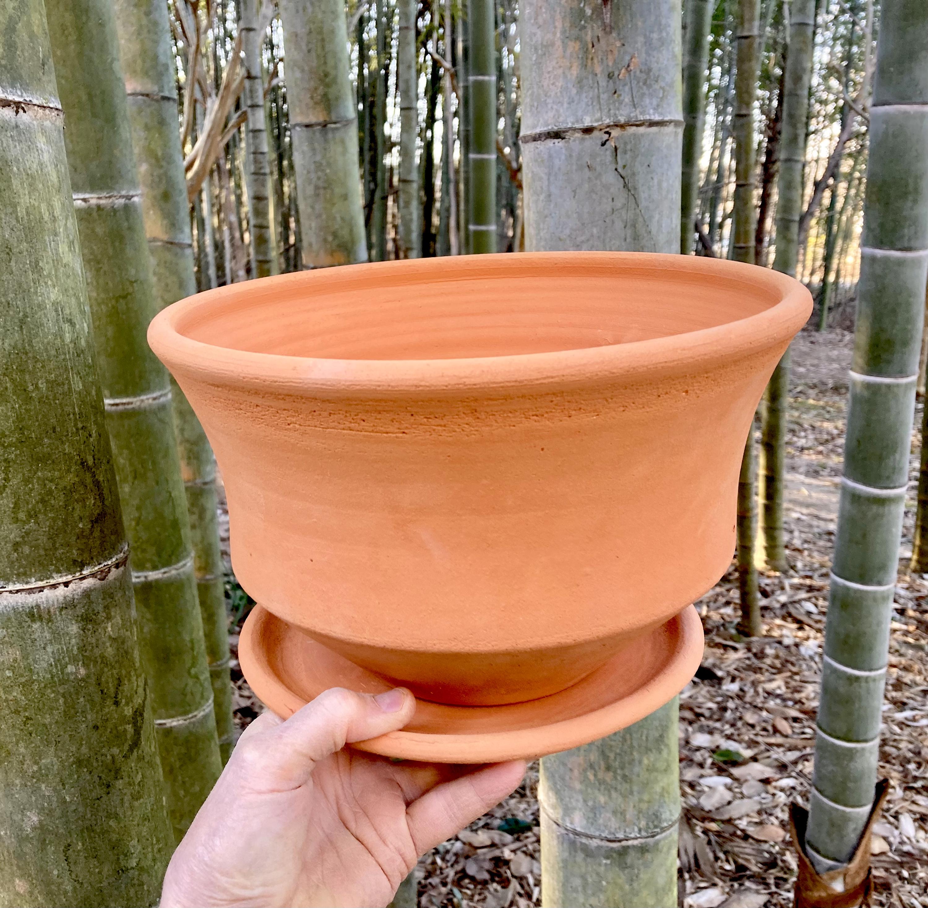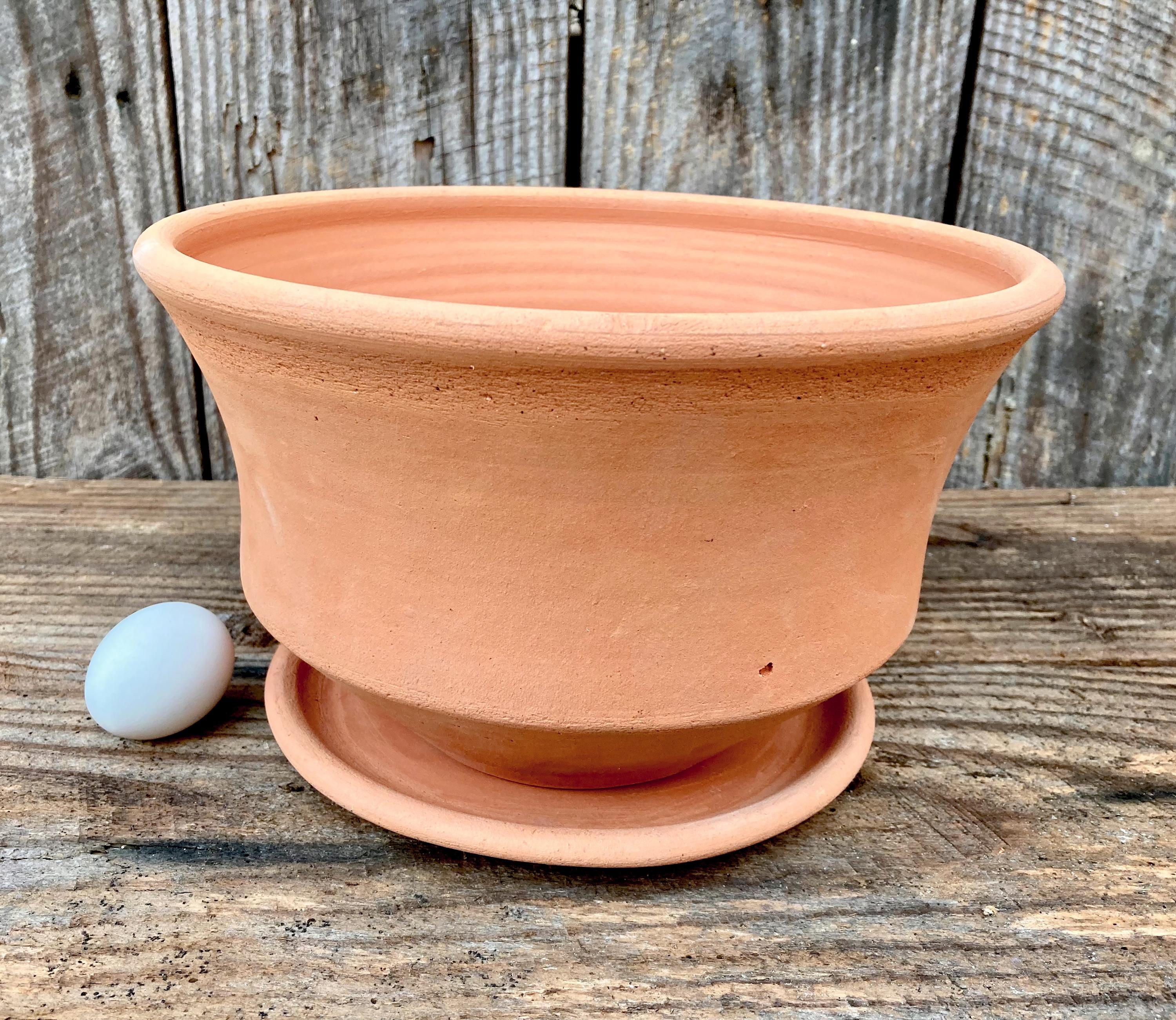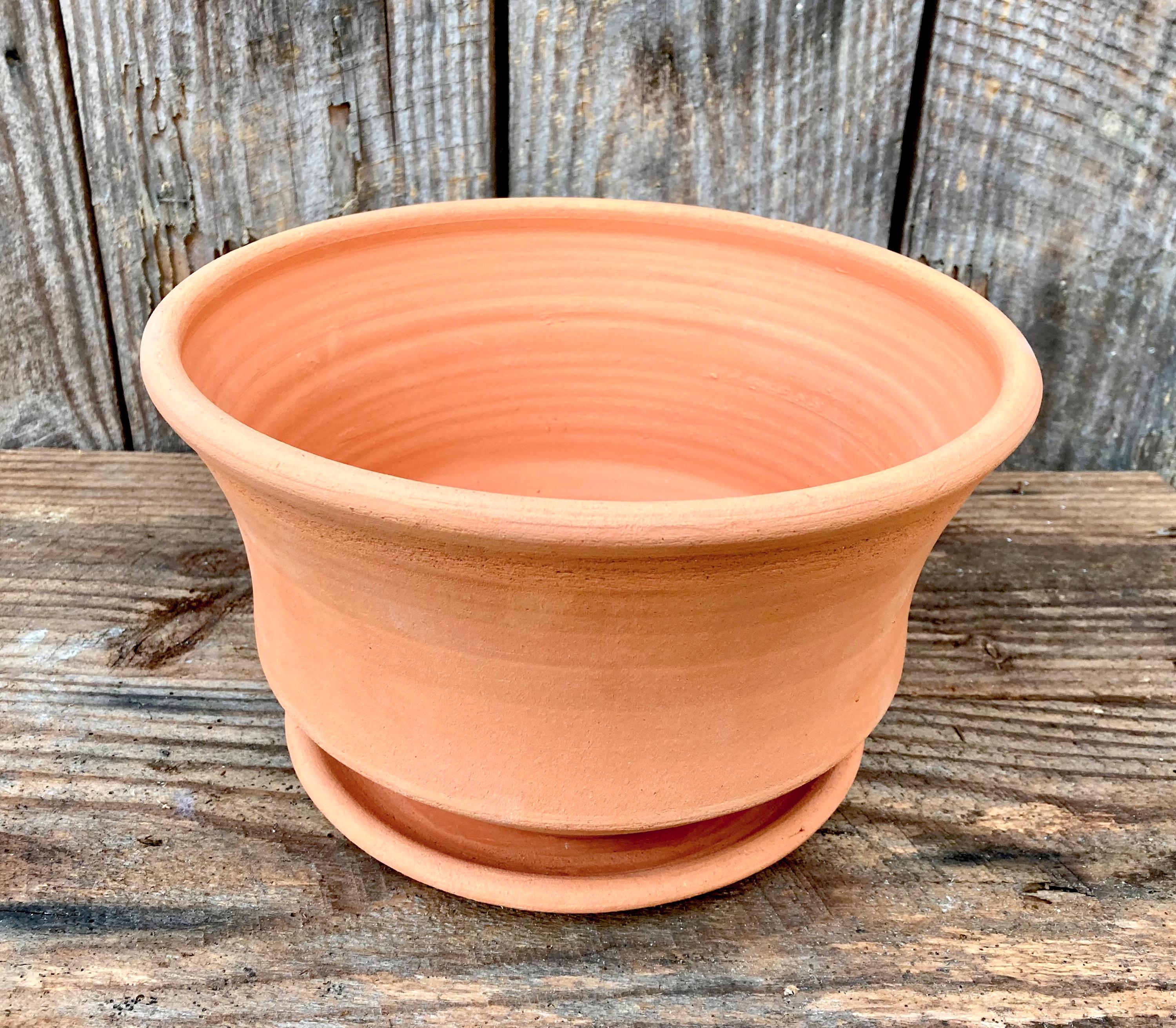 This large, terracotta planter with saucer was made of wheel-thrown, locally dug clay that when fired to the right temperature comes out a nice terracotta color and is porous. This allows air and water to flow through the pot which prevents root rot and soil disease.