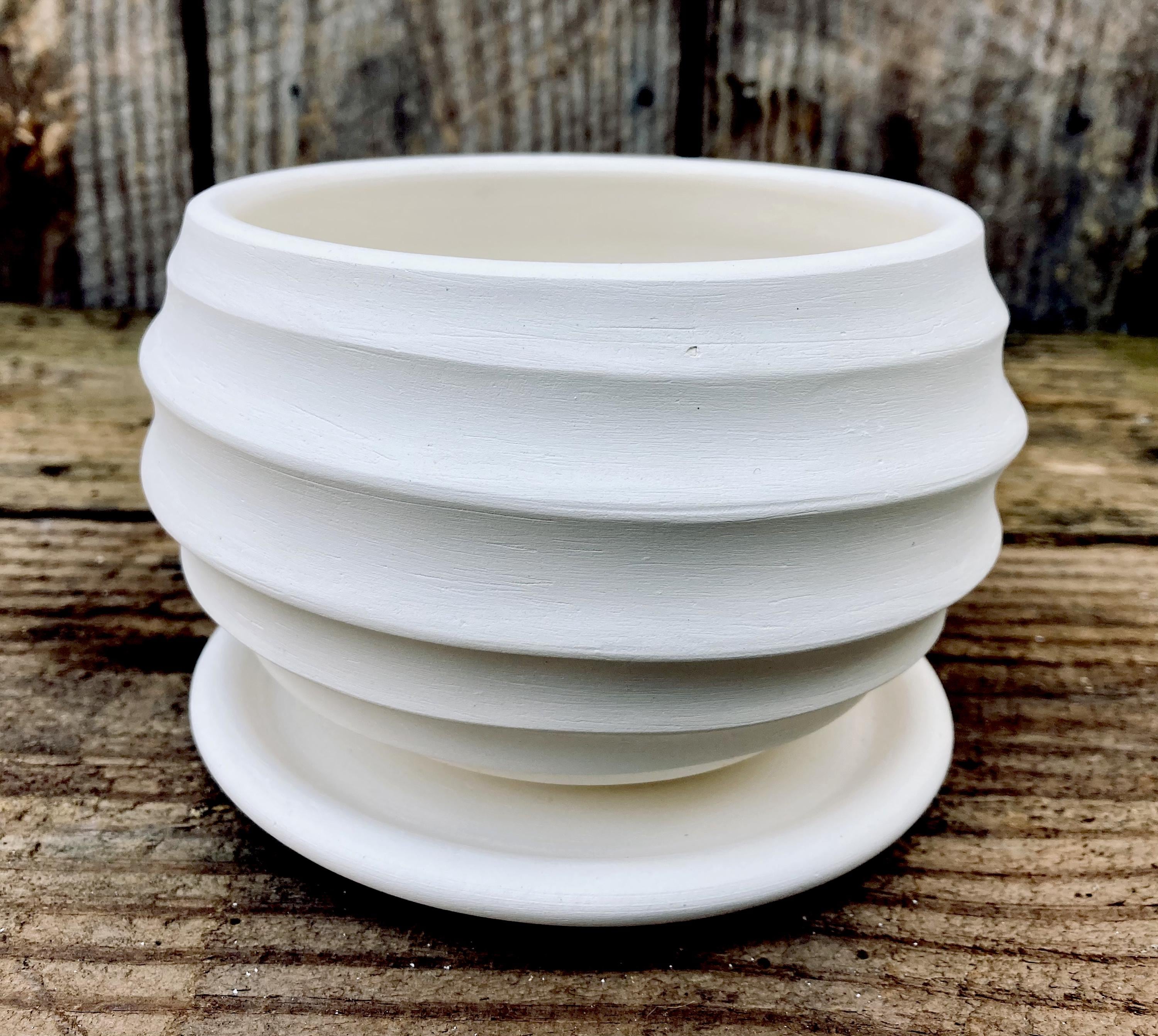 This small, round planter with saucer was made of white earthenware clay. Like terracotta it is porous. This allows air and water to flow through the pot which prevents root rot and soil disease.