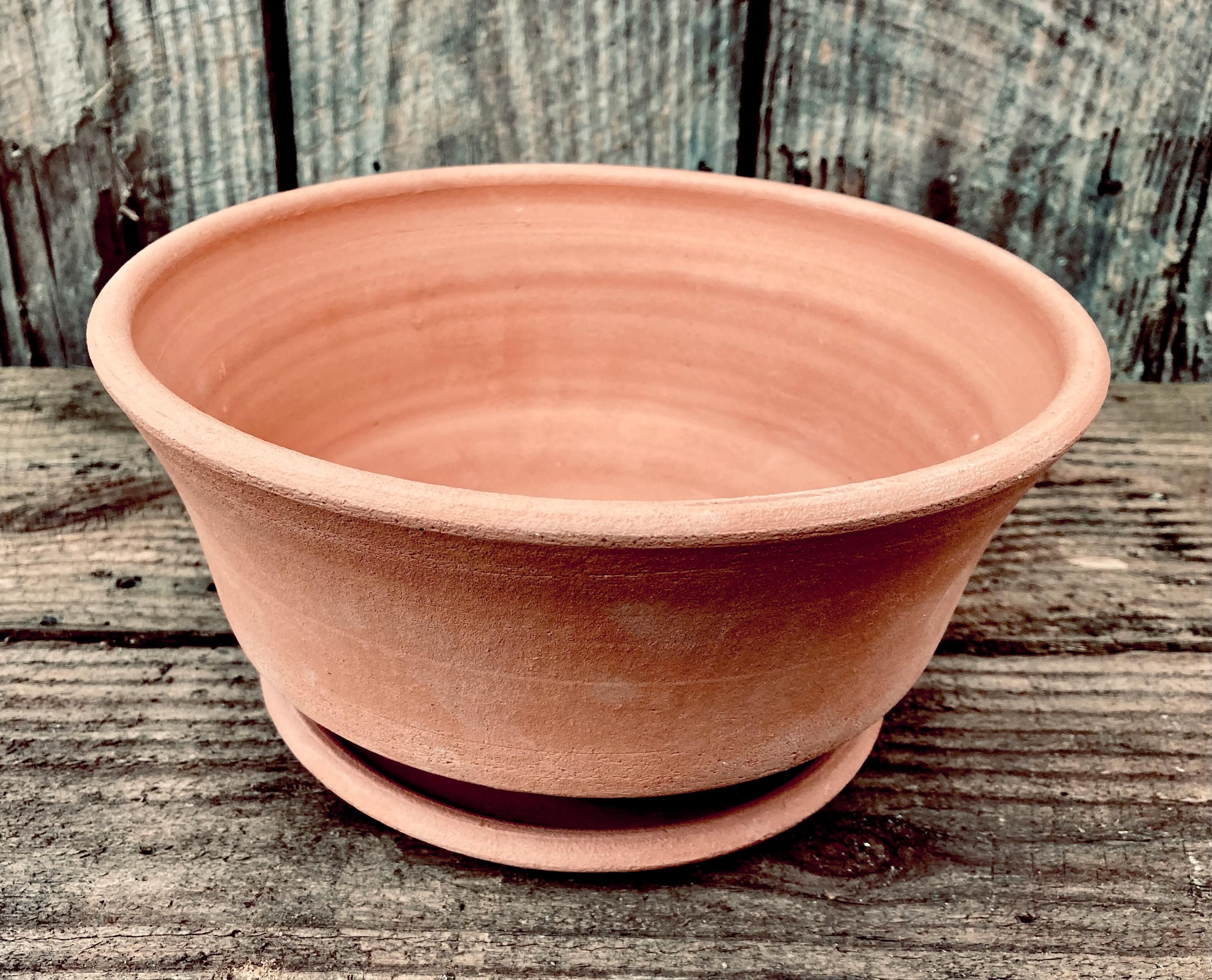This terracotta planter was made of wheel-thrown, locally dug clay that when fired to the right temperature comes out a nice terracotta color and is porous. This allows air and water to flow through the pot which prevents root rot and soil disease.