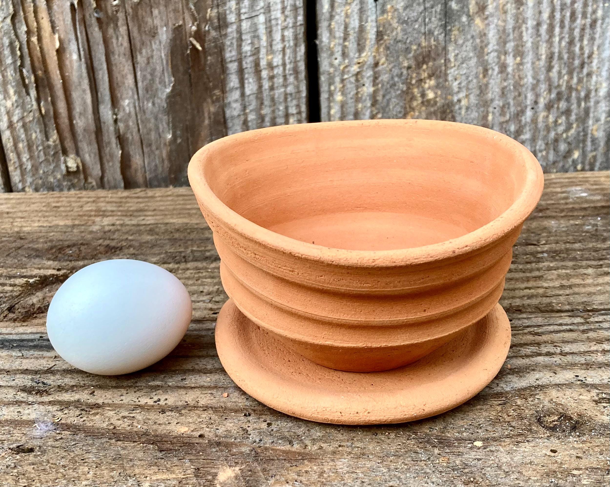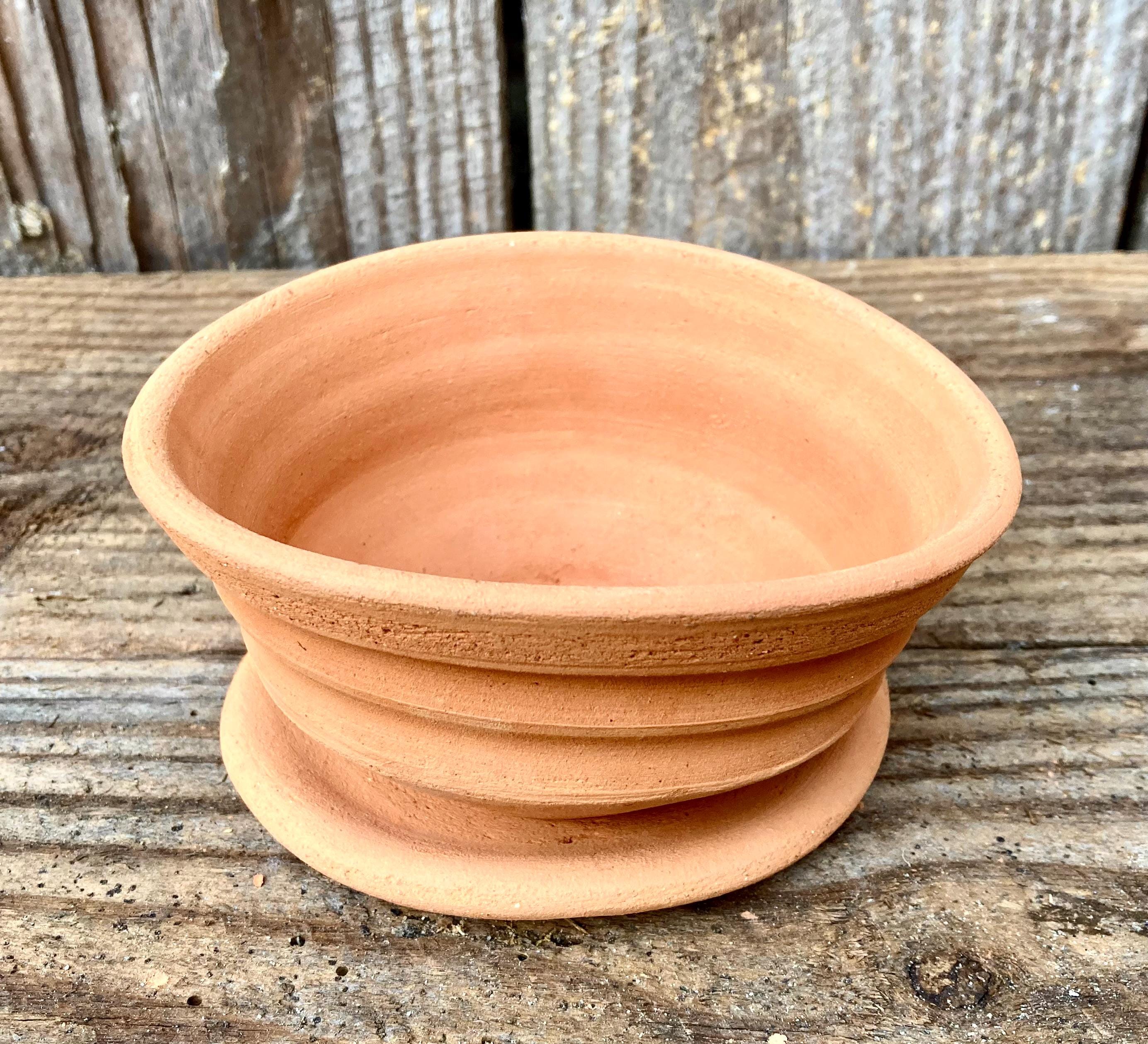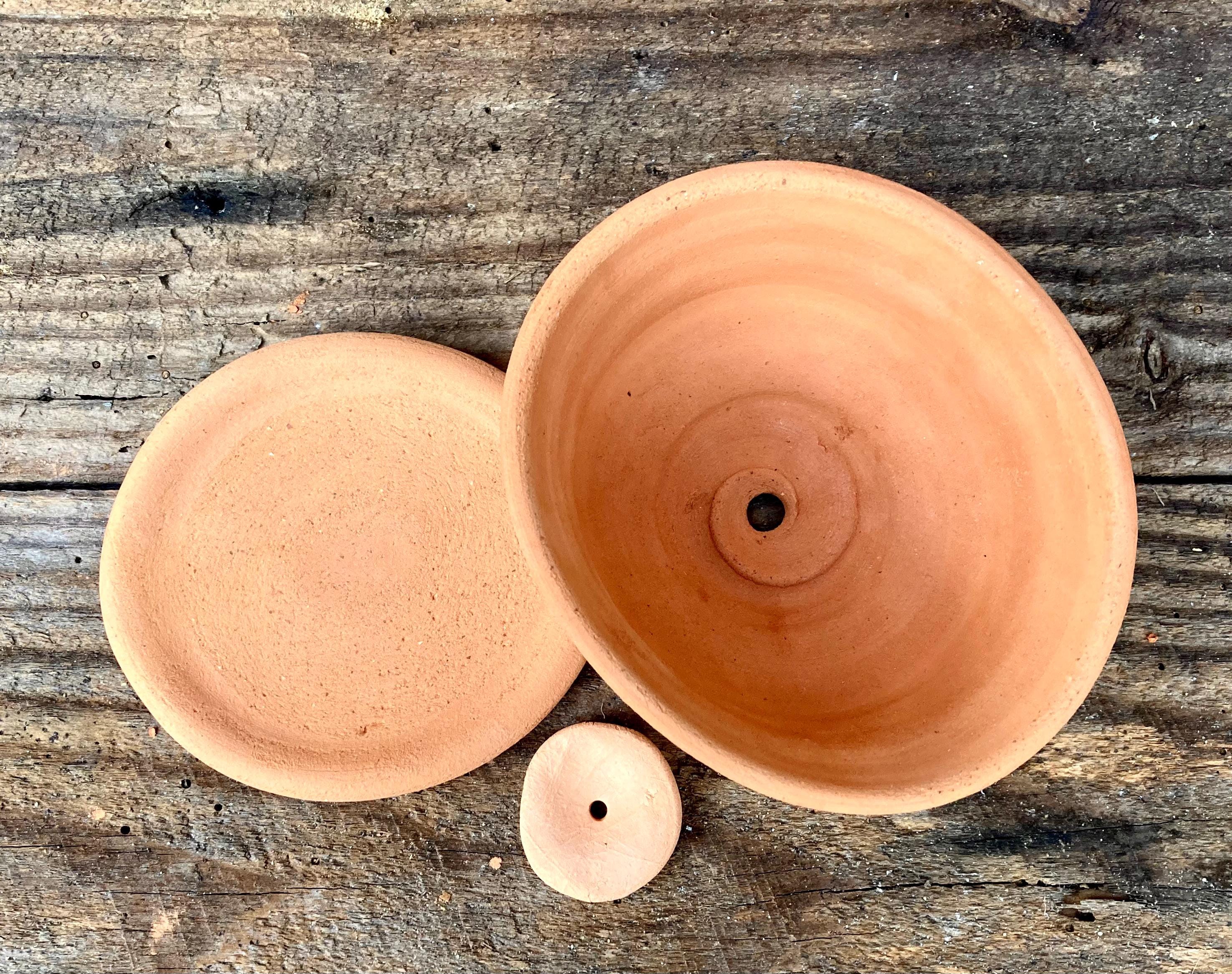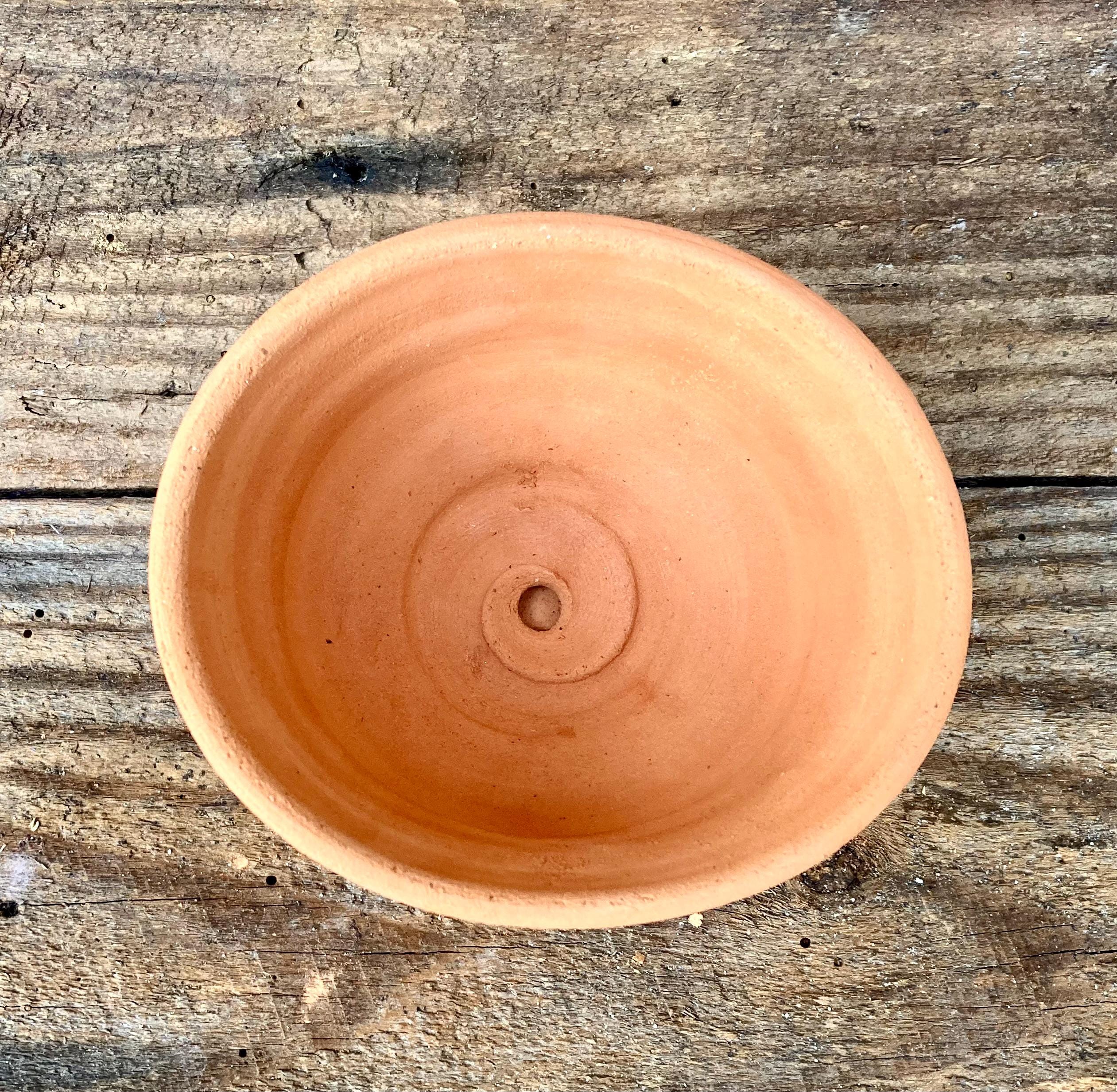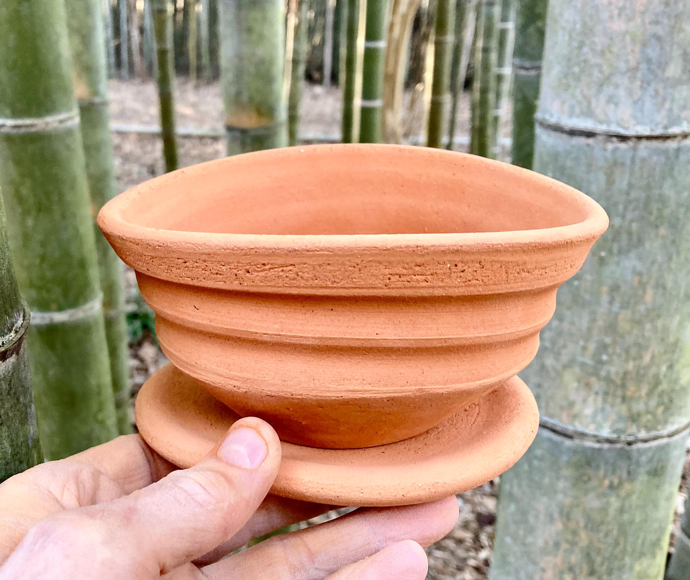 This small, terracotta planter with saucer was made of wheel-thrown, locally dug clay that when fired to the right temperature comes out a nice terracotta color and is porous. This allows air and water to flow through the pot which prevents root rot and soil disease.