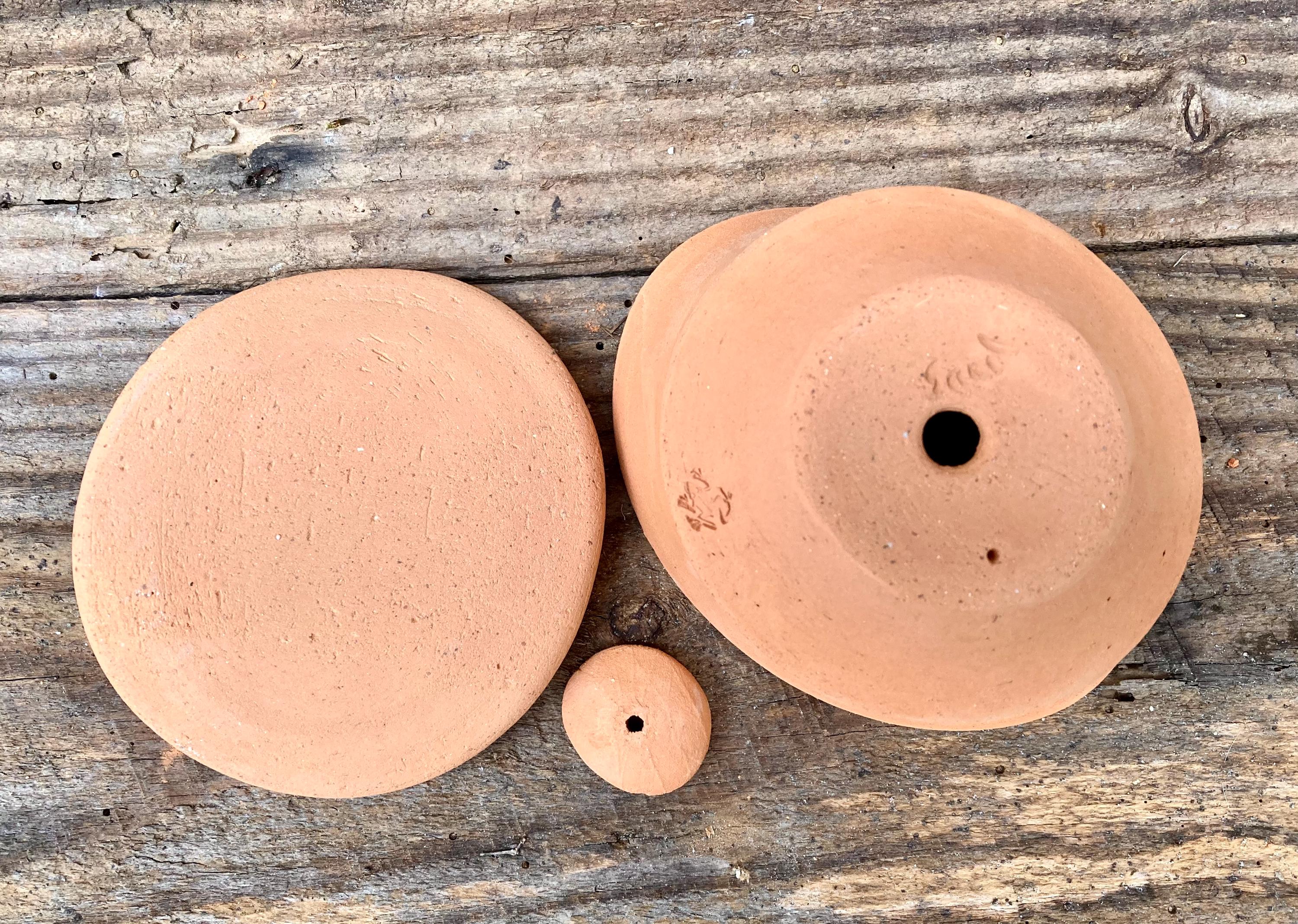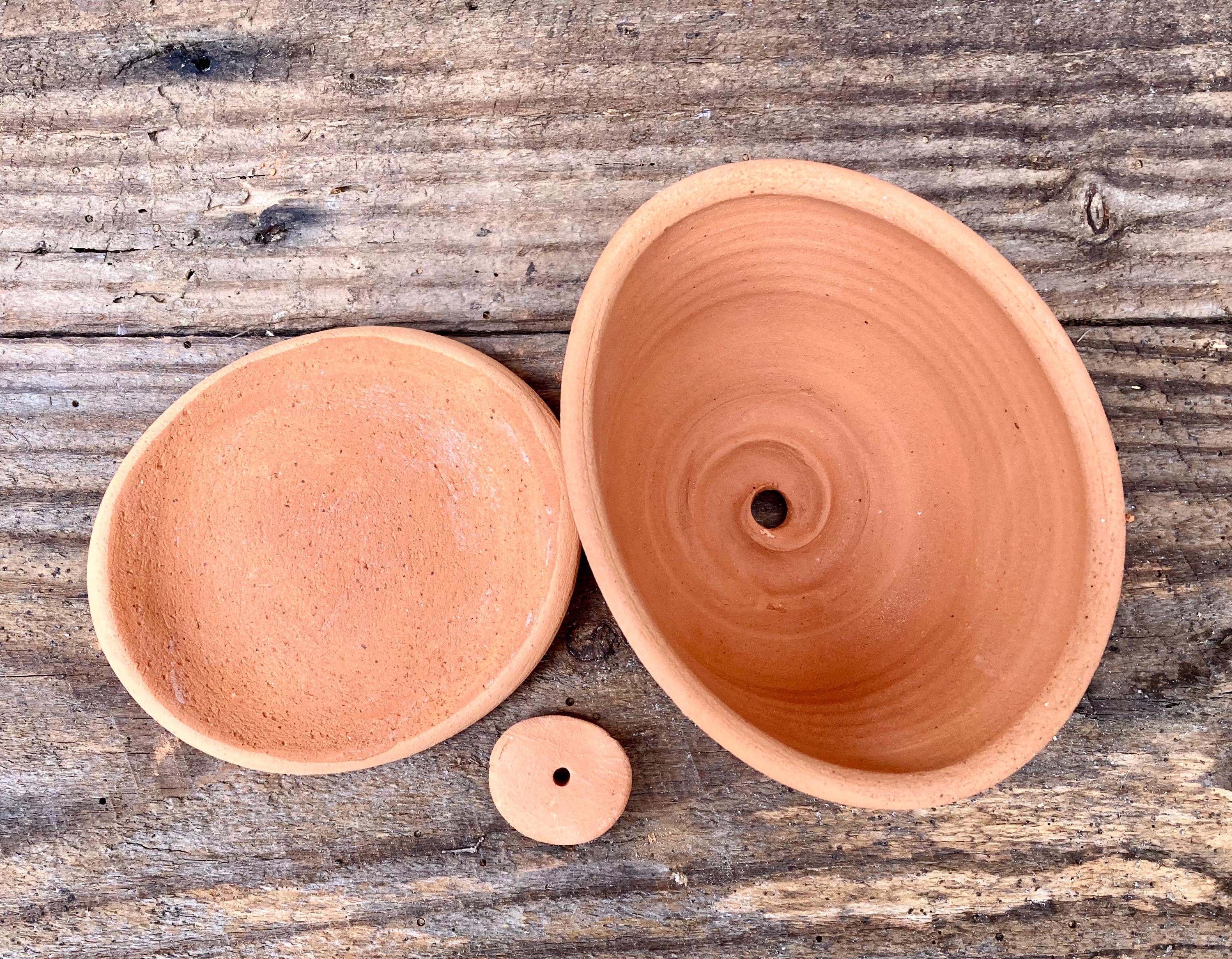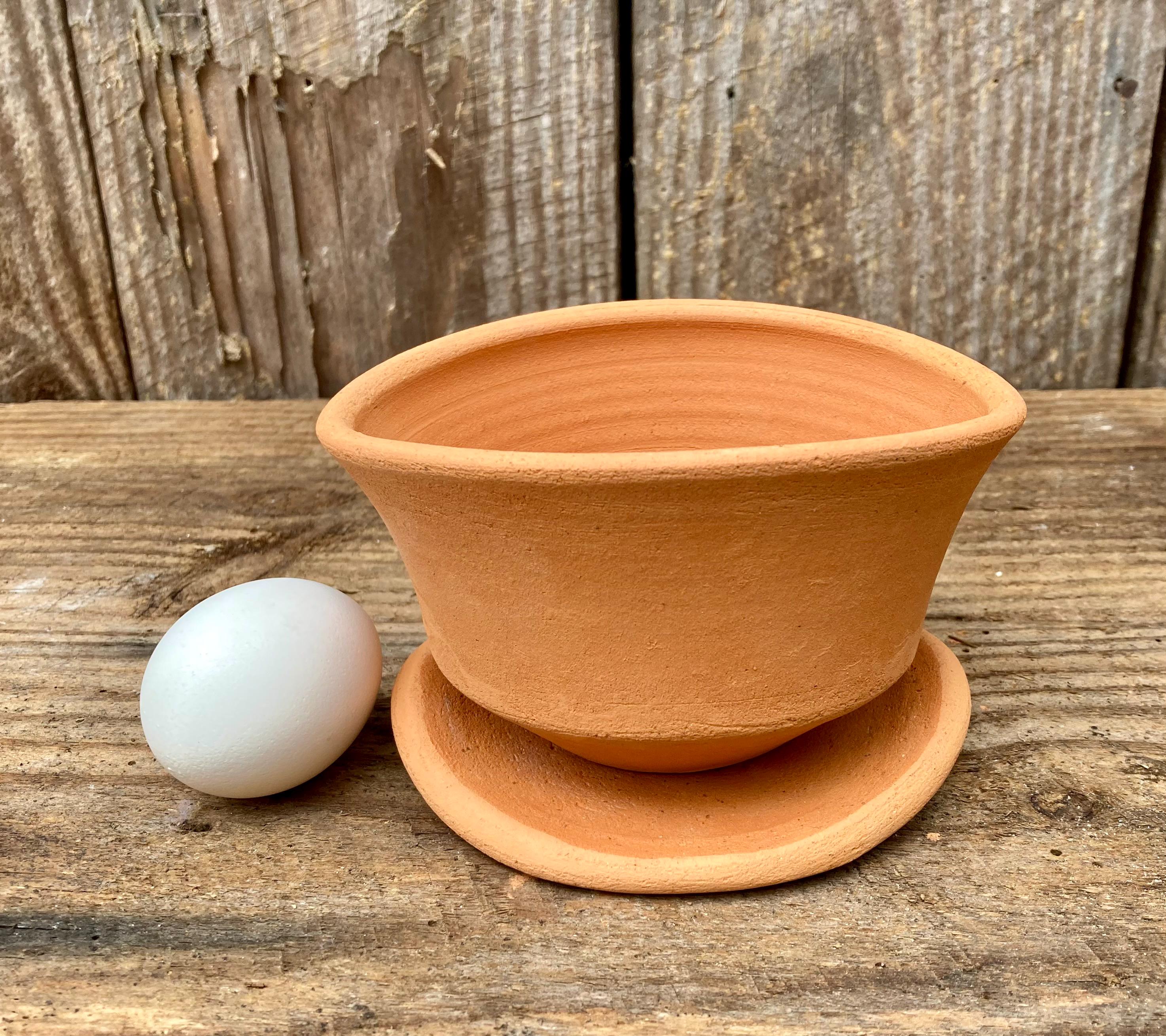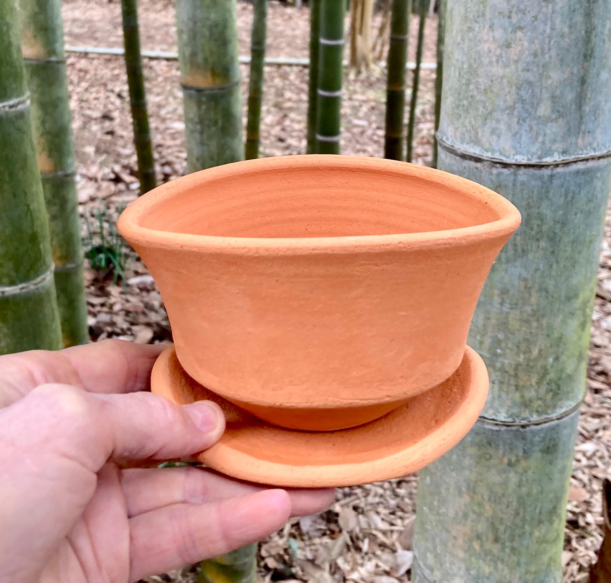 This small, terracotta planter with saucer was made of wheel-thrown, locally dug clay that when fired to the right temperature comes out a nice terracotta color and is porous. This allows air and water to flow through the pot which prevents root rot and soil disease.