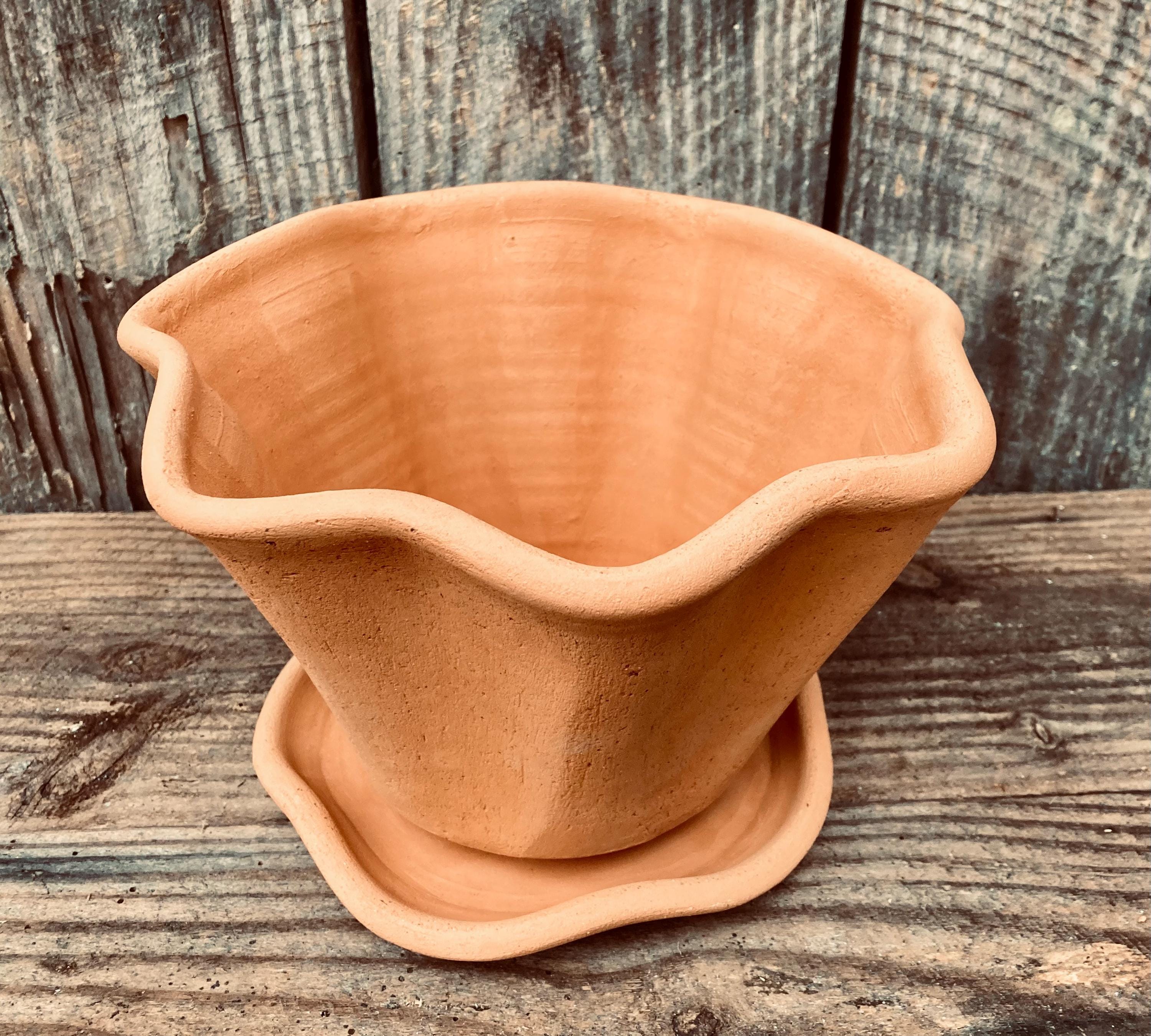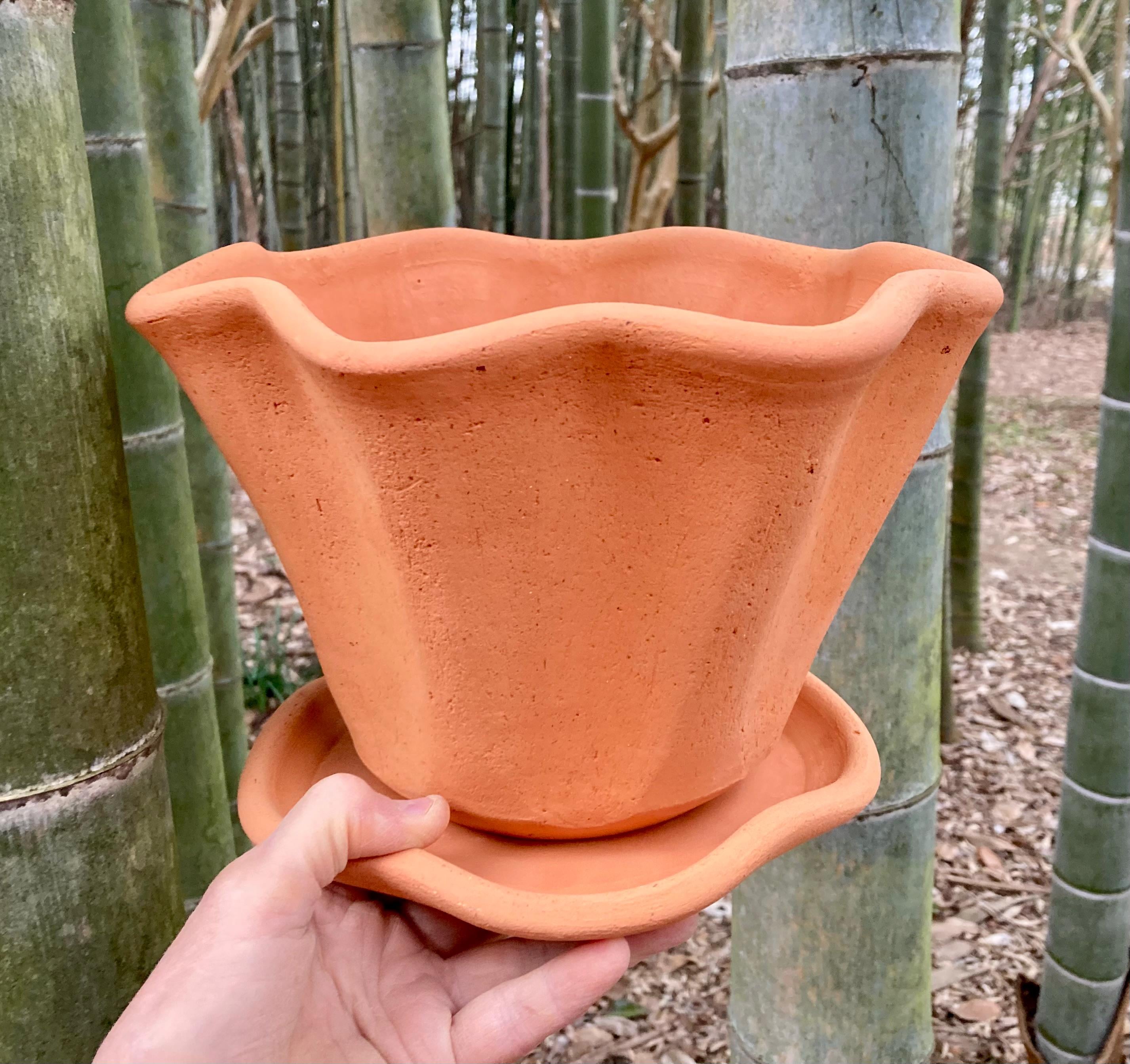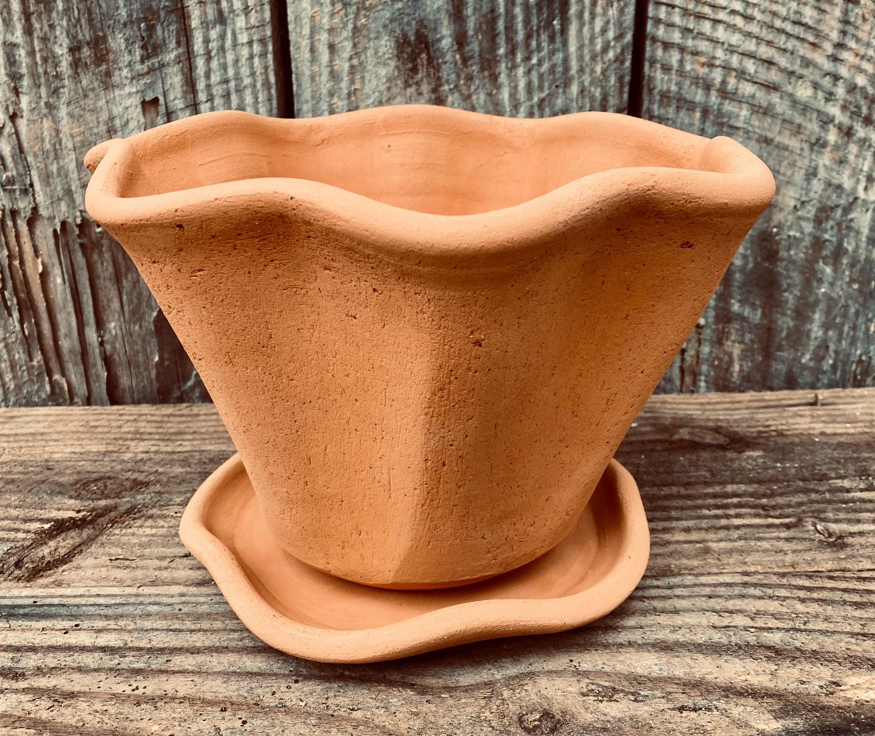 This large, fluted, terracotta planter with saucer was made of wheel-thrown, locally dug clay that when fired to the right temperature comes out a nice terracotta color and is porous. This allows air and water to flow through the pot which prevents root rot and soil disease.