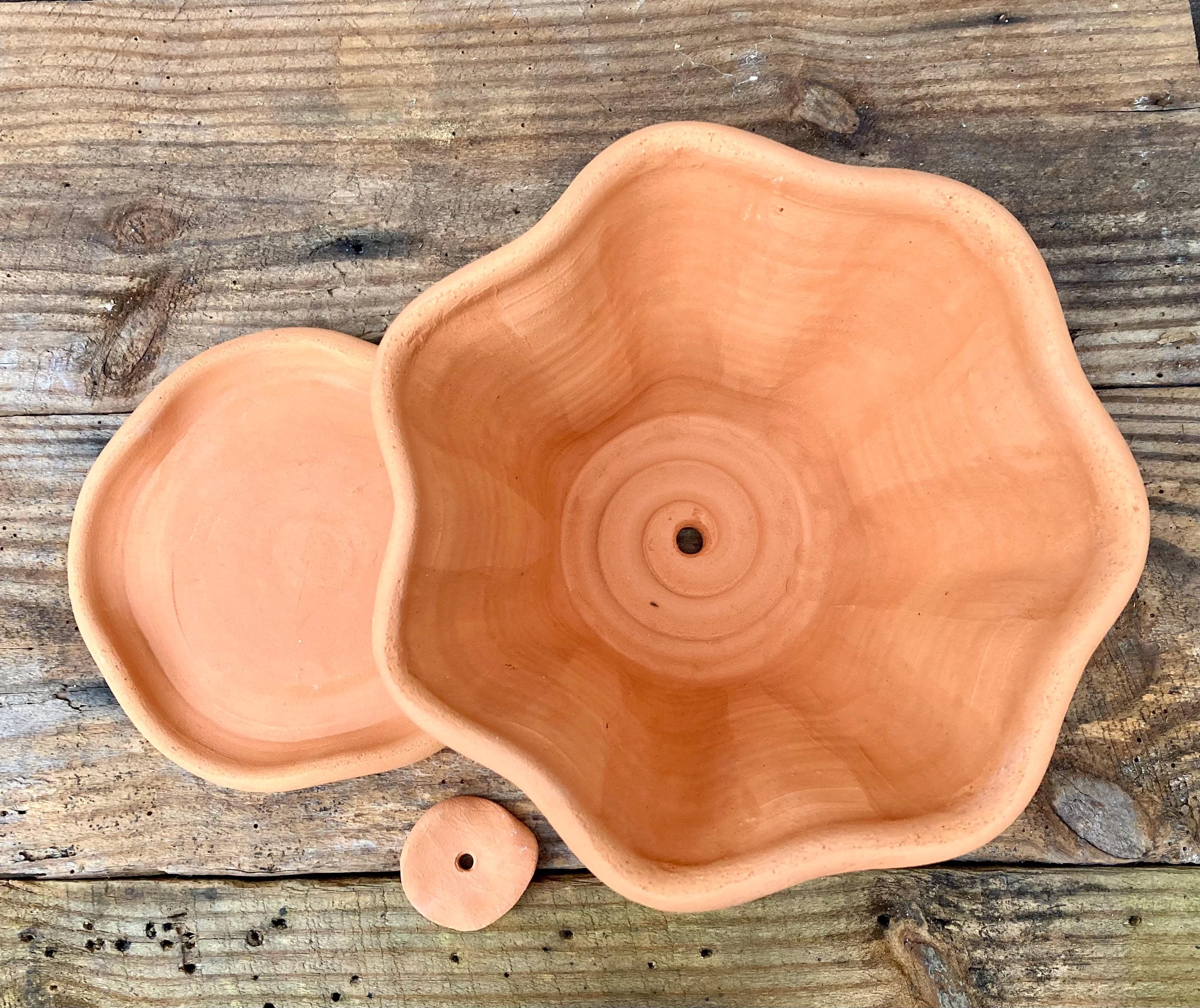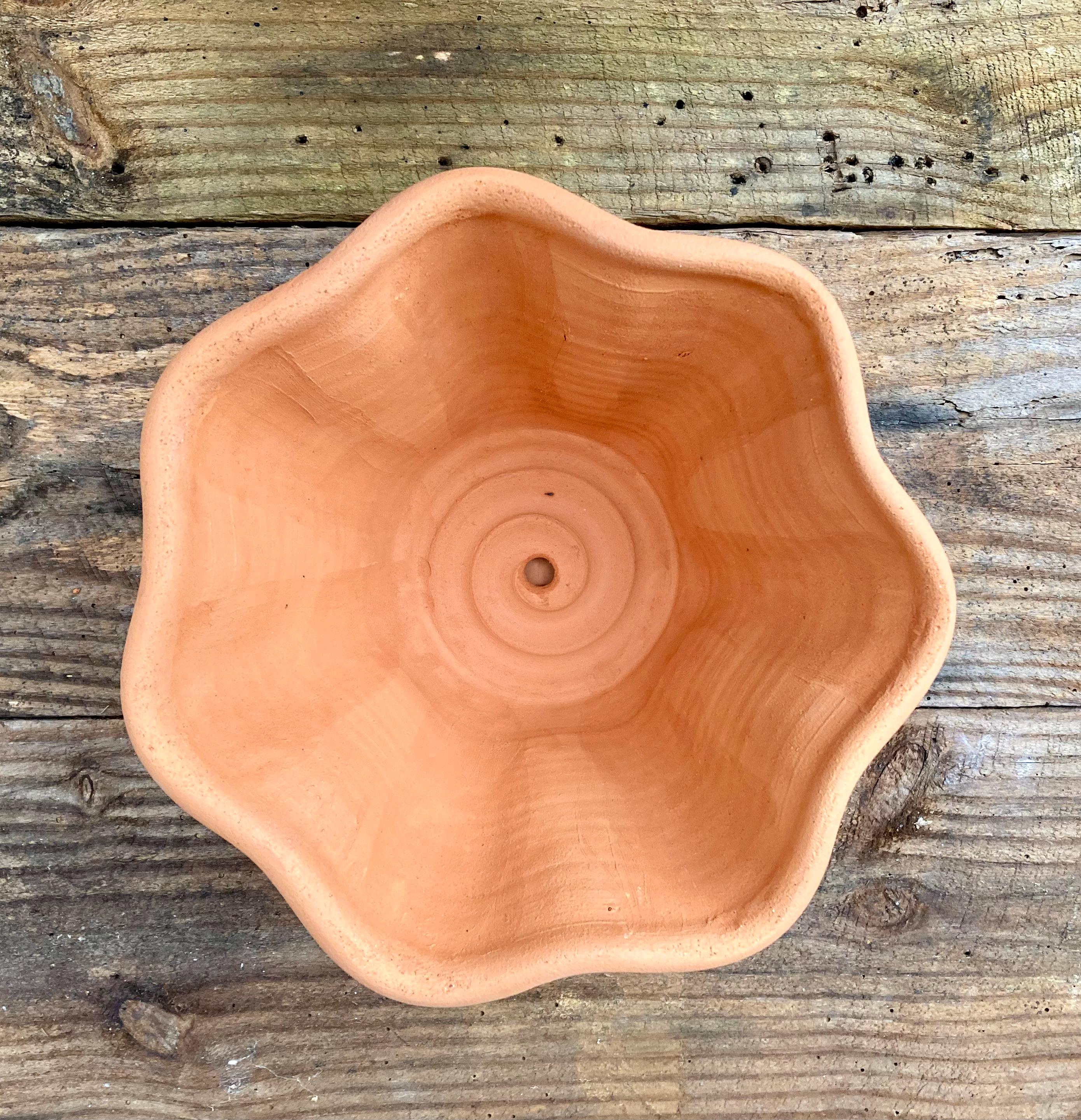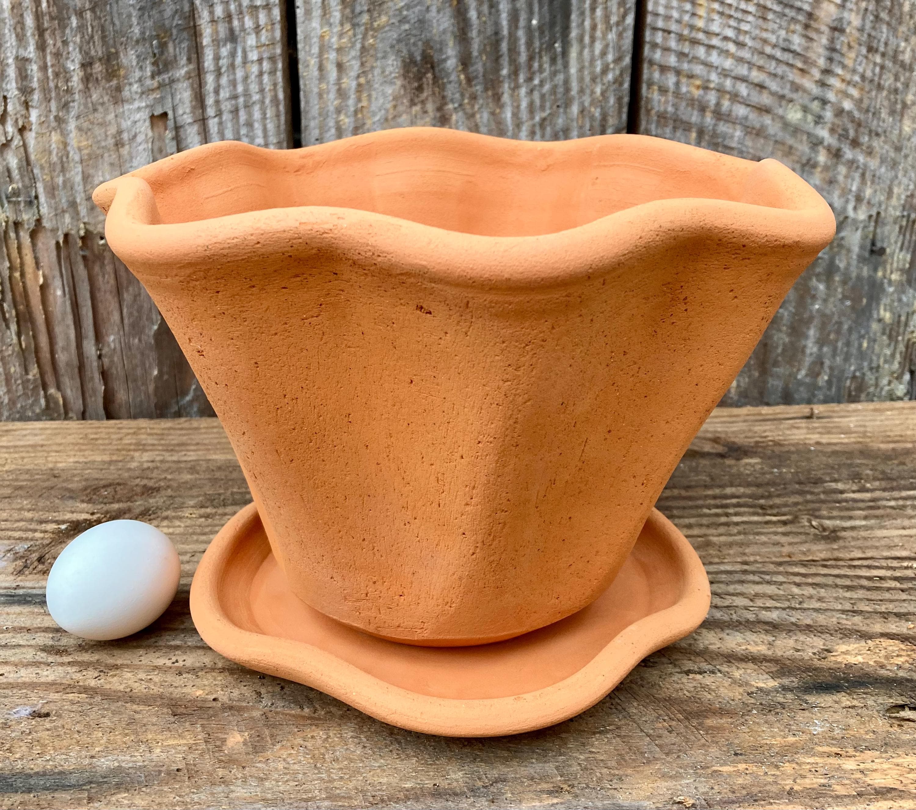 This large, fluted, terracotta planter with saucer was made of wheel-thrown, locally dug clay that when fired to the right temperature comes out a nice terracotta color and is porous. This allows air and water to flow through the pot which prevents root rot and soil disease.