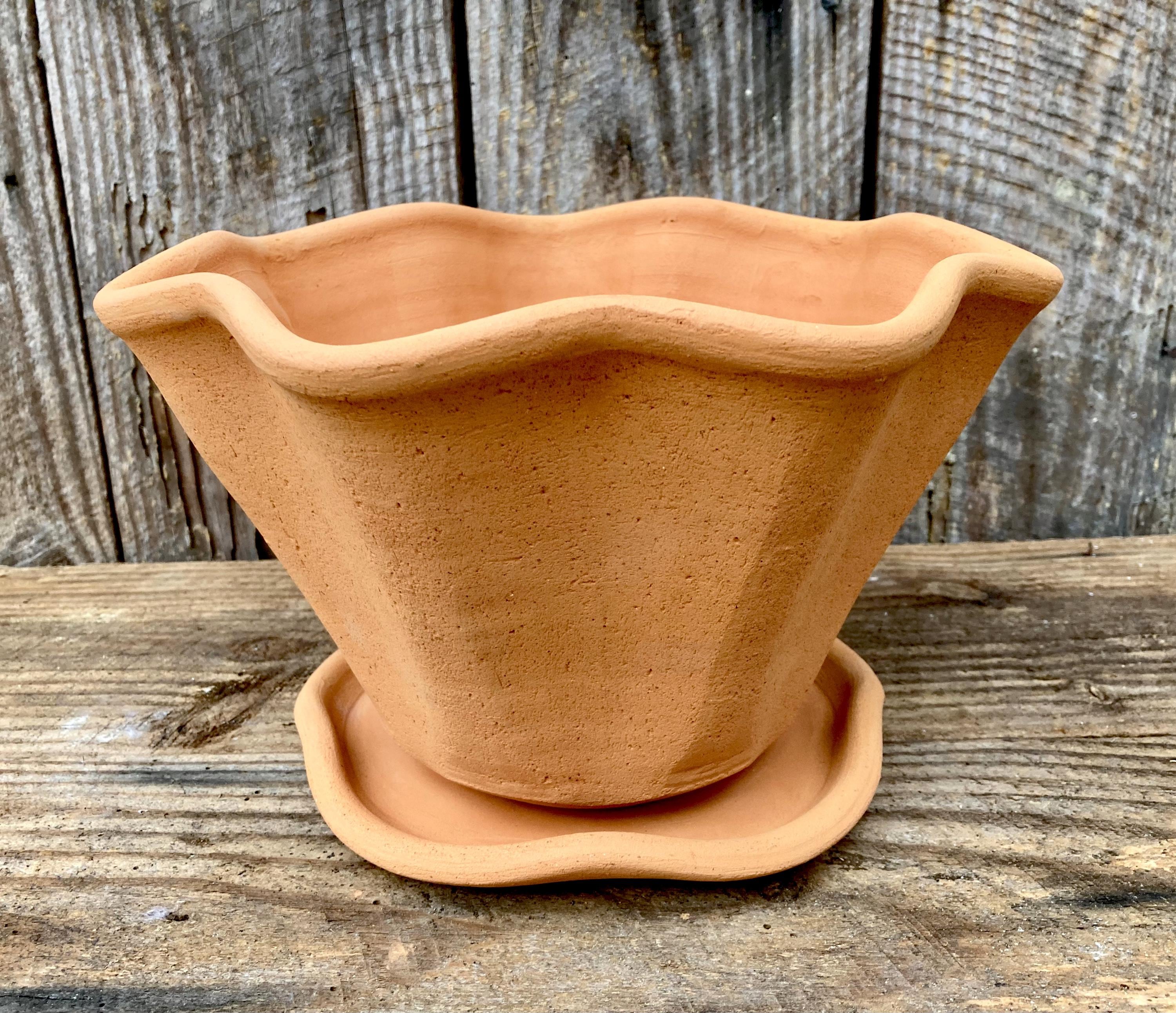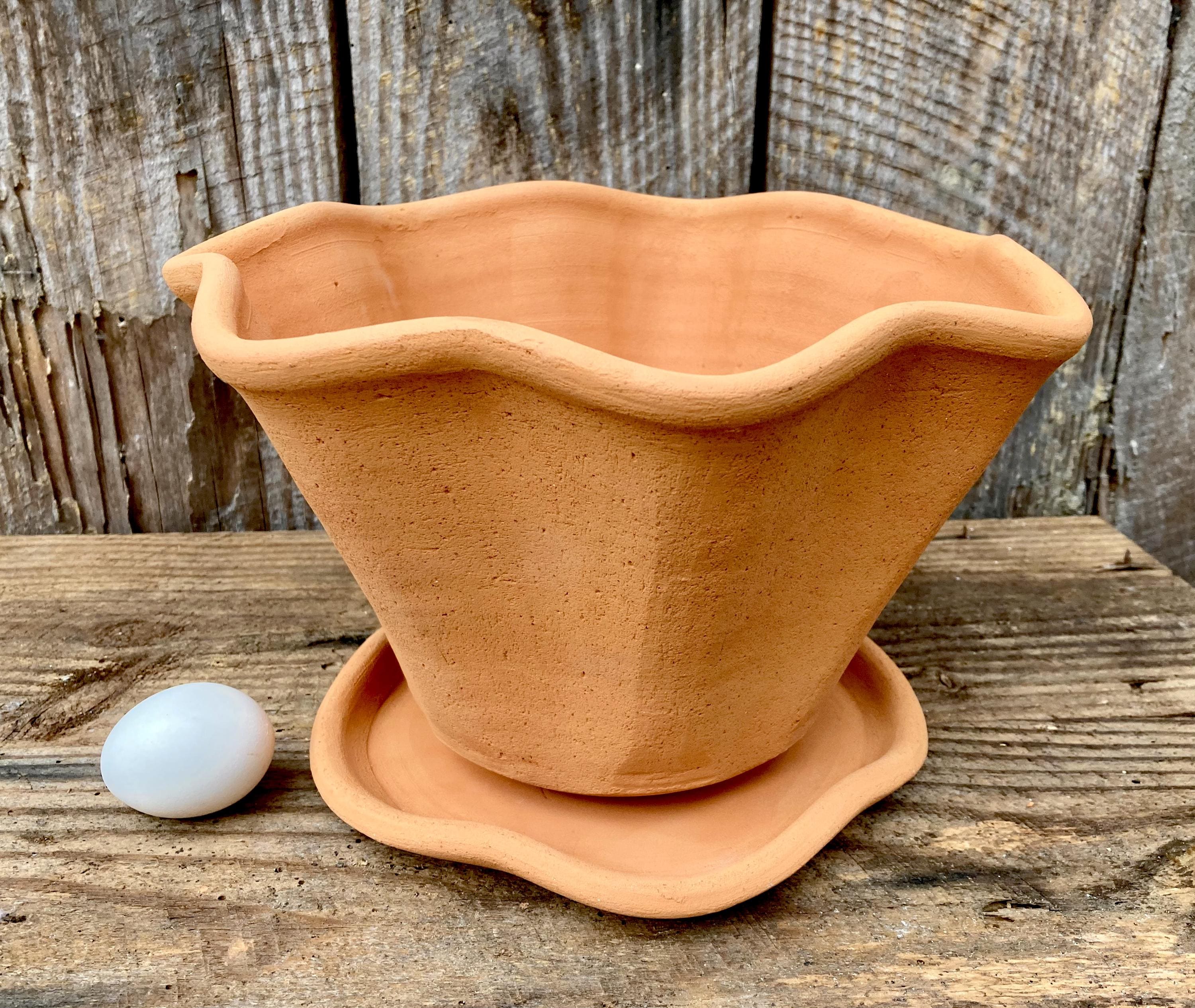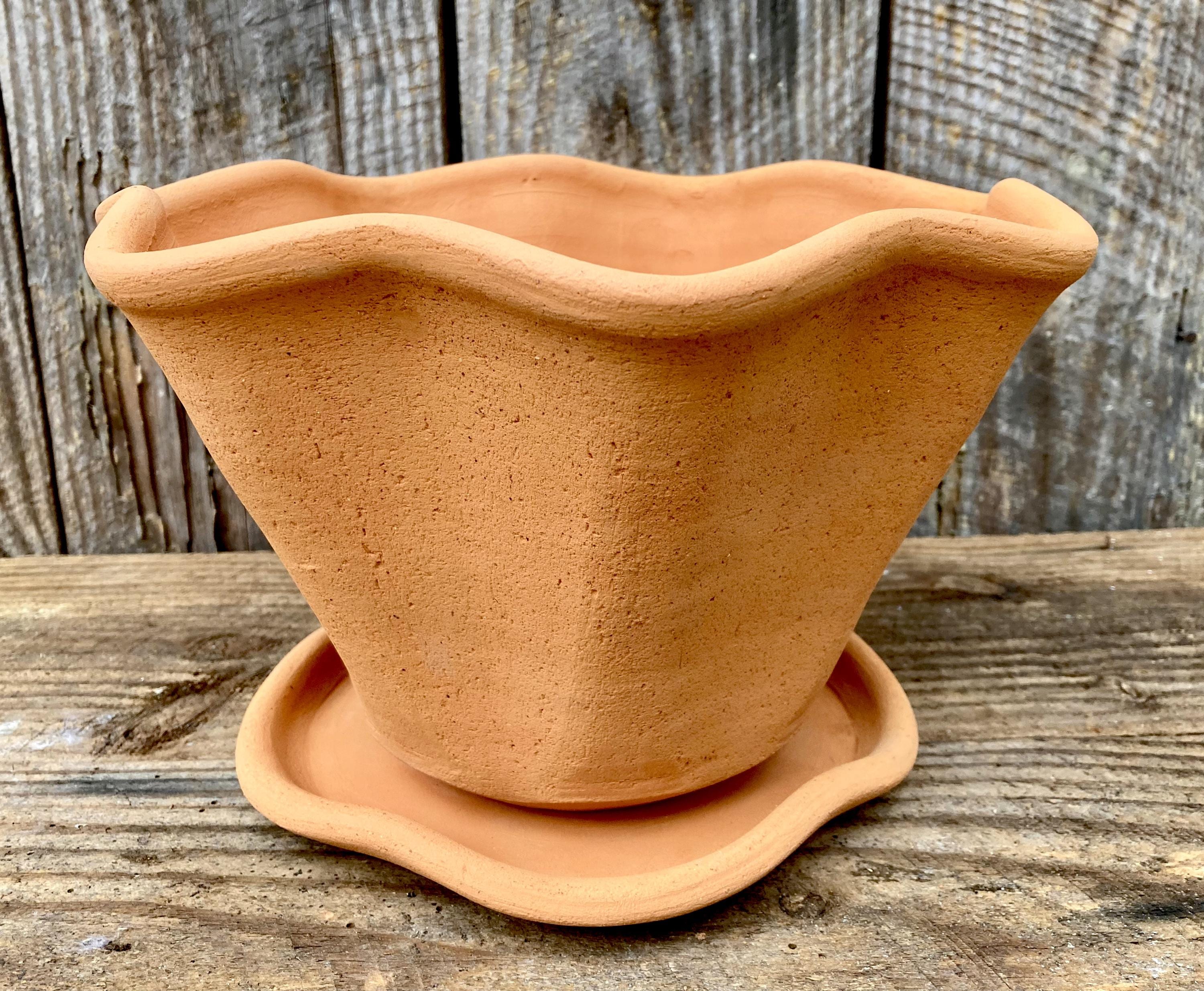 This large, fluted, terracotta planter with saucer was made of wheel-thrown, locally dug clay that when fired to the right temperature comes out a nice terracotta color and is porous. This allows air and water to flow through the pot which prevents root rot and soil disease.