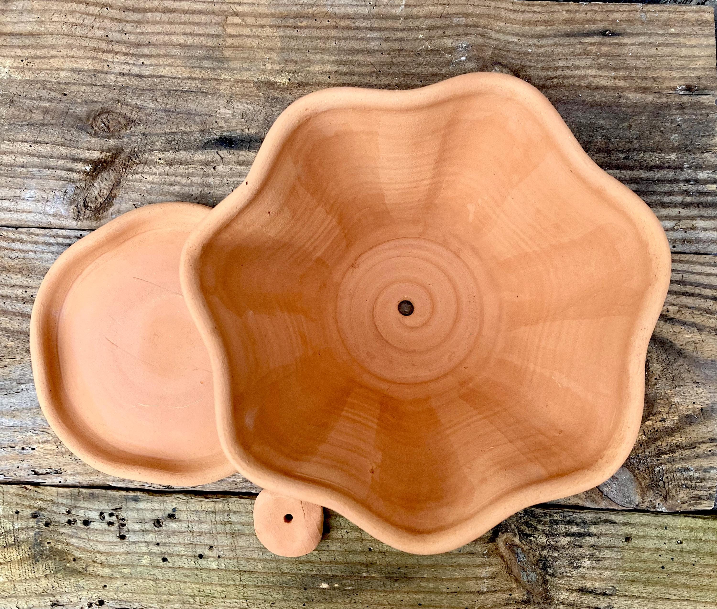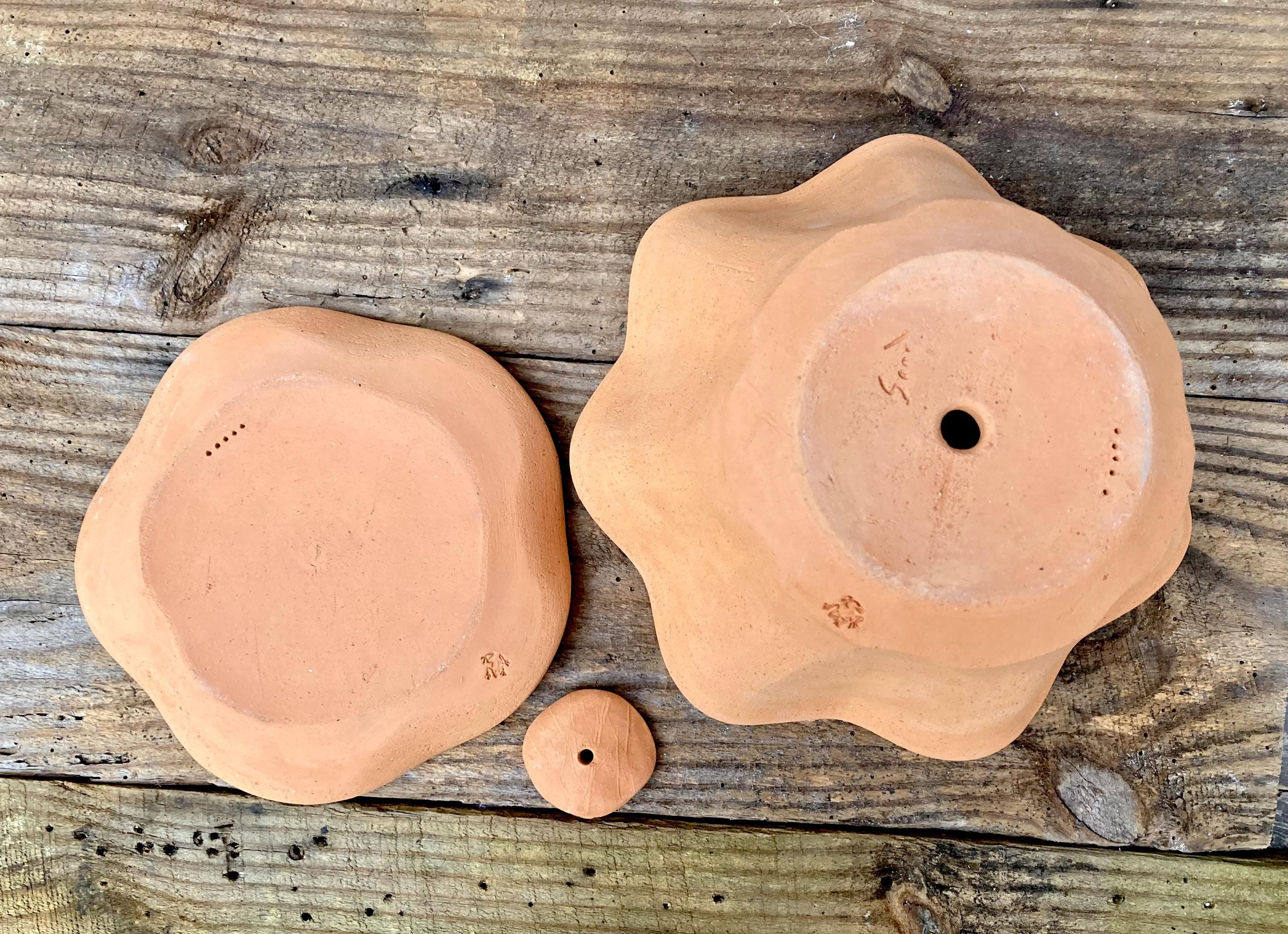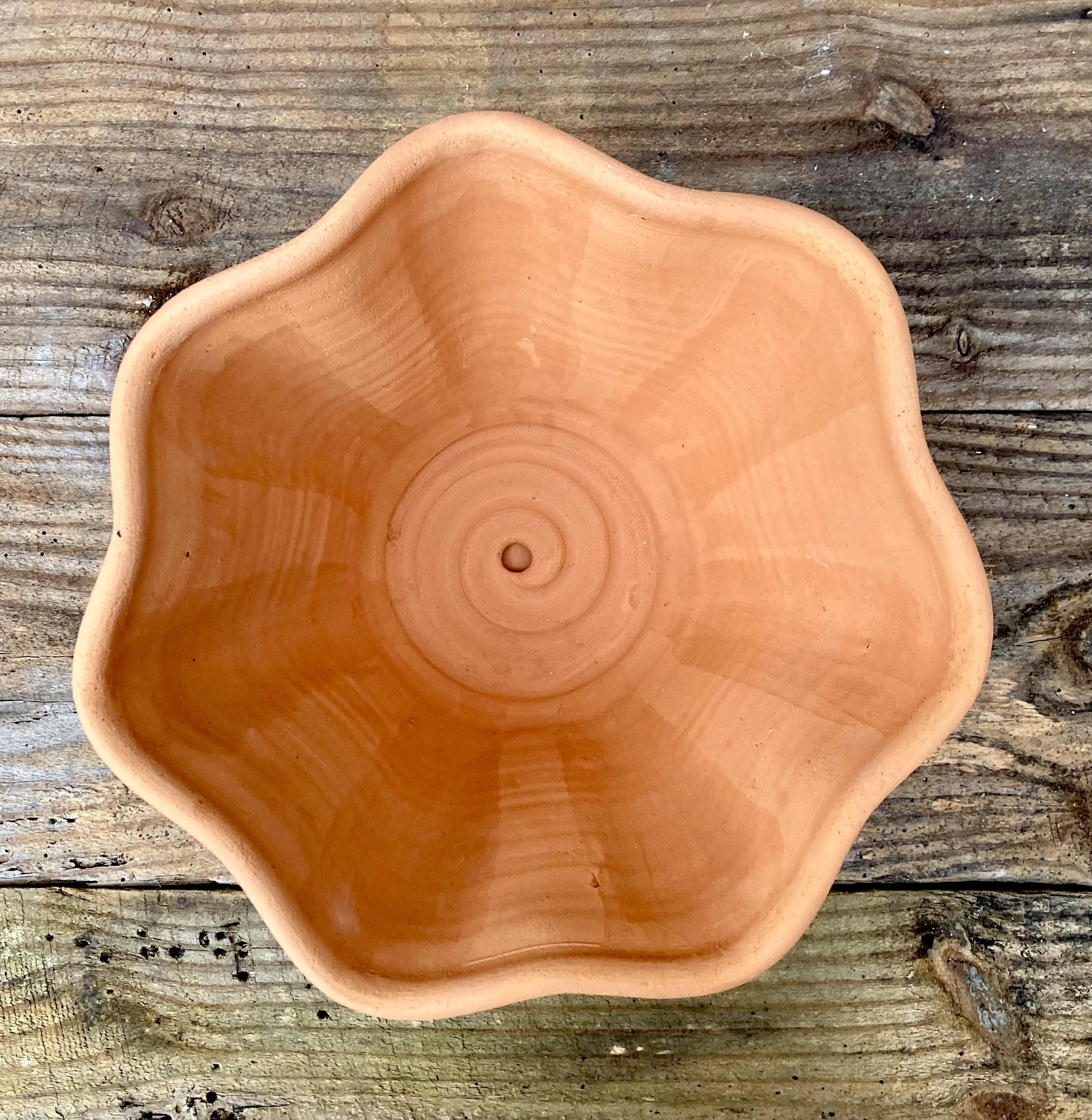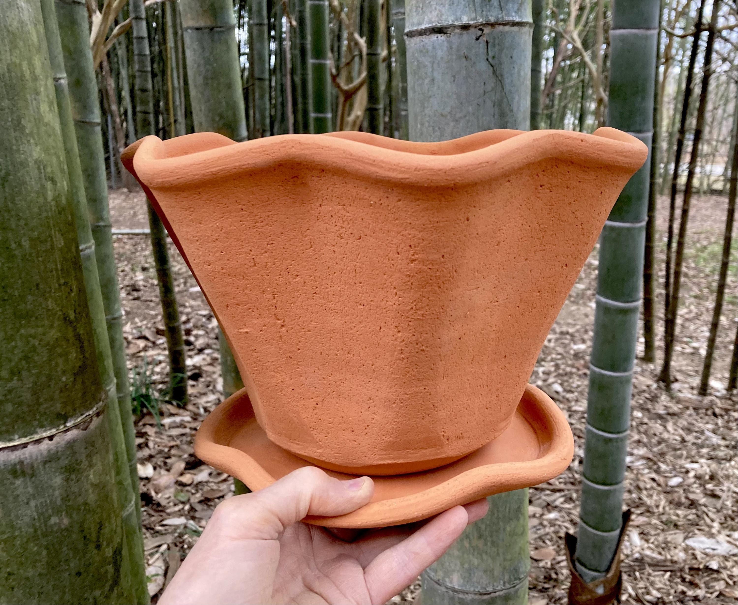 This large, fluted, terracotta planter with saucer was made of wheel-thrown, locally dug clay that when fired to the right temperature comes out a nice terracotta color and is porous. This allows air and water to flow through the pot which prevents root rot and soil disease.