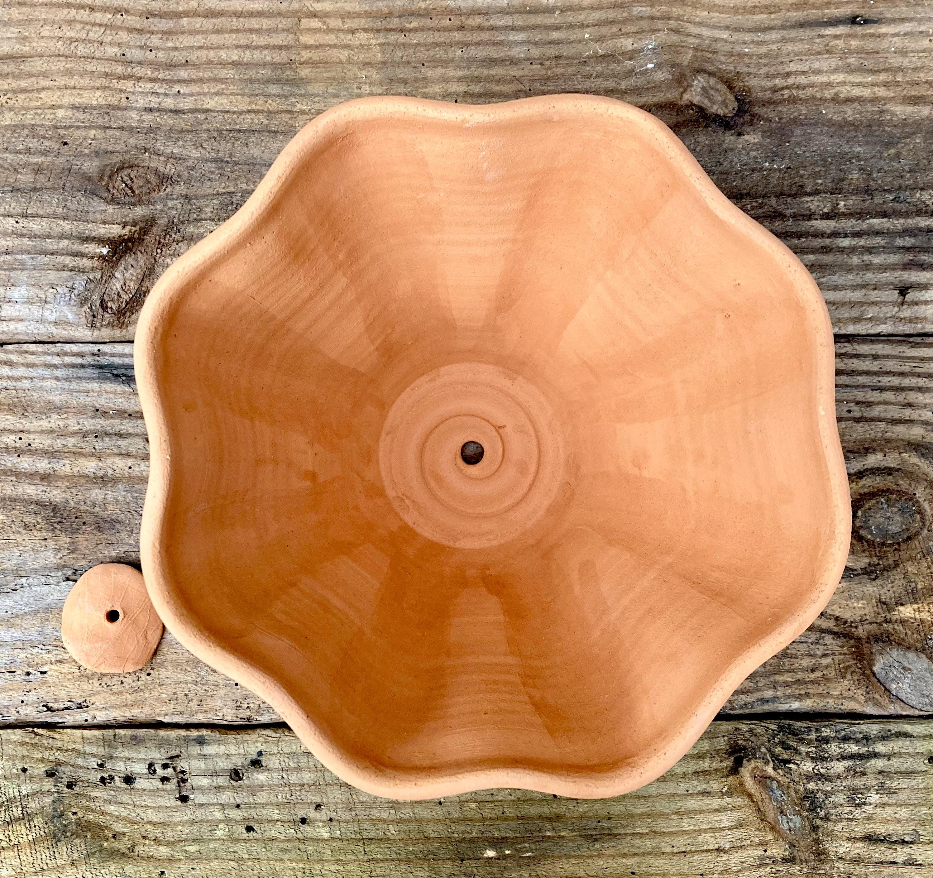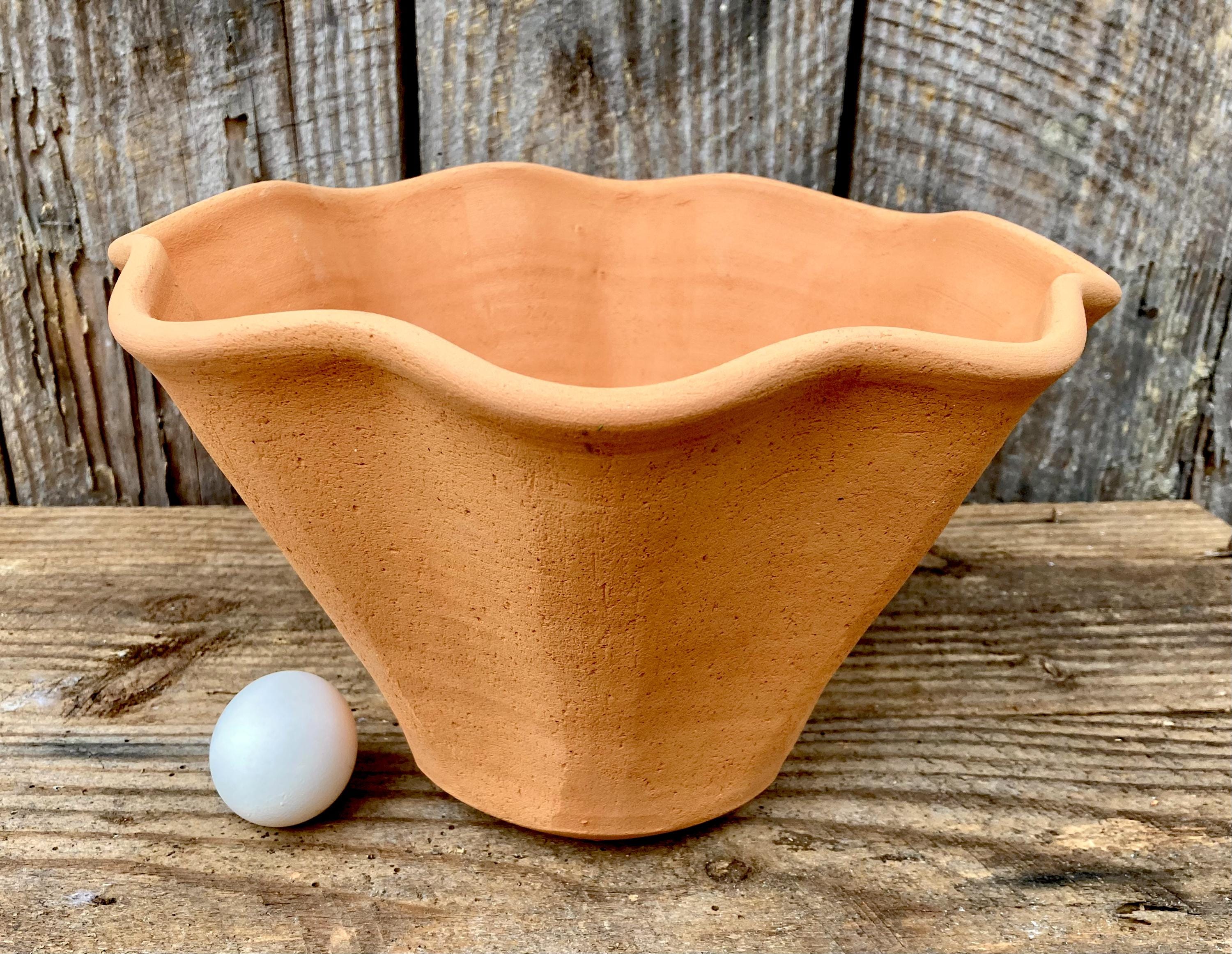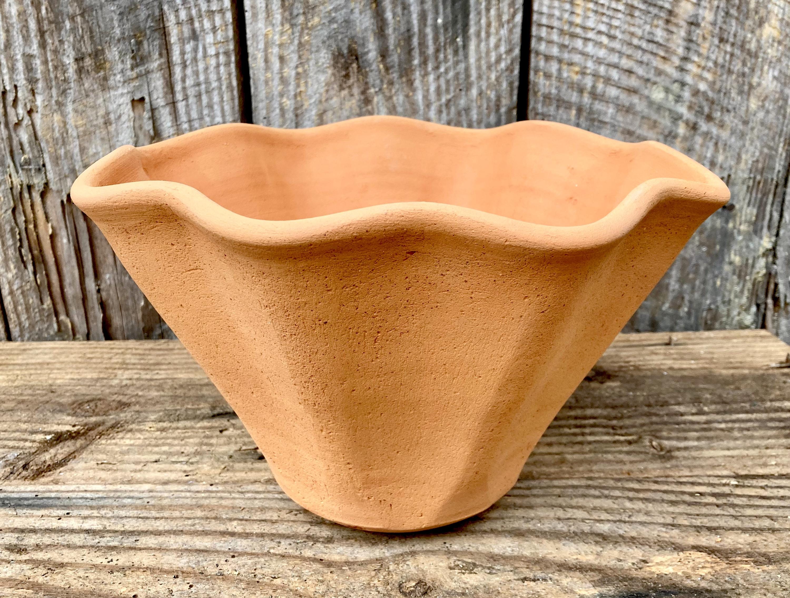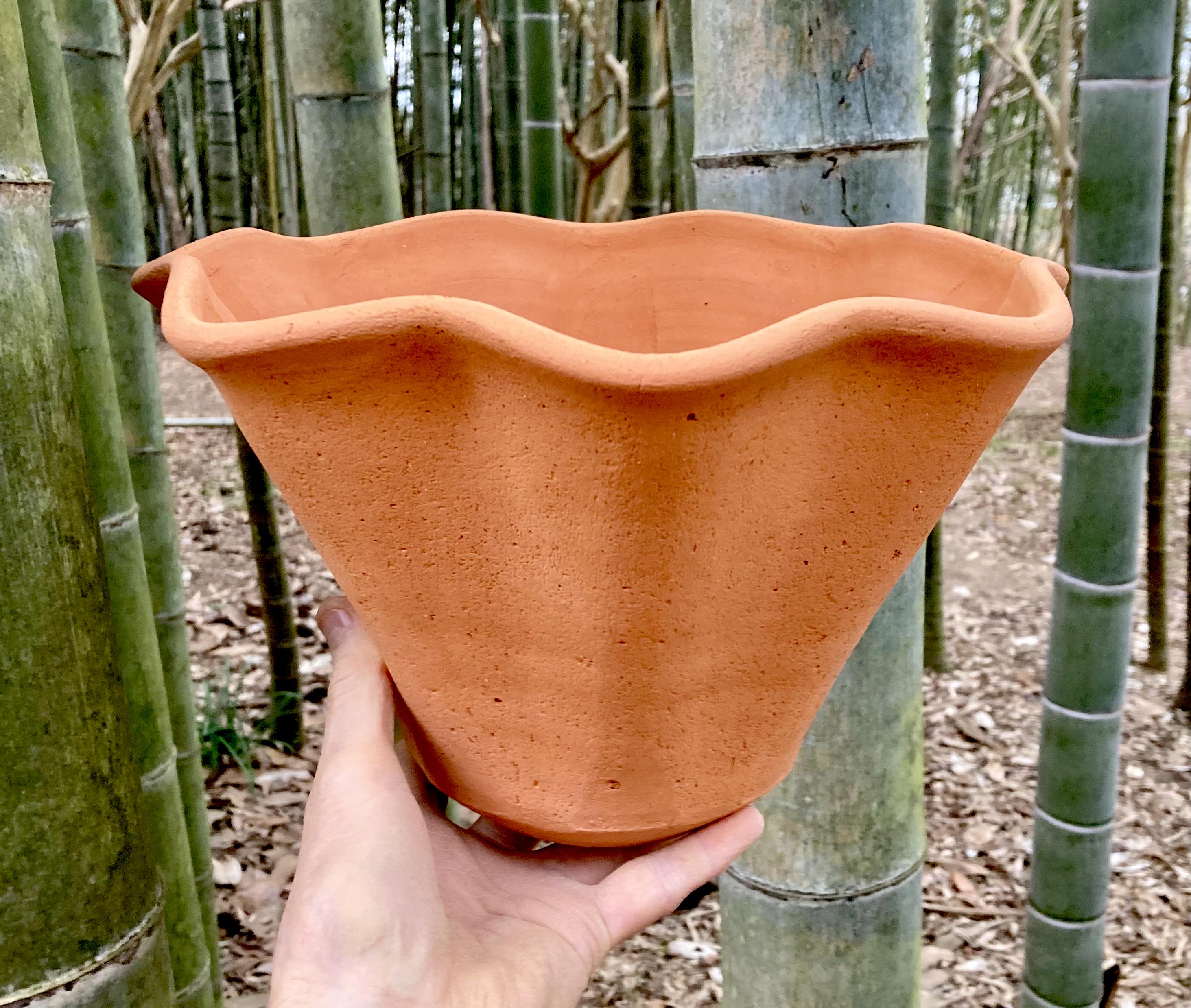 This large, fluted, terracotta planter was made of wheel-thrown, locally dug clay that when fired to the right temperature comes out a nice terracotta color and is porous. This allows air and water to flow through the pot which prevents root rot and soil disease.