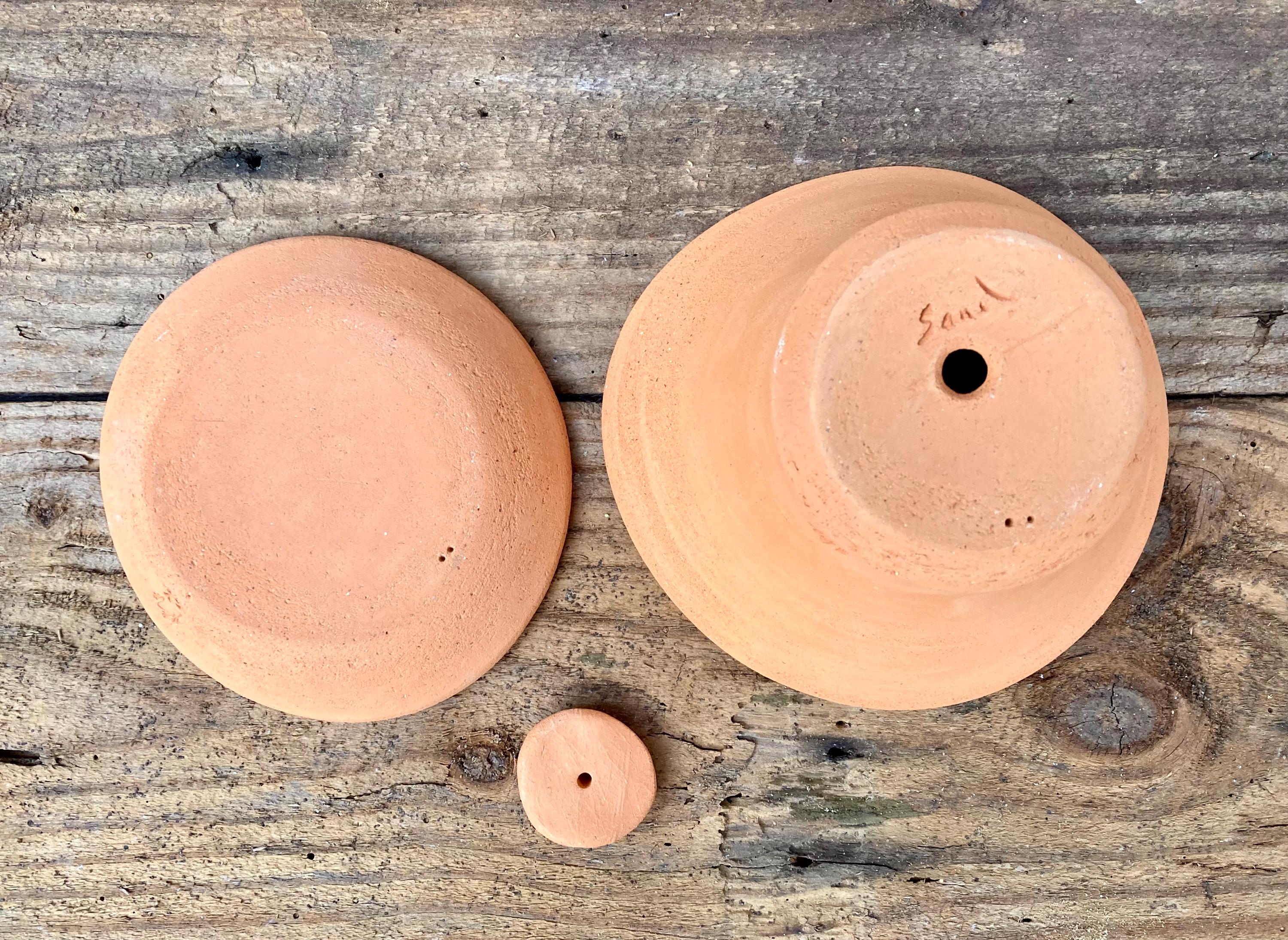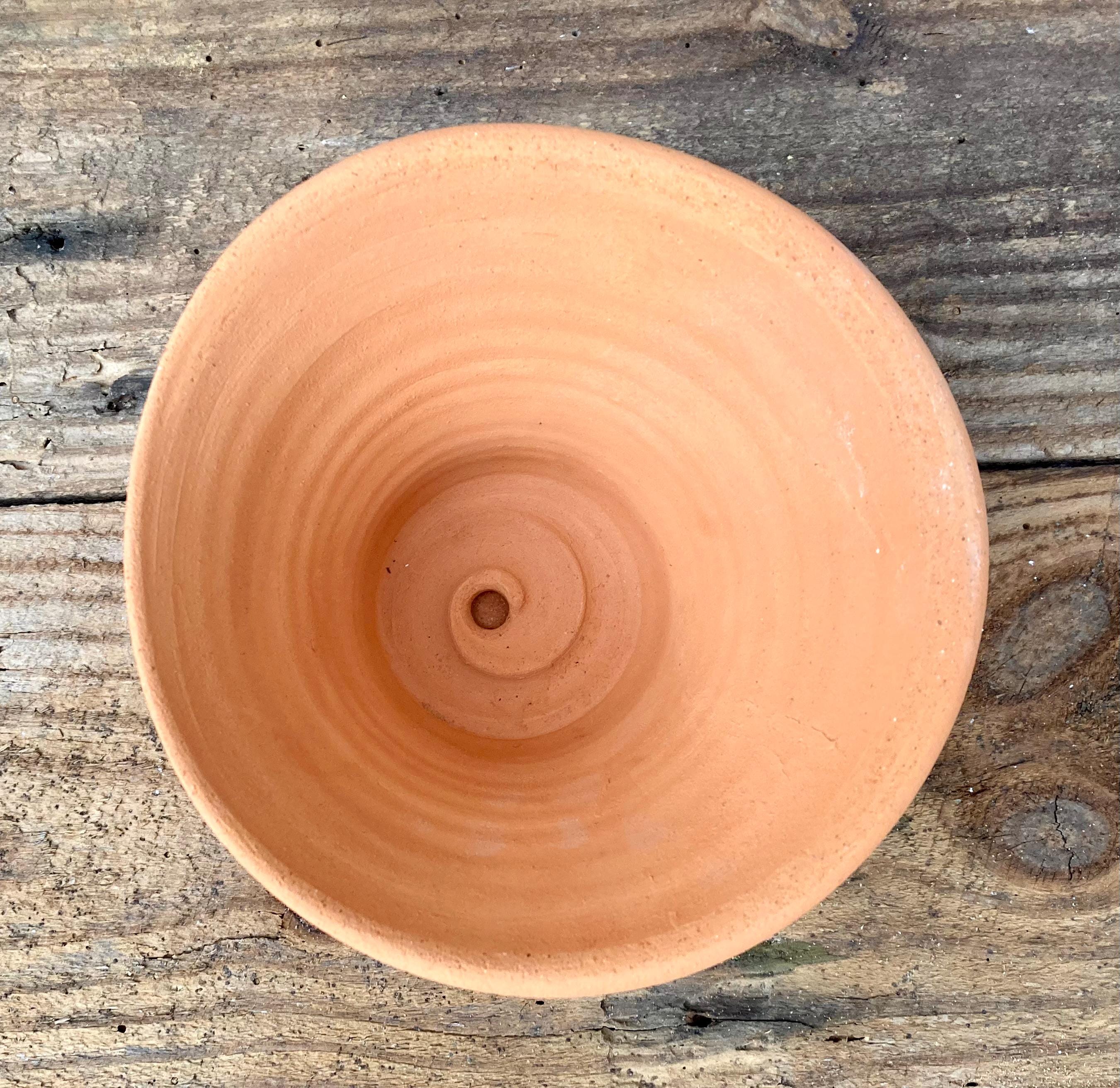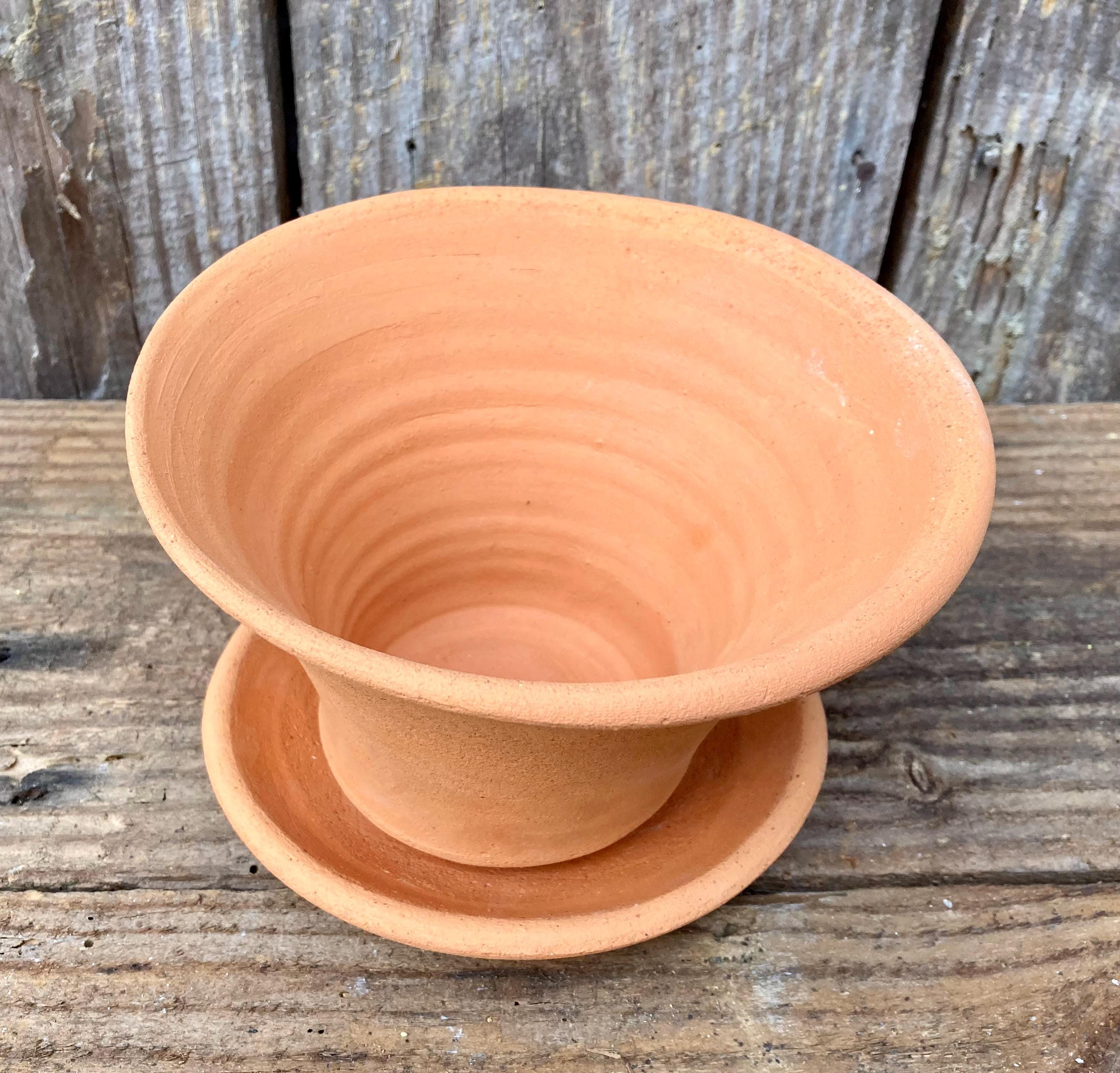 This terracotta planter was centered on the wheel then knocked off center to make it asymmetrical, to get a lip that is thick on one side and thin on the other, to get gesture and movement. The saucer was done the same way.
