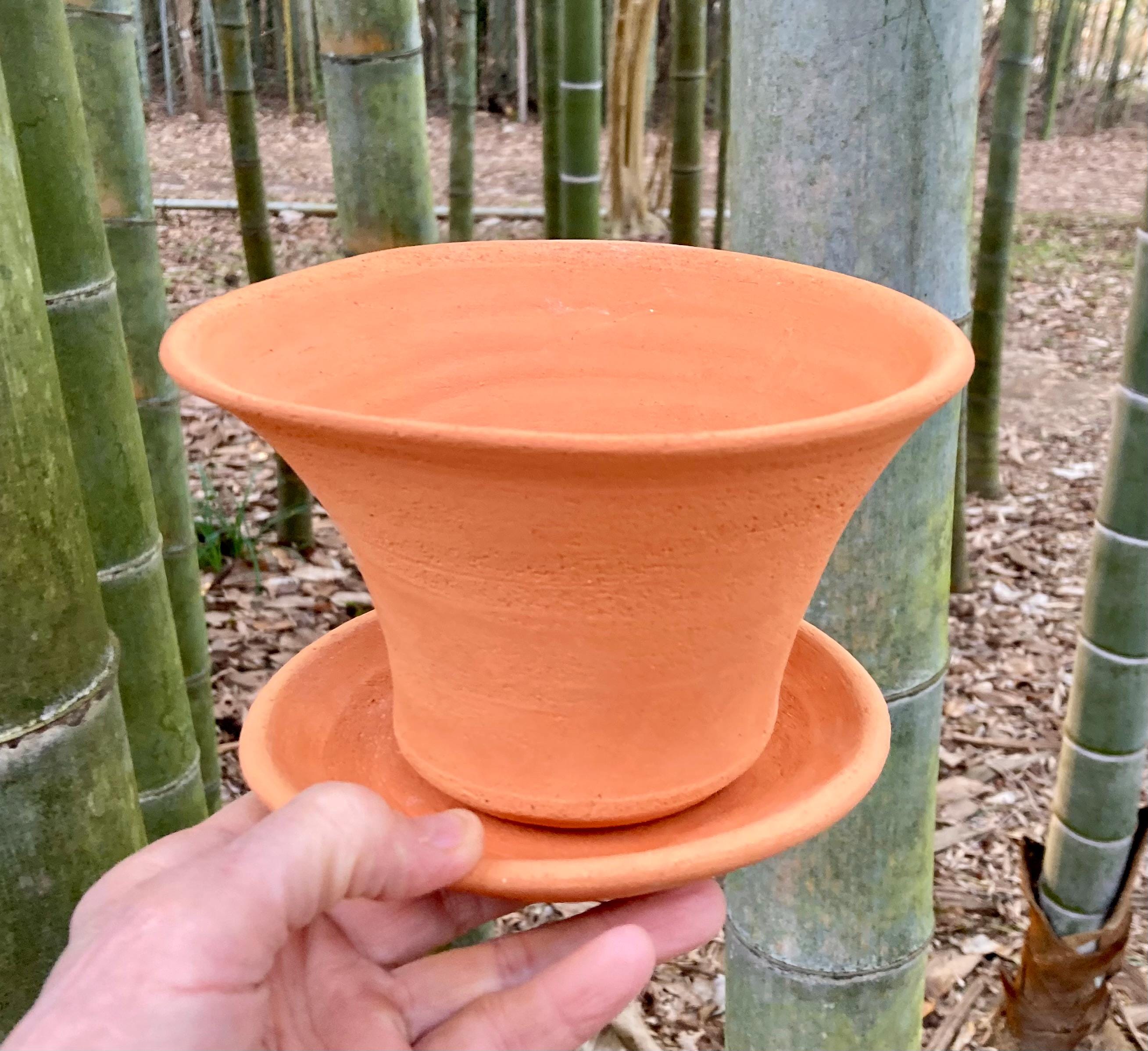It is made of locally dug clay that when fired to the right temperature comes out a nice terracotta color and is porous. This allows air and water to flow through the pot which prevents root rot and soil disease.