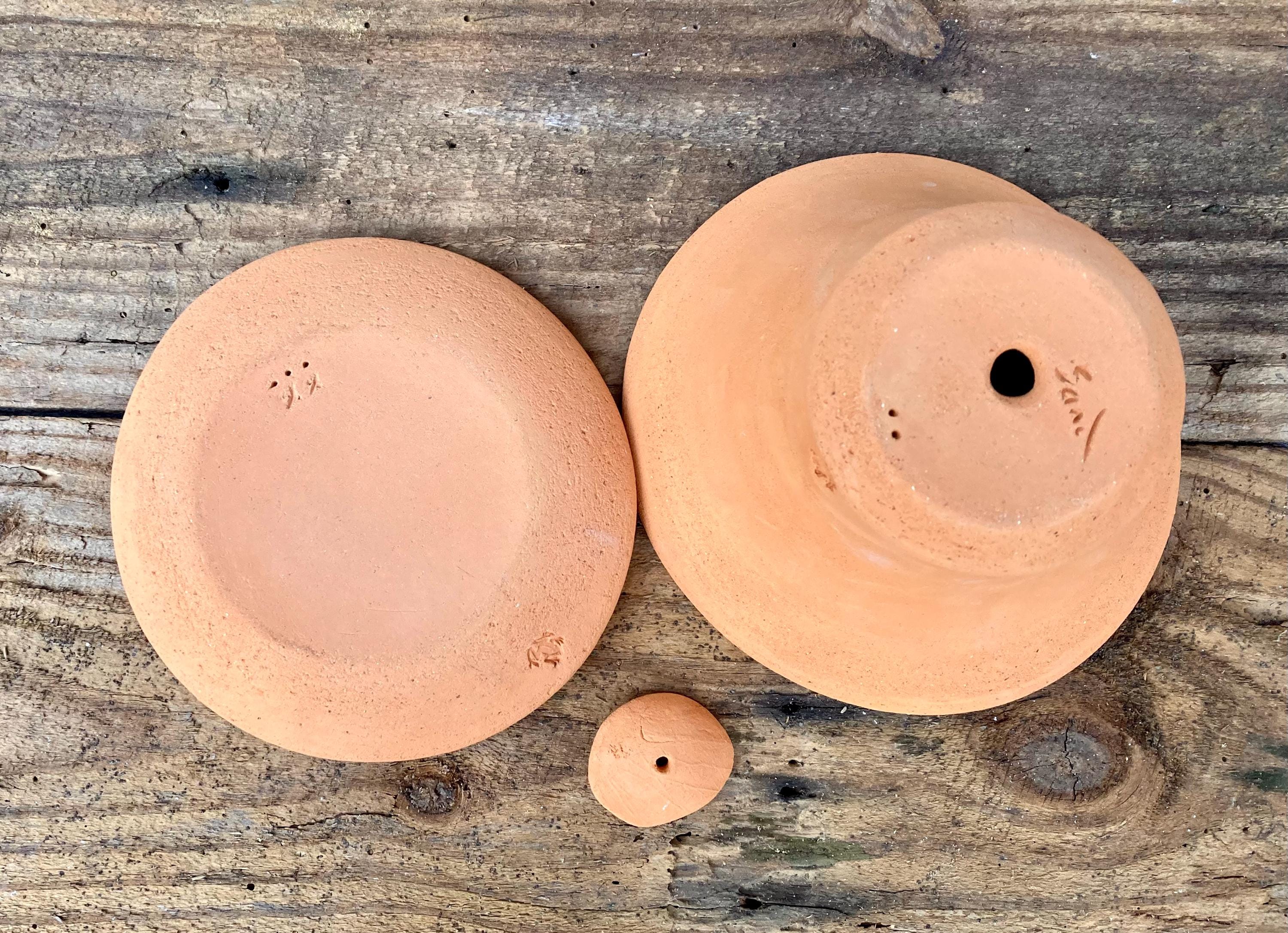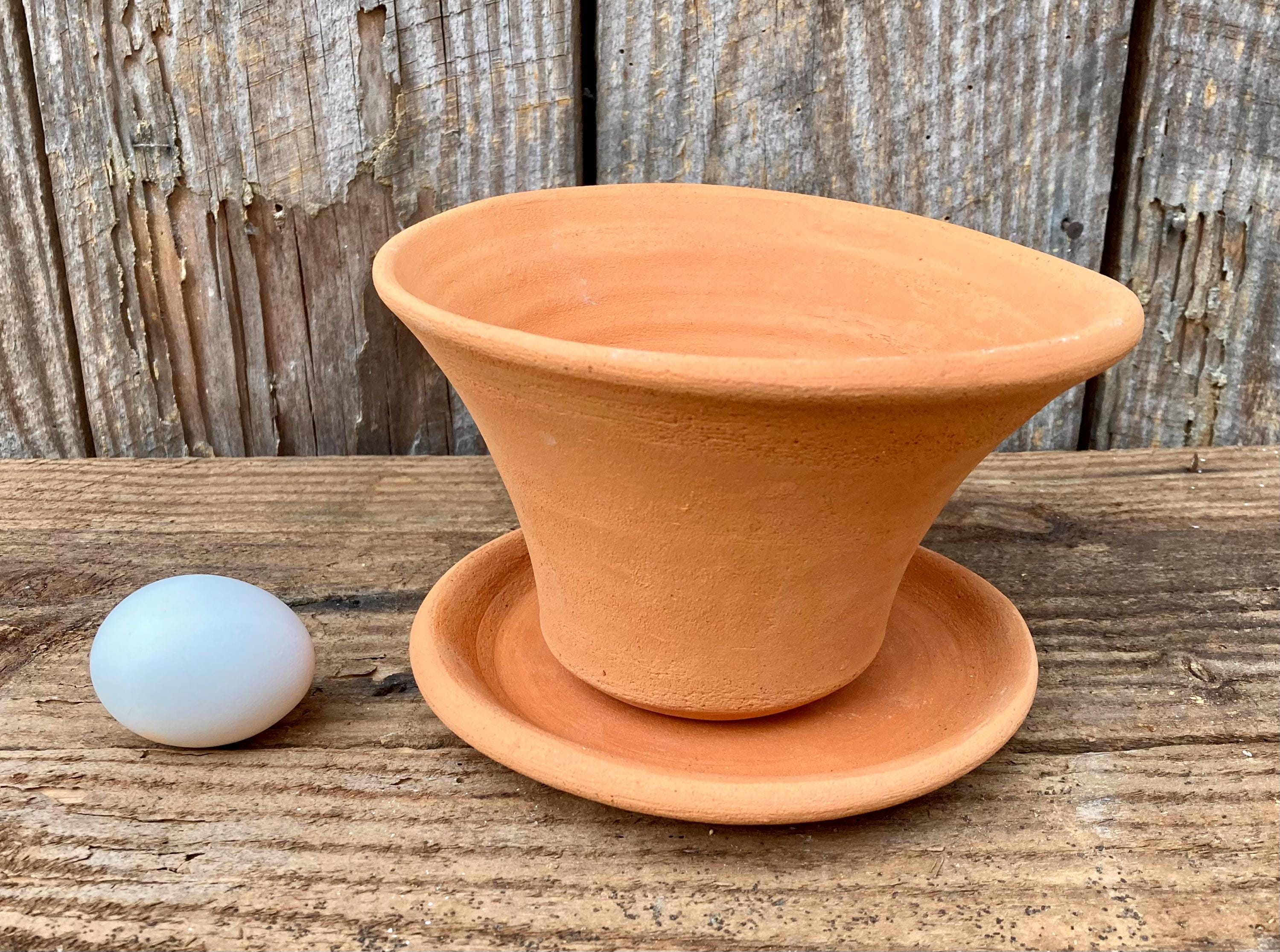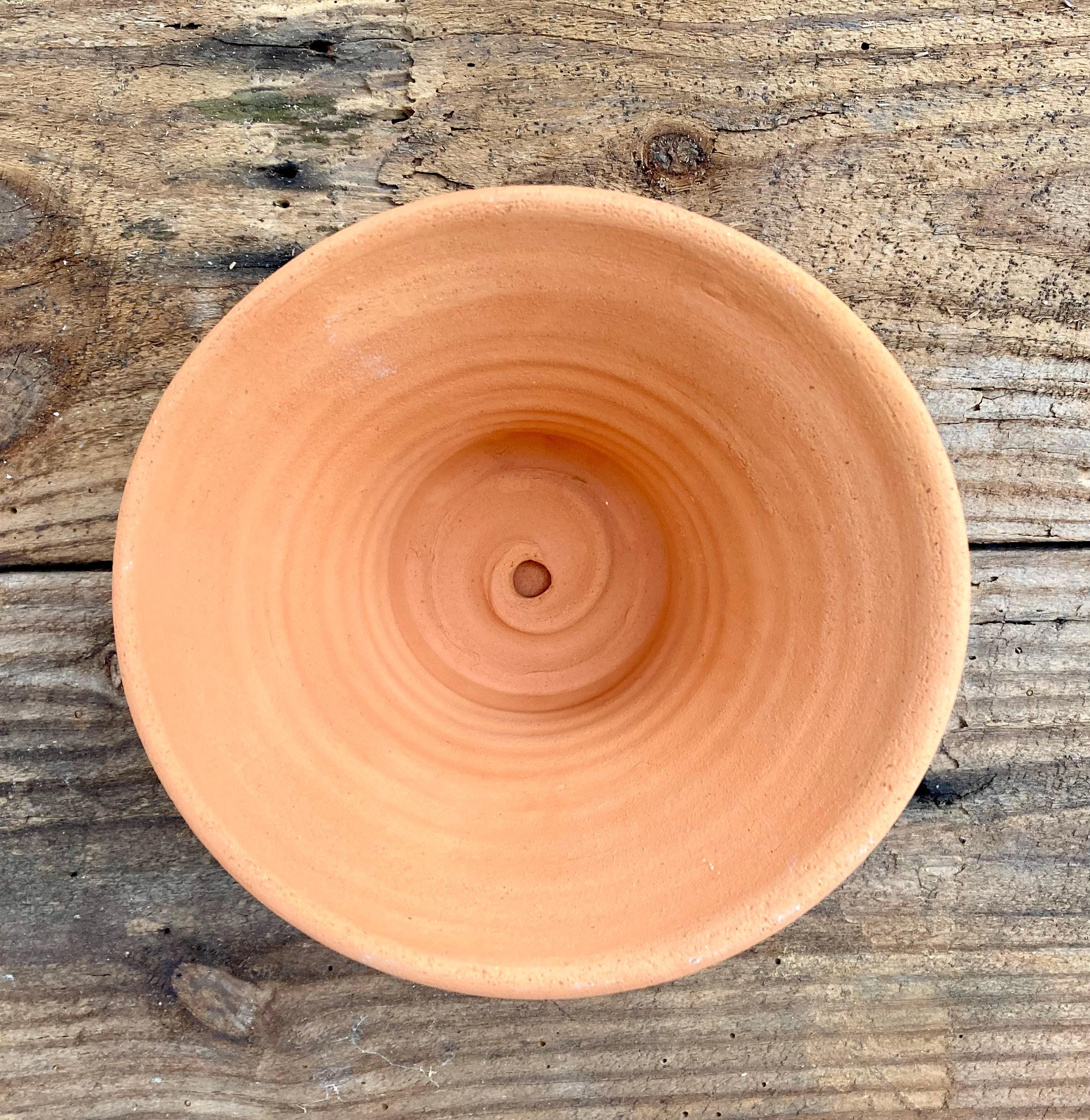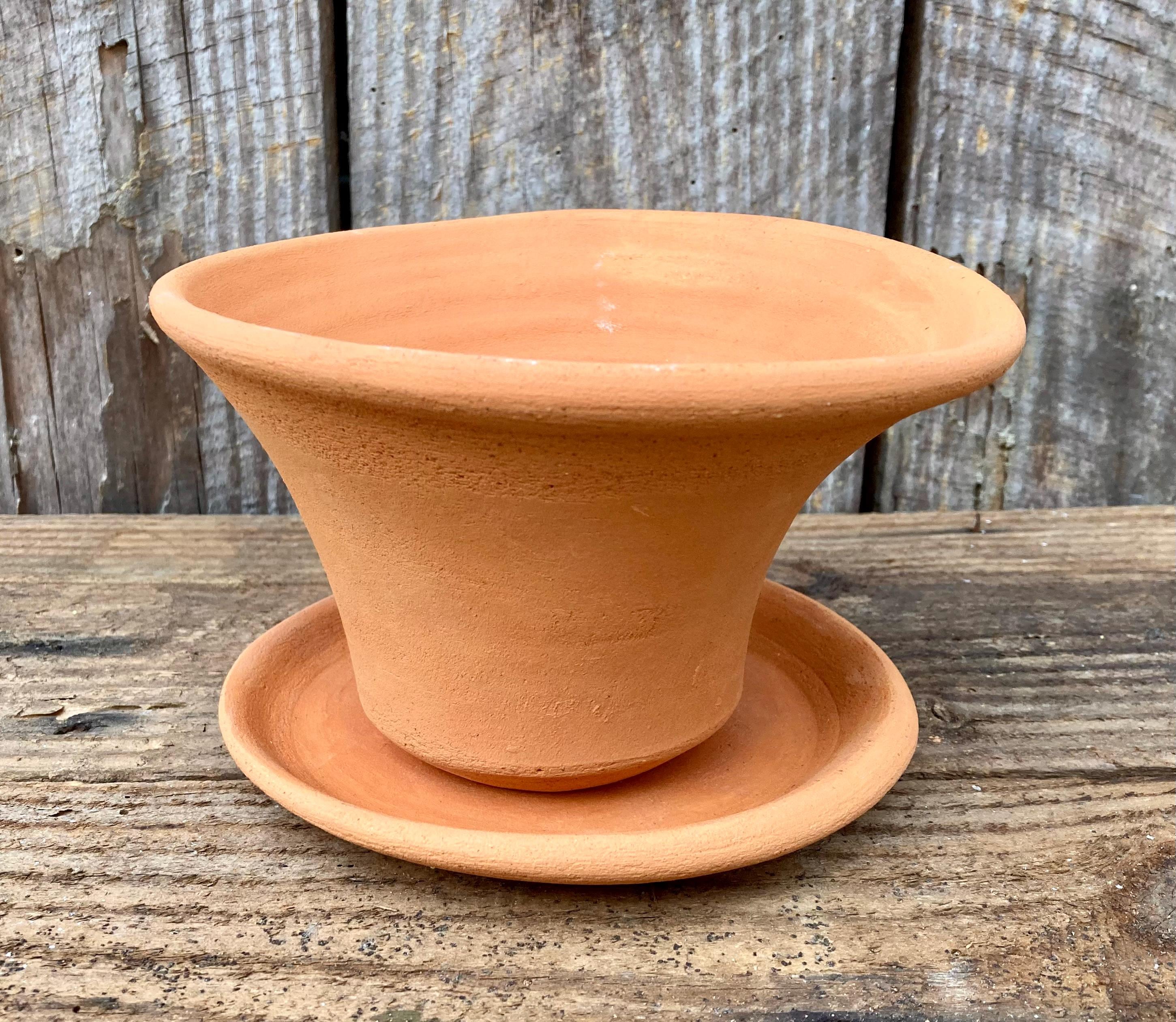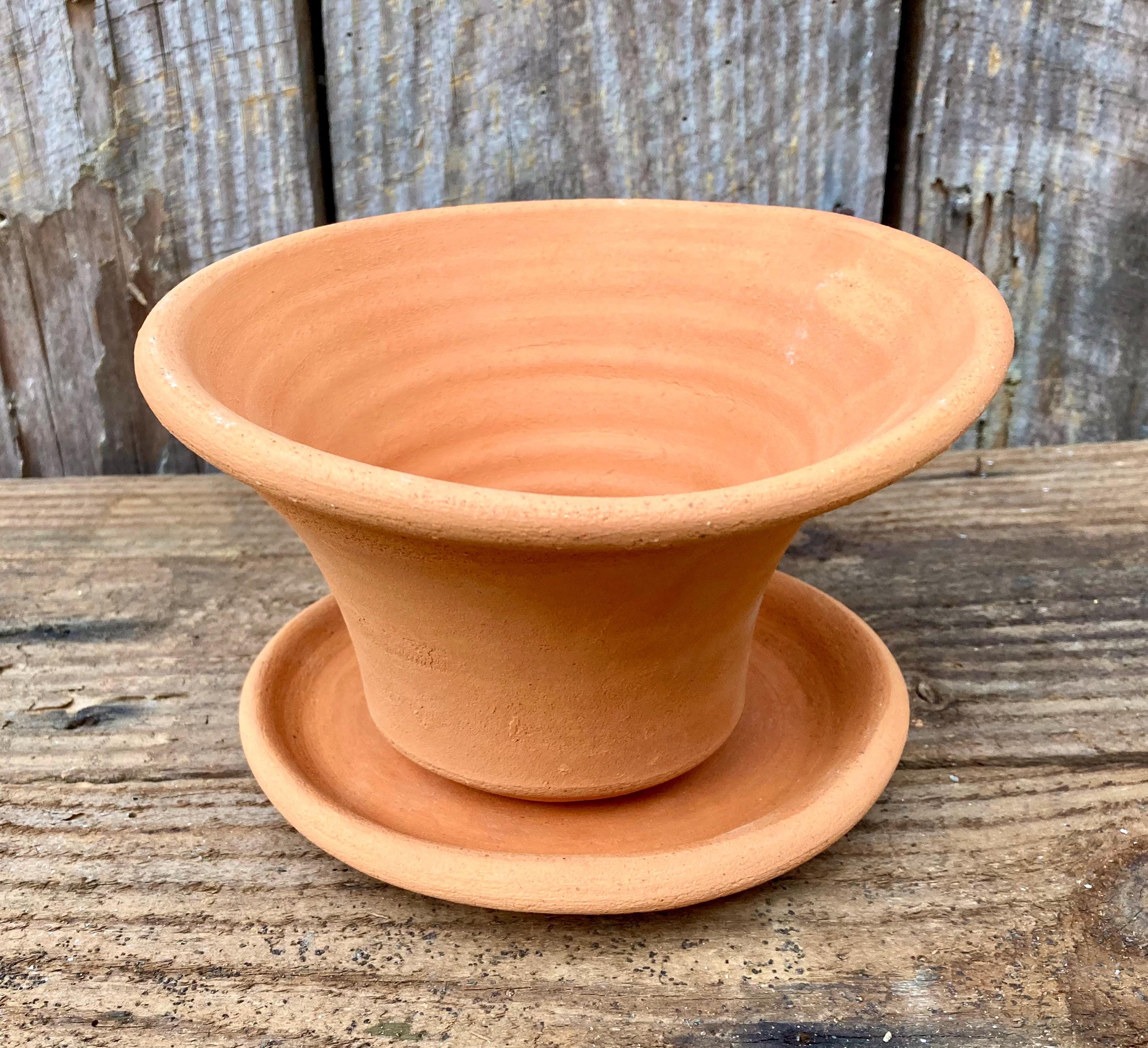 This terracotta planter was centered on the wheel then knocked off center to make it asymmetrical, to get a lip that is thick on one side and thin on the other, to get gesture and movement. The saucer was done the same way.