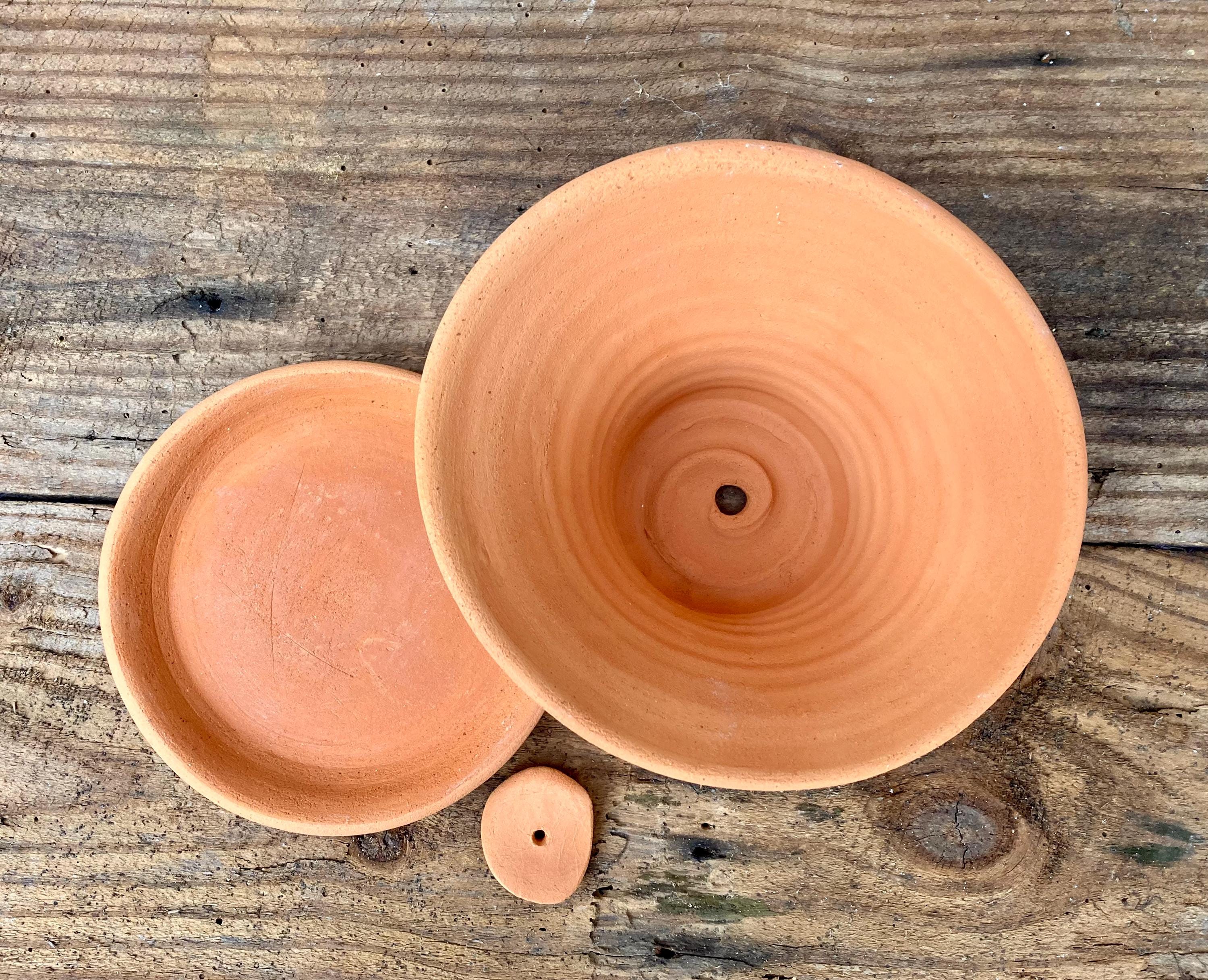 It is made of locally dug clay that when fired to the right temperature comes out a nice terracotta color and is porous. This allows air and water to flow through the pot which prevents root rot and soil disease.