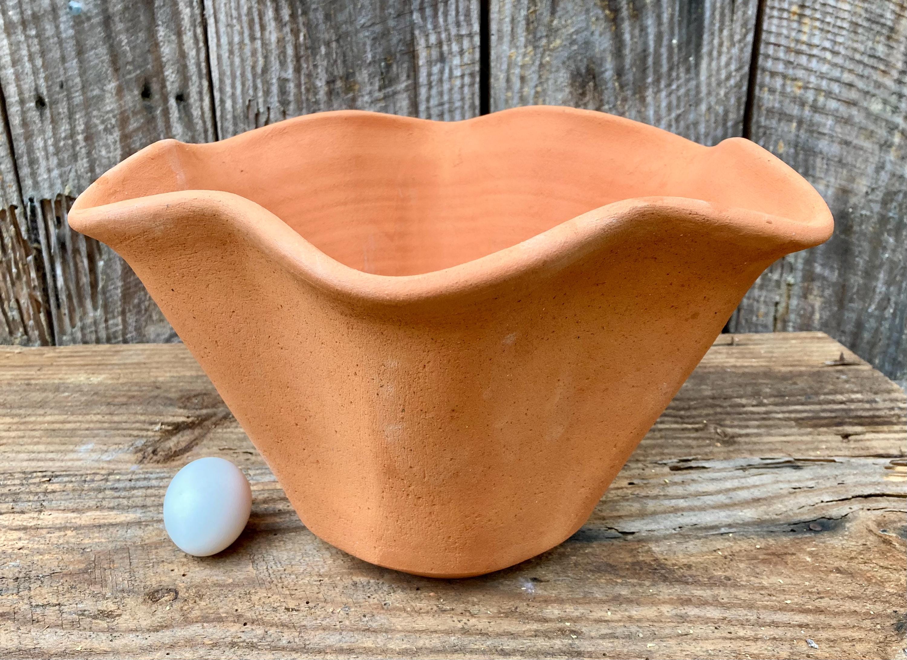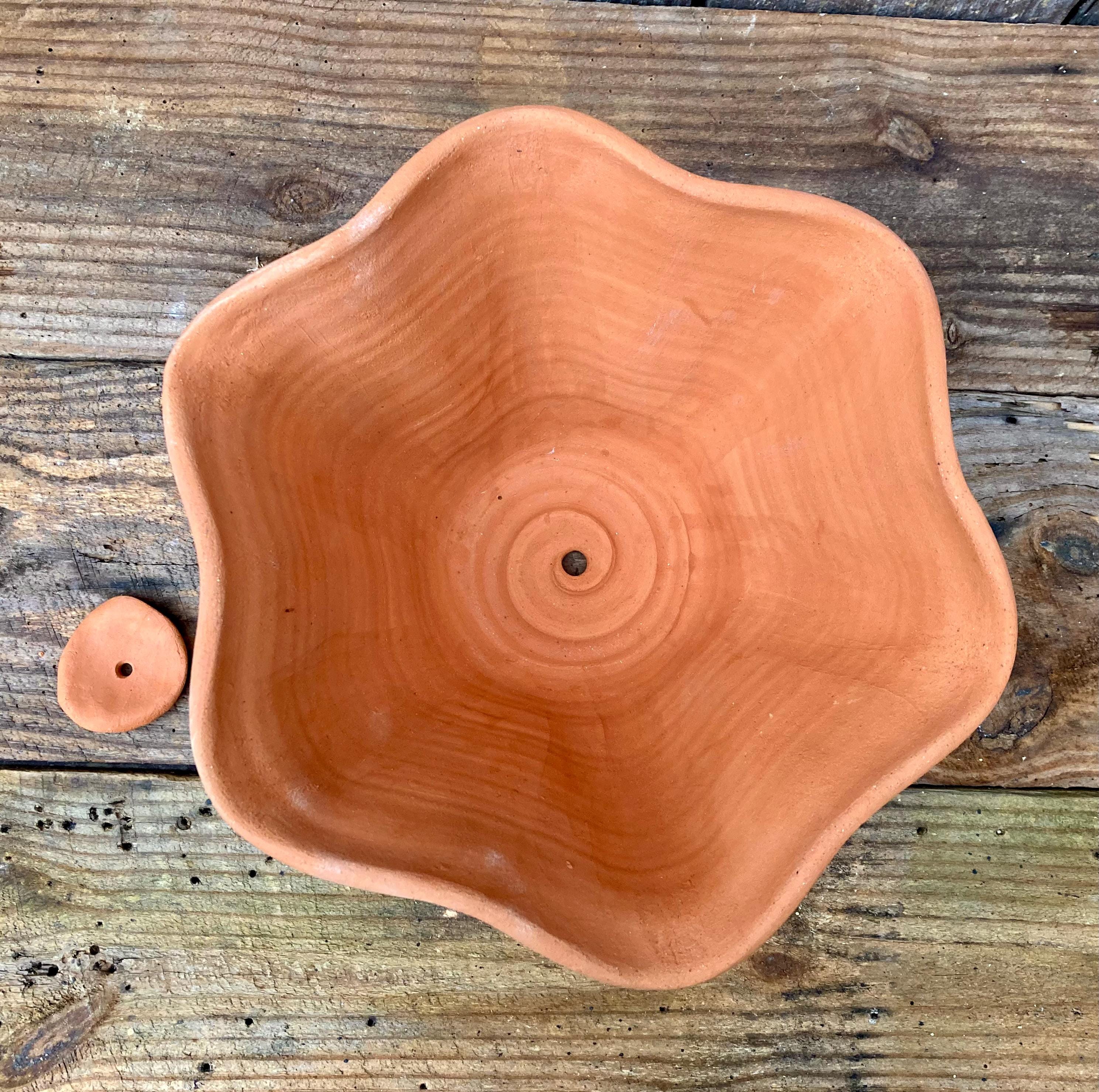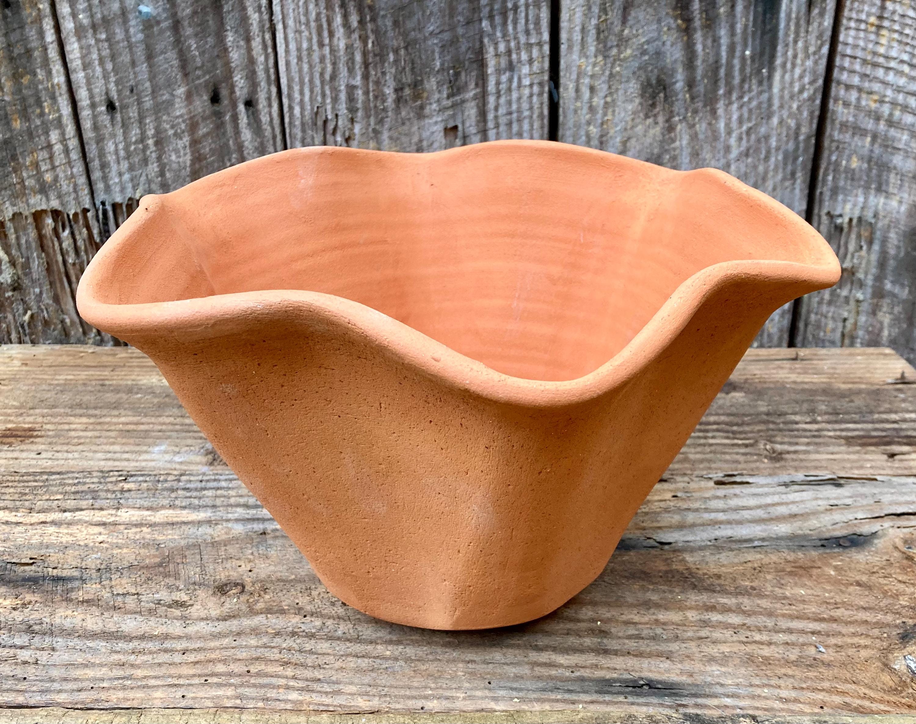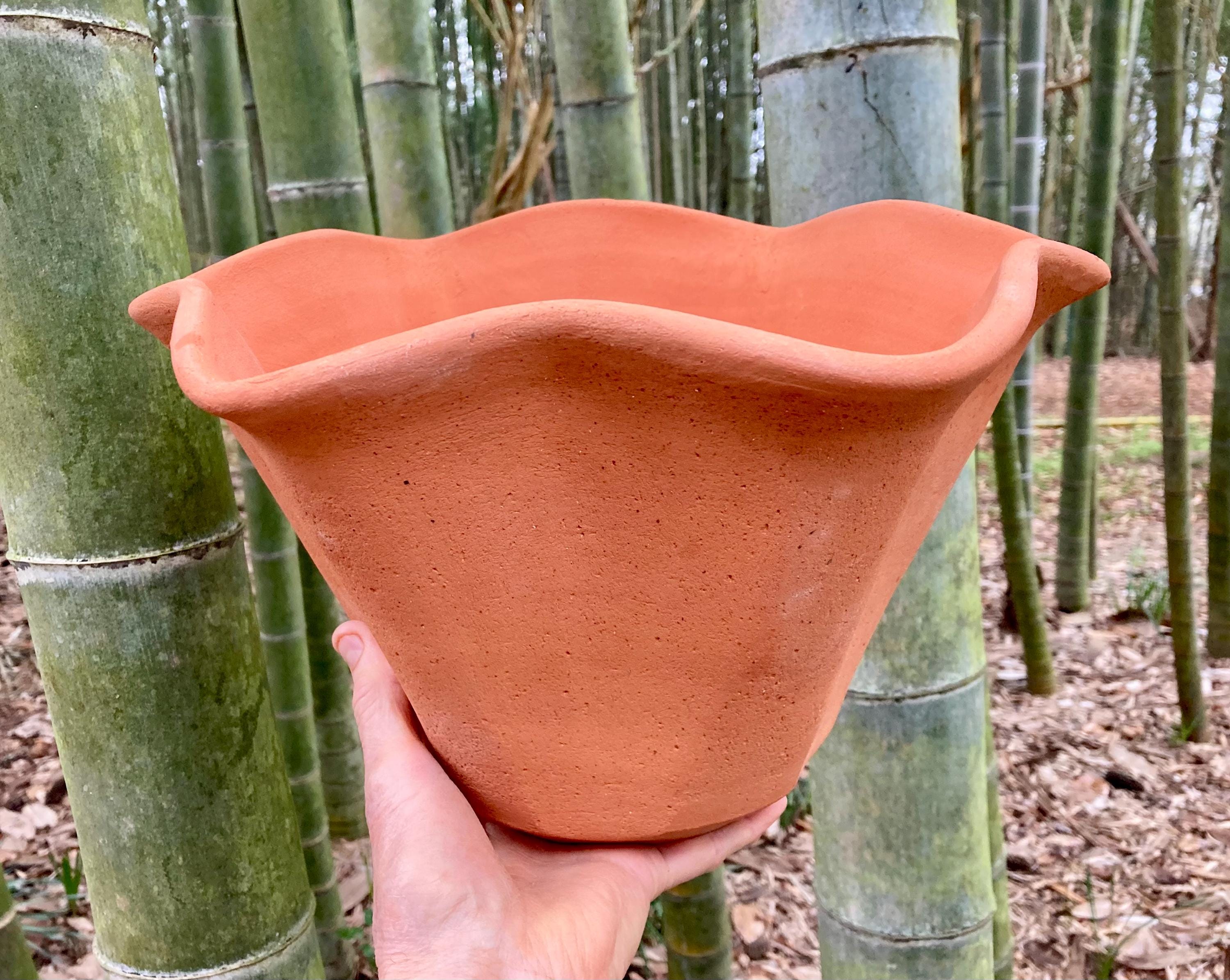 This large, fluted, terracotta planter was made of wheel-thrown, locally dug clay that when fired to the right temperature comes out a nice terracotta color and is porous. This allows air and water to flow through the pot which prevents root rot and soil disease.