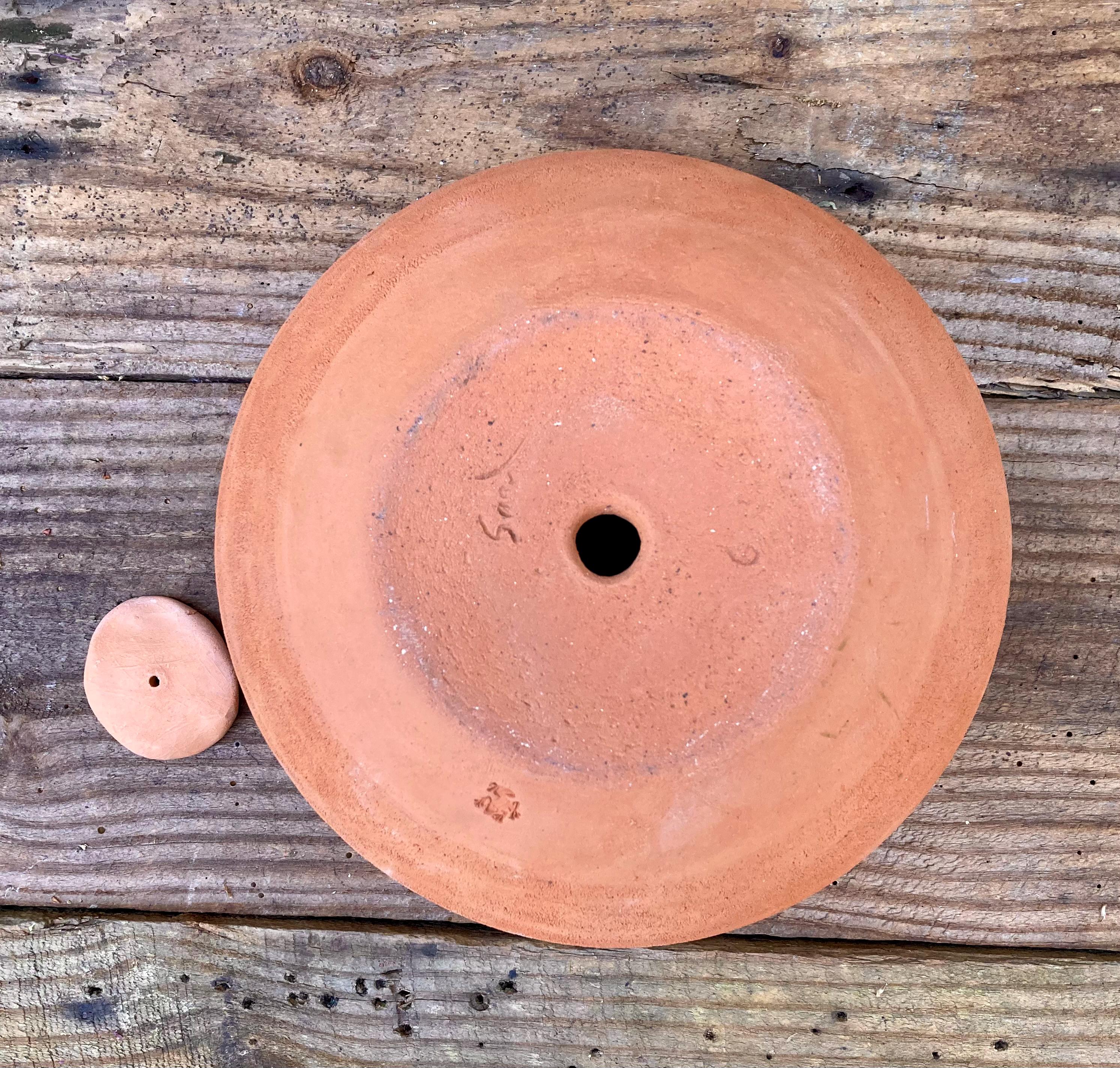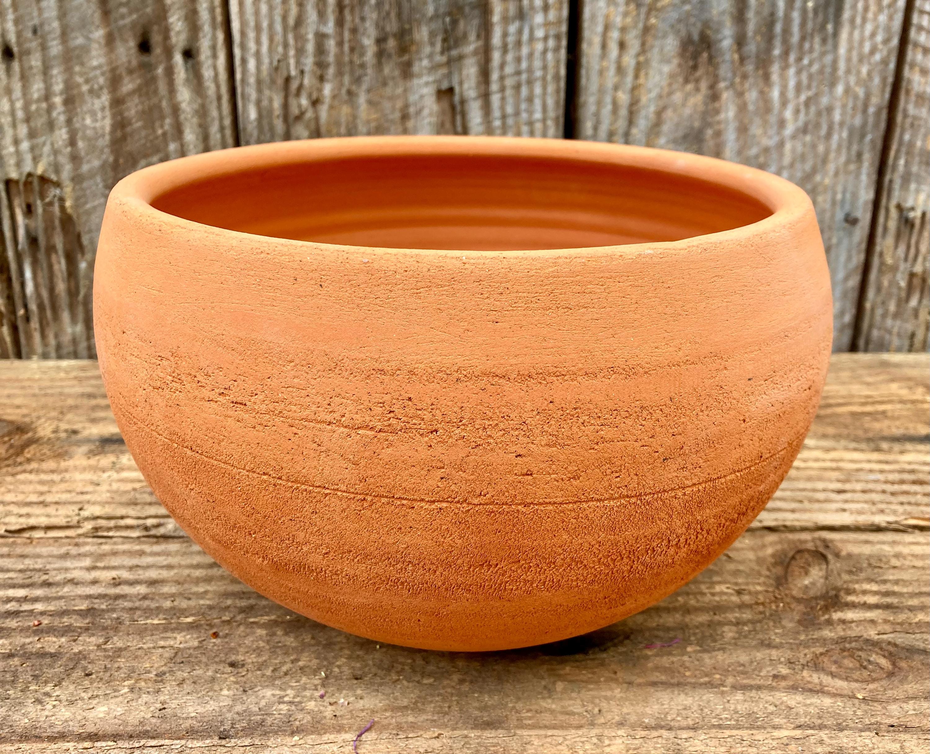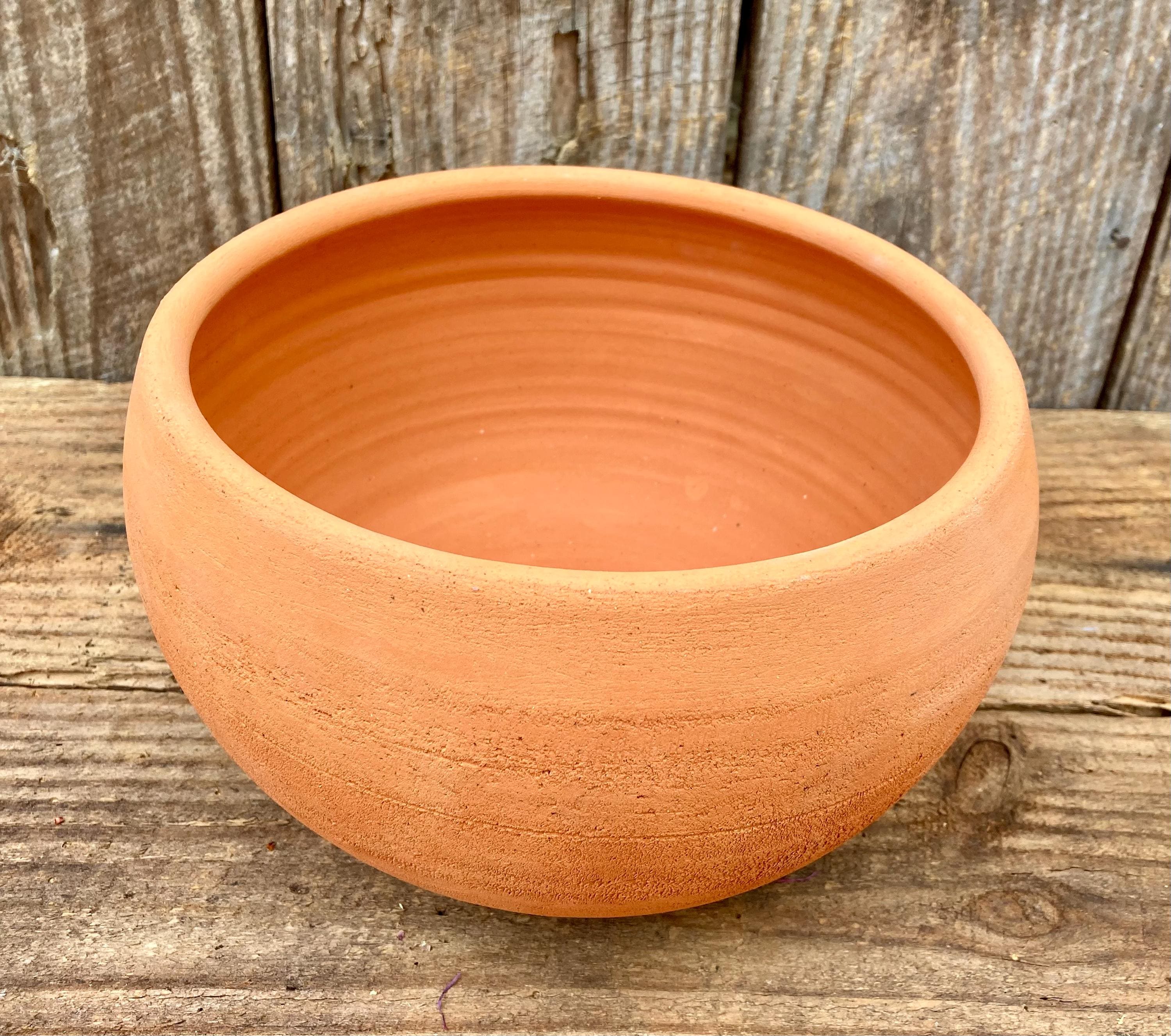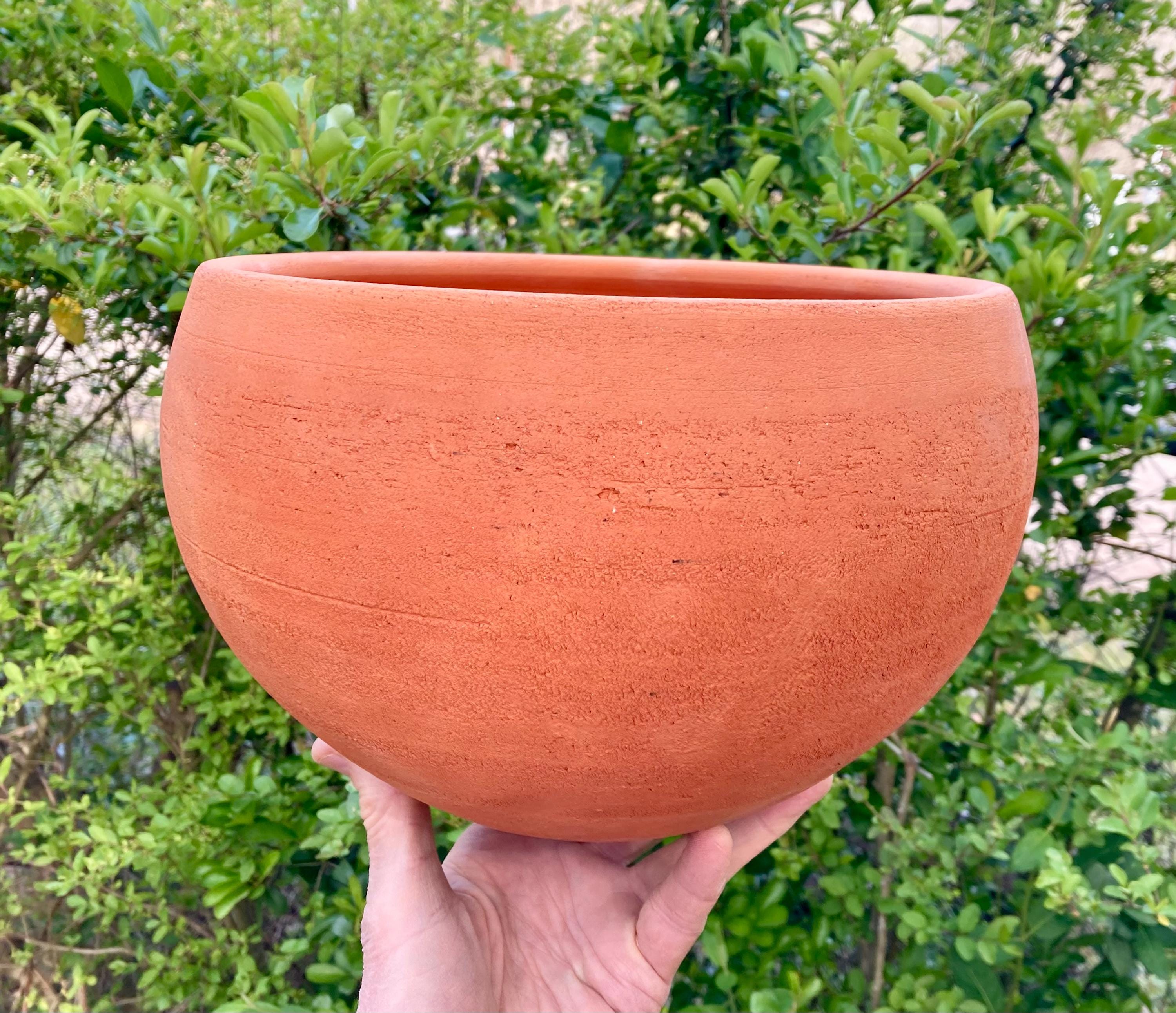 This large, round, terracotta planter with saucer was made of wheel-thrown, locally dug clay that when fired to the right temperature comes out a nice terracotta color and is porous. This allows air and water to flow through the pot which prevents root rot and soil disease.