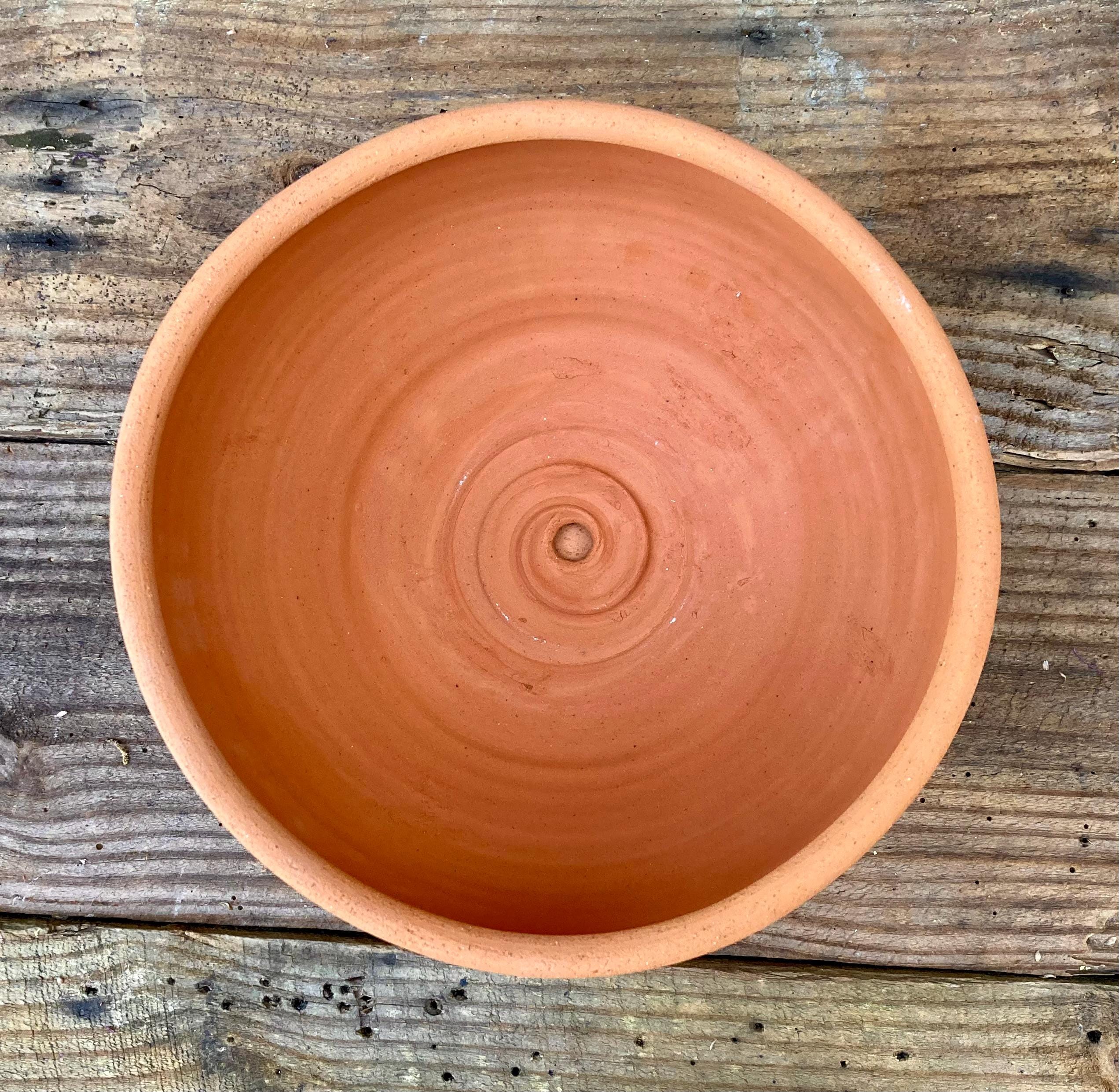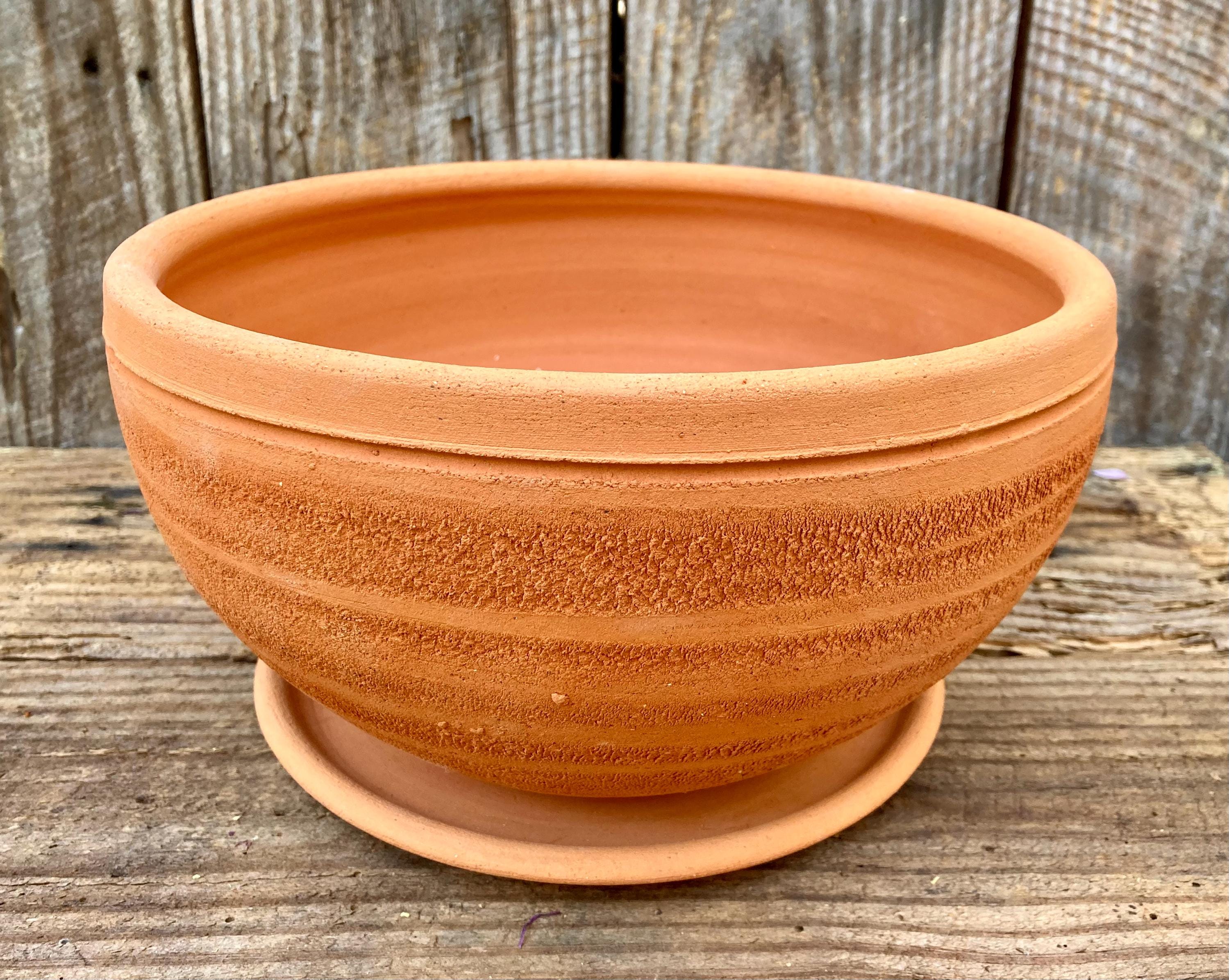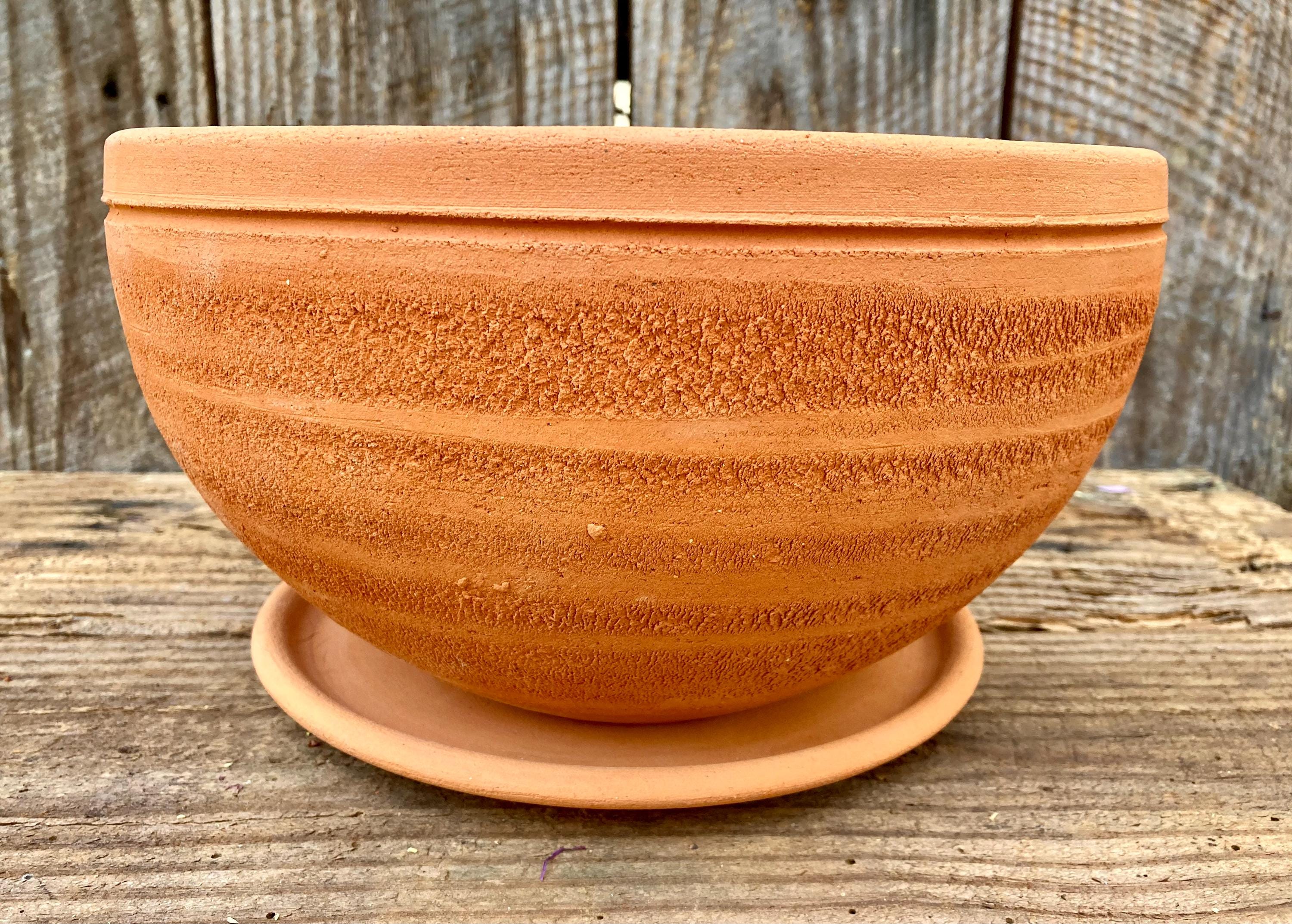This large, round, terracotta planter with saucer was made of wheel-thrown, locally dug clay that when fired to the right temperature comes out a nice terracotta color and is porous. This allows air and water to flow through the pot which prevents root rot and soil disease.