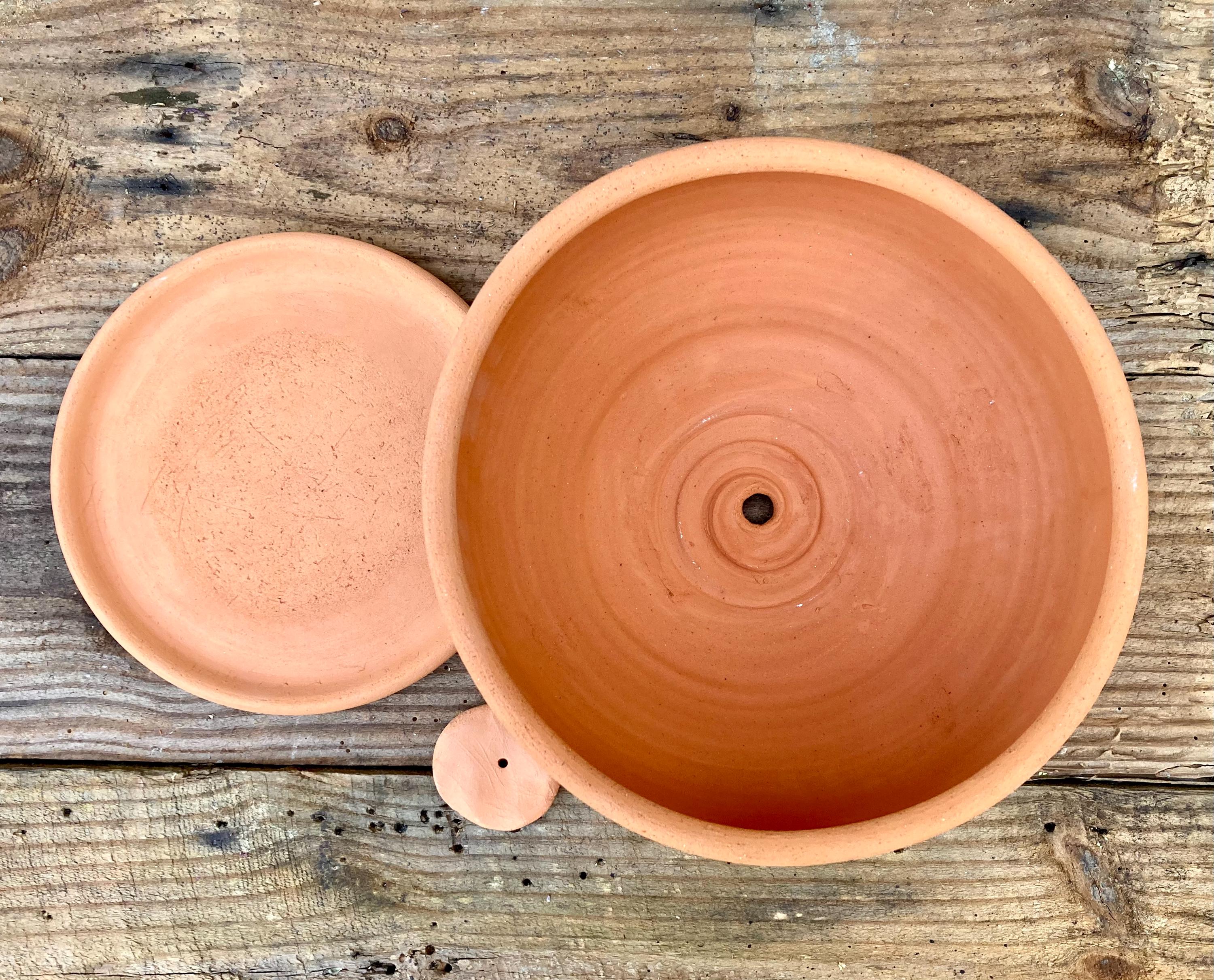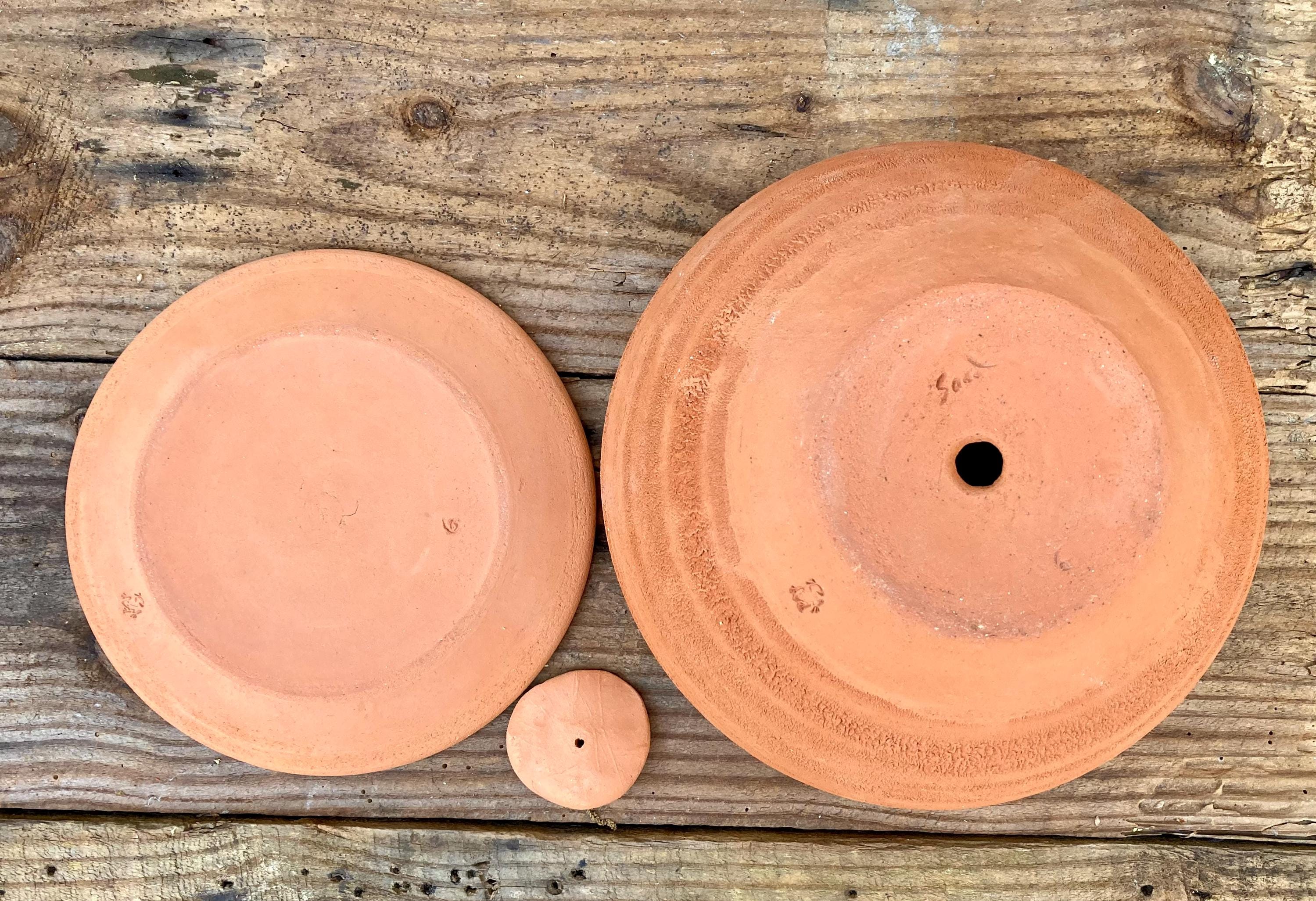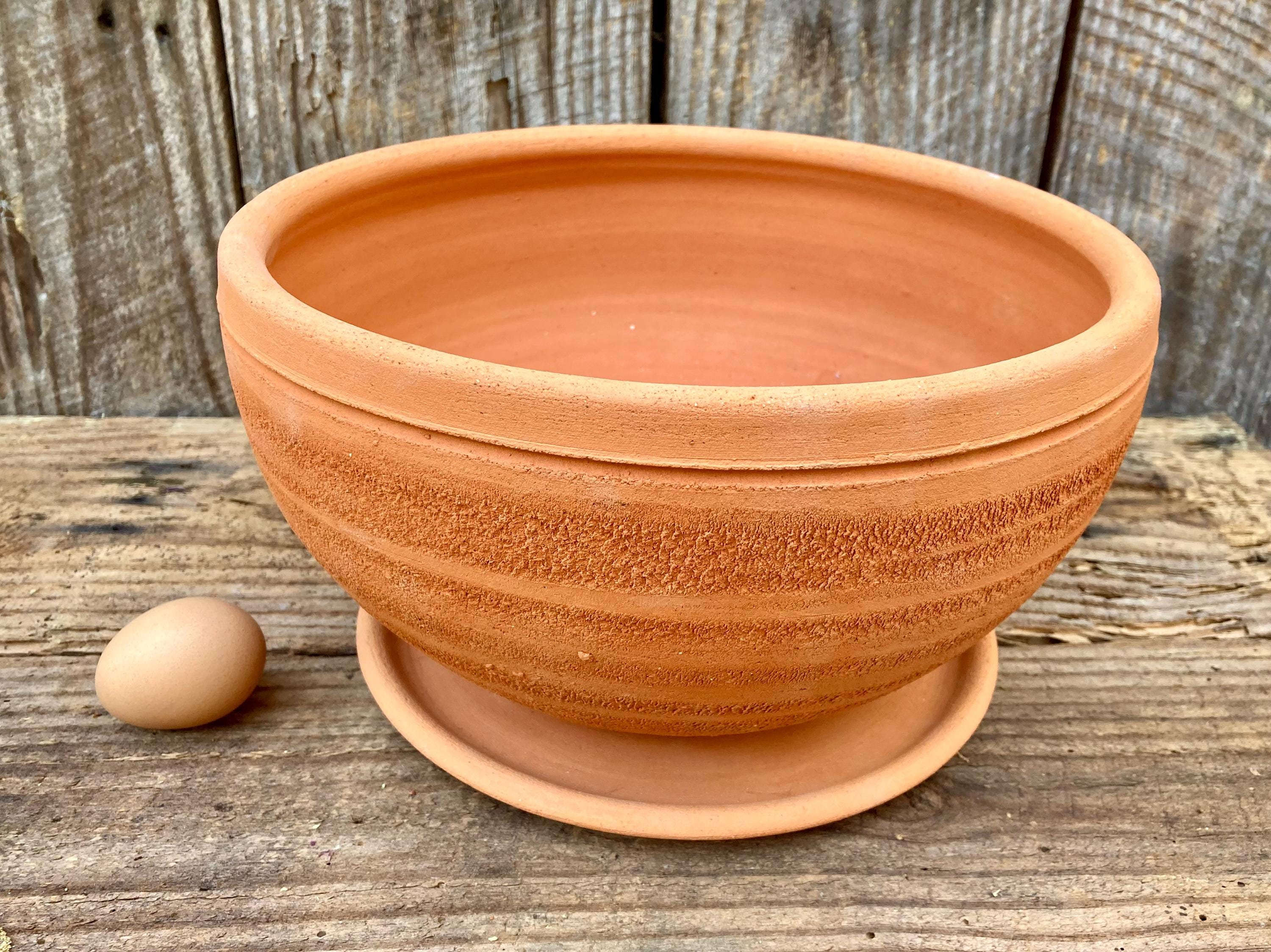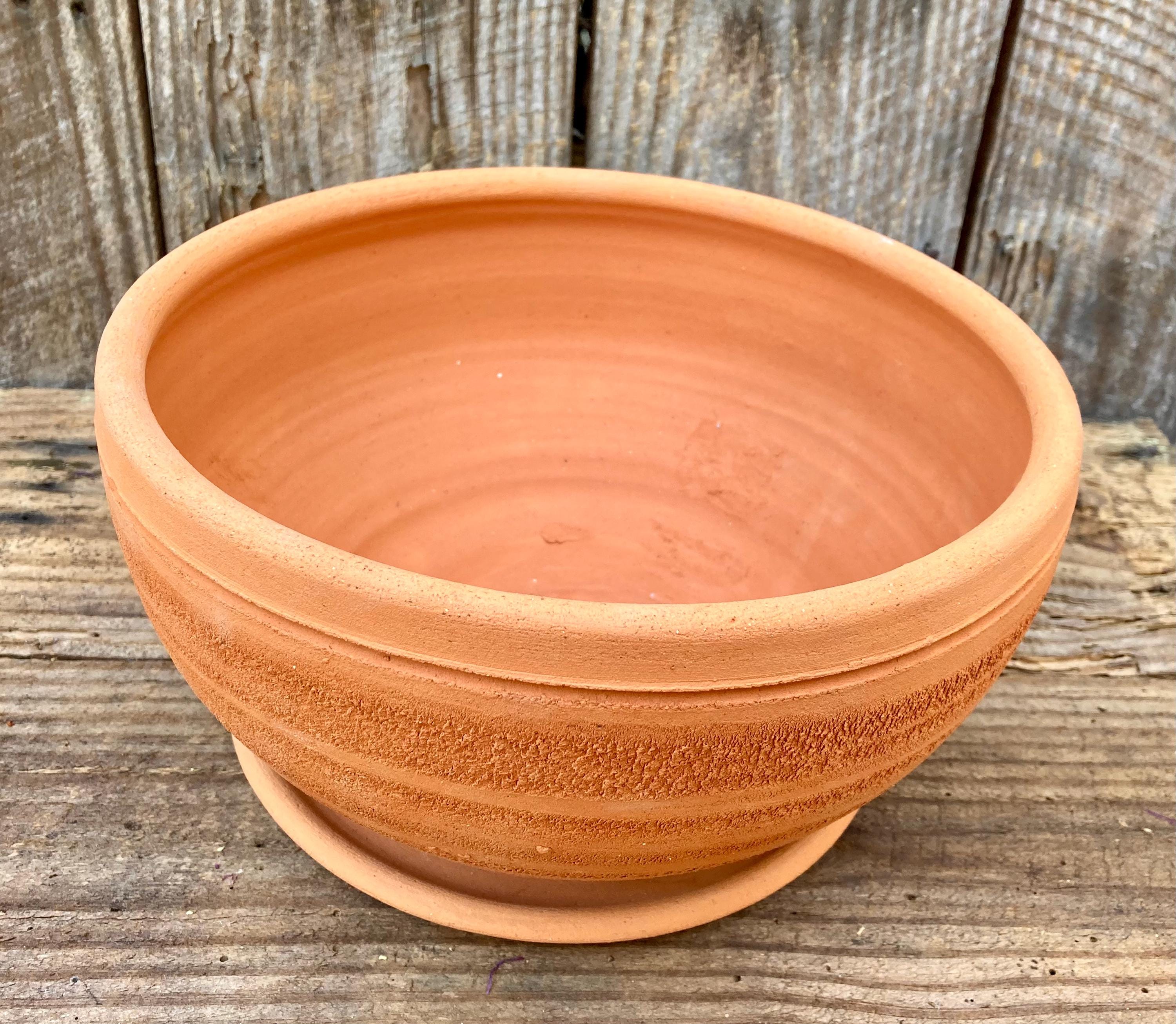 This large, round, terracotta planter with saucer was made of wheel-thrown, locally dug clay that when fired to the right temperature comes out a nice terracotta color and is porous. This allows air and water to flow through the pot which prevents root rot and soil disease.