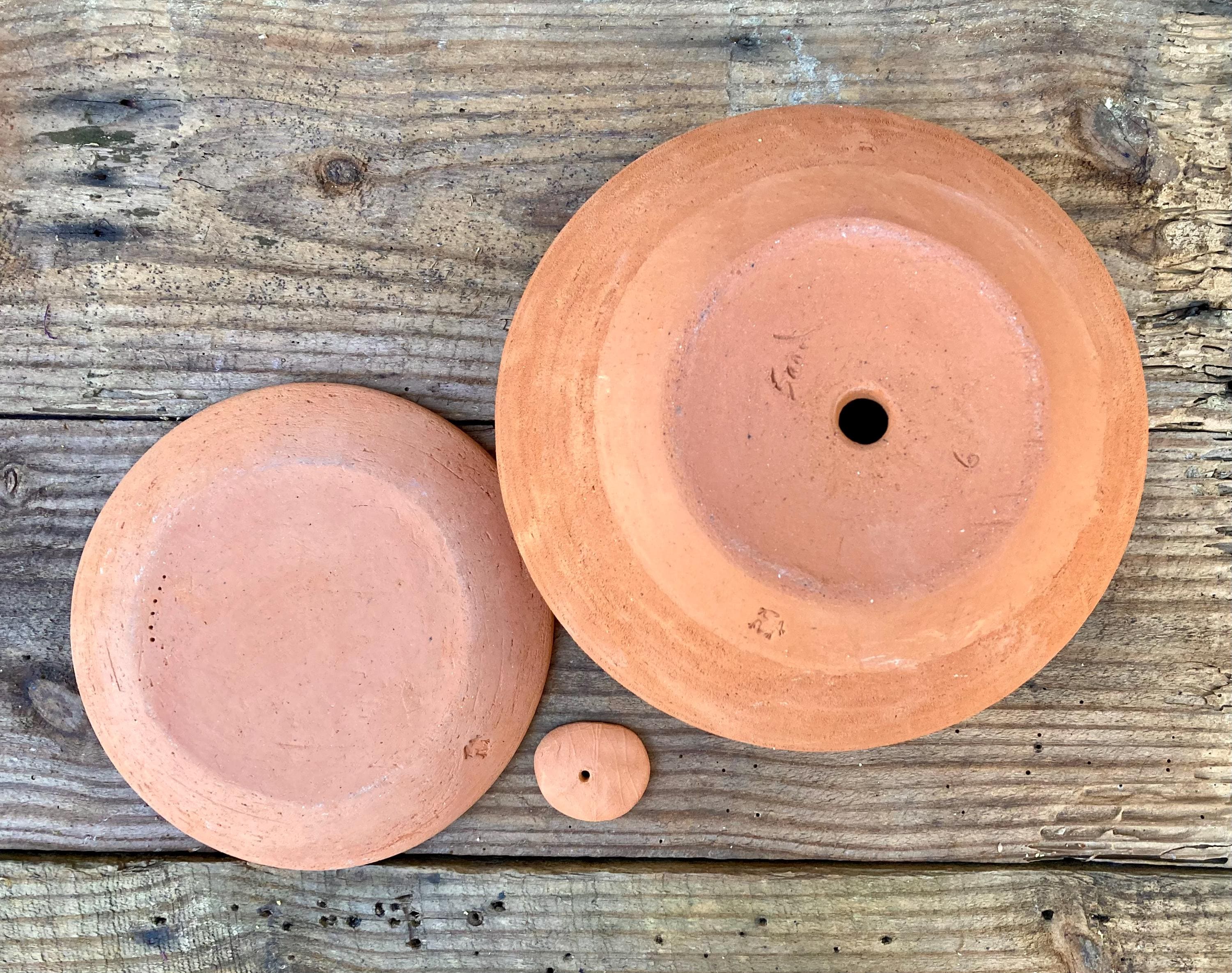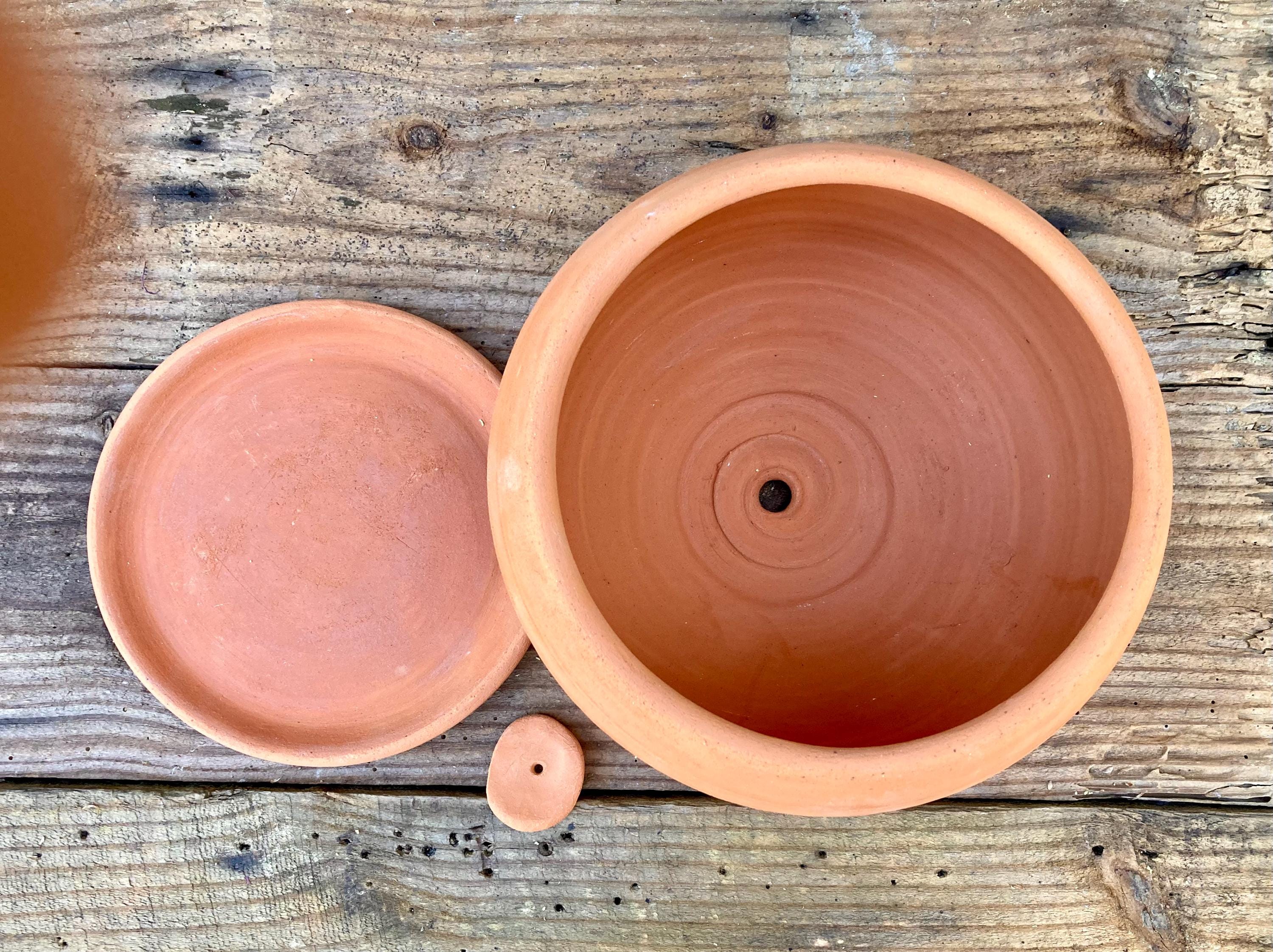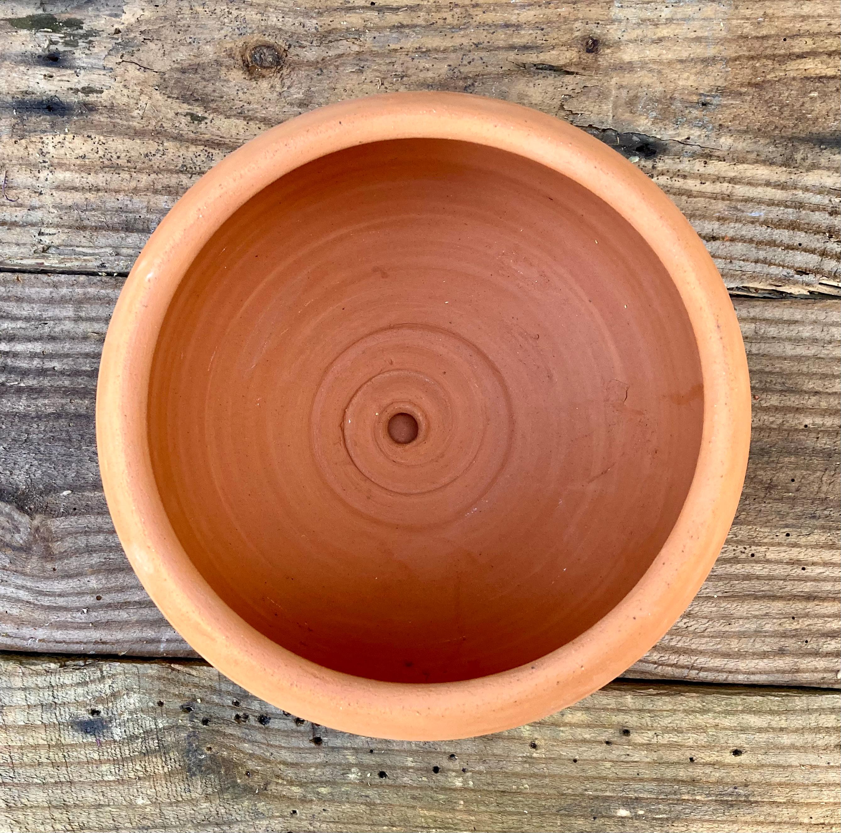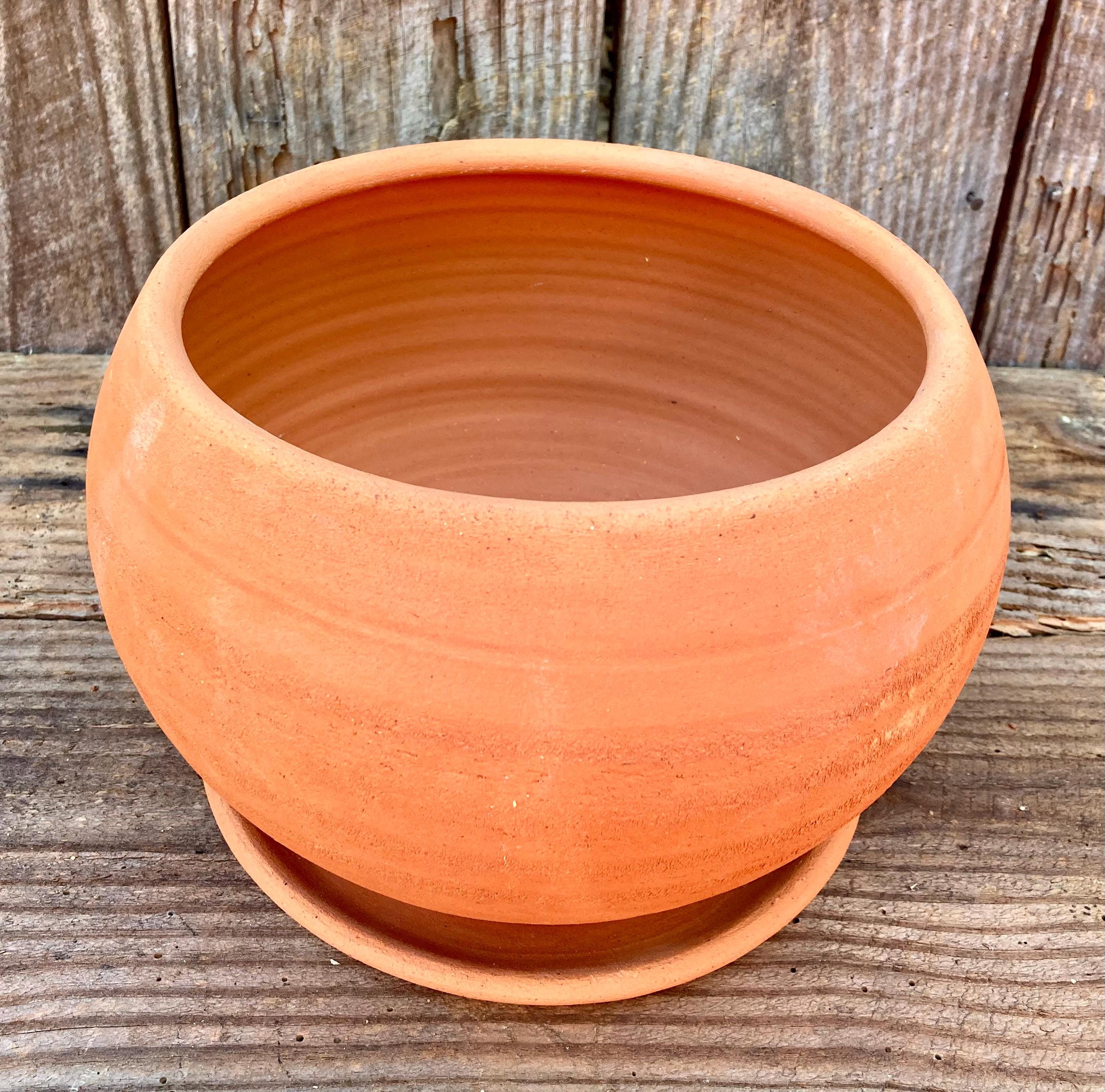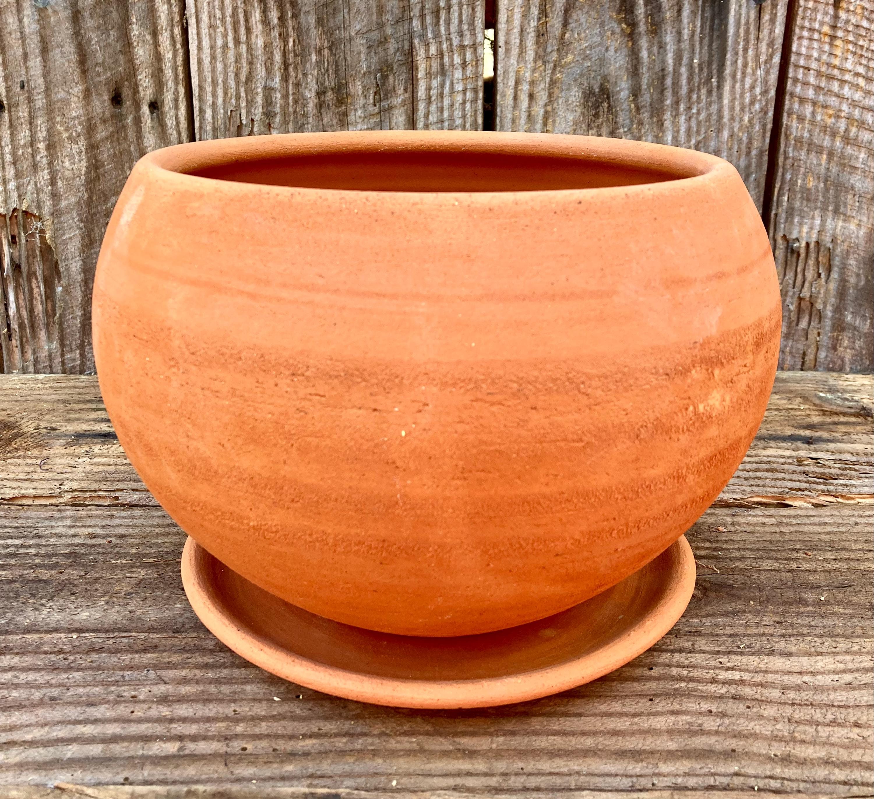 This large, round, terracotta planter with saucer was made of wheel-thrown, locally dug clay that when fired to the right temperature comes out a nice terracotta color and is porous. This allows air and water to flow through the pot which prevents root rot and soil disease.