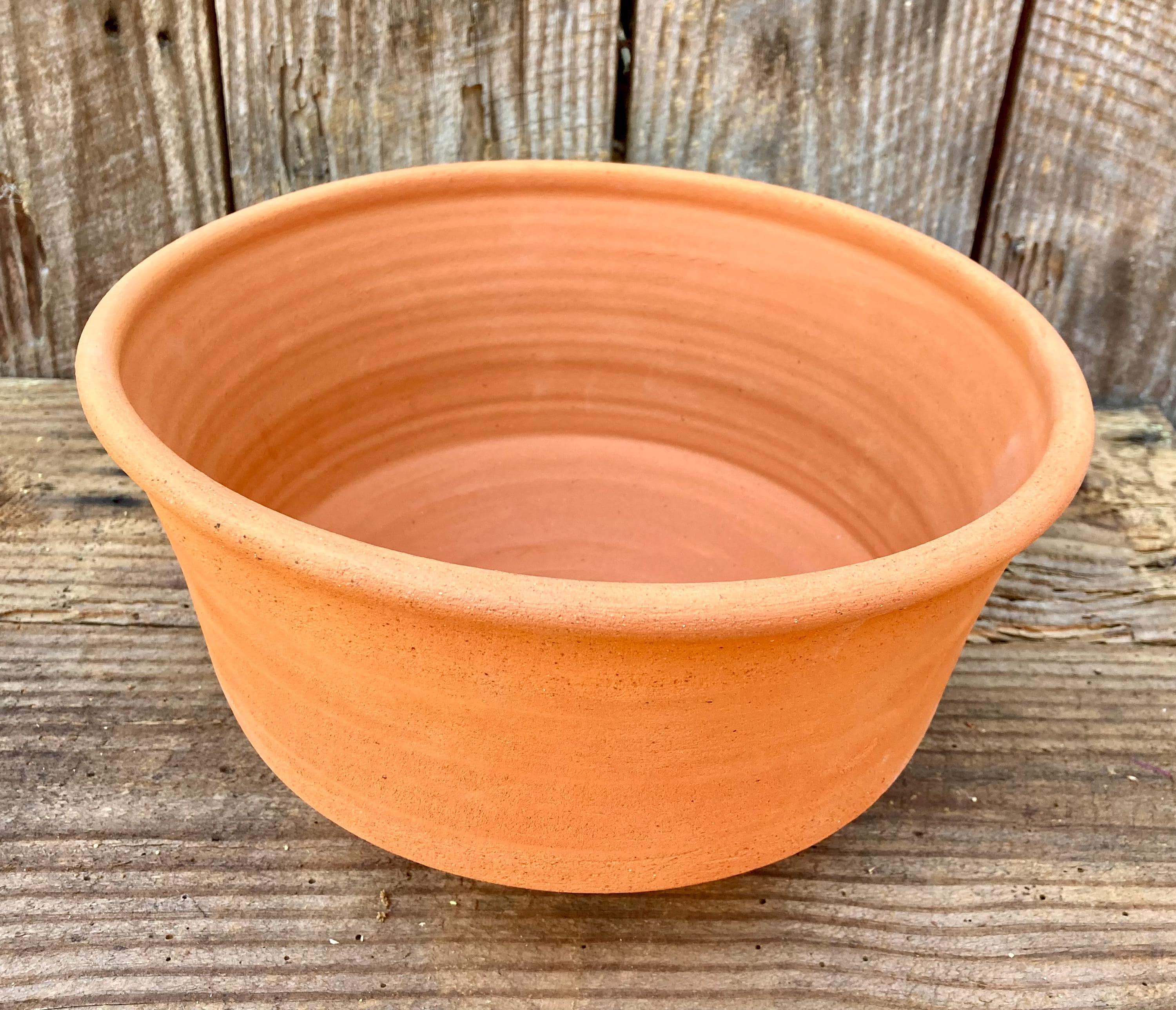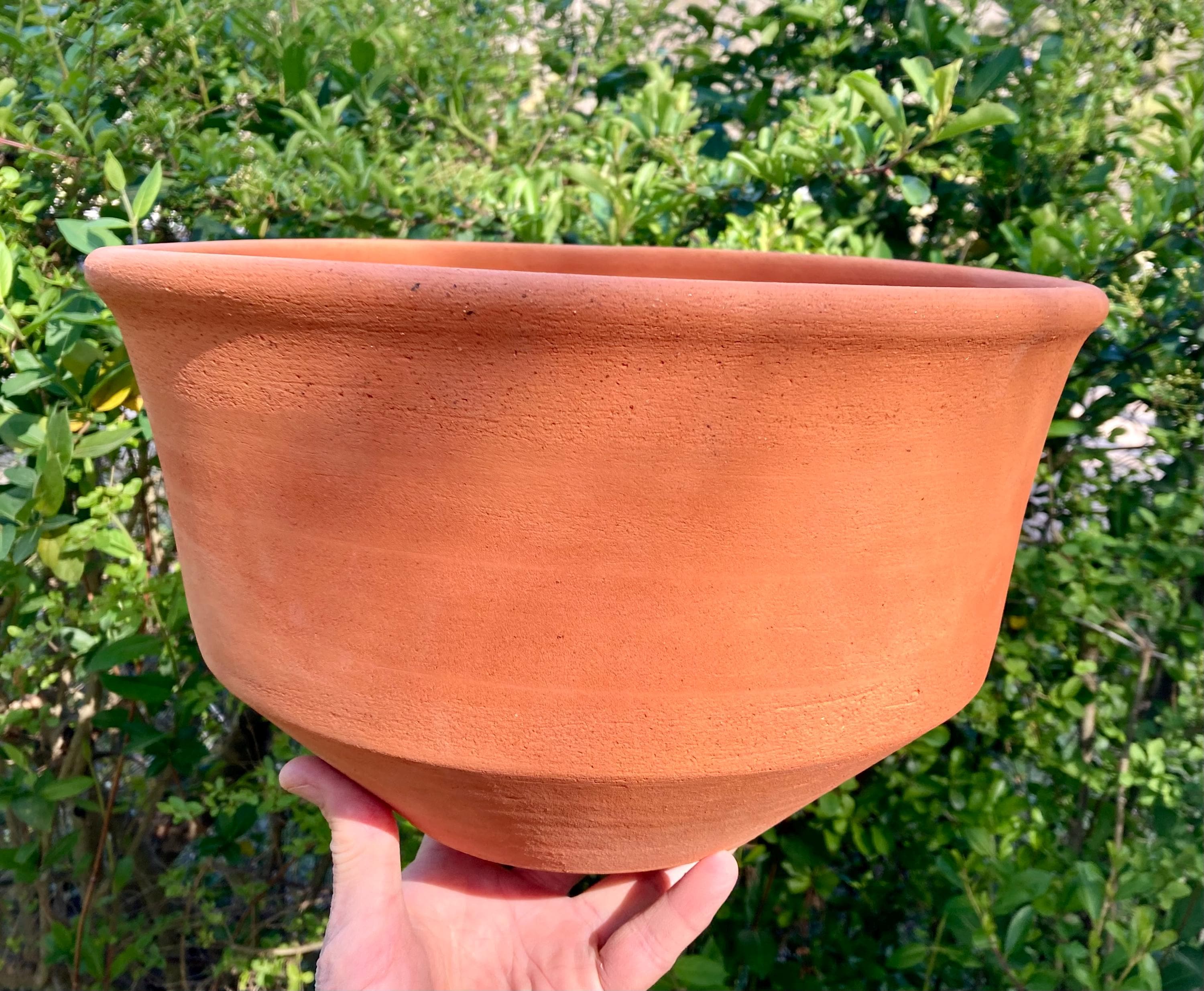 This large, terracotta planter was made of wheel-thrown, locally dug clay that when fired to the right temperature comes out a nice terracotta color and is porous. This allows air and water to flow through the pot which prevents root rot and soil disease.
