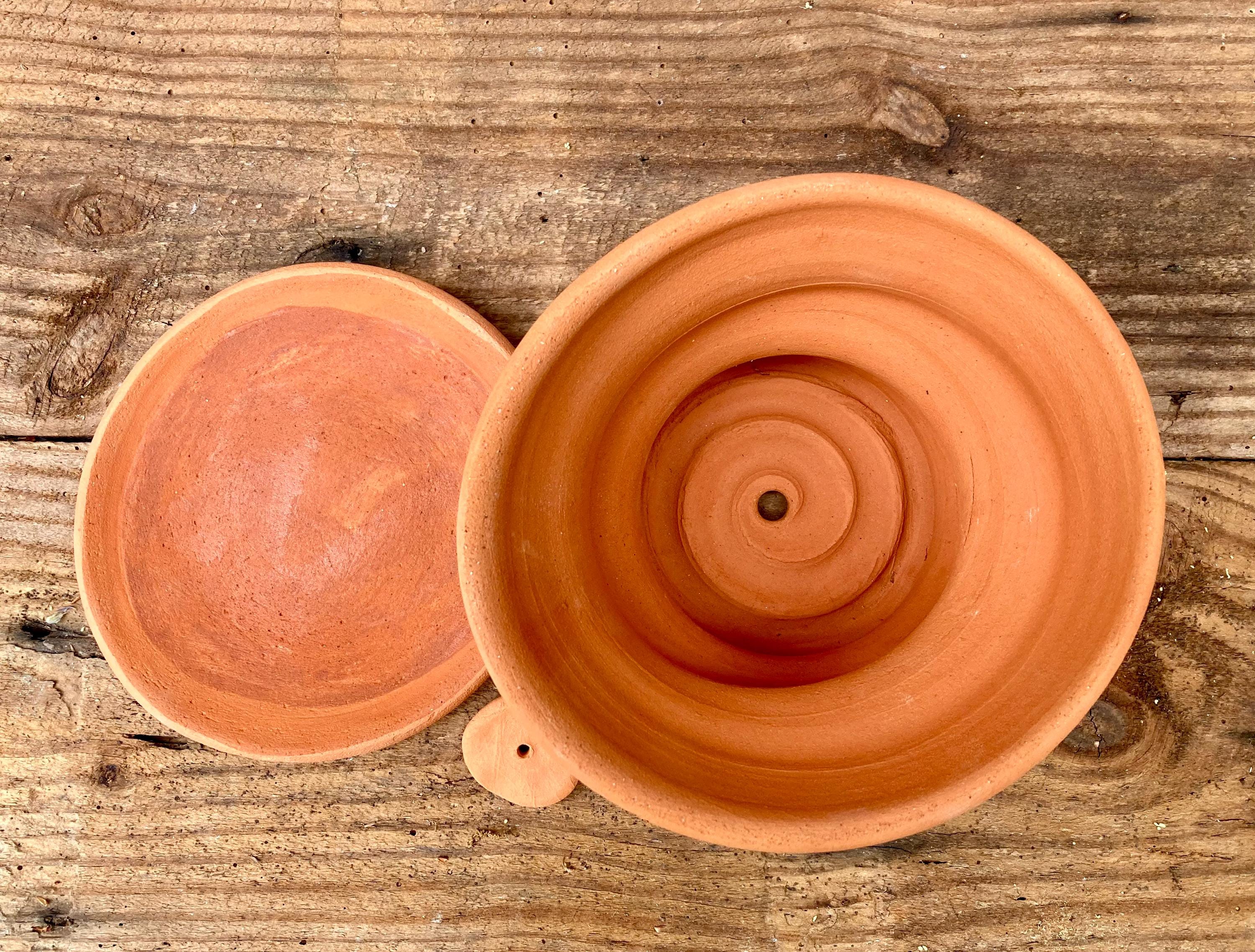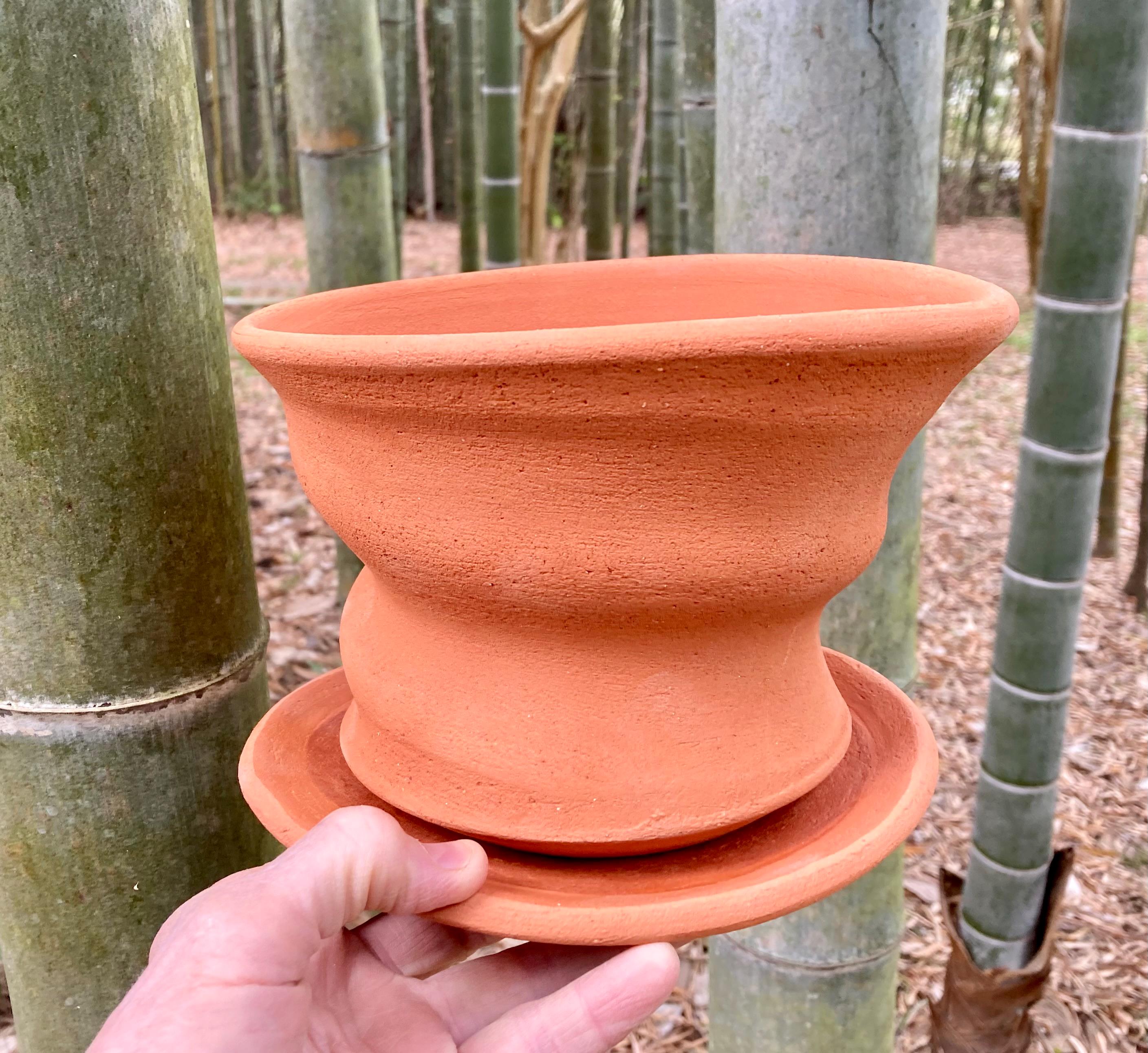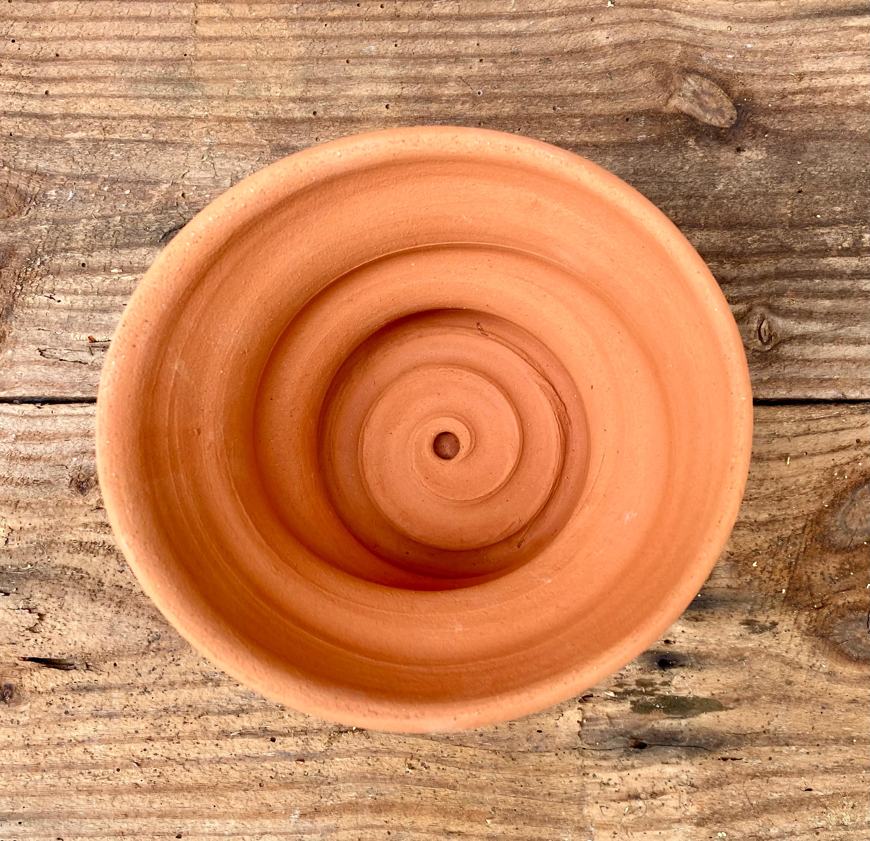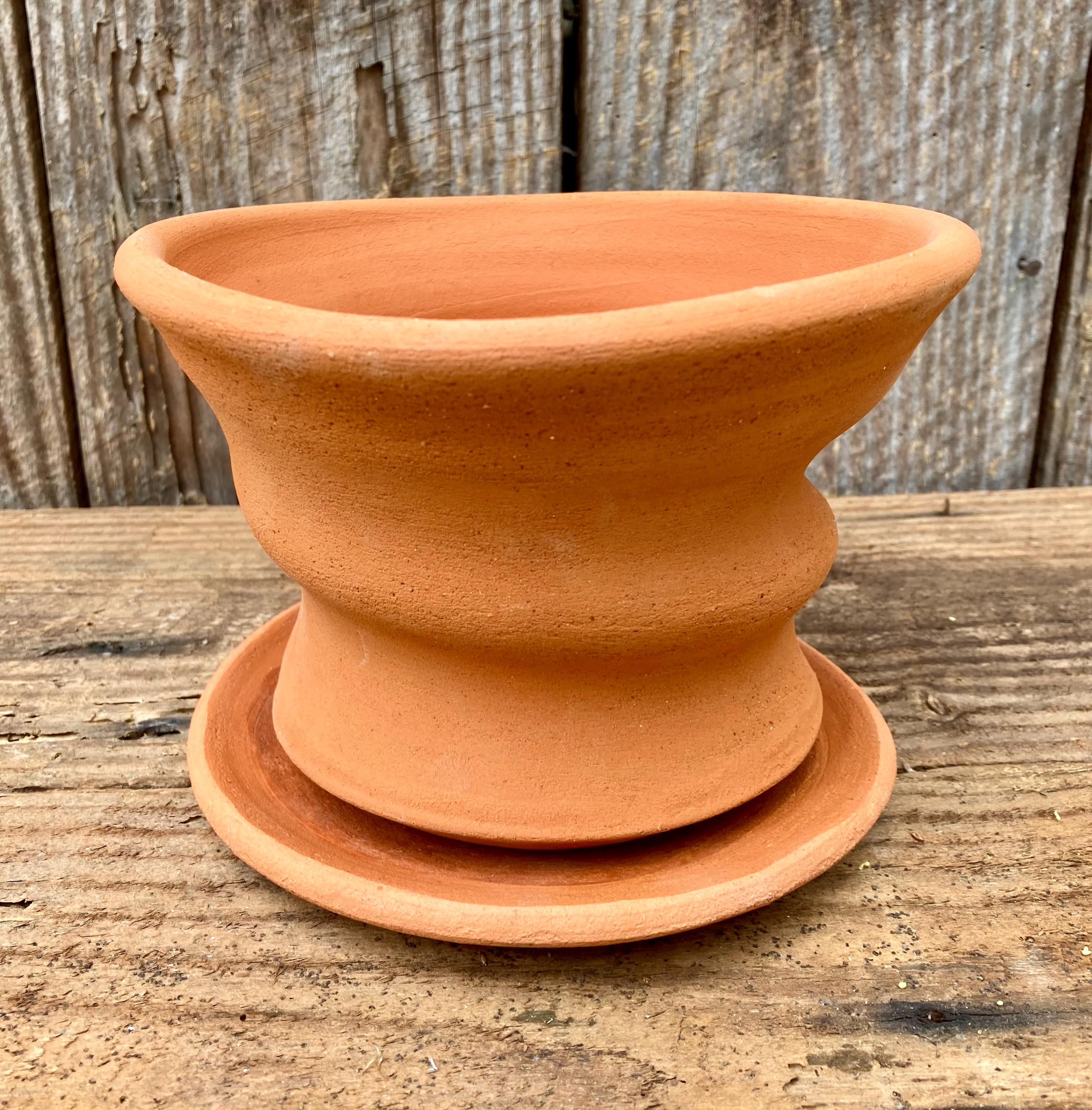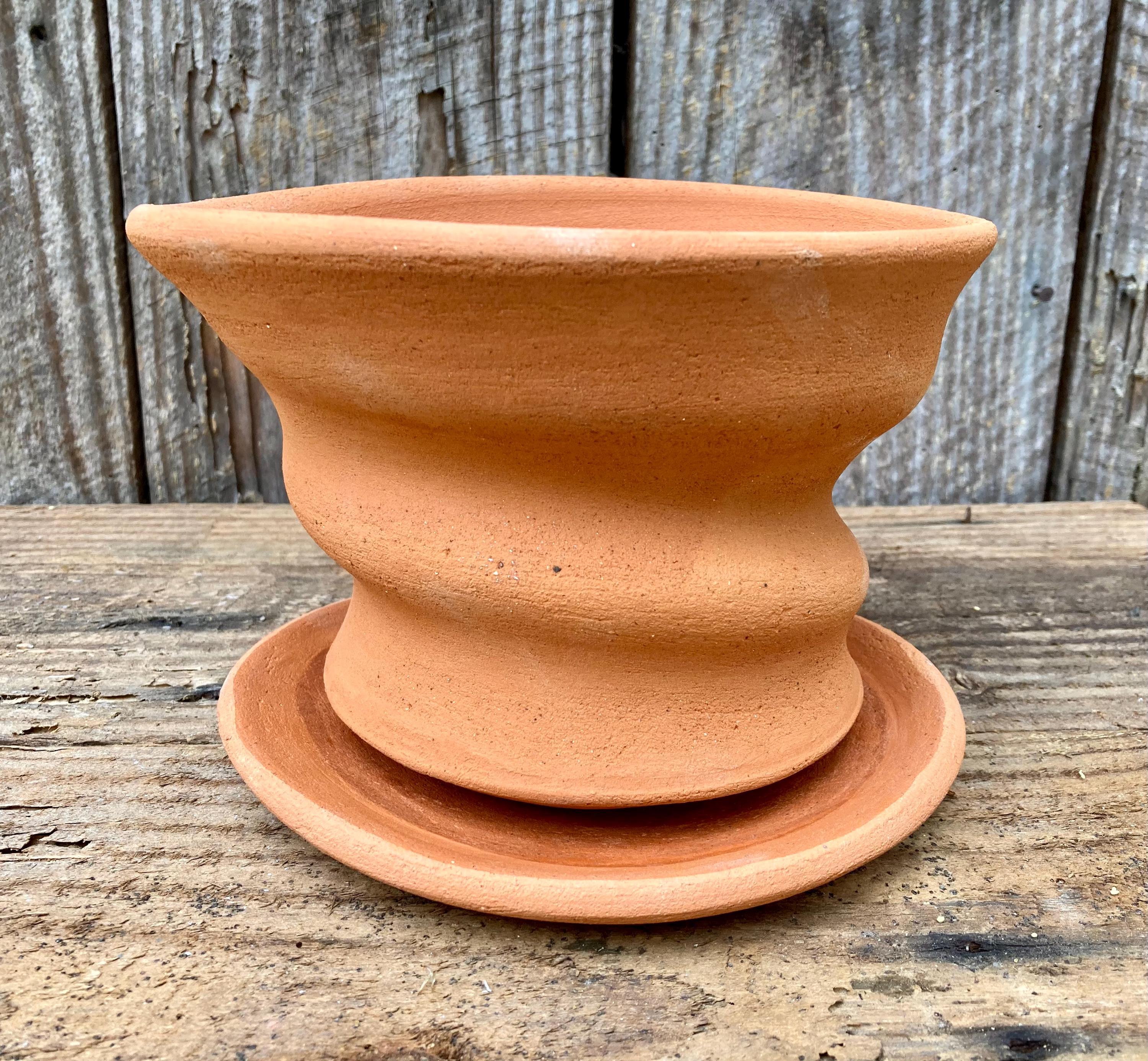 This free-form, terracotta planter was centered on the wheel then knocked off center to make it asymmetrical, to get a lip that is thick on one side and thin on the other, to get a nice, gestural spiraling movement.