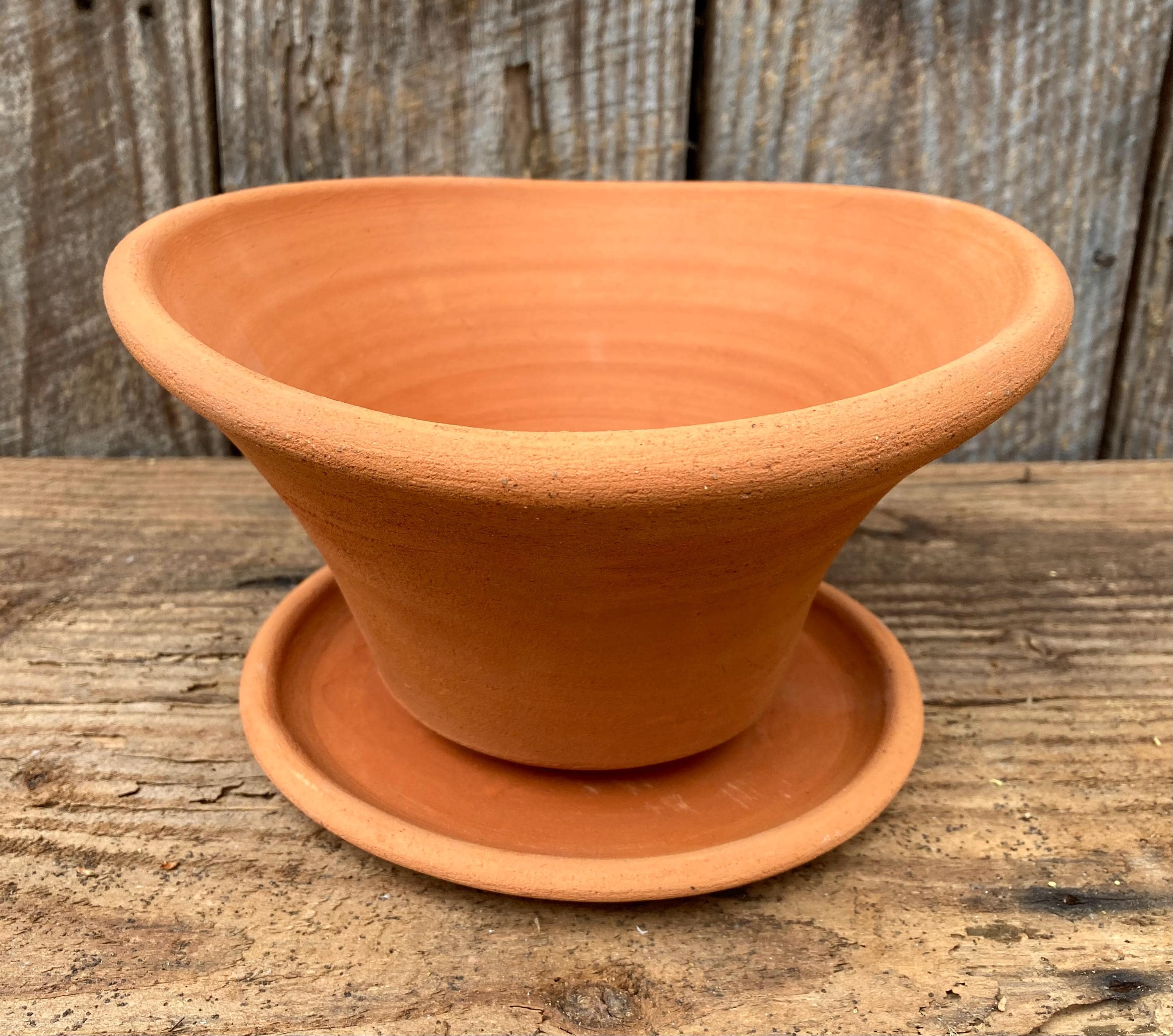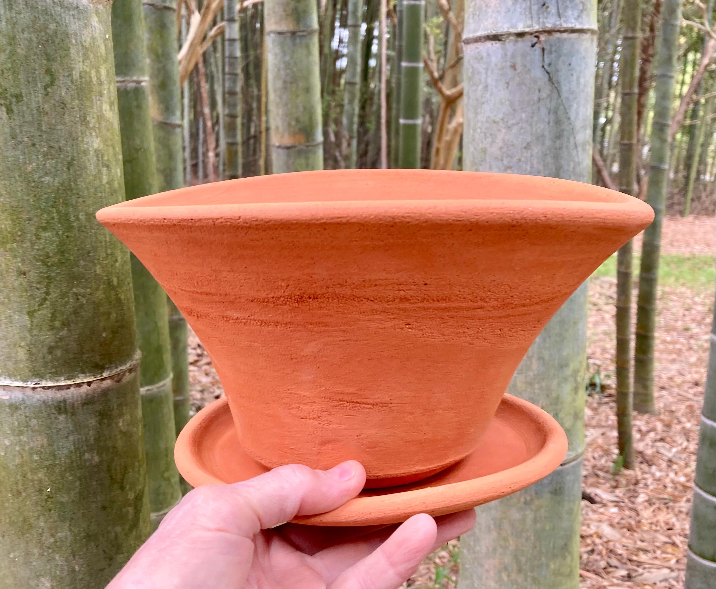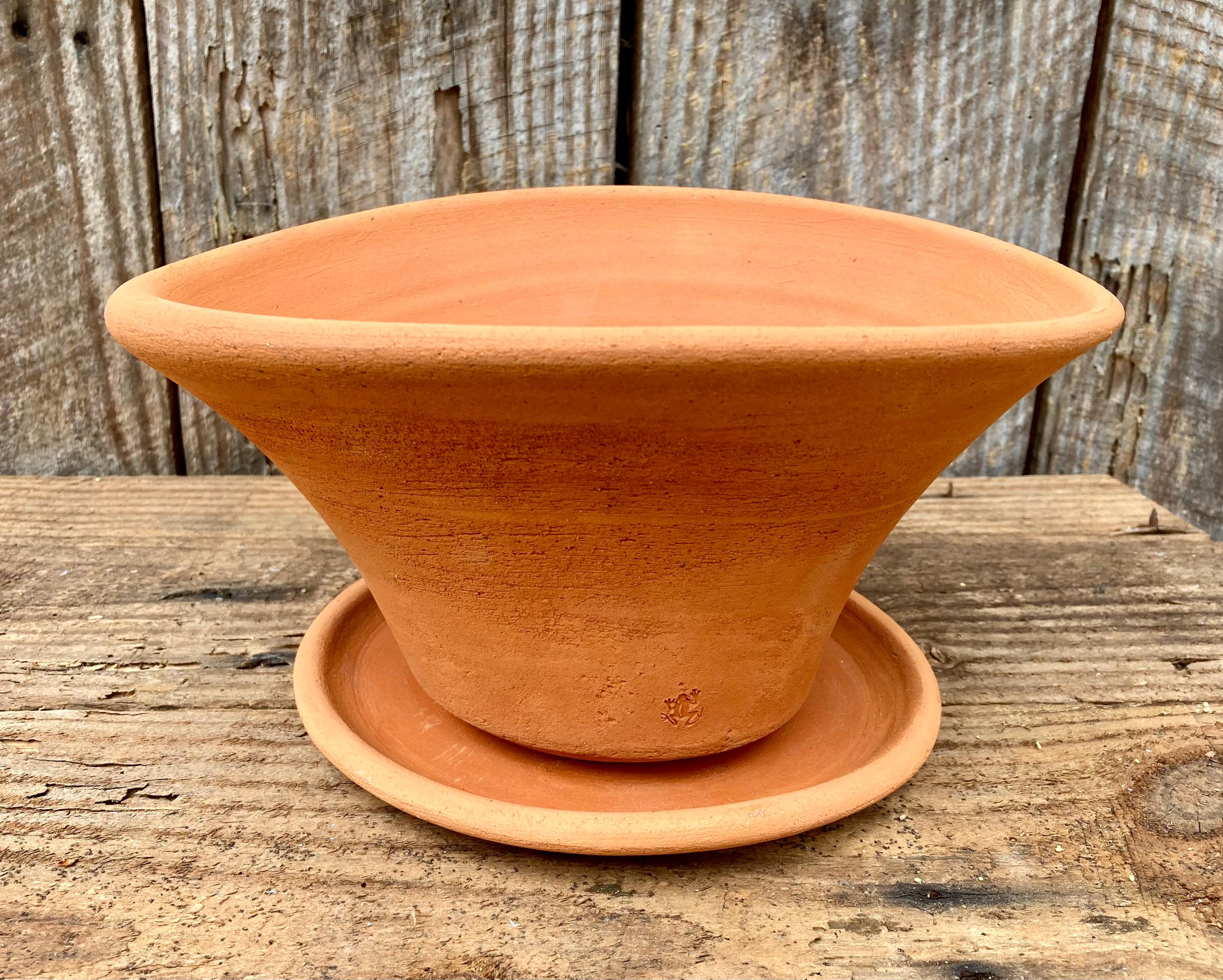 This gestural, terracotta planter was centered on the wheel then knocked off center to make it asymmetrical, to get a lip that is thick on one side and thin on the other, to get gesture and movement.