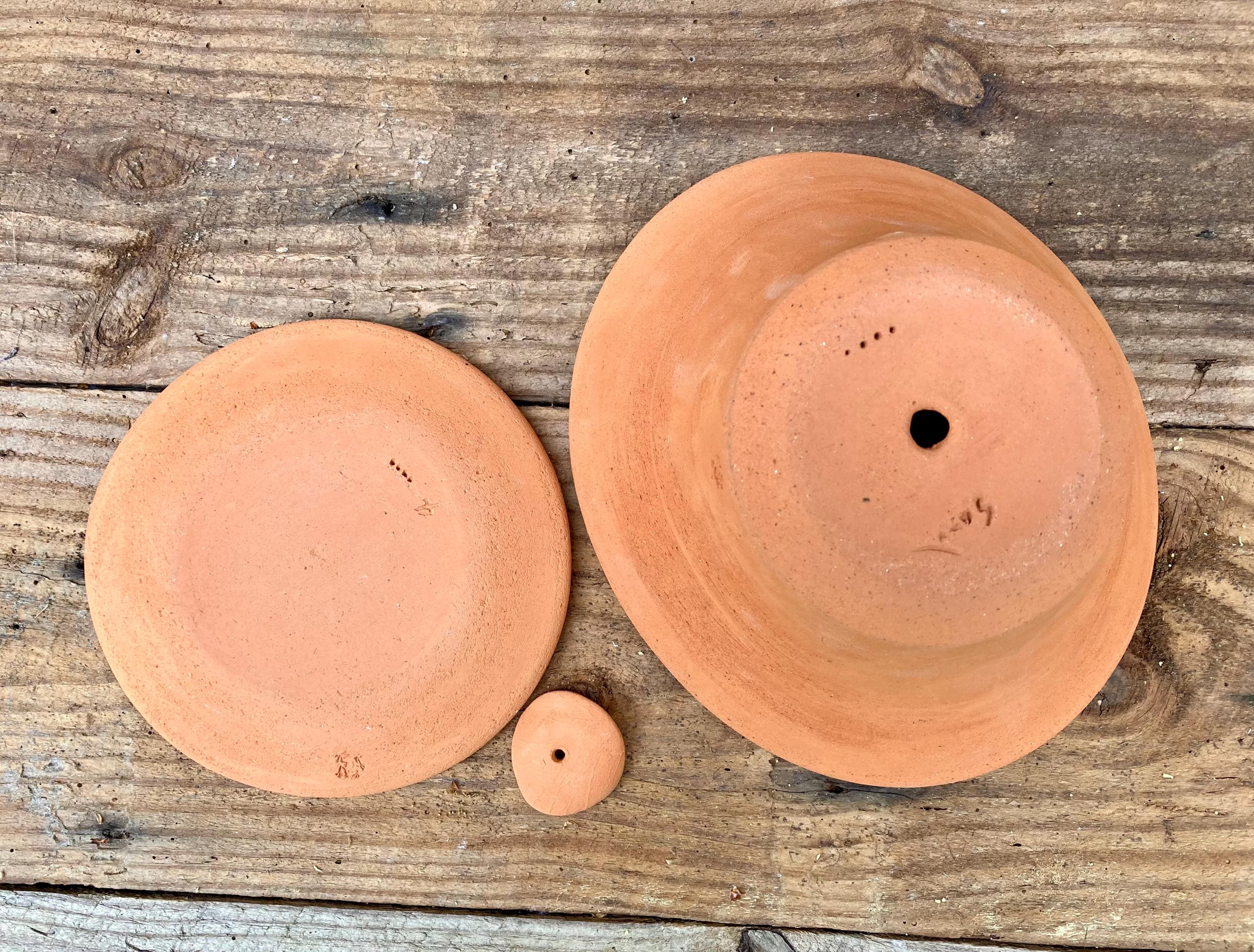 It is fired high enough to be much stronger and more durable than mass produced terracotta pots (which are usually not real terracotta). It has a small hole for drainage and a saucer that has been treated with a sealant to prevent leakage. It also comes with a small shard to keep the soil from falling out or the hole becoming clogged. Okay indoors or outdoors.