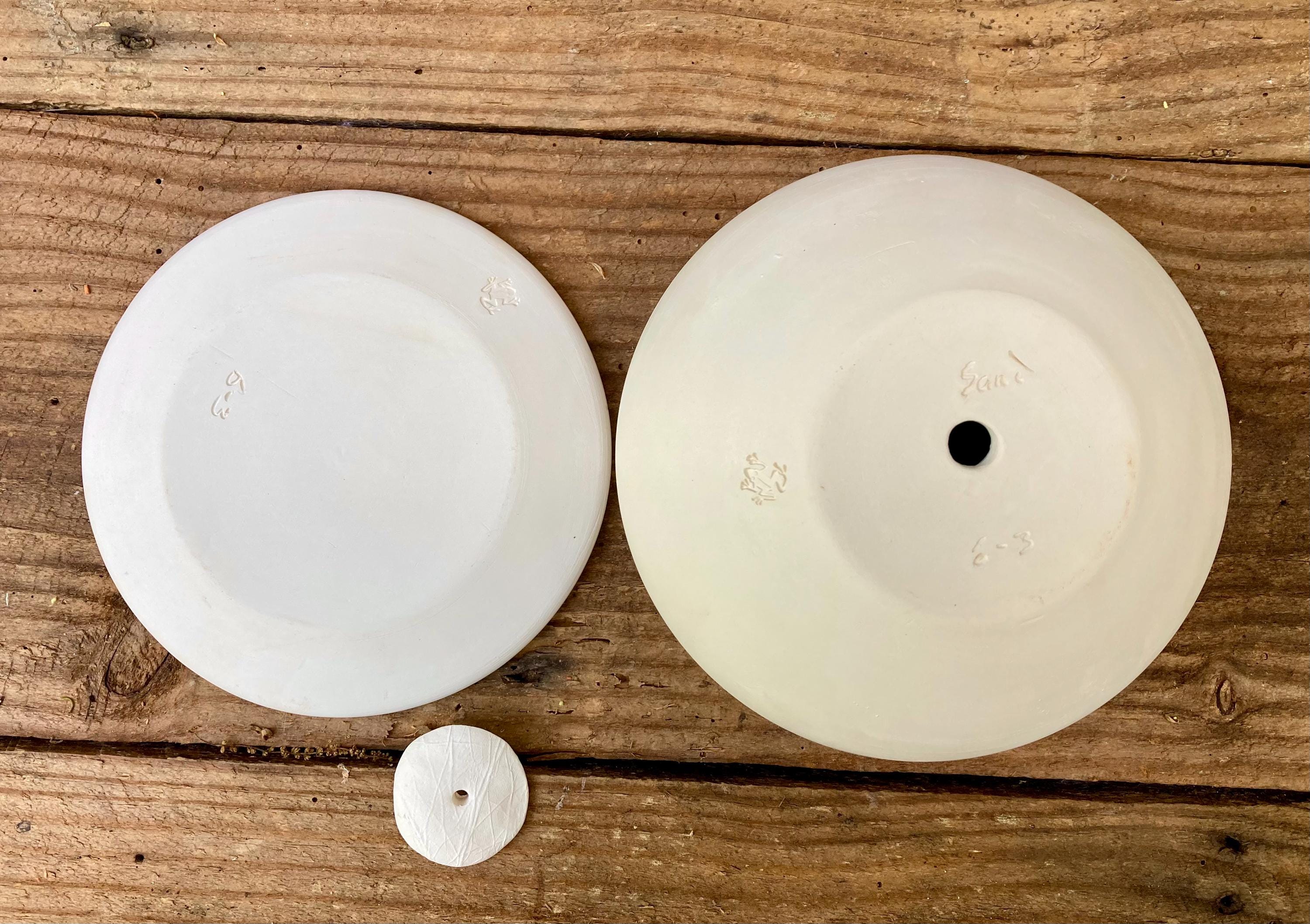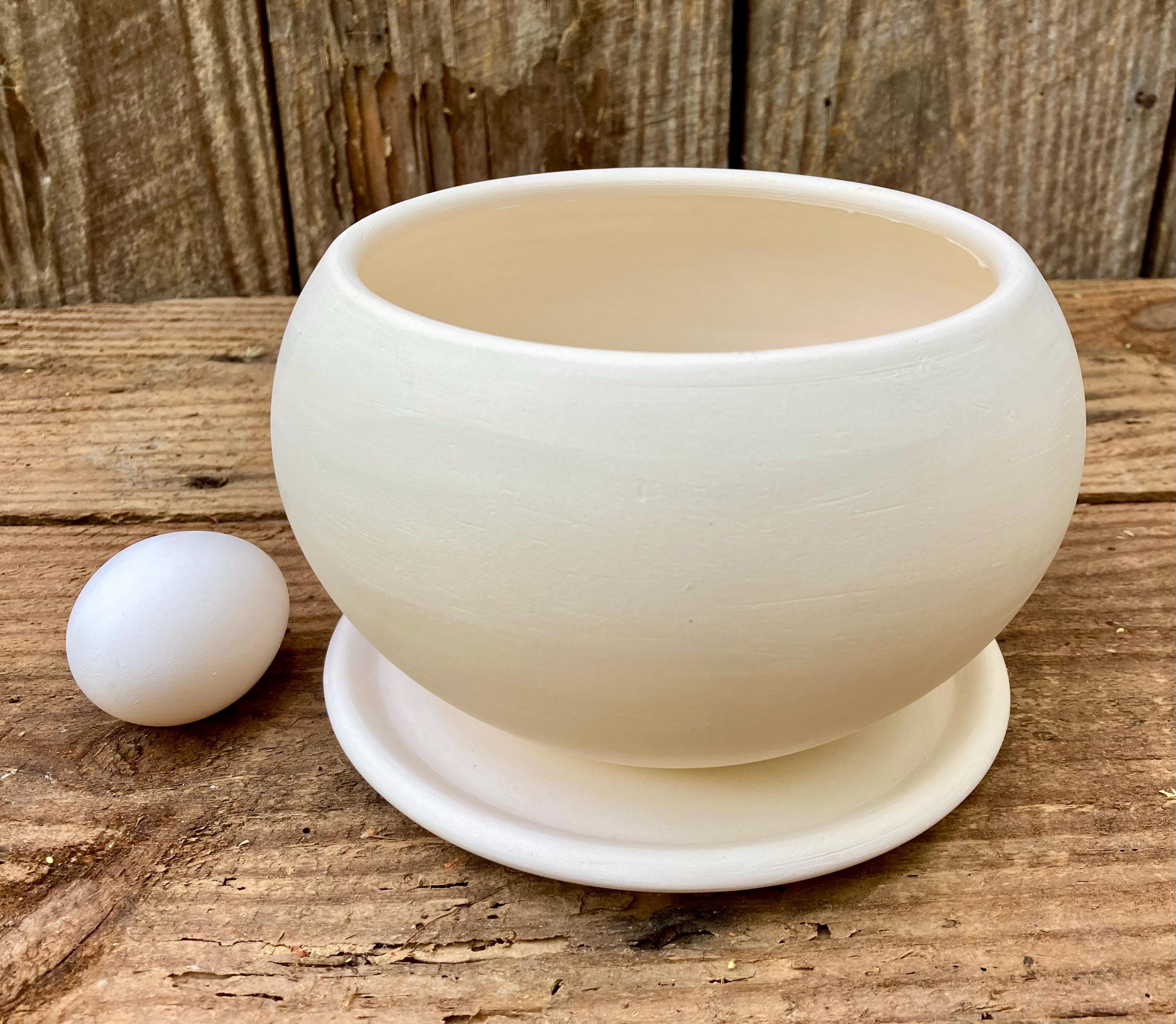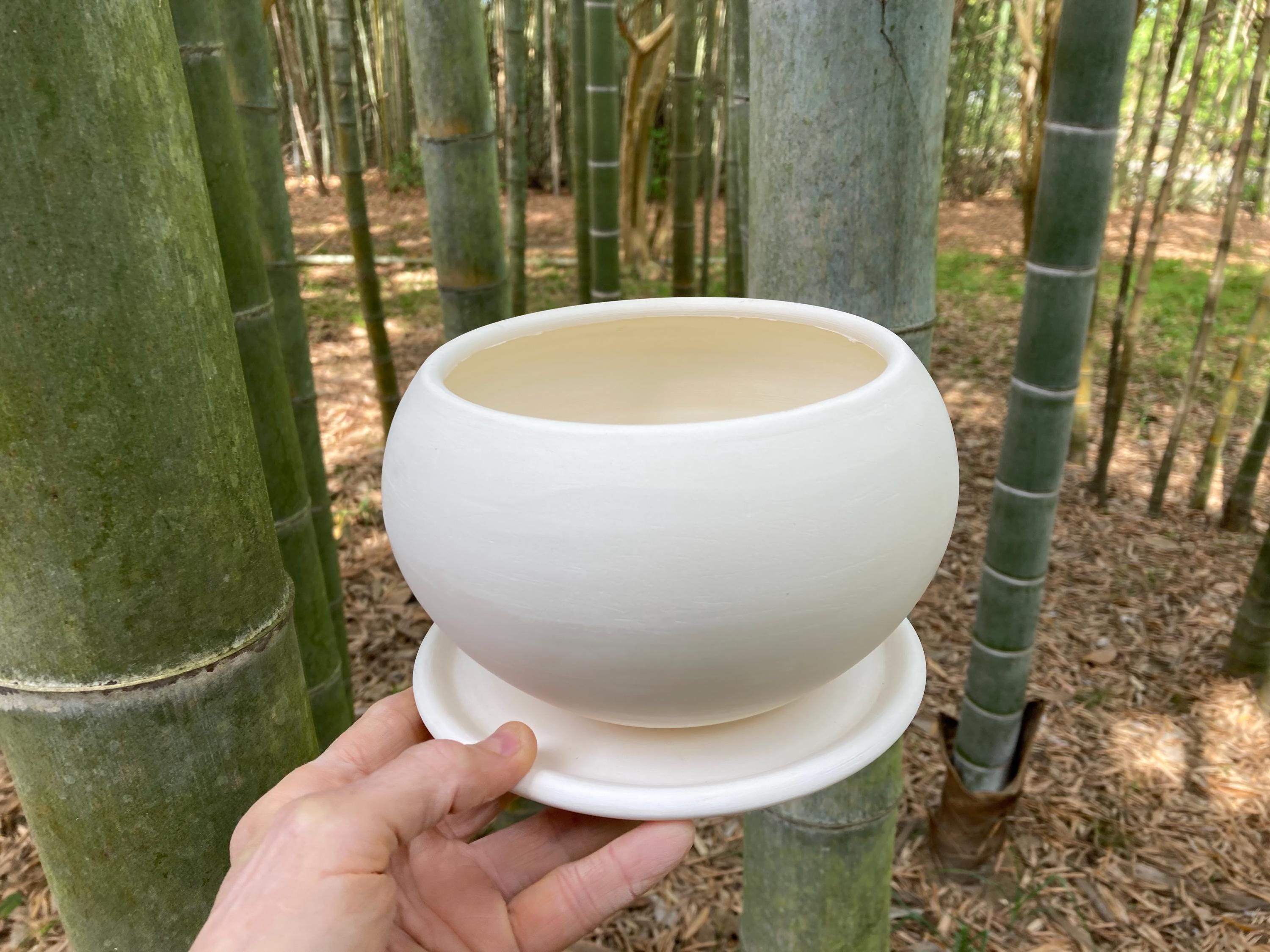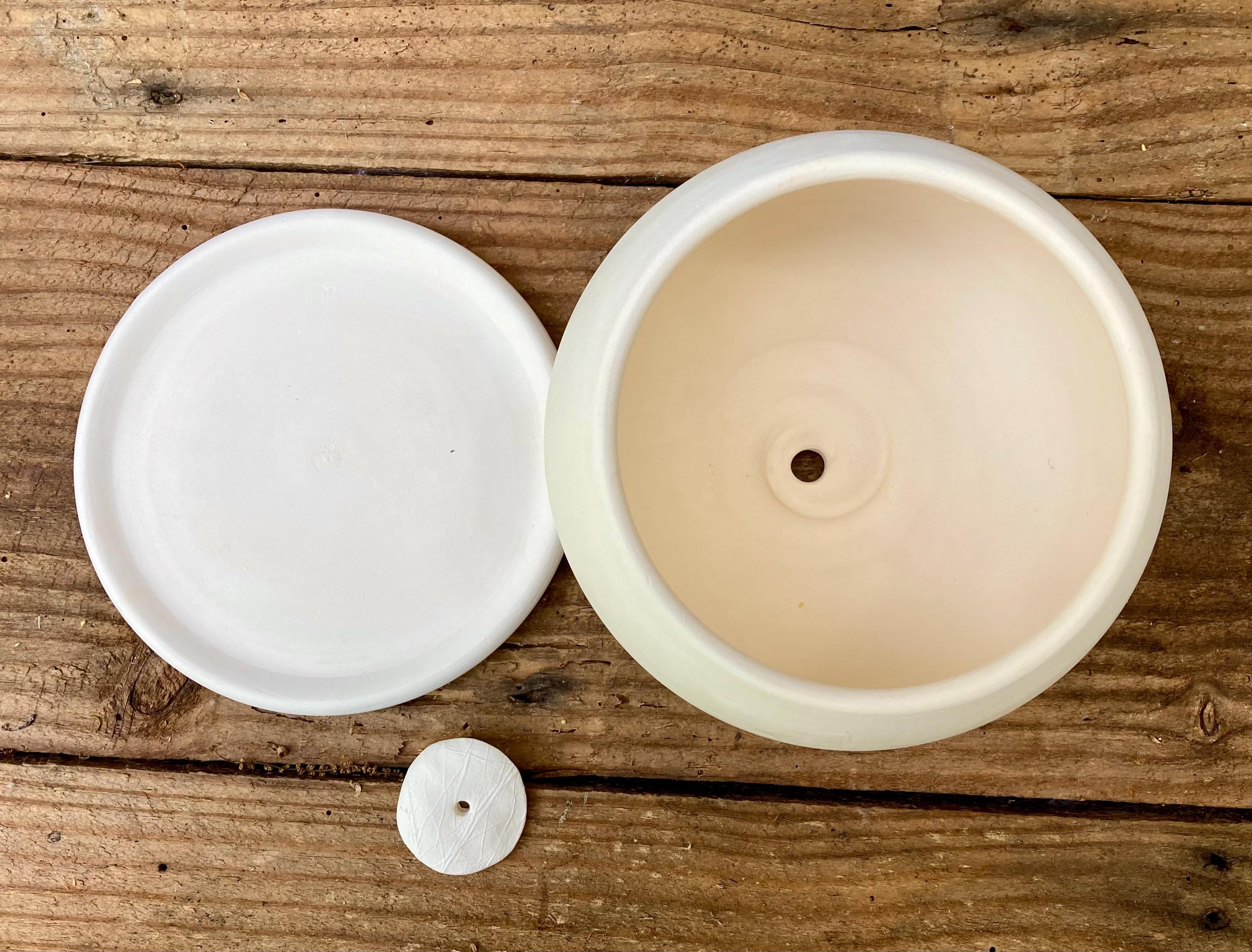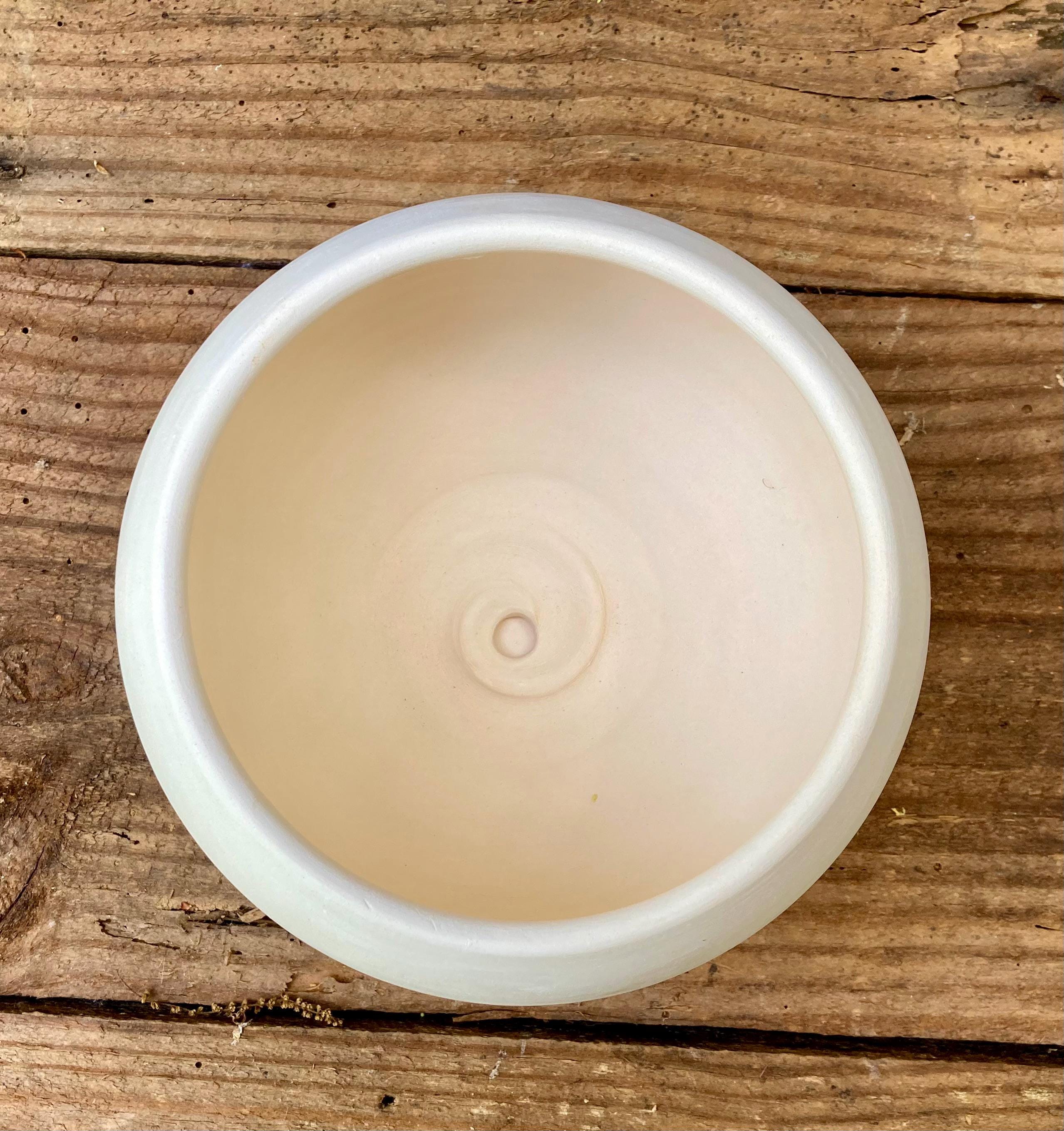 This round planter with saucer was made of white earthenware clay. Like terracotta it is porous. This allows air and water to flow through the pot which prevents root rot and soil disease.