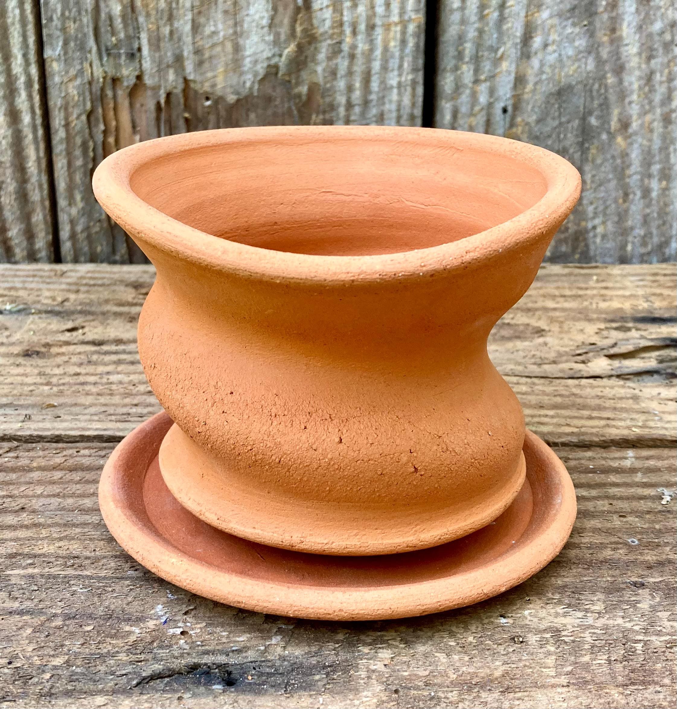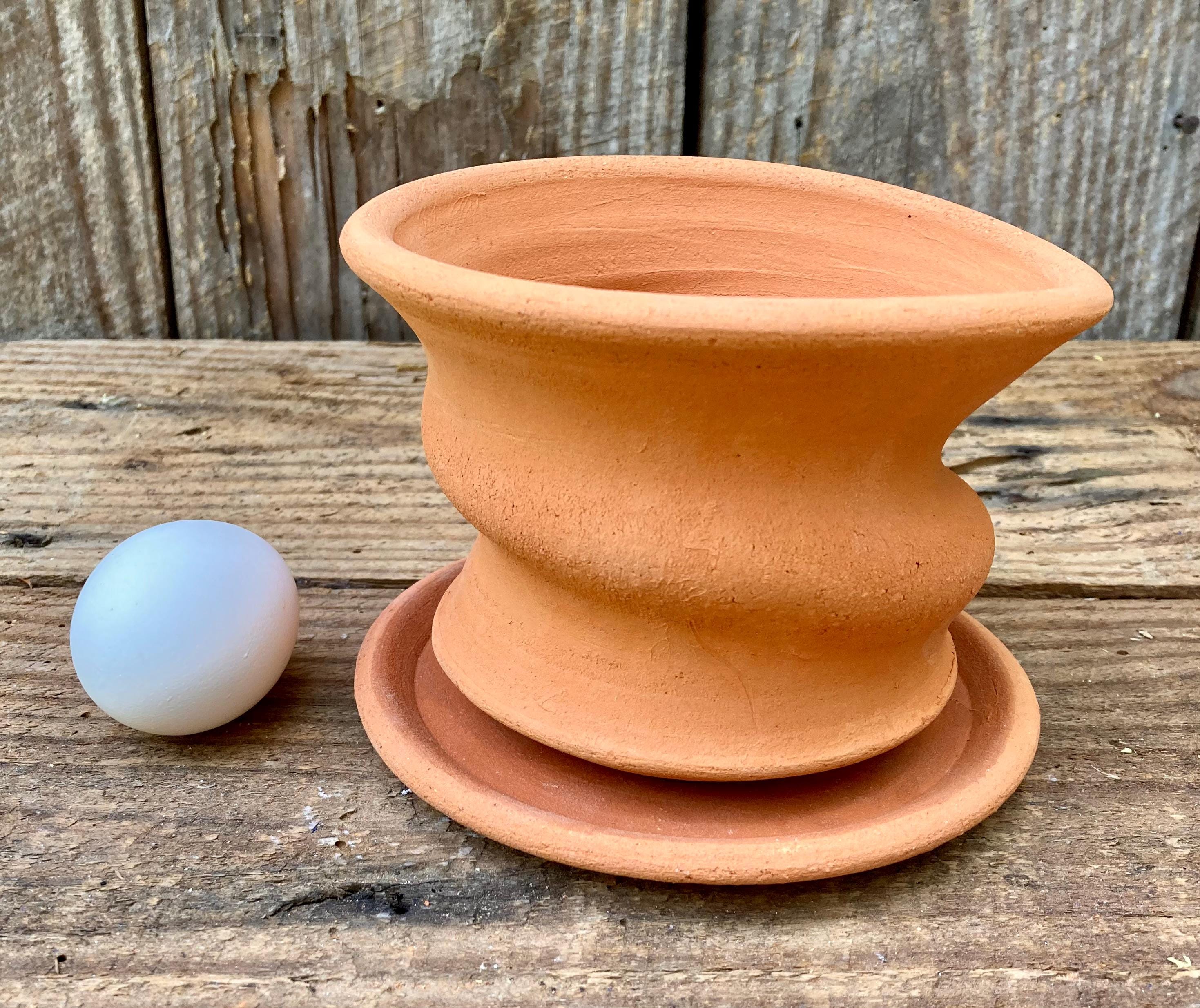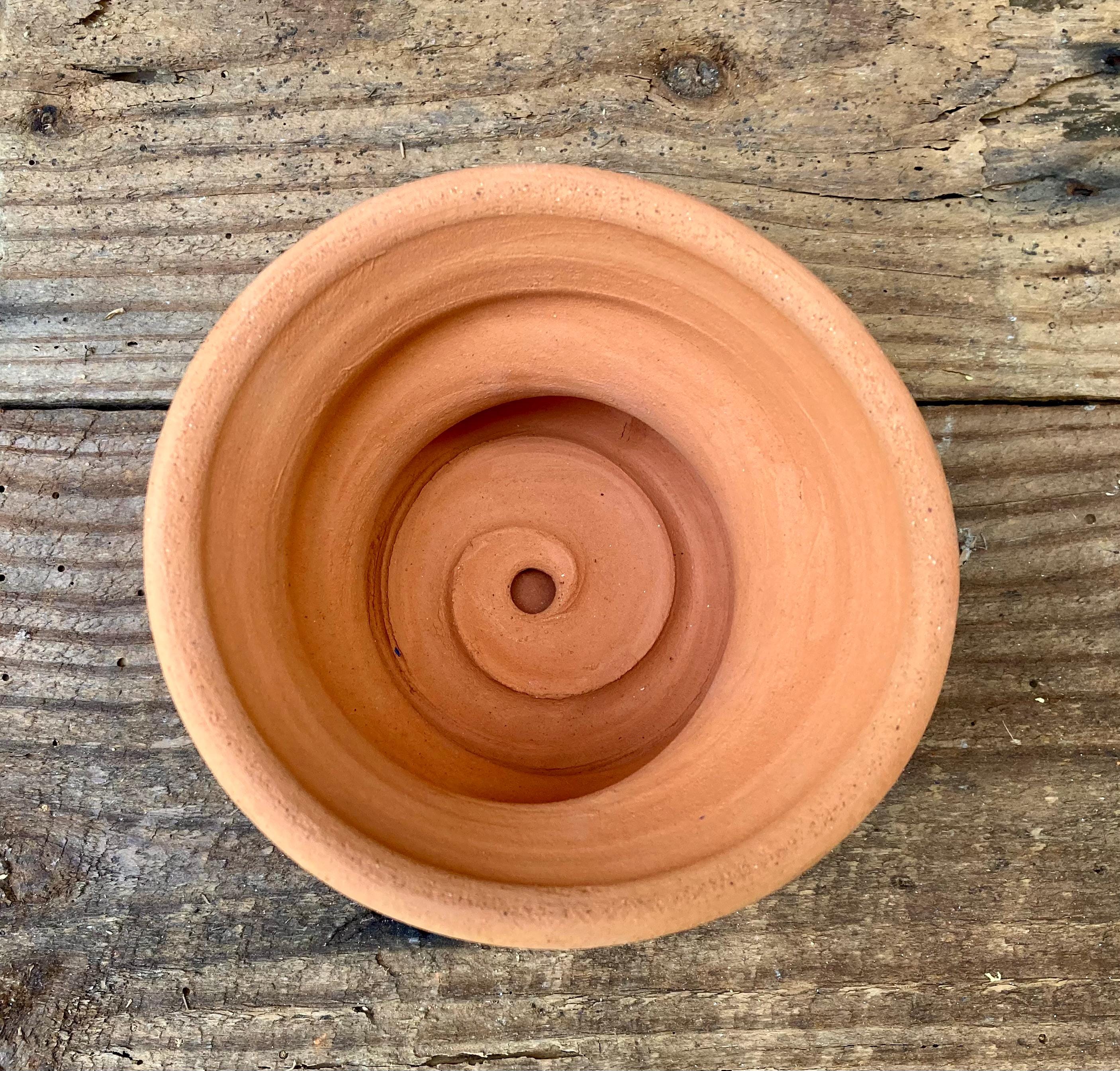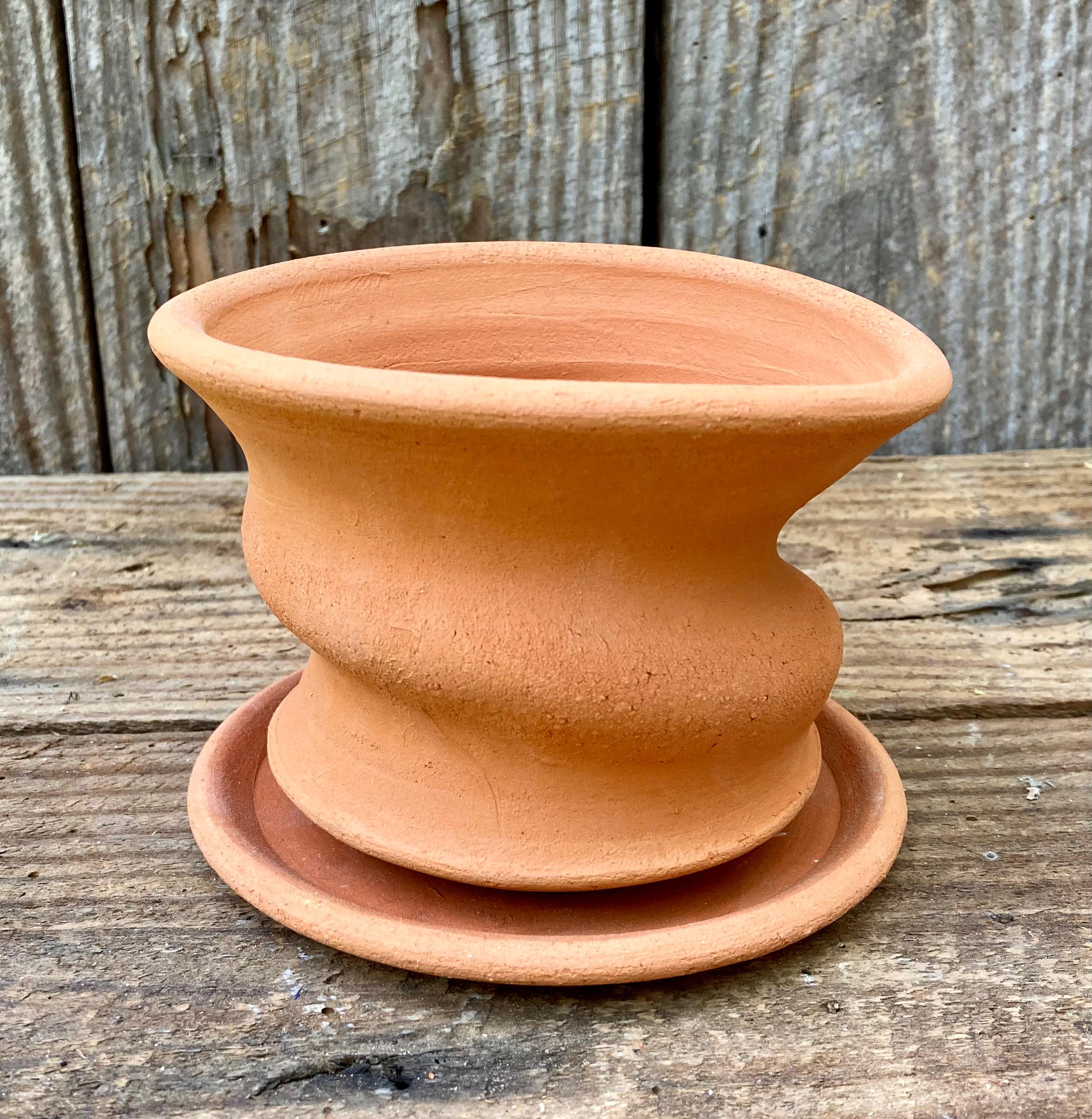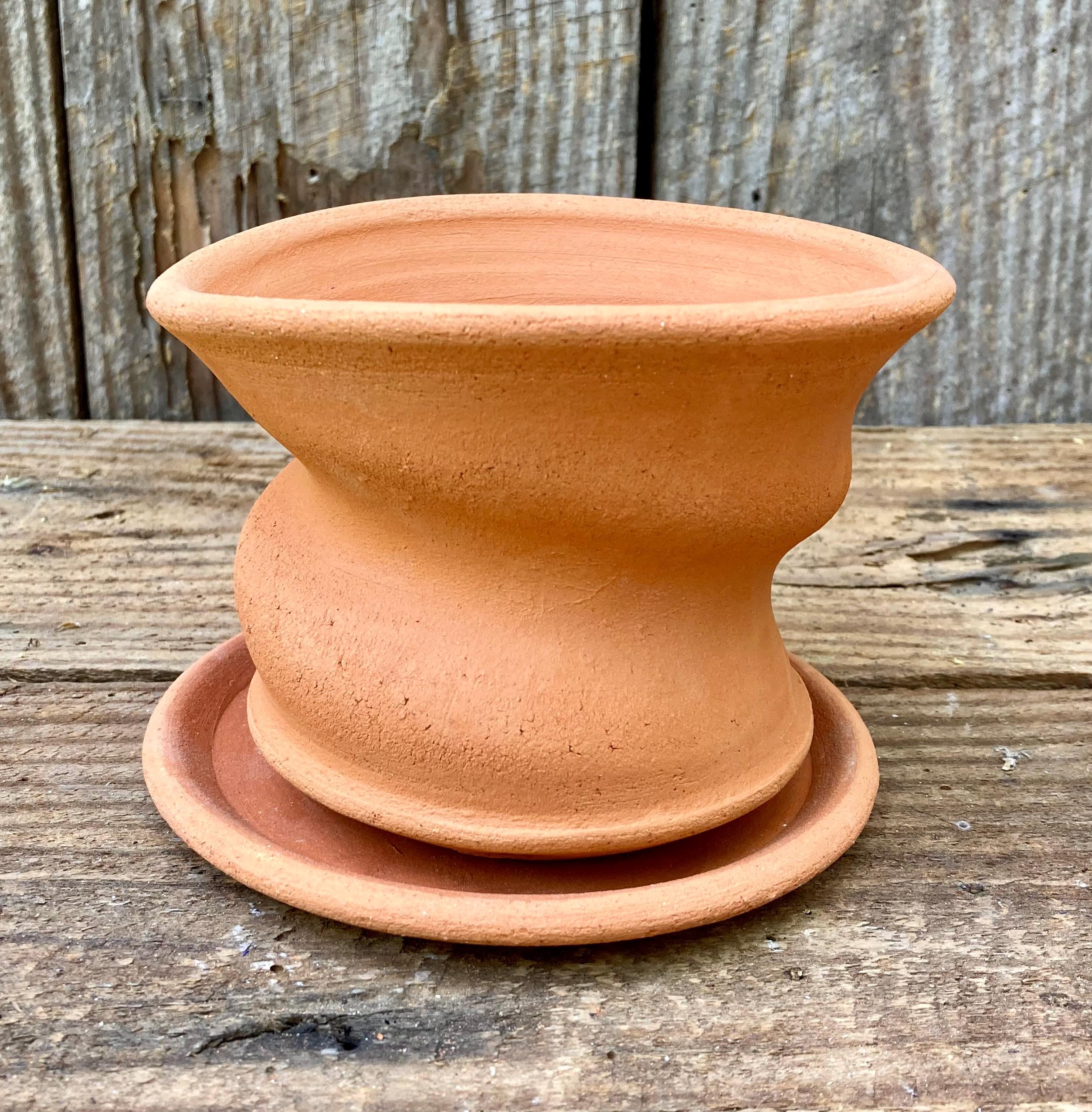 This small, free-form, terracotta planter was centered on the wheel then knocked off center to make it asymmetrical, to get a lip that is thick on one side and thin on the other, to get a nice, gestural spiraling movement.