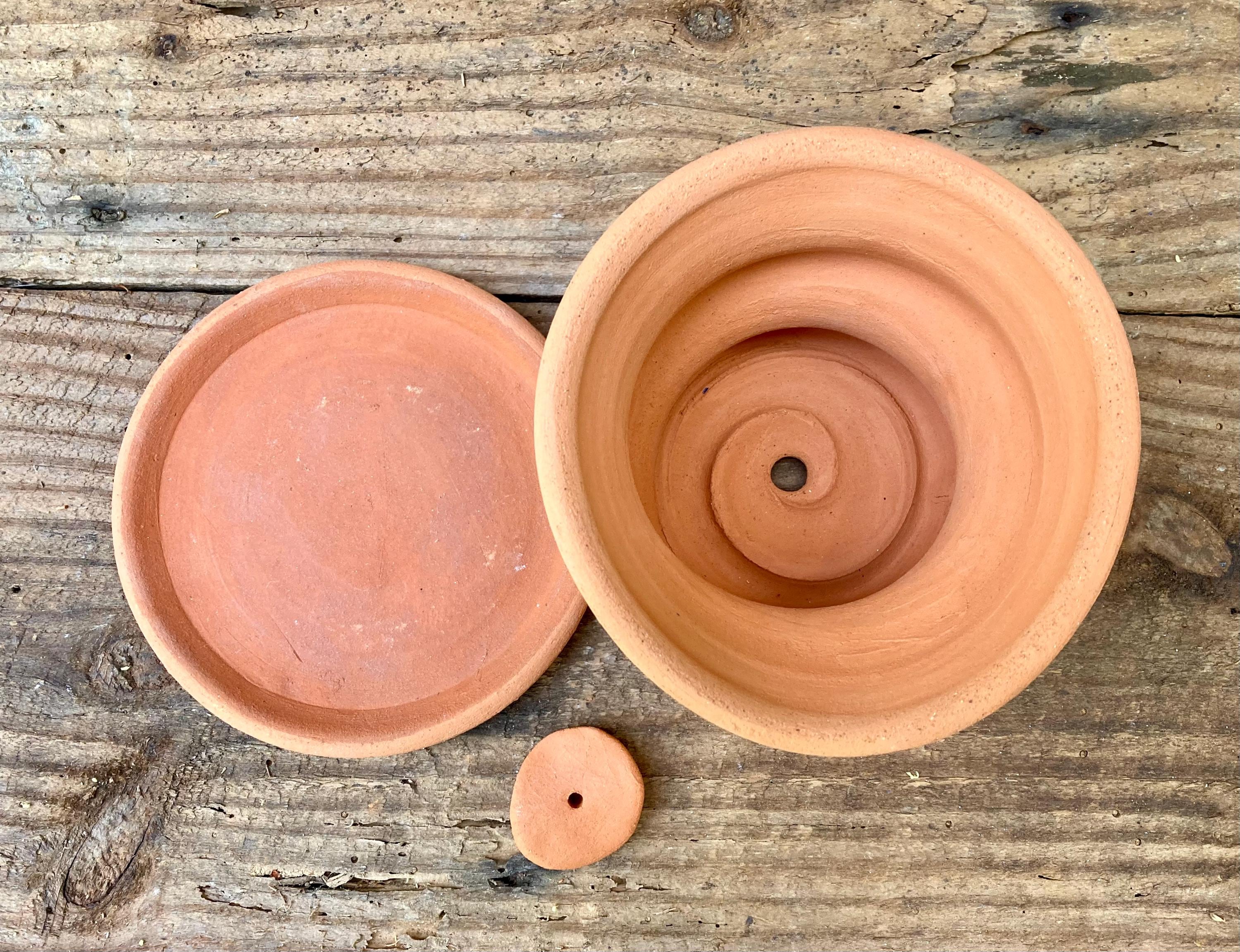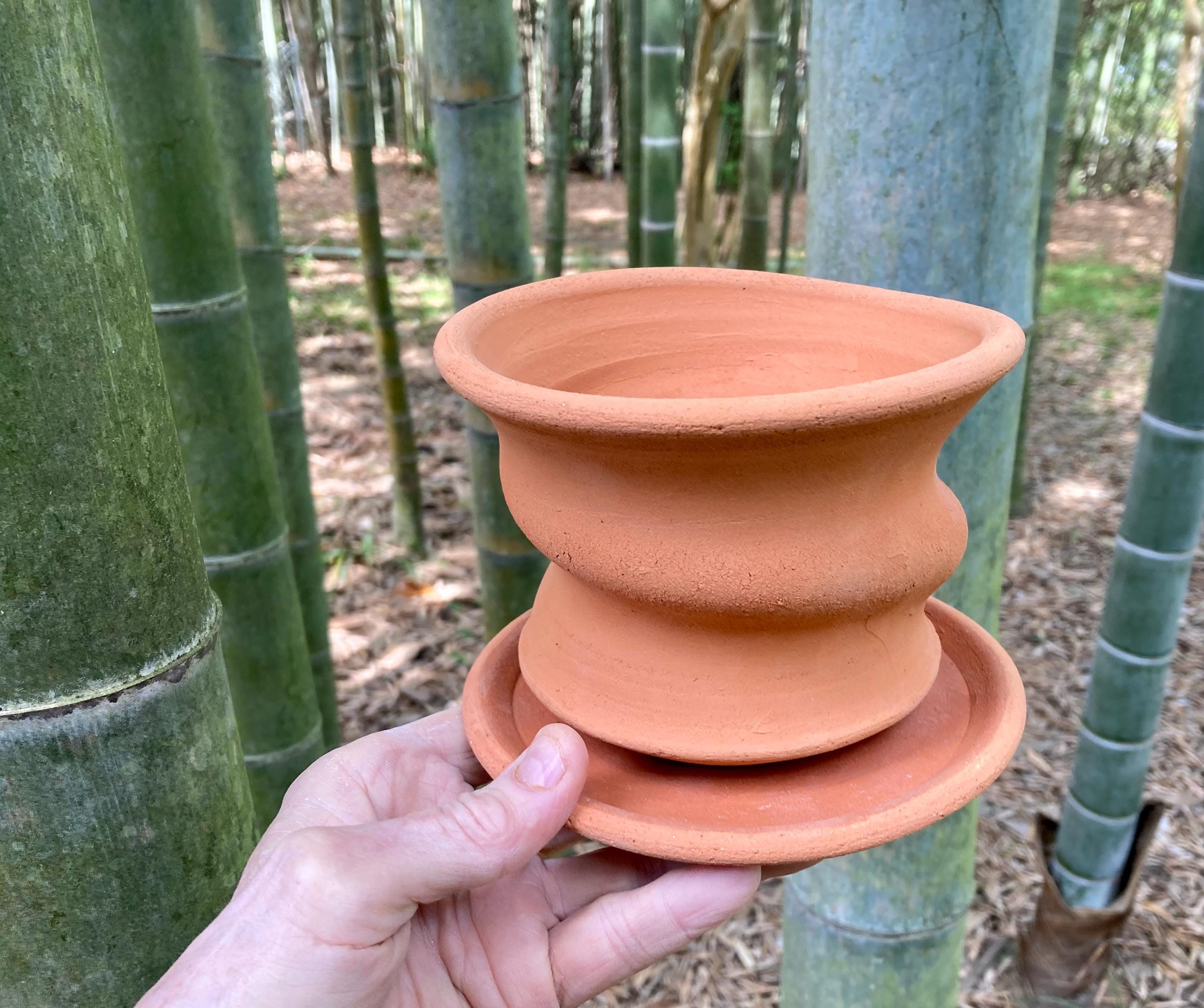 It was made of locally dug clay that when fired to the right temperature comes out a nice terracotta color and is porous. This allows air and water to flow through the pot which prevents root rot and soil disease.