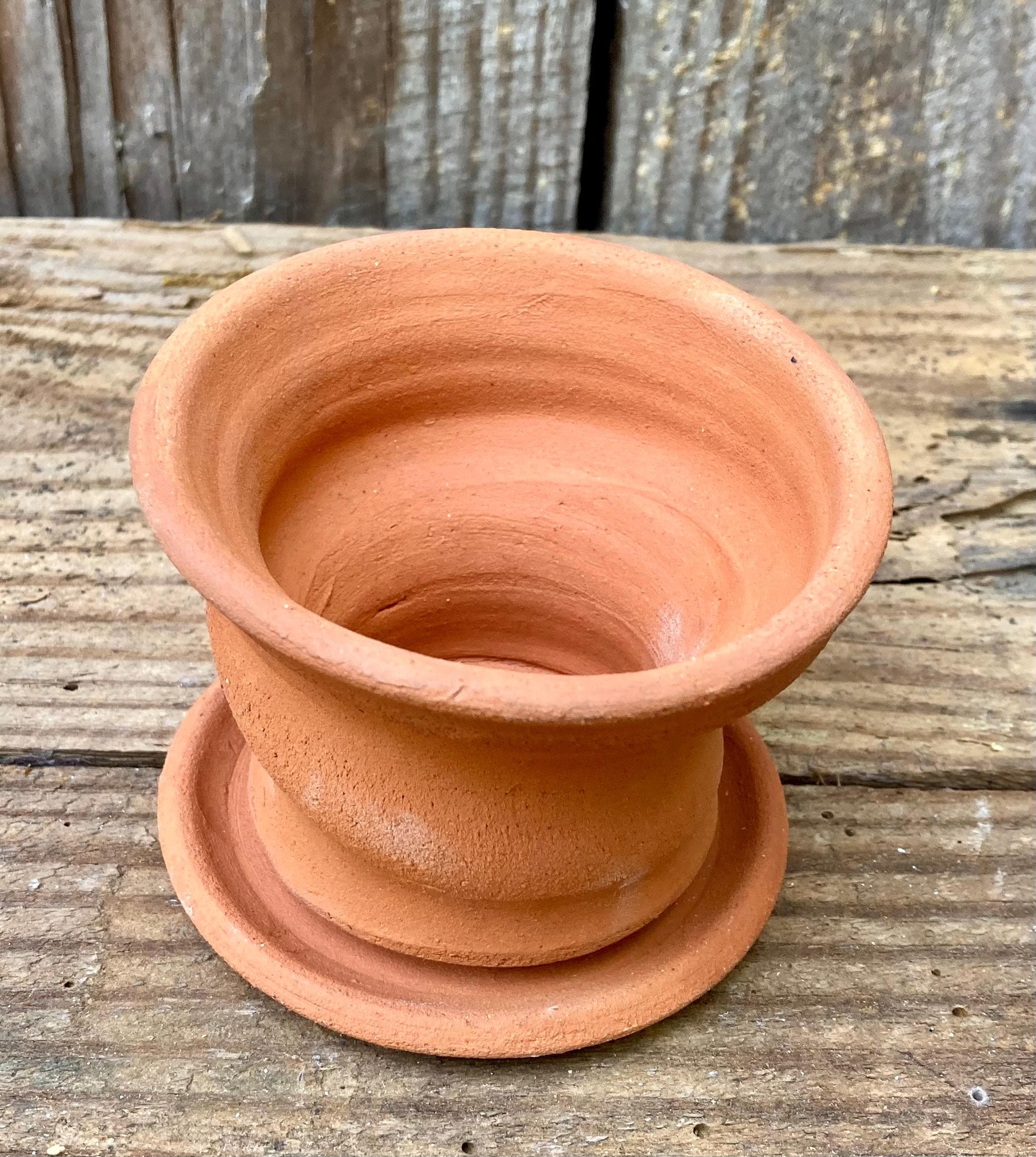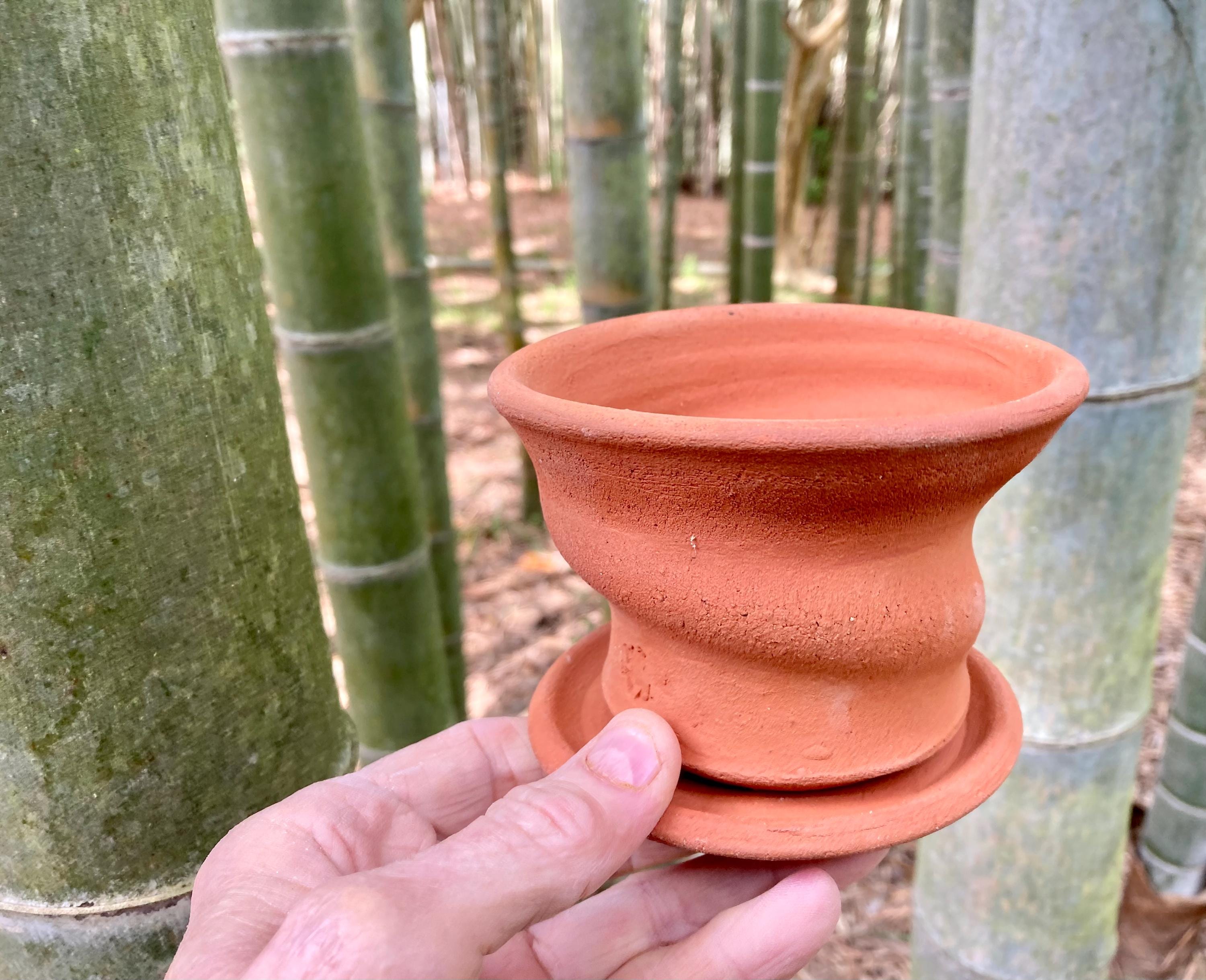 It was made of locally dug clay that when fired to the right temperature comes out a nice terracotta color and is porous. This allows air and water to flow through the pot which prevents root rot and soil disease.