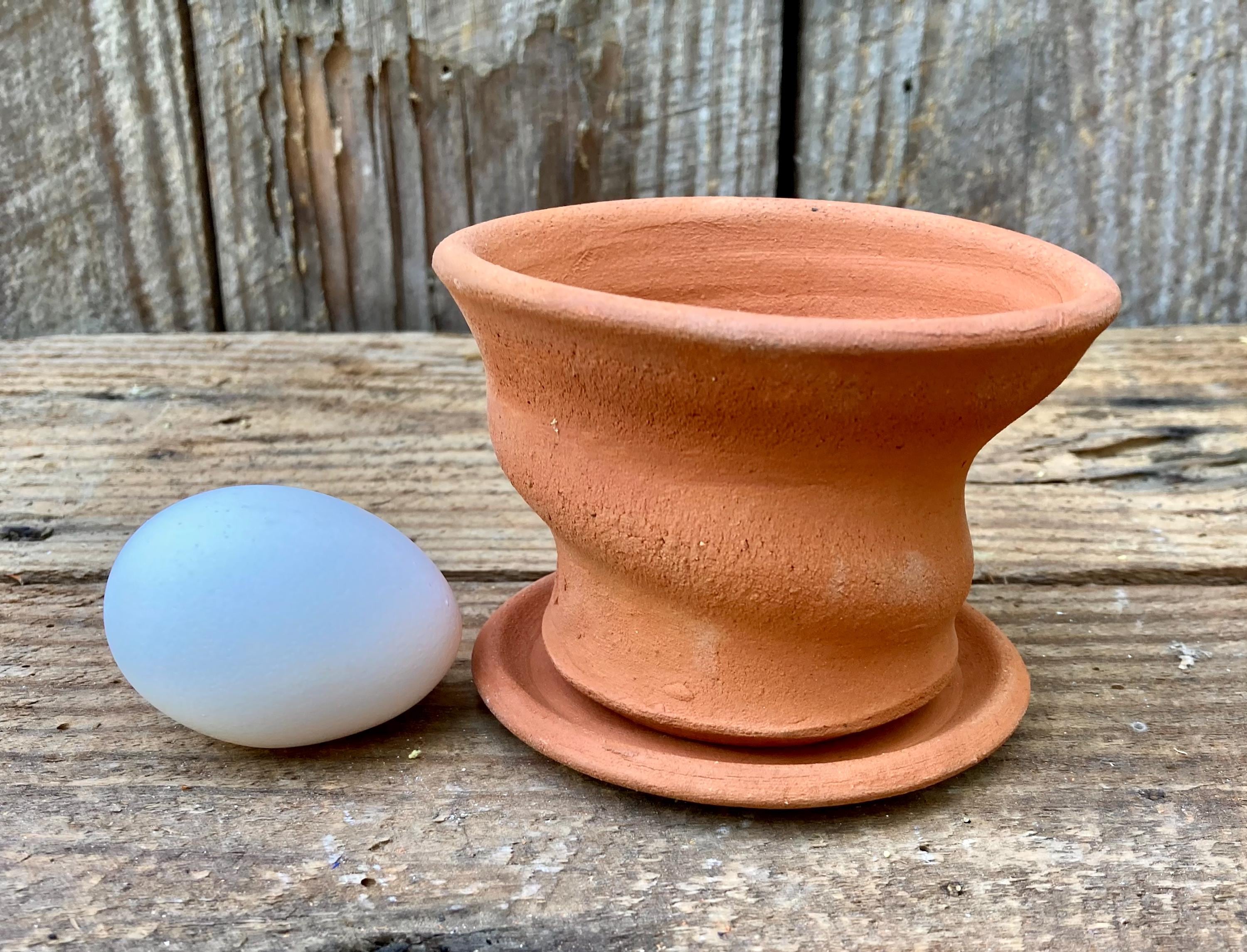 This free-form, terracotta planter was centered on the wheel then knocked off center to make it asymmetrical, to get a lip that is thick on one side and thin on the other, to get a nice, gestural spiraling movement.