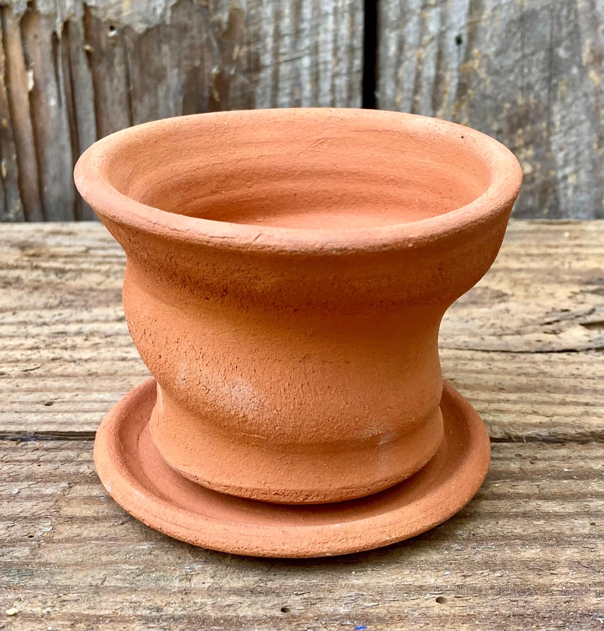 It is fired high enough to be much stronger and more durable than mass produced terracotta pots. (Which are usually not real terracotta.) It has a small hole for drainage and a shallow saucer that has been treated with a sealant to keep it from leaking. It also comes with a small shard to keep the soil from falling out or the hole becoming clogged. Okay indoors or outdoors.