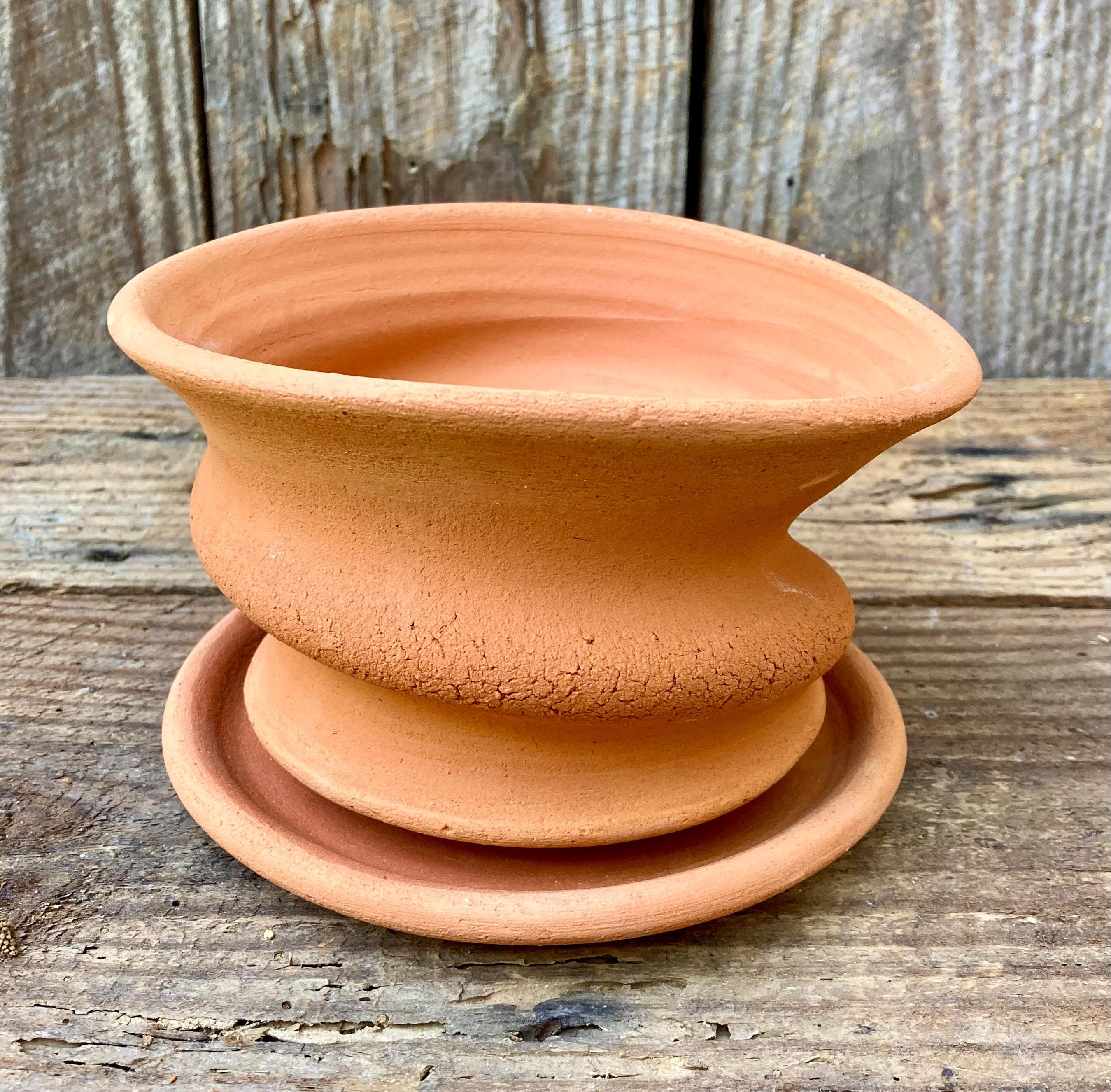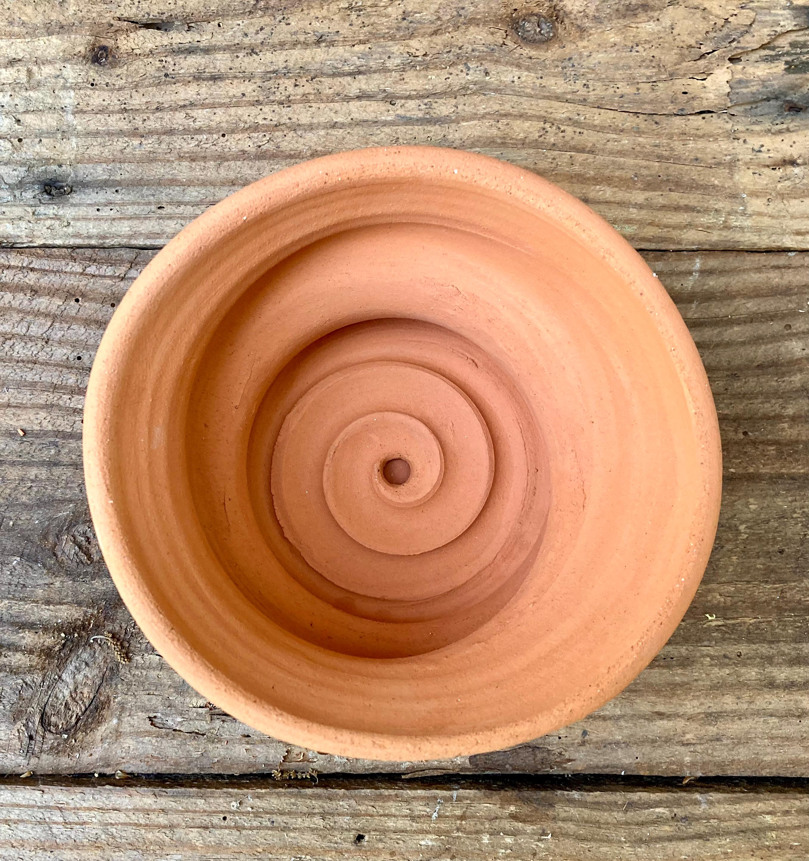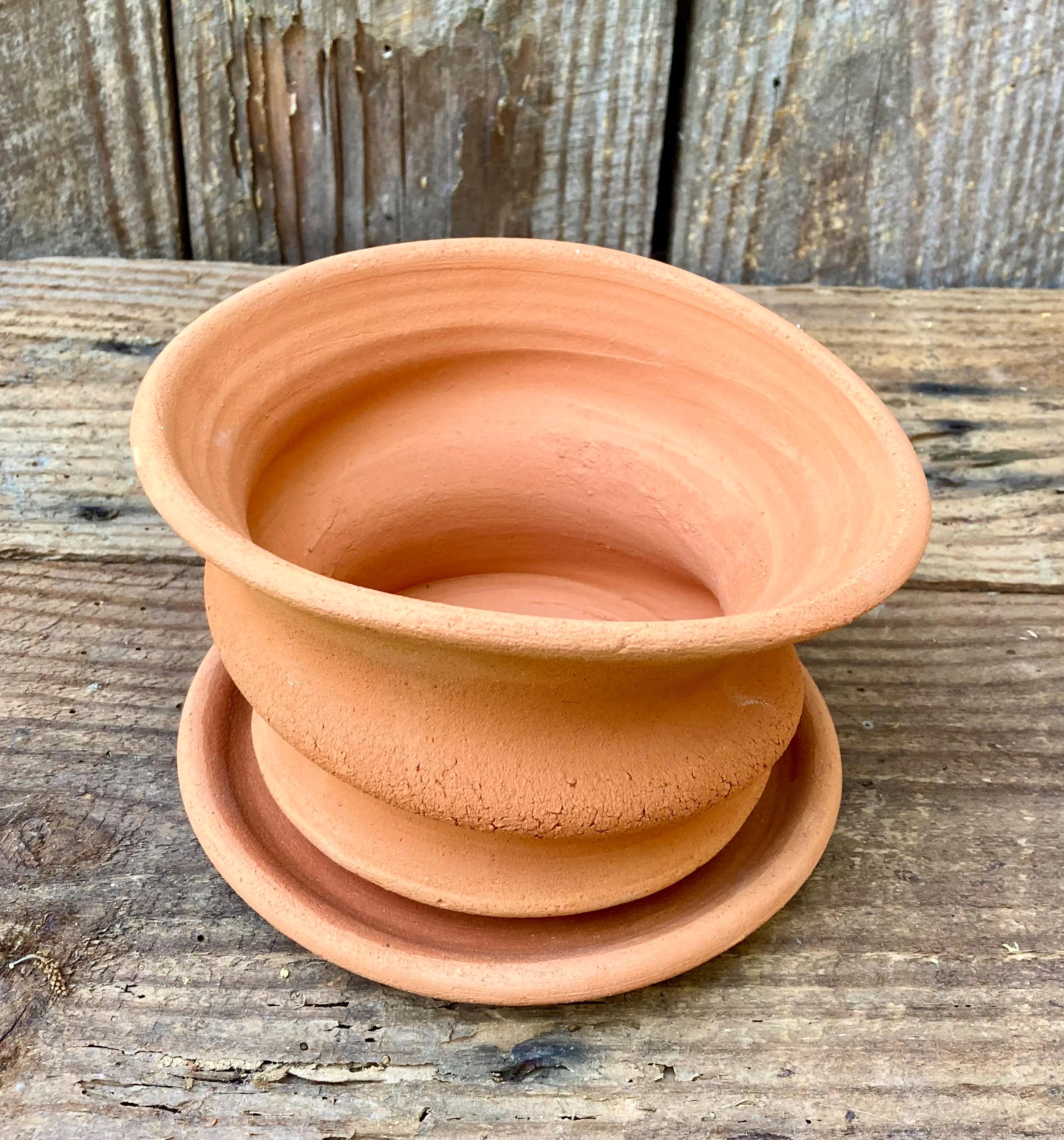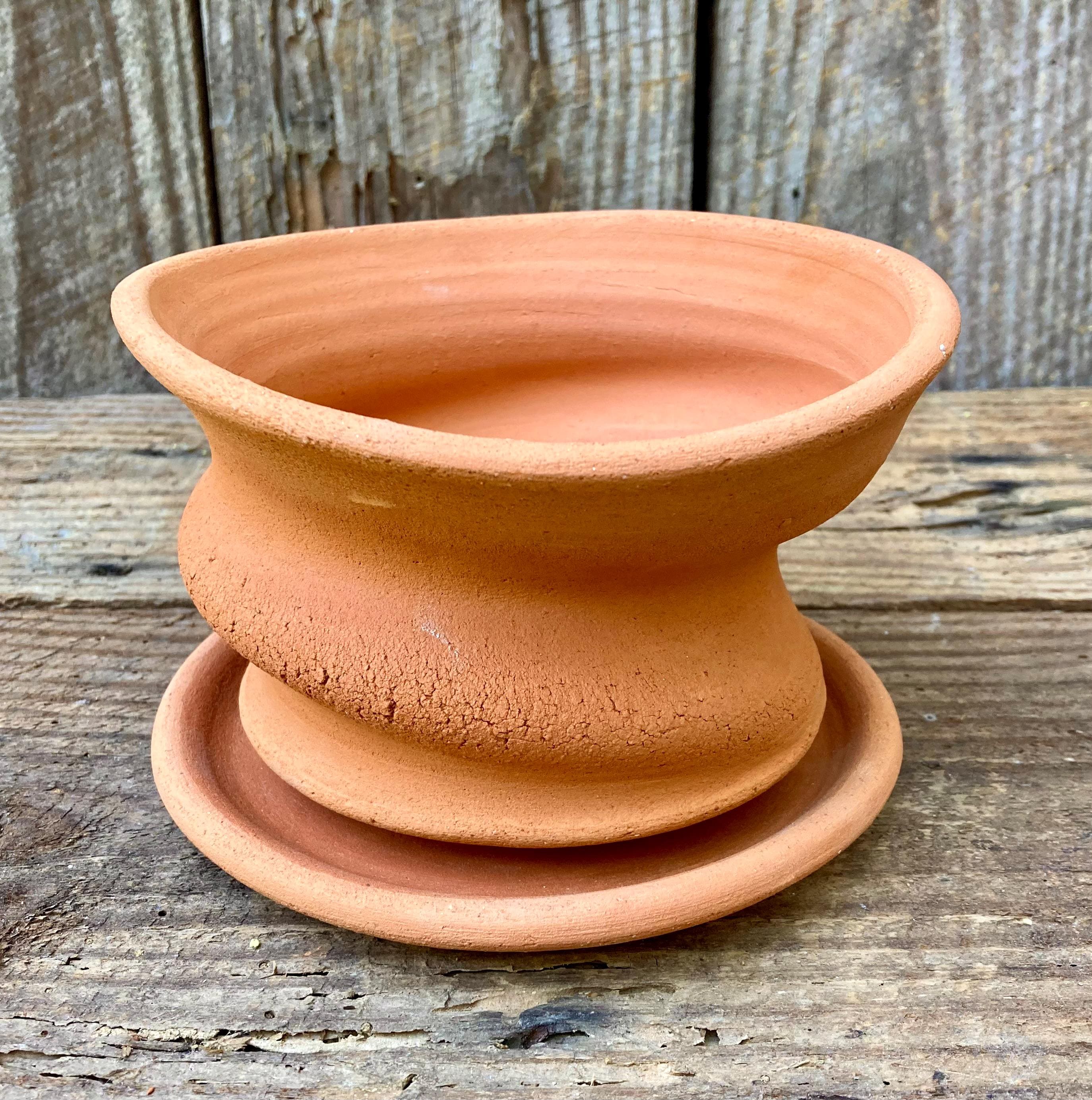 This free-form, terracotta planter was centered on the wheel then knocked off center to make it asymmetrical, to get a lip that is thick on one side and thin on the other, to get a nice, gestural spiraling movement.