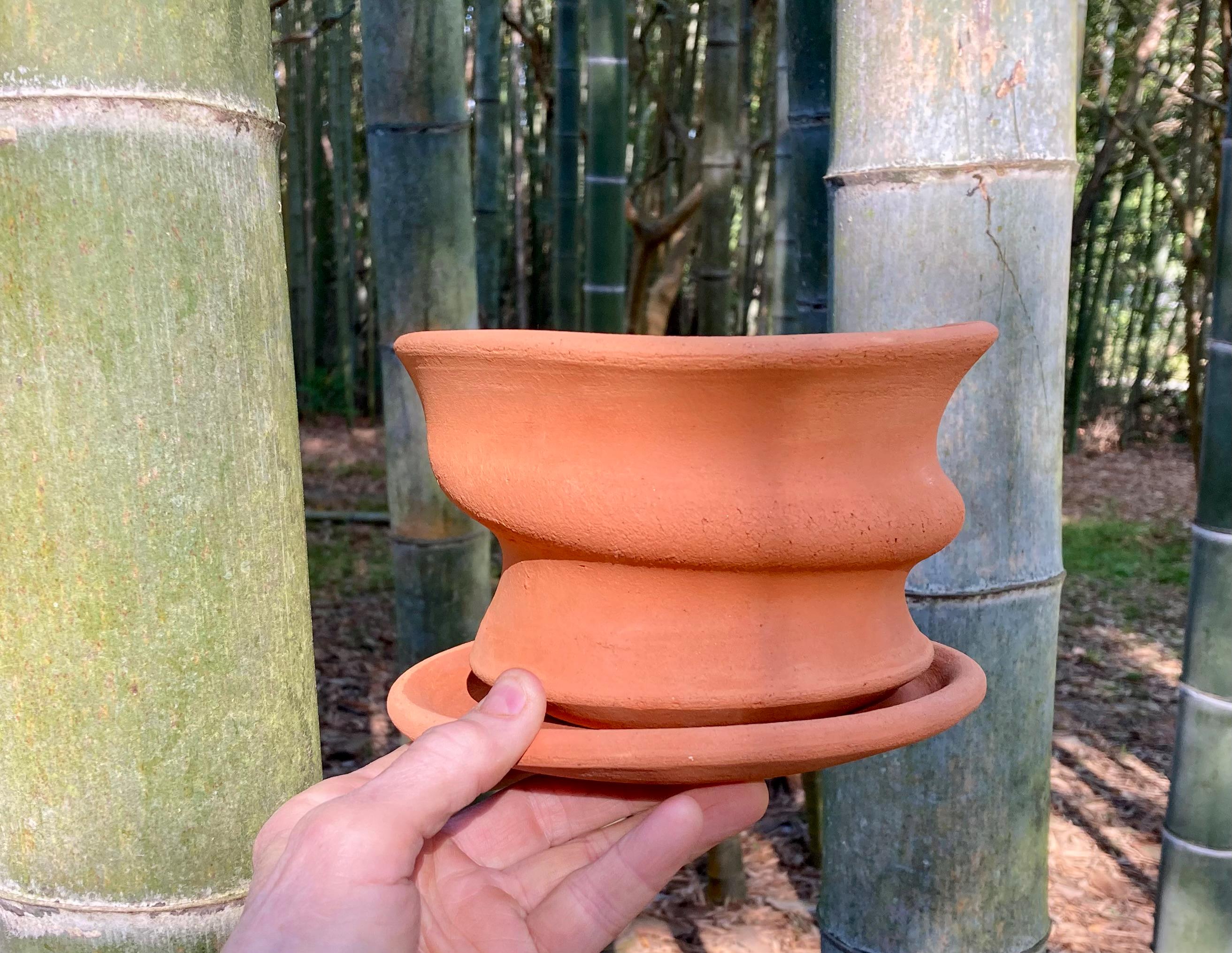 It was made of locally dug clay that when fired to the right temperature comes out a nice terracotta color and is porous. This allows air and water to flow through the pot which prevents root rot and soil disease.