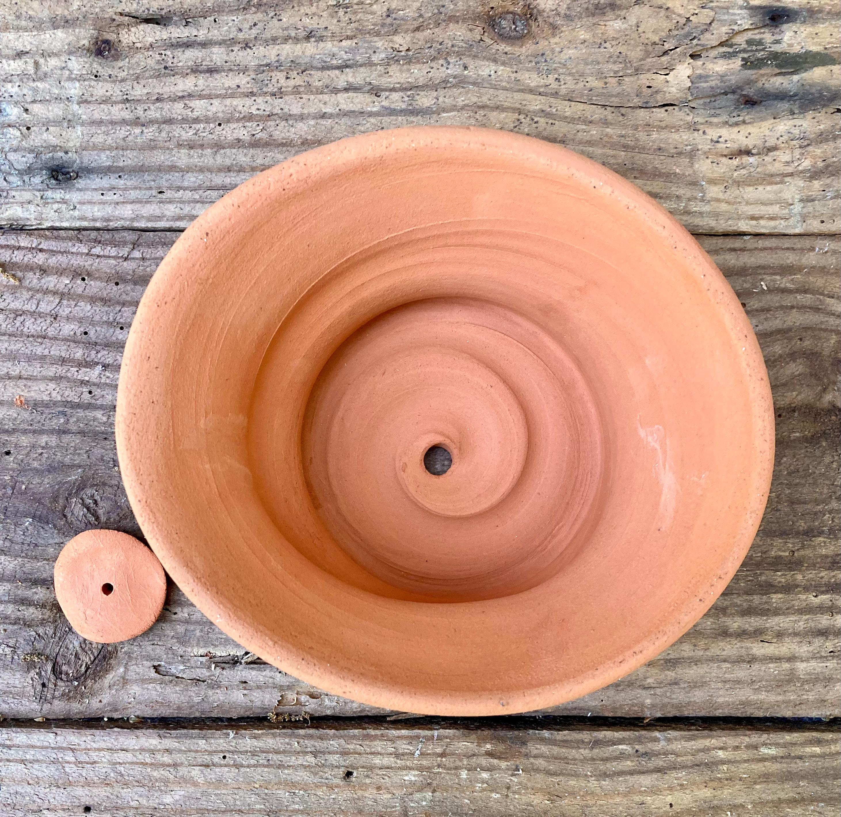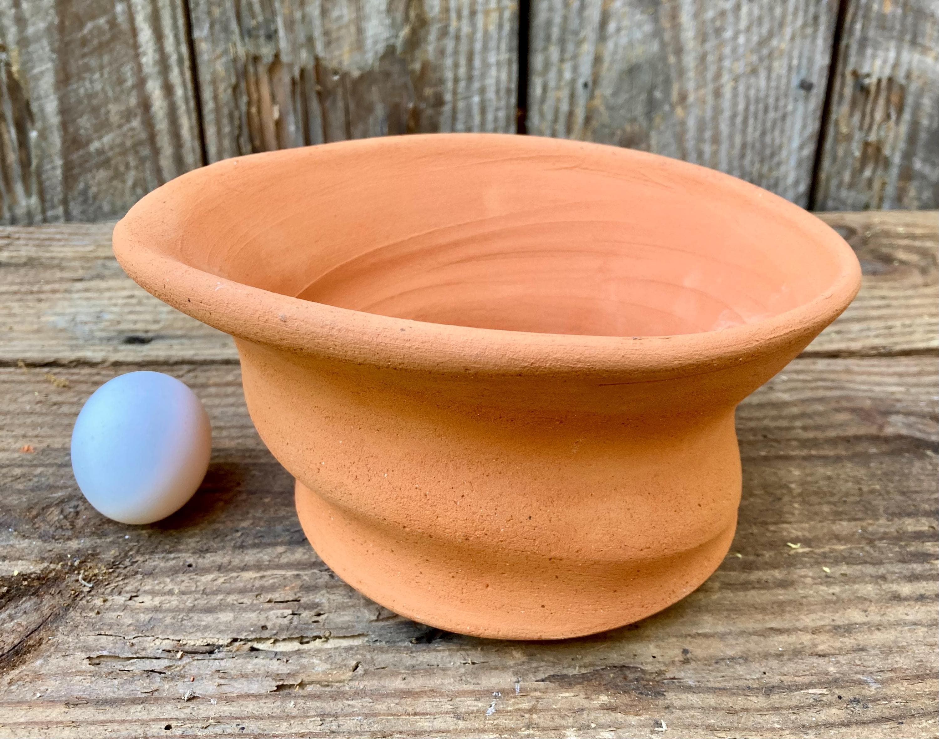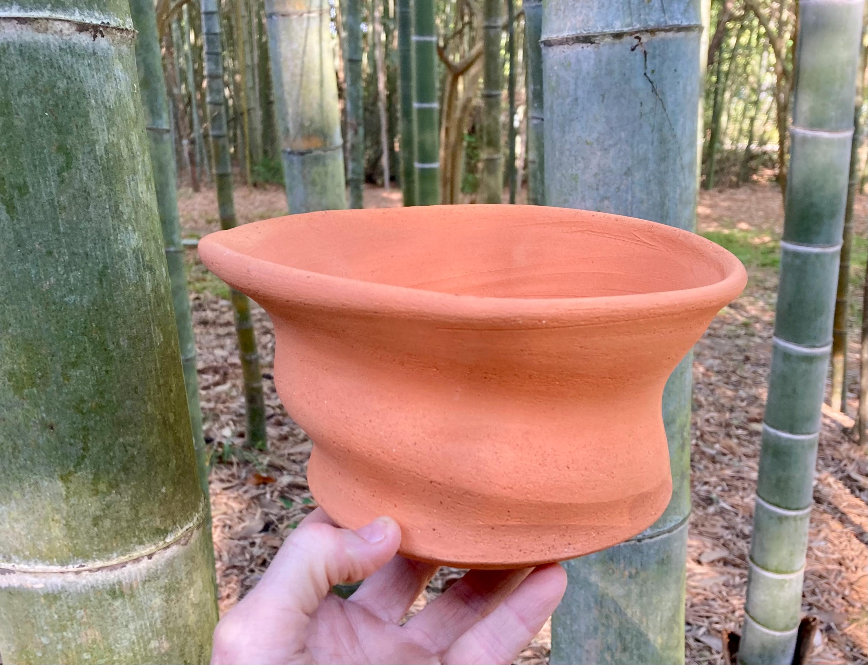 This free-form, terracotta planter was centered on the wheel then knocked off center to make it asymmetrical, to get a lip that is thick on one side and thin on the other, to get a nice, gestural spiraling movement.