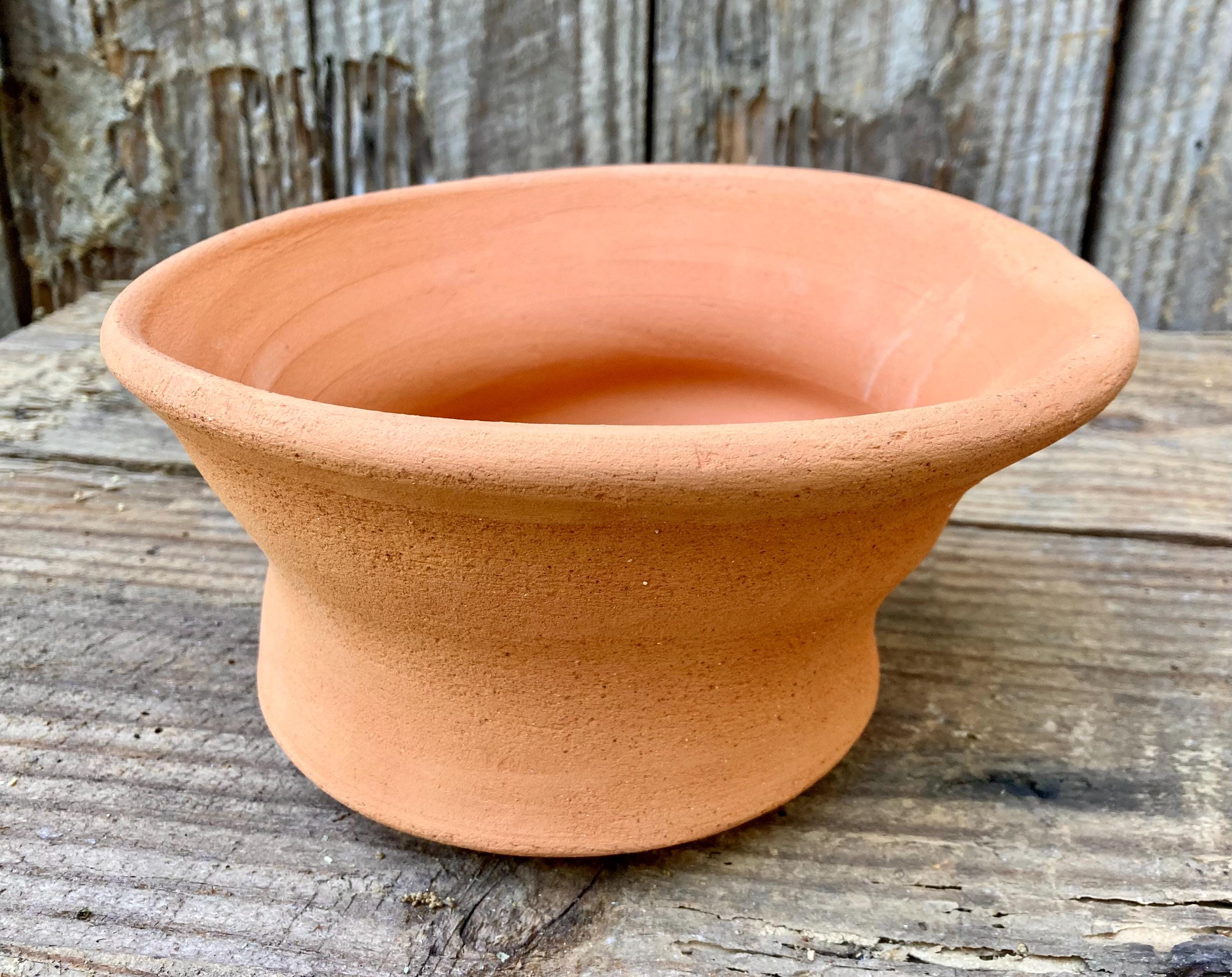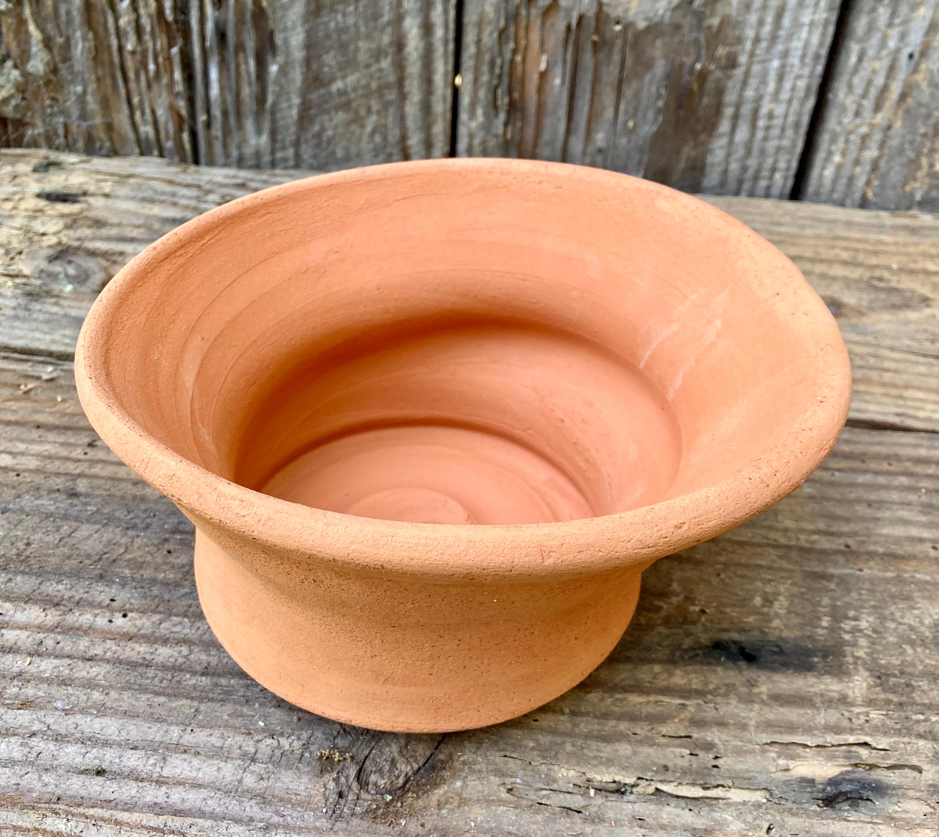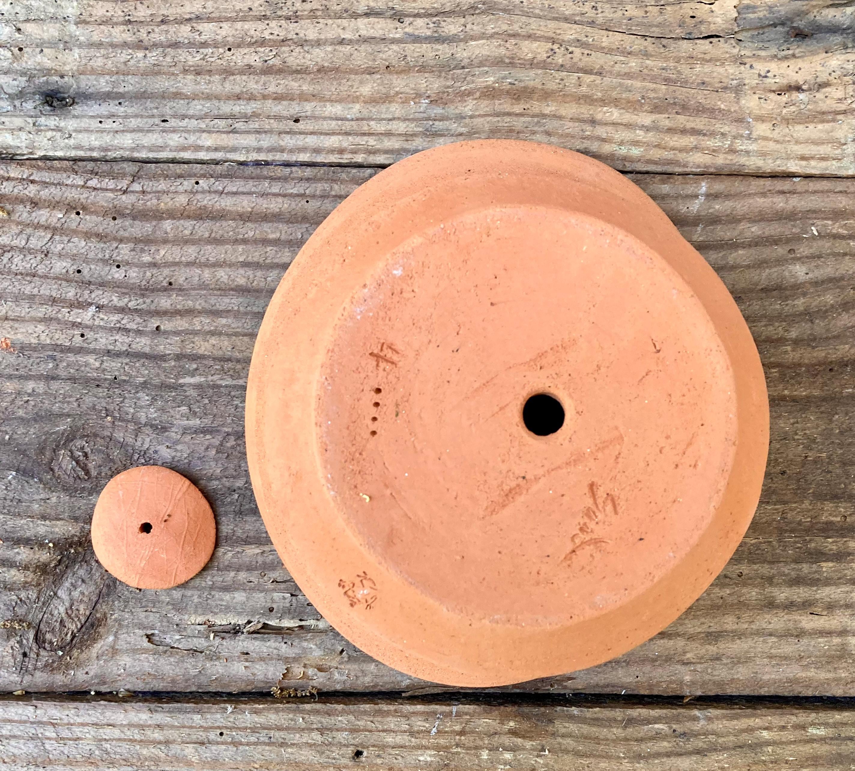 It is fired high enough to be much stronger and more durable than mass produced terracotta pots. (Which are usually not real terracotta.) It has a small hole for drainage and a small shard to keep the soil from falling out or the hole becoming clogged. Okay indoors or outdoors. This one does not come with a saucer.