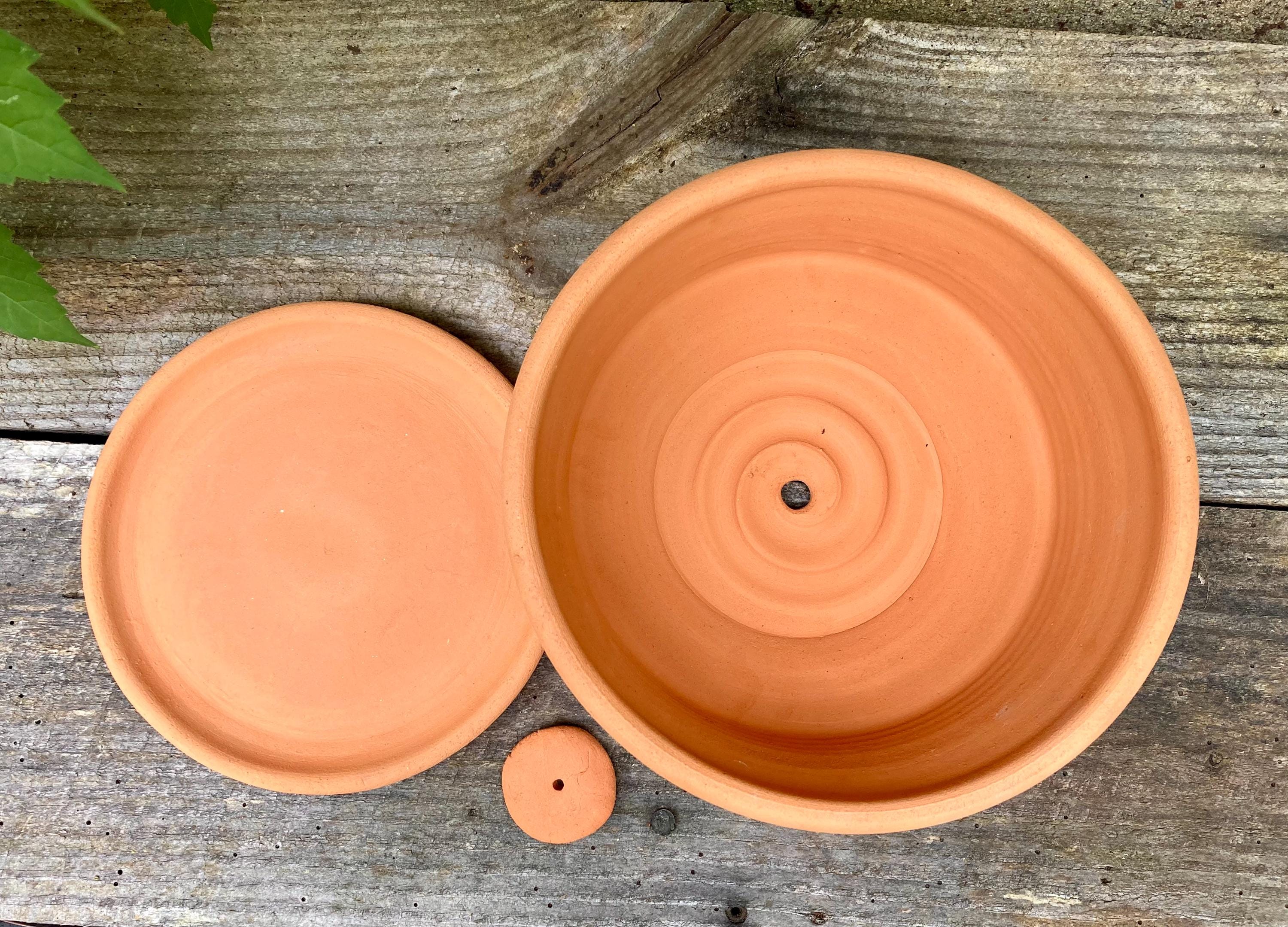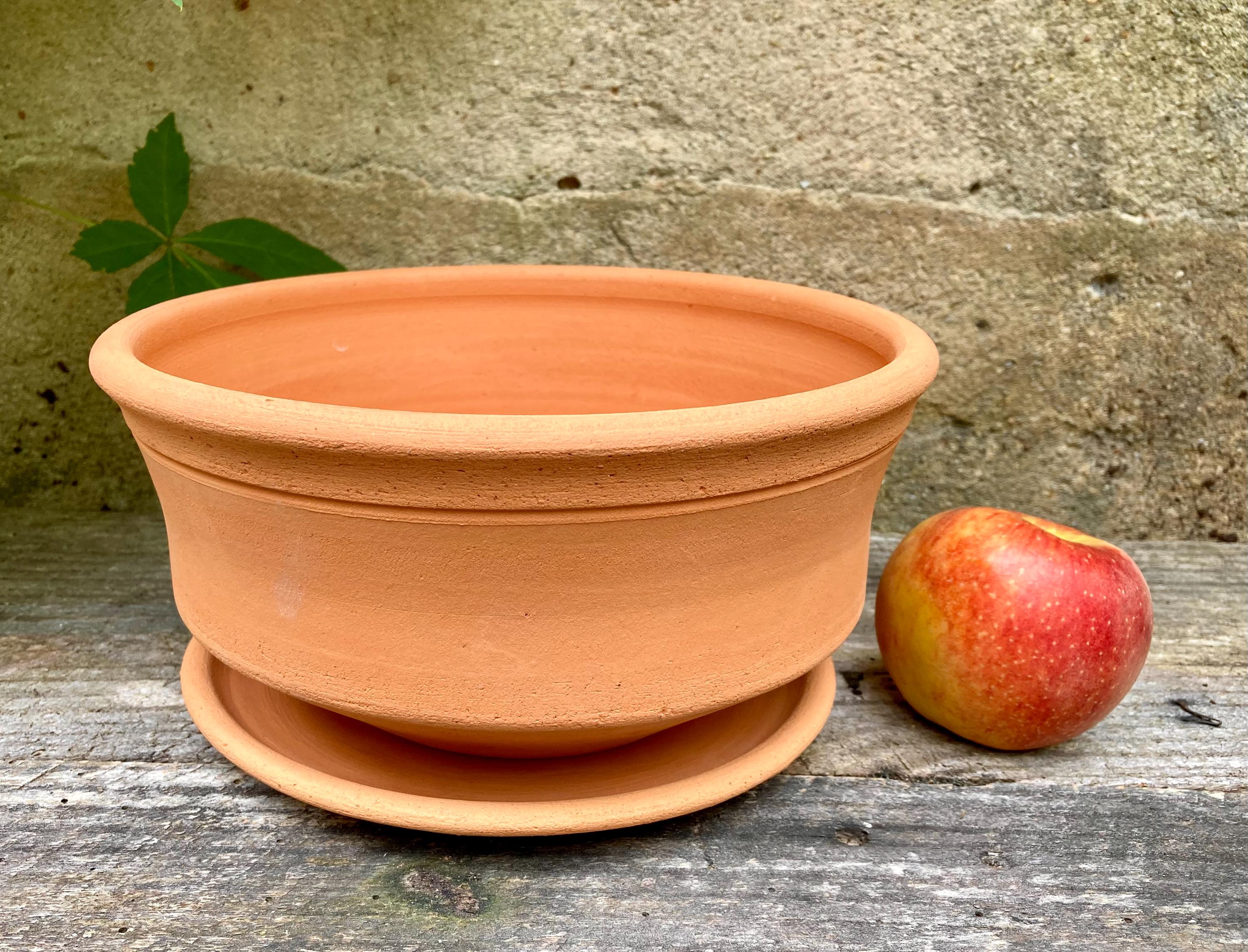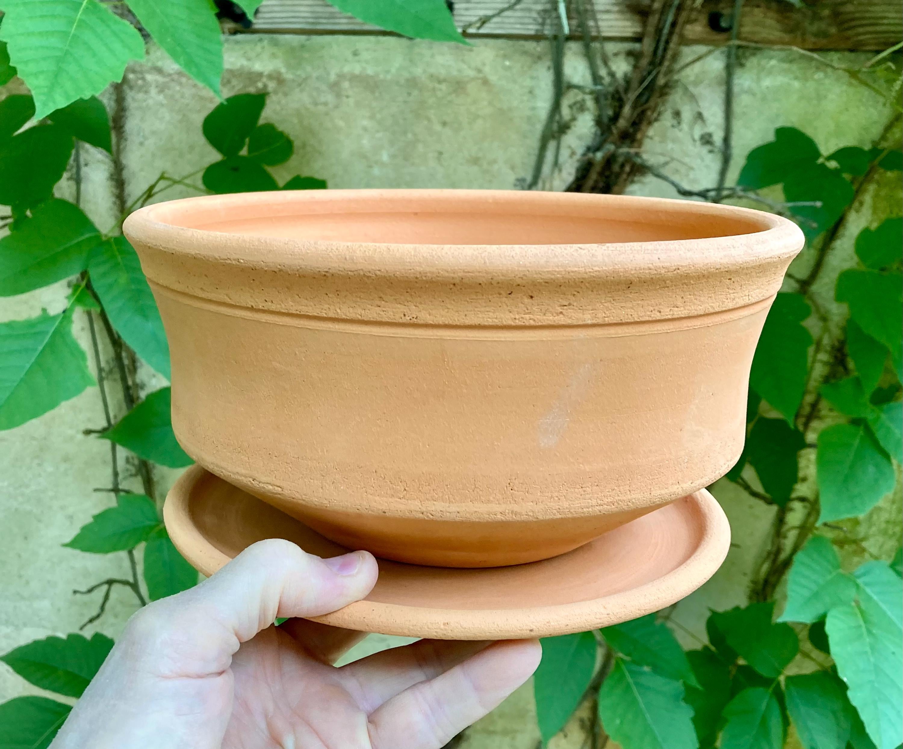 This terracotta planter was made of wheel-thrown, locally dug clay that when fired to the right temperature comes out a nice terracotta color and is porous. This allows air and water to flow through the pot which prevents root rot and soil disease.