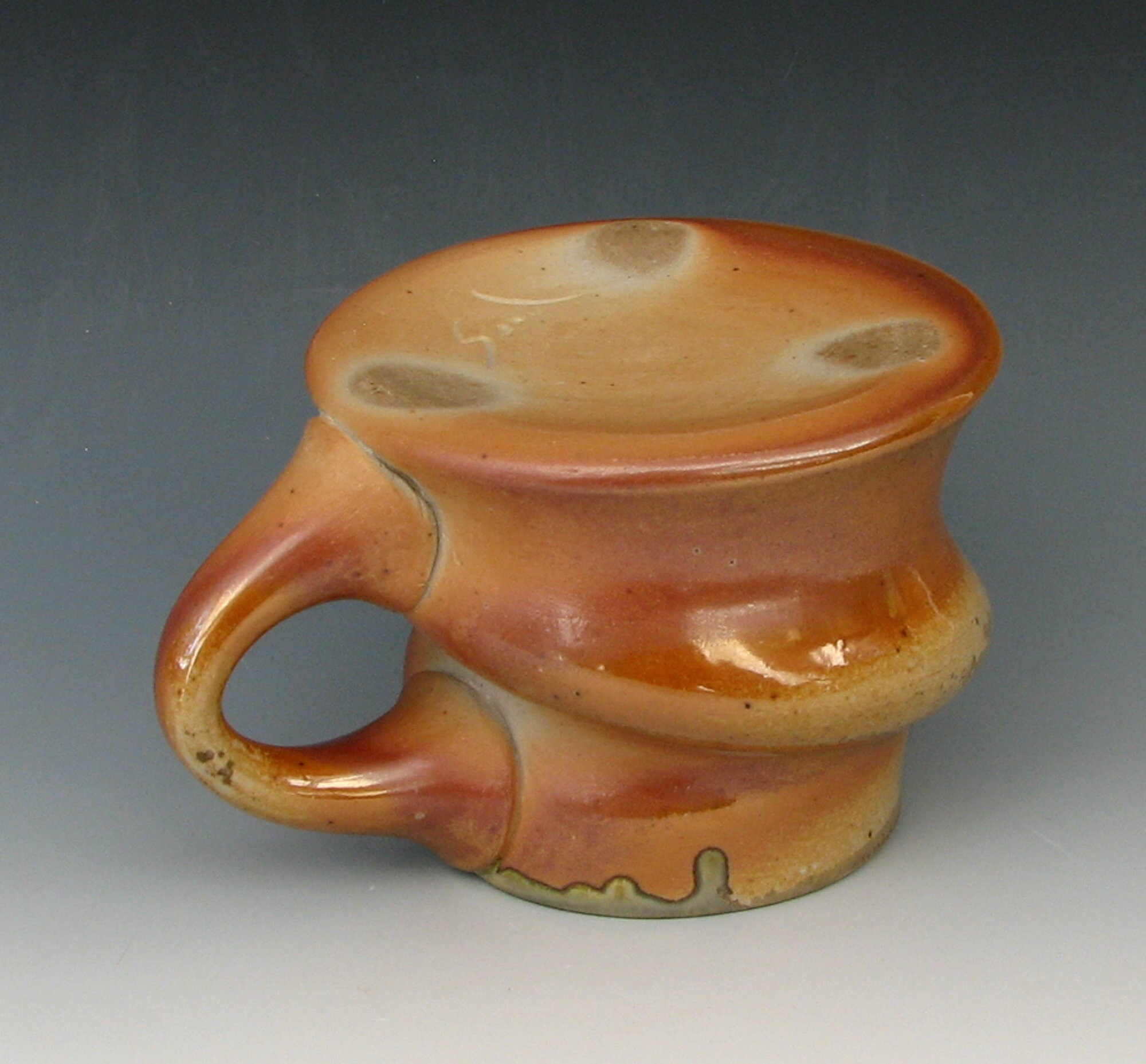 A wood fired mug that has been colored by flames and glazed by the ash in the fire. It was fired in an anagama (Japanese for "cave kiln") stoked with wood every few minutes non-stop for five days.