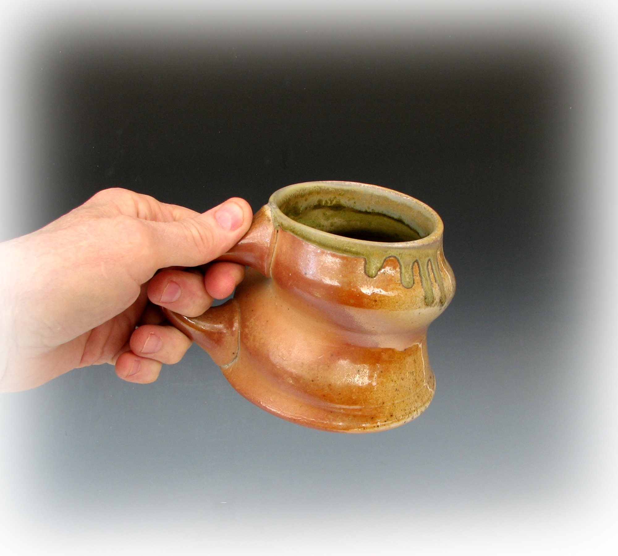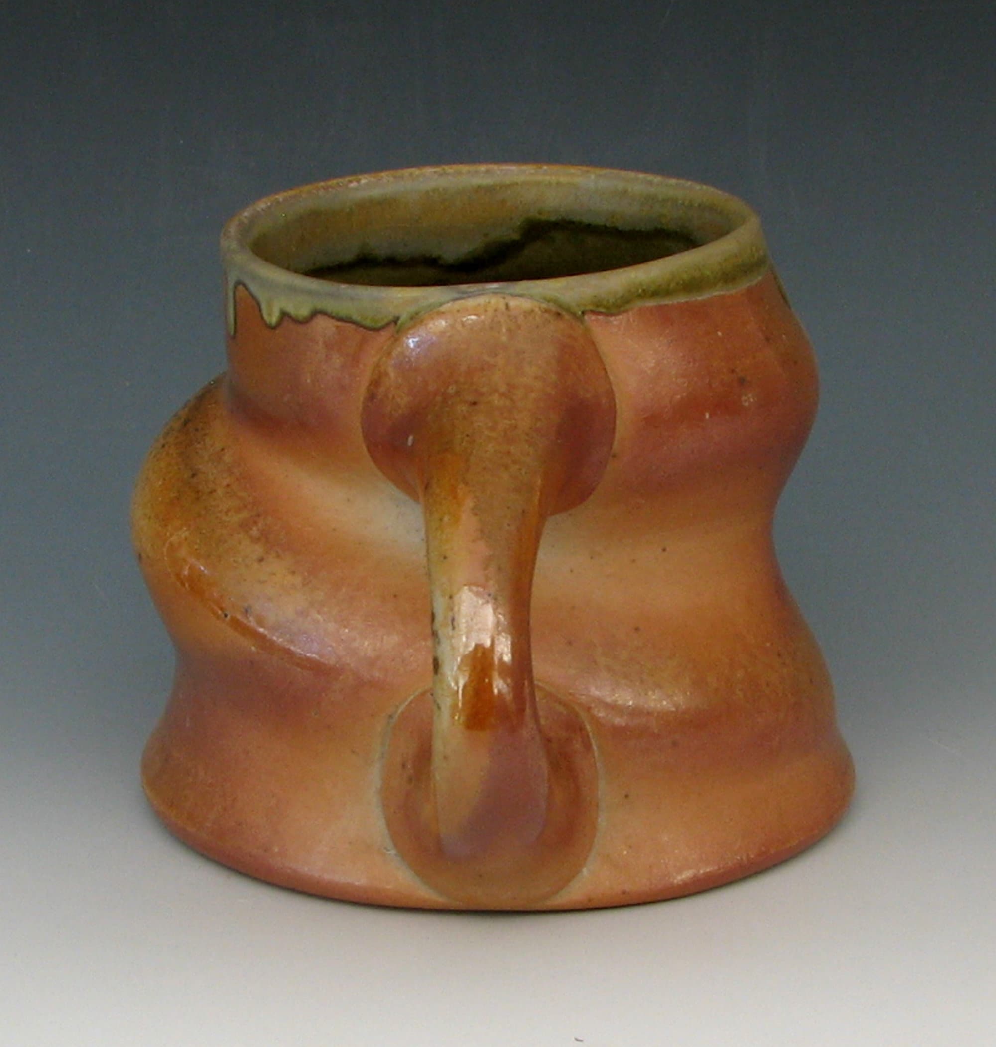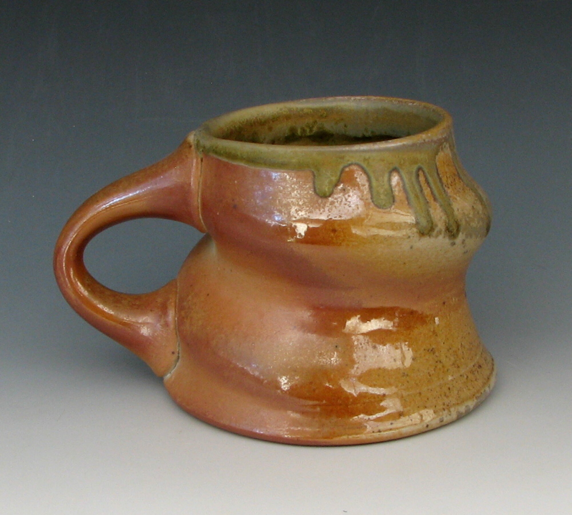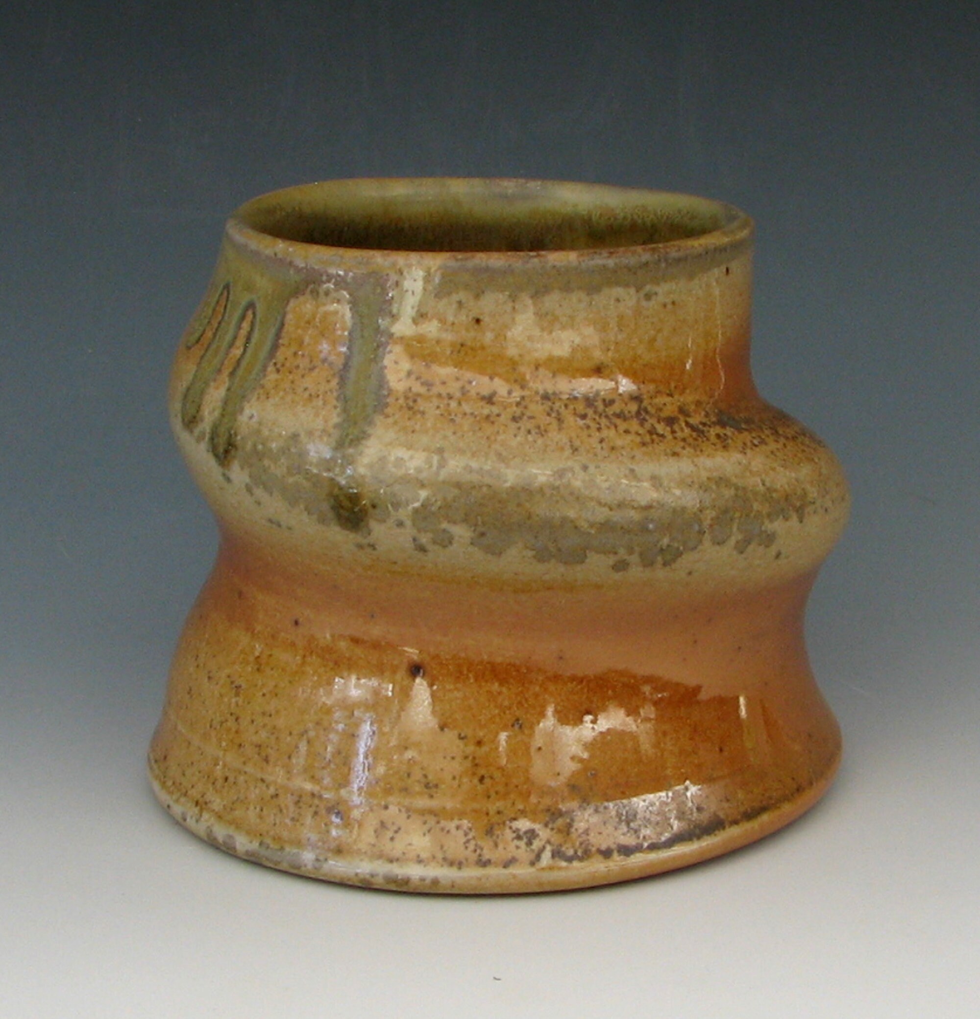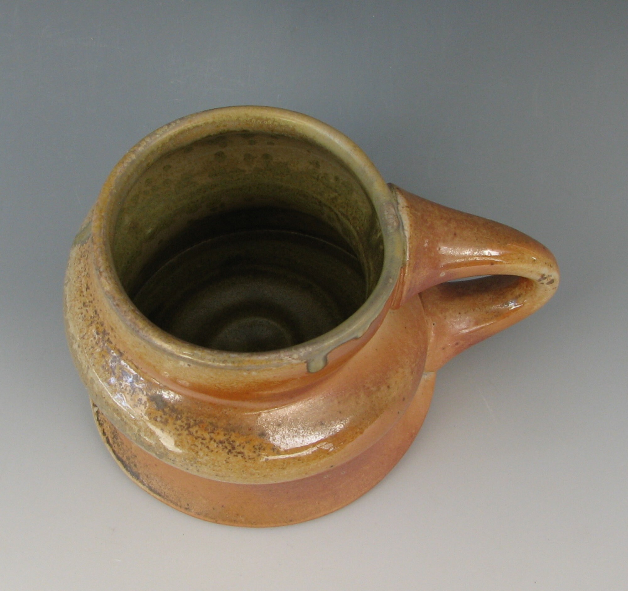The stoneware clay used to make this cup has been formulated to take the heat of a cone 13 (approx. 2450 degrees F.) wood-firing. It is vitrified so it would not leak even without a glaze. The ash glaze in the cup is a nice mottled yellow-green with lots of depth and variation. The color and glaze on the outside is from the the fire. In places the glaze on the lip runs down the side of the cup, creating a nice contrast between the yellow-green glaze and the syrupy gold-tan glaze from the wood ash. The gestural shape makes it almost look like it is still spinning on the wheel.