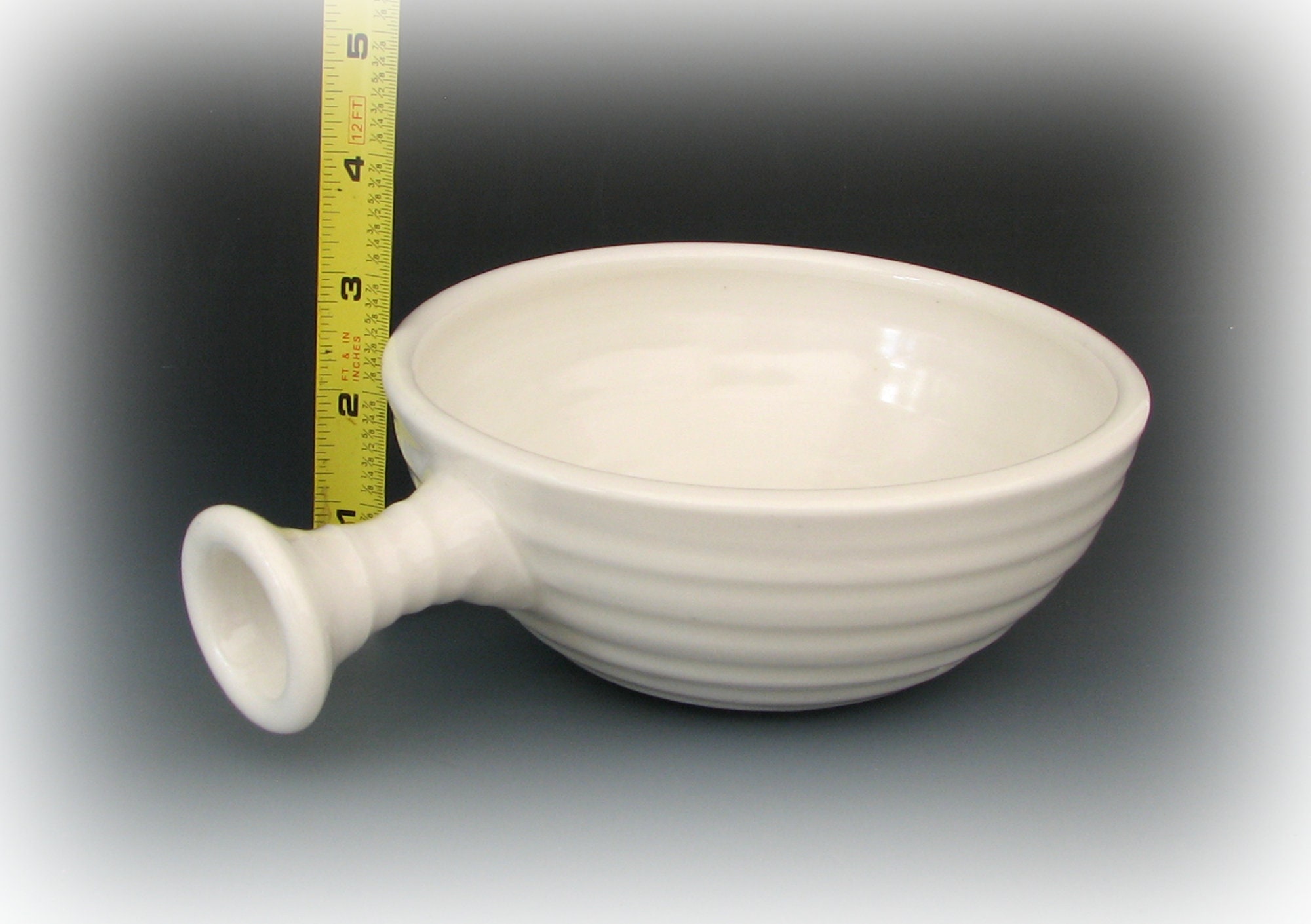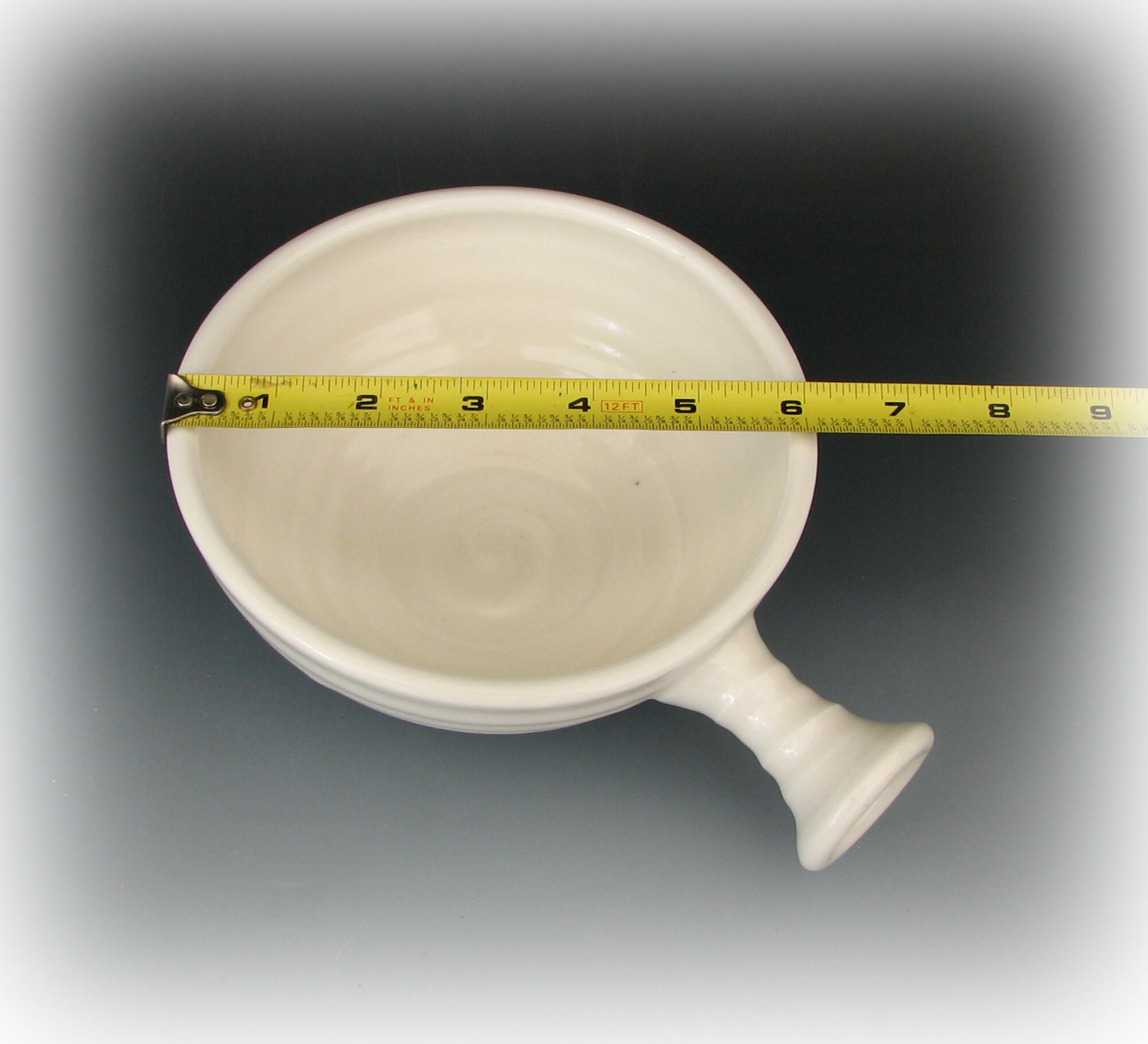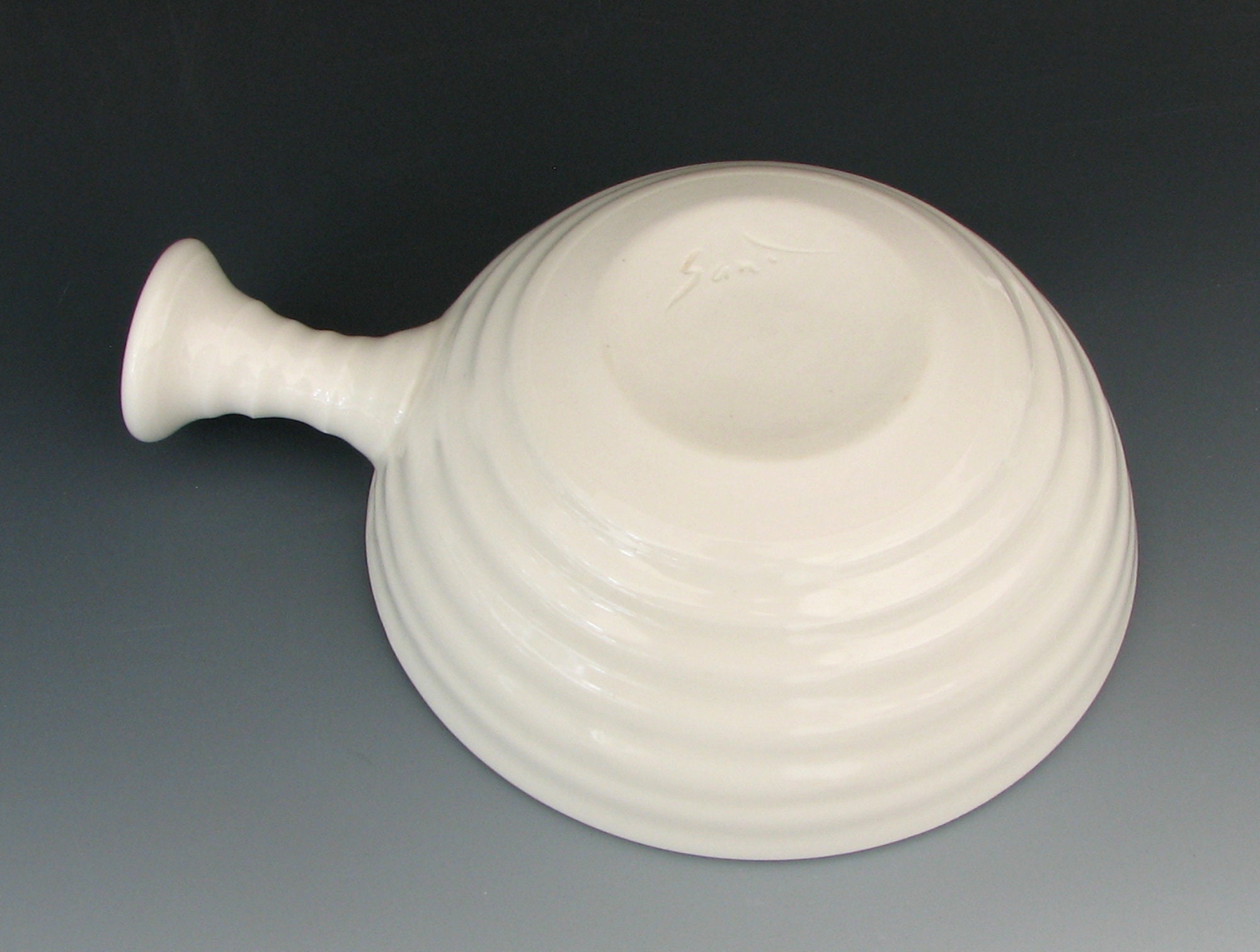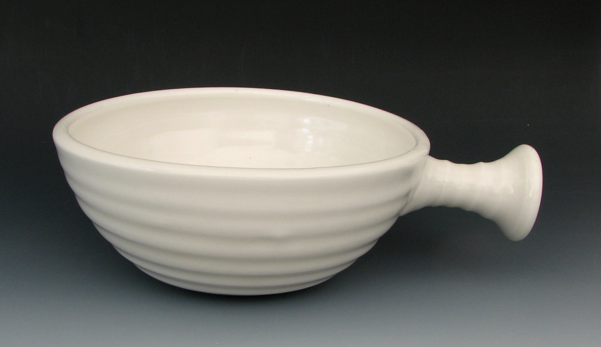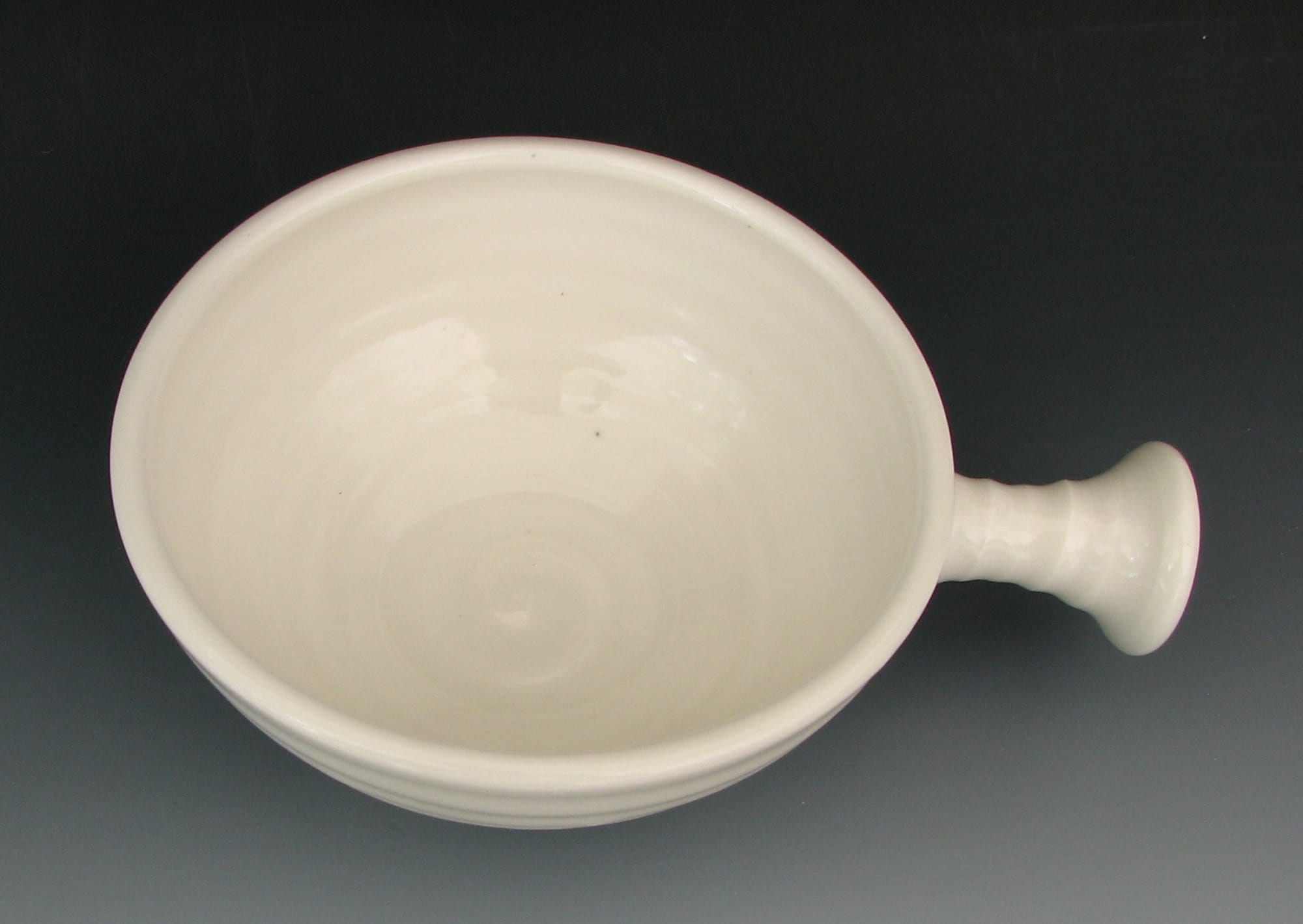 This porcelain bowl with a handle was thrown on the wheel then fired to vitrification for strength and durability.
